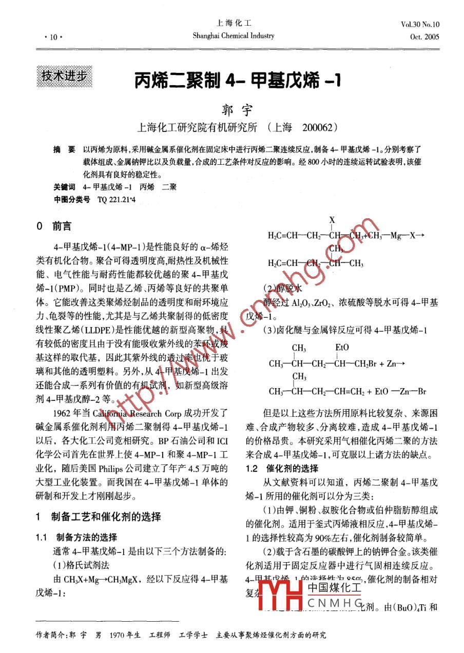 上?;ol 30 No 10shanghai Chemical IndustryOt.2005技術(shù)進步丙烯二聚制4-甲基戊烯-1郭宇上?;ぱ芯吭河袡C研究所(上海200062)摘要以丙烯為原料,采用堿金屬系催化劑在固定床中進行丙烯二聚連續(xù)反應(yīng),制備4-甲基戊烯-1。分別考察了載體組成、金屬鈉鉀比以及負載量,合成的工藝條件對反應(yīng)的影響。經(jīng)800小時的連續(xù)運轉(zhuǎn)試驗表明,該催化劑具有良好的穩(wěn)定性。關(guān)鍵詞4-甲基戊烯-1丙烯二聚中圖分類號TQ221.2140前言H2C=CH--CH2CH-CH3 +CH;Mg-X-+4-甲基戊烯-1(4-MP-1)是性能良好的α-烯烴類有機化合物。聚合可得透明度高耐熱性及機械性H2C=CH--CH2-CH-CH3能、電氣性能與耐藥性能都較優(yōu)越的聚4-甲基戊烯-1(PMP)。同時也是乙烯、丙烯等良好的共聚單(2)醇脫水體。它能改善這類聚烯烴制品的透明度和耐環(huán)境應(yīng)醇經(jīng)過AlQO3ZO2、濃硫酸等脫水可得4-甲基力、龜裂等的性能,尤其是與乙烯共聚制得的低密度戊烯-1。線性聚乙烯( LLDPE)是性能優(yōu)越的新型高聚物,具(3)鹵化醚與金屬鋅反應(yīng)可得4-甲基戊烯-1有較低的密度且由于沒有能吸收紫外線的苯環(huán)或羧EtO基這樣的取代基,因此其紫外線的透過率也優(yōu)于玻CH-CH-CH2-CH-CH_ Br +Zn+璃和其他的透明塑料。另外,從4-甲基戊烯-1出發(fā)還能合成一系列有價值的有機試劑,如新型高級溶CH;CH-CH2CH=CH,+ Eto-Zn--Br劑4-甲基戊醇-2等。196年當(dāng) California Research Corp成功開發(fā)了但是以上這些方法所用原料比較復(fù)雜、來源困堿金屬系催化劑利用丙烯二聚制得4-甲基戊烯-1難、合成產(chǎn)物較多、分離較難,造成4-甲基戊烯-1以后,各大化工公司競相研究。BP石油公司和ICI的價格昂貴。本研究釆用氣相催化丙烯二聚的方法化學(xué)公司首先在世界上使4-MP-1和聚4-MP-1工來合成4-甲基戊烯-1,可克服以上諸方法的缺點。業(yè)化,隨后美國 Philips公司建立了年產(chǎn)45萬噸的12催化劑的選擇大型工業(yè)化裝置。而我國在4-甲基戊烯-1單體的從文獻資料可以知道,丙烯二聚制4-甲基戊研制和開發(fā)上才剛剛起步。烯-1所用的催化劑可以分為三類1制備工藝和催化劑的選擇(1)由鉀、銅粉、叔胺化合物或伯仲脂肪醇組成的催化劑。適用于釜式丙烯液相反應(yīng),4-甲基戊烯1.1制備方法的選擇1的選擇性較高為90%左右,催化劑制備較簡單。通常4-甲基戊烯-1是由以下三個方法制備的:(2)載于含石墨的碳酸鉀上的鈉鉀合金。該類催(1)格氏試劑法化劑適用于固定反應(yīng)器中進行氣固相連續(xù)反應(yīng)。由CHX+Mg+ CHBMgX,經(jīng)以下反應(yīng)得4-甲基4-位拯1的性撂姓斗戊烯-1*YH中國煤,催化劑的制備相對CNMH劑。由(BO)T和作者簡介:郭宇男1970年生工程師工學(xué)學(xué)士主要從事聚烯烴催化劑方面的研究第10期郭宇:丙烯二聚制4-甲基戊烯-111Al(Et)3組成的催化劑,其優(yōu)點是制造方便,使用于丙需要嚴格脫水脫氧。烯二聚制4_甲基戊烯-1的壓力較低。但伴有主產(chǎn)試驗操作:原料丙烯經(jīng)過高壓微量恒流泵計量物生成的副產(chǎn)雜質(zhì)較多。并升壓至10MPa,進入脫水塔,由5A分子篩脫除丙比較以上幾種類型的催化劑,第一類催化劑只烯中的水分,經(jīng)過預(yù)熱器汽化至150℃左右,進入脫適用于間歇釜式生產(chǎn),對今后大噸位工業(yè)化裝置不氧塔,由C5脫氧劑脫氧。經(jīng)脫水、脫氧后丙烯進入適宜。而第三類催化劑由于生成產(chǎn)物比較復(fù)雜,這些反應(yīng)器,接觸催化劑進行丙烯二聚反應(yīng),生成4-甲副產(chǎn)雜質(zhì)的沸點又與4-甲基戊烯-1的沸點相接基戊烯-1以及少量的4甲基戊烯-2,已烯及帶有近難以分離。第二類催化劑采用固定床氣相連續(xù)反未反應(yīng)的丙烯氣,經(jīng)過計量后放空。應(yīng),易于工業(yè)放大,目前國外幾套大型的生產(chǎn)裝置均操作過程中控制丙烯的流量、反應(yīng)壓力、反應(yīng)溫采用該類型的催化劑度并定時分析反應(yīng)器出口的氣體組成,以計算丙烯試驗就是以金屬鈉載于含石墨的碳酸鉀為催化的轉(zhuǎn)化率及4-甲基戊烯-1的選擇性。劑,進行丙烯二聚制4-甲基戊烯-1。3.12原料2催化劑的制備丙烯由上海石油化工總廠提供。規(guī)格:丙烯>98%(質(zhì)量分數(shù)),丙二烯<5×106(質(zhì)量分數(shù)),甲基采用含石墨的碳酸鉀載體上的鈉鉀合金為丙烯乙烯<5×106(質(zhì)量分數(shù)),硫<1×106(質(zhì)量分數(shù)二聚制4-甲基戊烯-1的催化劑。其制備方法為:將水(5~20)×106(質(zhì)量分數(shù)),氧(5-20)×10“質(zhì)量分具有一定孔徑的碳酸鉀,加入一定量的石墨,混合均數(shù))。勻后壓片,在氮氣流中于350℃干燥2小時。然后在3.13分析方法氮氣保護下,300℃加入鈉、鉀,繼續(xù)保溫攪拌2小試驗中產(chǎn)品的分析采用SP-501型氣相色譜進時即成行控制分析,水含量的分析采用DWs-2型微量水由于丙烯雙鍵上兩個碳原子的電子云密度不分測定儀,氧含量的分析采用原電池微量氧分析法。同,通常是優(yōu)先生成4-甲基戊烯-1,已烯-1是作為314工藝試驗與討論副產(chǎn)物。同時,4-甲基戊烯-1和己烯-1異構(gòu)化分別(1)二聚溫度的影響試驗生成4-甲基戊烯-2或2-甲基戊烯-1,2-甲基戊烯提高反應(yīng)溫度,可以加速分子的運動,使反應(yīng)加快,從而提高丙烯的轉(zhuǎn)化率,但也加速了副反應(yīng)的生3丙烯二聚工藝實驗成。同時,二聚反應(yīng)是一放熱反應(yīng),當(dāng)反應(yīng)速