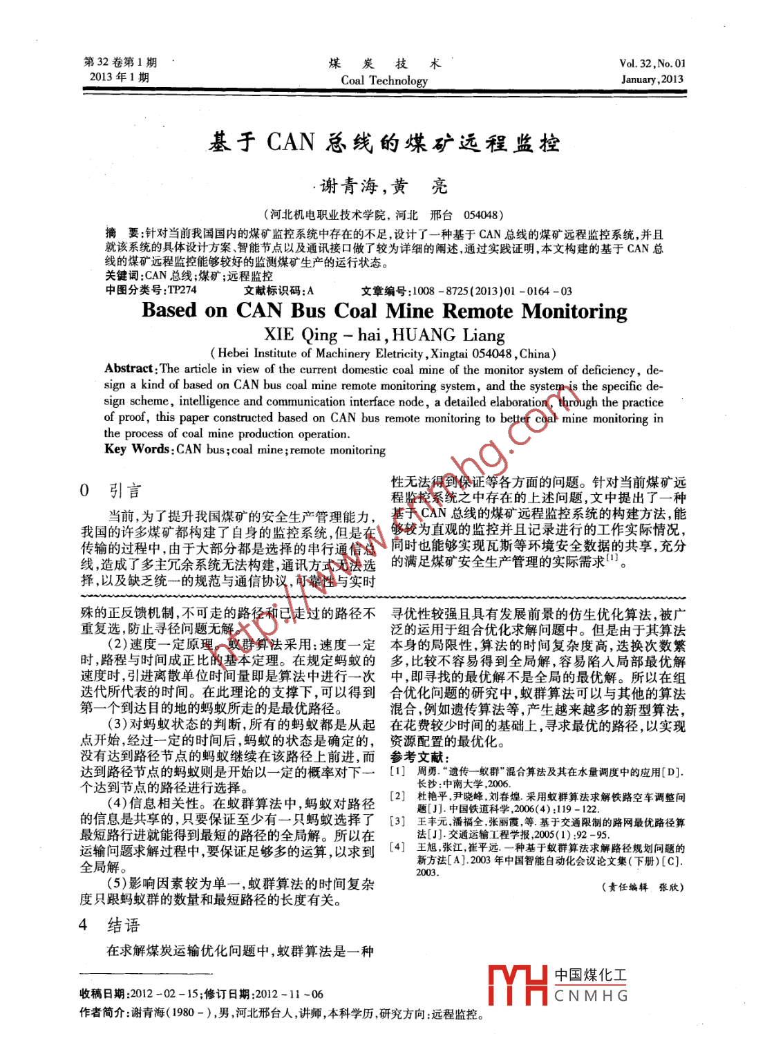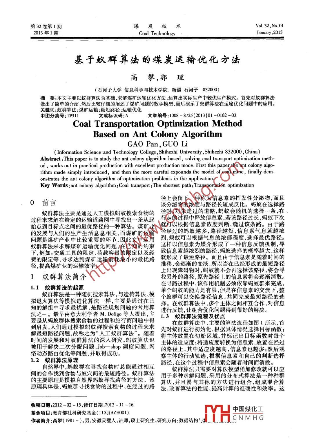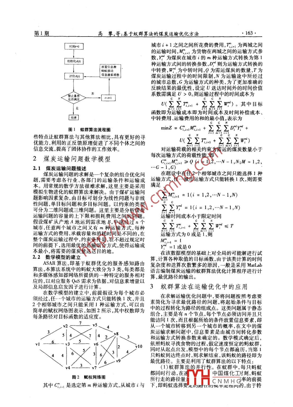 第32卷第1期Vol. 32 , No.012013年1期Coal TechnologyJanuary ,2013基于蟻群算法的煤炭運輸優(yōu)化方法高攀,郭理(石河子大學信息科學與技術學院,新疆石河子832000)摘要:本文主要以蟻群算法 為基礎,求解煤礦運輸優(yōu)化方法,運算出實際生產中較優(yōu)生產模式。首先對蟻群算法做出了簡單的介紹,然后比較仔細的闡述了煤礦問題的數(shù)學模型,最后演示了蟻群算法在運輸優(yōu)化問題中的應用。關鍵詞:蟻群算法;煤礦運輸;最短路徑;運輸優(yōu)化中圖分類號:TP311文獻標識碼:A文章編號:1008 - 8725(2013)01 -0162 -03Coal Transportation Optimization MethodBased on Ant Colony AlgorithmGAO Pan,GUO Li( Information Science and Technology College , Shihezhi University , Shihezhi 832000 ,China)Abstract :This paper is to study the ant colony algorithm based, solving coal transport optimization meth-od, works out in practical production with excellent production mode. First this paper the ant colony algo-rithm made simply introduced, and then the more careful expounds the model of coal mine, finally dem-onstrates the ant colony algorithm of optimization problems in the application.Key Words:ant colony algorithm;Coal transport ;The shortest path; Transportation optimization徑上會留下一種稱為信息素的揮發(fā)性分泌物,而且0前言該分泌物的濃度與路徑長短成反比。螞蟻在選擇路蟻群算法主要是通過人工模擬螞蟻搜索食物的徑時 ,對未走過的道路螞蟻會隨機的選擇-一條,在過程來求解在給定的運輸?shù)缆肪W中尋找出- -條從起行走的過程中釋放信息素,若該路徑過長,螞蟻下次始點到目標點之間的最優(yōu)路徑的一種算法。 煤礦業(yè)就可以根據(jù)信息素 濃度判斷,繞過該條路。由于路的發(fā)展與人們的生產生活息息相關,而煤礦的運輸徑經過的螞蟻越 多,路徑越短,信息素氣息就越濃問題是煤礦產業(yè)中比較重要的環(huán)節(jié),因此文中運用烈,螞蟻可以根 據(jù)氣息的濃郁程度,選擇最優(yōu)路徑。蟻群算法來求解煤礦運輸優(yōu)化問題,在已知的約束這樣以信息素為媒介形成了一種信息反饋機制,導下,例如:交通工具的限定、荷載容量的限定以及經致信息素越濃烈的路徑,螞蟻選擇的概率越大,這樣費的限定等,尋求達到煤礦運輸消耗最小的最優(yōu)路就形成了最短路徑。 而且由于信息素是隨著時間的推移,會逐漸的變淡,所以當在已經形成的最短路徑徑,提高煤礦業(yè)的運輸效率。上出現(xiàn)障礙物時,螞蟻就不會再選擇該路徑,將會尋1蟻群算法簡介找另外的路徑,原先路徑上的信息素將會逐漸消散。在尋路過程中,該作用機制必須依靠螞蟻群來完成,1.1蟻群算法的起源蟻群算法是一種隨機搜索算法,與遺傳算法、模單個螞蟻的能力是有限,但是在信息素的交流下,整擬退火算法等模擬進化算法.-樣,主要是通過在已個蟻群可以交換路徑信息,共同完成最短路徑的選知的解組中尋求最優(yōu)解,是路徑規(guī)劃問題的常用算擇。在蟻群算法中,多個主體之間相互合作,對信息進行反饋,讓組合優(yōu)化問題得到很好的解決。法之一。最早由意大利學者M Dofipo等人提出,主13 蚊群算法流程及憂點要是從螞蟻群體搜索食物的過程和旅行商問題中得在蟻群算法中,主要的算法流程如圖1所示,首到啟發(fā),人們通過模擬螞蟻群搜索食物的過程來求先對蟻群進行初始化,根據(jù)具體情況選擇目標函數(shù);解最短路徑問題,故稱之為“人工蟻群算法”。隨著將主體放置在初始區(qū)域,并標記出目標函數(shù)對每個時間的發(fā)展和對蟻群算法的深人研究,螞蟻算法也主體的適應度;將適應度轉換為信息素,放置在經過被用于解決二次分配問題Job shop 調度問題網的路徑 上,其中適應度越高,信息索也越多:然后觀絡動態(tài)路由優(yōu)化等問題,并取得成功。察主體的行動軌跡,根據(jù)信息素和自已的判斷選擇1.2 蟻群算法原理自然界中,螞蟻群在尋找食物時總能通過相互路徑,在這個過程中信息素會隨著時間而消散。蟻群算法只需要對算法模型稍加修改就可以應間的合作找到食物與蟻穴間的最短路徑。蟻群算法用于多種求解問題, 采用的分布式算法是一種種群的主要原理是模擬自然界螞蟻尋找路徑的方法。該算法,并且易與其他的方法進行組合,組成混合算原理具體是螞蟻群尋找食物的過程中,在經過的路法,改善算法的性能,提高計算的準確性和效率。這收稿日期:2012 -02 -15;修訂日期:2012-11-16中國煤化工基金項目:教育部社科研究基金( IJAZH001)作者簡介:高攀(1981 -),男,安徽靈壁人,講師,碩士研究生,研究方向:數(shù)據(jù)結構與,MYHCNMH G .第1期高攀,等:基于蟻群算法的煤炭運輸優(yōu)化方法●163●時刻∞0城市i + 1之間之間所花費的費用,T.為兩城之間的運輸時間, Mr.為貨物在兩城之間的運輸方式參數(shù),Y"為煤炭在城市i的m種運輸方式轉換為第1初始化4(1) |「 放置信息激種運輸方式間的轉換參數(shù), D;"則為運輸方式轉換的螞蟻移動”中轉費, wn為中轉時間,Q為需運煤炭的數(shù)量,T為評價40)信 息激素消散煤炭運輸過程中的時間限制,N為運輸途中所經過的城市總數(shù),G為運輸方式的種類,為了更加準確的反映結果的最優(yōu)性,設定U送達時間外的時間價值系數(shù)需滿足U > 0。則運輸過程中的時間成本為禁止集件L 1+1UEET. + EE二)。其中目標函數(shù)即為運輸成本即為時間成本及時間補償成本、[結束]中轉費用、運輸費用的和的最小