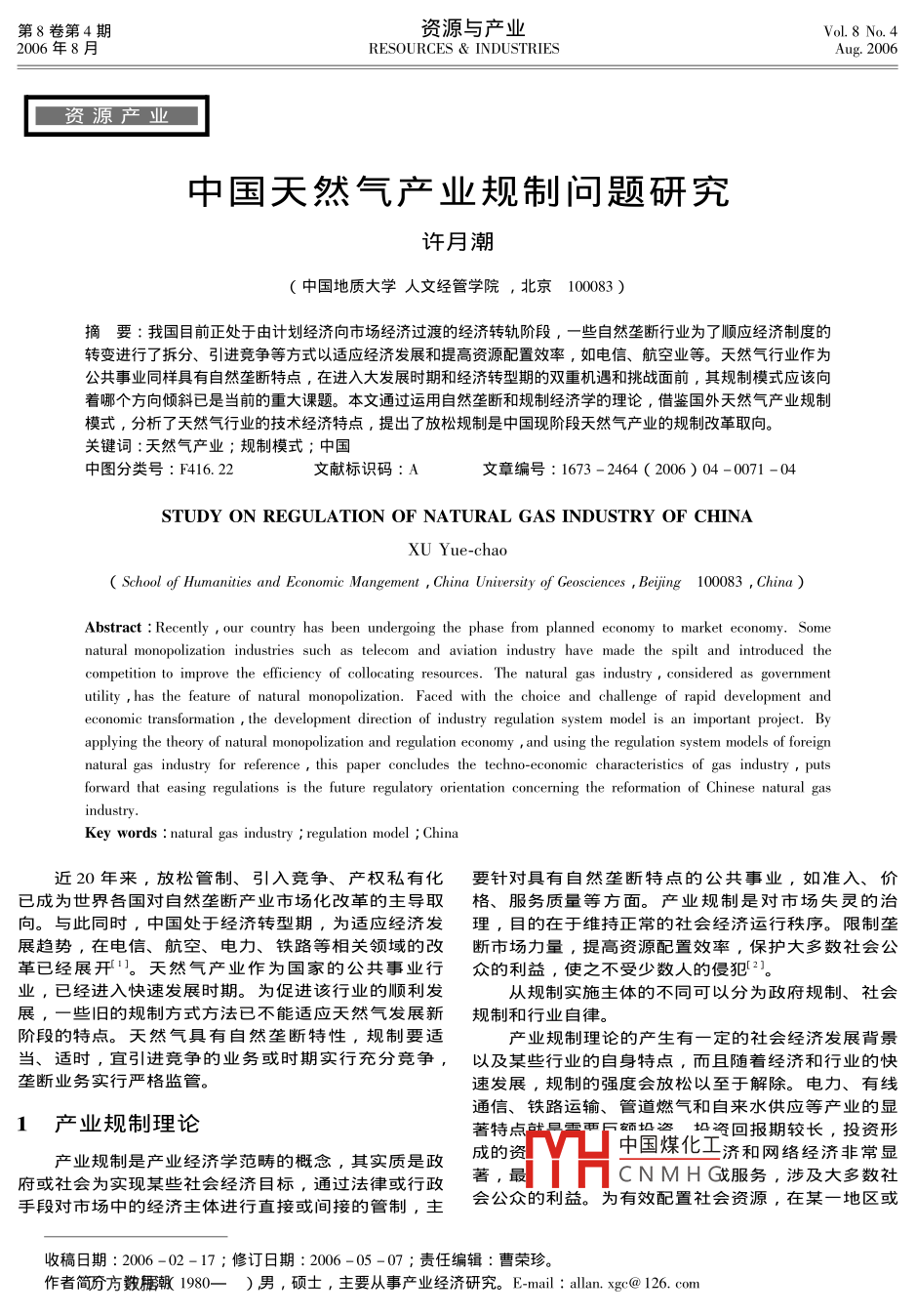 第8卷第4期資源與產(chǎn)業(yè)Vol 8 No. 42006年8月RESOURCES Industries資源產(chǎn)業(yè)中國天然氣產(chǎn)業(yè)規(guī)制問題研究許月潮中國地質(zhì)大學(xué)人文經(jīng)管學(xué)院,北京100083)摘要:我國目前正處于由計(jì)劃經(jīng)濟(jì)向市場(chǎng)經(jīng)濟(jì)過渡的經(jīng)濟(jì)轉(zhuǎn)軌階段,一些自然壟斷行業(yè)為了順應(yīng)經(jīng)濟(jì)制度的轉(zhuǎn)變進(jìn)行了拆分、引進(jìn)競(jìng)爭(zhēng)等方式以適應(yīng)經(jīng)提高資源配置效率,如電信、航空業(yè)等。天然氣行業(yè)作為公共事業(yè)同樣具有自然壟斷特點(diǎn),在進(jìn)入大發(fā)展時(shí)期和經(jīng)濟(jì)轉(zhuǎn)型期的雙重機(jī)遇和挑戰(zhàn)面前,其規(guī)制模式應(yīng)該向著哪個(gè)方向傾斜已是當(dāng)前的重大課題。本文通過運(yùn)用自然壟斷和規(guī)制經(jīng)濟(jì)學(xué)的理論,借鑒國外天然氣產(chǎn)業(yè)規(guī)制模式,分析了天然氣行業(yè)的技術(shù)經(jīng)濟(jì)特點(diǎn),提岀了放松規(guī)制是中國現(xiàn)階段天然氣產(chǎn)業(yè)的規(guī)制改革取向。關(guān)鍵詞:天然氣產(chǎn)業(yè);規(guī)制模式;中國中圖分類號(hào):F416.22文獻(xiàn)標(biāo)識(shí)碼:A文章編號(hào):1673-2464(2006)04-0071-04STUDY ON REGULATION OF NATURAL GAS INDUSTRY OF CHIINAXU Yue-chaoSchool of Humanities and Economic Mangement, China University of Geosciences, Beijing 100083, ChinaAbstract: Recently our country has been undergoing the phase from planned economy to market economy. Somemonopolization industries such as telecom and aviation industry have made the spilt and introduced theompetition to improve the efficiency of collocating resources. The natural gas industry considered as governmentutility, has the feature of natural monopolization. Faced with the choice and challenge of rapid development andeconomic transformation the development direction of industry regulation system model is an important project. Byapplying the theory of natural monopolization and regulation economy and using the regulation system models of foreignnatural gas industry for reference this paper concludes the techno-economic characteristics of gas industry , putsforward that easing regulations is the future regulatory orientation concerning the reformation of Chinese natural gasKey words: natural gas industry regulation model China近20年來,放松管制、引入竟?fàn)?、產(chǎn)權(quán)私有化要針對(duì)具有自然壟斷特點(diǎn)的公共事業(yè),如準(zhǔn)入、價(jià)已成為世界各國對(duì)自然壟斷產(chǎn)業(yè)市場(chǎng)化改革的主導(dǎo)取格、服務(wù)質(zhì)量等方面。產(chǎn)業(yè)規(guī)制是對(duì)市場(chǎng)失靈的治向。與此同時(shí),中國處于經(jīng)濟(jì)轉(zhuǎn)型期,為適應(yīng)經(jīng)濟(jì)發(fā)理,目的在于維持正常的社會(huì)經(jīng)濟(jì)運(yùn)行秩序。限制壟展趨勢(shì),在電信、航空、電力、鐵路等相關(guān)領(lǐng)域的改斷市場(chǎng)力量,提高資源配置效率,保護(hù)大多數(shù)社會(huì)公革已經(jīng)展開1。天然氣產(chǎn)業(yè)作為國家的公共事業(yè)行眾的利益,使之不受少數(shù)人的侵犯2業(yè),已經(jīng)進(jìn)入快速發(fā)展時(shí)期。為促進(jìn)該行業(yè)的順利發(fā)從規(guī)制實(shí)施主體的不同可以分為政府規(guī)制、社會(huì)展,一些舊的規(guī)制方式方法已不能適應(yīng)天然氣發(fā)展新規(guī)制和行業(yè)自律。階段的特點(diǎn)。天然氣具有自然壟斷特性,規(guī)制要適產(chǎn)業(yè)規(guī)制理論的產(chǎn)生有一定的社會(huì)經(jīng)濟(jì)發(fā)展背景當(dāng)、適時(shí),宜引進(jìn)竟?fàn)幍臉I(yè)務(wù)或時(shí)期實(shí)行充分竟?fàn)?以及某些行業(yè)的自身特點(diǎn),而且隨著經(jīng)濟(jì)和行業(yè)的快壟斷業(yè)務(wù)實(shí)行嚴(yán)格監(jiān)管速發(fā)展,規(guī)制的強(qiáng)度會(huì)放松以至于解除。電力、有線通信、鐵路運(yùn)輸、管道燃?xì)夂妥詠硭?yīng)等產(chǎn)業(yè)的顯1產(chǎn)業(yè)規(guī)制理論著特點(diǎn)扭,資回報(bào)期較長(zhǎng),投資形產(chǎn)業(yè)規(guī)制是產(chǎn)業(yè)經(jīng)濟(jì)學(xué)范疇的概念,其實(shí)質(zhì)是政成的資中國煤化工濟(jì)和網(wǎng)絡(luò)經(jīng)濟(jì)非常顯府或社會(huì)為實(shí)現(xiàn)某些社會(huì)經(jīng)濟(jì)目標(biāo),通過法律或行政著,最CNMH咸服務(wù),涉及大多數(shù)社手段對(duì)市場(chǎng)中的經(jīng)濟(jì)主體進(jìn)行直接或間接的管制,主會(huì)公眾的利益。為有效配置社會(huì)資源,在某一地區(qū)或收稿日期:206-02-17;修訂日期:2006-05-07;責(zé)任編輯:曹榮珍。作者簡(jiǎn)分方數(shù)淑1980—)男,碩士,主要從事產(chǎn)業(yè)經(jīng)濟(jì)研究。E-mail:alln.xgc@126.com資源與產(chǎn)業(yè)2006年領(lǐng)域通常有一家廠商或企業(yè)經(jīng)營(yíng)運(yùn)作這些產(chǎn)業(yè)。但的發(fā)展,壟斷性可能會(huì)演化為競(jìng)爭(zhēng)性。總的來說,天是,由于這些企業(yè)擁有相當(dāng)大的市場(chǎng)壟斷力量,如果然氣行業(yè)是競(jìng)爭(zhēng)性行業(yè),部分環(huán)節(jié)具有自然壟斷性。不存在任何外部約束機(jī)制,它們就成為價(jià)格制定者,3.1壟斷性而不是價(jià)格接受者,就有可能通過制定大大高于成本的壟斷價(jià)格,把一部分消費(fèi)者剩余轉(zhuǎn)化為生產(chǎn)者剩認(rèn)為天然氣行業(yè)具有自然壟斷性主