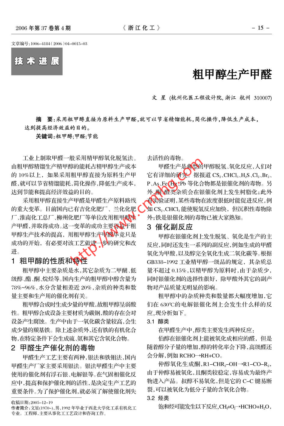 2006年第37卷第4期《浙江化工》.15-文章編號(hào):1006- 4184( 2006 )04- 0015-03技術(shù)進(jìn)展粗甲醇生產(chǎn)甲醛文星(杭州化醫(yī)工程設(shè)計(jì)院,浙江杭州310007)摘要:采用粗甲醇直接為原料生產(chǎn)甲醛,就可以節(jié)省精餾能耗,簡化操作,降低生產(chǎn)成本,達(dá)到提高經(jīng)濟(jì)效益的目的。關(guān)鍵詞:粗甲醇;甲醛;節(jié)能工業(yè)上制取甲醛-般采用精甲醇氧化脫氫法。去活性的毒物。由粗甲醇精餾生產(chǎn)精甲醇的能耗占精甲醇生產(chǎn)成本甲醛生產(chǎn)是典型的甲醇脫氫、氧化反應(yīng),人們對的10%以上,如果采用粗甲醇直接為原料生產(chǎn)甲它有詳細(xì)的研究。據(jù)報(bào)道CS2.CHCl、H$S .Cl2、Br2、醛,就可以節(jié)省精餾能耗,簡化操作,降低生產(chǎn)成本,P、As Fe、Hg、Pb等化合物都是銀催化劑的毒物。另達(dá)到節(jié)能和提高經(jīng)濟(jì)效益的目的。外,酮醛類雜質(zhì)會(huì)在銀催化劑上發(fā)生樹脂化;此外采用粗甲醇直接生產(chǎn)甲醛是甲醛生產(chǎn)原料路線有實(shí)驗(yàn)證明,某些毒物在濃度很低時(shí)能促進(jìn)反應(yīng),例的重大變革。目前國內(nèi)已有吉化化肥廠、蘭化化肥如CS2.CHCl3能使脫氫反應(yīng)加快,但沉積性毒物除廠、淮南化工總廠、柳州化肥廠等單位改用粗甲醇生外;鐵是銀催化劑的毒物已被大家熟知。產(chǎn)甲醛,并取得成功。這- -變革的成功主要得益于粗3催化副反應(yīng)甲醇生產(chǎn)技術(shù)的提高,用粗甲醇生產(chǎn)甲醛畢竟只是甲醇在銀催化劑上發(fā)生脫氫、氧化是生產(chǎn)的主成功的開始,有必要對該工藝做進(jìn)-步的研究和改反應(yīng),同時(shí)還發(fā)生一系列的副反應(yīng),例如生成的甲醛進(jìn)。氧化為甲酸,以及醇完全氧化生成二氧化碳等。根據(jù)1粗甲醇的性質(zhì)和特性GB338- 1992工業(yè)精甲醇一-級(jí) 品的規(guī)定,其雜質(zhì)總粗甲醇中主要雜質(zhì)是水,其它雜質(zhì)為二甲醚、低量不超過0.15% ,以精甲醇為原料時(shí),由于雜質(zhì)少,級(jí)醇、酯酮、烷烴等。國內(nèi)生產(chǎn)的粗甲醇中醇含量為.同時(shí)銀催化劑的選擇性很好,除甲酸外其它的副產(chǎn)78%~96%,水分含量相差近20%,雜質(zhì)的種類和數(shù)物對產(chǎn)品質(zhì)量無明顯的影響。量主要和生產(chǎn)用的催化劑有關(guān)。粗甲醇中的雜質(zhì)種類和數(shù)量都大幅度增加,它粗甲醇合成時(shí)生成少量的甲酸,故粗甲醇呈弱酸們在630C的電解銀催化劑上會(huì)發(fā)生什么樣的反性。粗甲醇合成設(shè)備主要材質(zhì)為碳鋼,酸的存在會(huì)對應(yīng),現(xiàn)分析如下。設(shè)備產(chǎn)生腐蝕。生產(chǎn)中由于- -氧化碳含量較高,會(huì)生3.1 醇類成少量的羰基鐵。除上述雜質(zhì)外,還有鐵的有機(jī)化合在甲醛生產(chǎn)中,醇類主要發(fā)生兩種反應(yīng):物,在特定條件下會(huì)生成硫氨和其它含氧化合物。伯醇在銀催化劑上能被氧化成相應(yīng)的醛,但是2甲醛生產(chǎn)催化劑的毒物隨著醇分子量的增加,醇的轉(zhuǎn)化率會(huì)下降,高級(jí)醛還甲醛生產(chǎn)工藝主要有兩種,銀法和鐵鉬法,國內(nèi)會(huì)分解,例如RCHO- >RH+CO。甲醛生產(chǎn)廠家主要采用銀法。銀法甲醛生產(chǎn)中主要仲醇氧化生成酮,R1-CHR2-OH-→R1-CO- R,使用的催化劑有浮石銀、電解銀等。在氣固相催化反由于仲醇易被氧化,且酮類較穩(wěn)定,容易成為最終產(chǎn)應(yīng)中,提高和保護(hù)催化劑的活性,是決定生產(chǎn)工藝的物進(jìn)入產(chǎn)品。叔醇不易氧化,但是它的C-C鍵易斷重要條件。為了保護(hù)催化劑,就必須了解使催化劑失裂,可以被氧化為低分子量的含氧化合物。3.2烴類收稿日期:2005-12- -19作者簡介:文星(1970-),男. 1992年畢業(yè)于西北大學(xué)化I系有機(jī)化工飽和烴可能發(fā)生以下反應(yīng),CH,+O2 >HCHO+H2O,專業(yè)。工程師,主要從事化工工藝設(shè)計(jì)和咨詢工作。16 -ZHEJIANG CHEMICAL INDUSTRYVol.37 No.4 (2006)甲烷部分氧化生成甲醛具有重要意義。高級(jí)烴隨碳原子的增加氧化更容易,得到醇、醛、酮、酸等混合物3.3酮類酮類氧化首先是在羰基的ax碳原子上形成過氧化物,然后進(jìn)一-步裂解生成醛和酮, RICOCH,R2-→R1COCH( 0OH )R2-→R1COOH+R,CHO。氣3.4醚類低級(jí)醚類氧化生成有機(jī)過氧化物,如乙醚生成具有如下結(jié)構(gòu)的過氧化物,CH-CH (OH)-0-O1、凈化器2、 甲醇高位槽3、蒸發(fā)器4、過熱阻火器5、三元-CH( OH )-CHs,醚的過氧化物不易揮發(fā),受熱易爆氣過濾器6、 甲醇氧化器7、 甲醛吸收塔炸,因此,醚在蒸餾時(shí)不能蒸干,以免發(fā)生爆炸。圖1生產(chǎn)工藝流程簡圖粗甲醇中還有酸酯等組分,在反應(yīng)條件下不單5粗甲醇生產(chǎn)甲醛的工藝條件分析純是氧化反應(yīng),還會(huì)發(fā)生其它更為復(fù)雜的反應(yīng)。但用粗甲醇代替精甲醇生產(chǎn)甲醛是對傳統(tǒng)工藝的是,在實(shí)際生產(chǎn)中,粗甲醇在采用各種預(yù)處理后,雜挑戰(zhàn),必須在精確理解傳統(tǒng)工藝的基礎(chǔ)上提出新的質(zhì)含量顯著下降,副反應(yīng)產(chǎn)物對產(chǎn)品質(zhì)量的影響不工藝條件。從理論上和實(shí)際操作上都要做到穩(wěn)妥可大。國內(nèi)已投產(chǎn)成功的廠家生產(chǎn)的甲醛能夠達(dá)到優(yōu)靠。工藝指標(biāo)的確定必須以維護(hù)安全生產(chǎn),