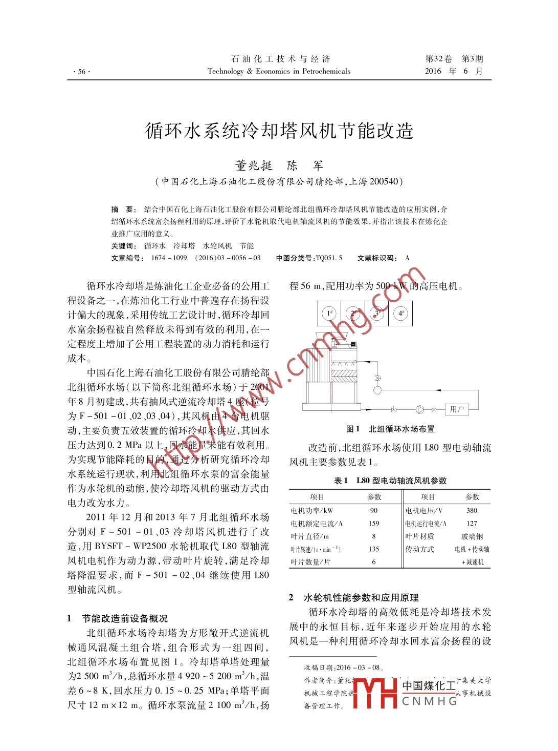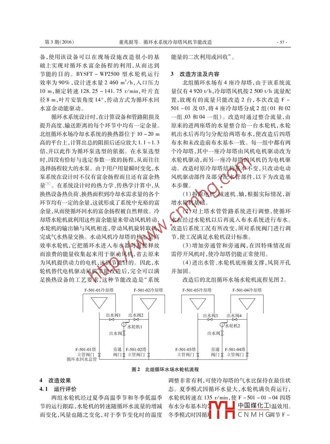 石油化工技術(shù)與經(jīng)濟(jì)第32卷第3期. 56.Technology & Economics in Petrochemicals2016年6月循環(huán)水系統(tǒng)冷卻塔風(fēng)機(jī)節(jié)能改造.董兆挺陳軍(中國(guó)石化上海石油化工股份有限公司腈綸部,上海200540)摘要:結(jié)合中國(guó)石化上海石油化工股份有限公司睛綸部北組循環(huán)冷卻塔風(fēng)機(jī)節(jié)能改造的應(yīng)用實(shí)例,介紹循環(huán)水系統(tǒng)富余揚(yáng)程利用的原理,評(píng)價(jià)了水輪機(jī)取代電機(jī)軸流風(fēng)機(jī)的節(jié)能效果,并指出該技術(shù)在煉化企業(yè)推廣應(yīng)用的意義。關(guān)鍵詞:循環(huán)水 冷卻塔 水輪風(fēng)機(jī) 節(jié)能文章編號(hào): 1674- 1099 (2016)03 - 0056-03中圖分類號(hào) :TQ051.5文獻(xiàn)標(biāo)識(shí)碼: A循環(huán)水冷卻塔是煉油化工企業(yè)必備的公用工程56 m,配用功率為500 kW的高壓電機(jī)。程設(shè)備之一,在煉油化工行業(yè)中普遍存在揚(yáng)程設(shè)計(jì)偏大的現(xiàn)象,采用傳統(tǒng)工藝設(shè)計(jì)時(shí),循環(huán)冷卻回|@@|@@水富余揚(yáng)程被自然釋放未得到有效的利用,在一定程度上增加了公用工程裝置的動(dòng)力消耗和運(yùn)行中國(guó)石化上海石油化工股份有限公司腈綸部北組循環(huán)水場(chǎng)(以下簡(jiǎn)稱北組循環(huán)水場(chǎng))于2001O-年8月初建成,共有抽風(fēng)式逆流冷卻塔4座(位號(hào)一-0兩-用戶為F-501 -01、02、03、04),其風(fēng)機(jī)由4臺(tái)電機(jī)驅(qū)動(dòng),主要負(fù)責(zé)五效裝置的循環(huán)冷卻水供應(yīng),其回水圖1北 組循環(huán)水場(chǎng)布置壓力達(dá)到0.2MPa以上,回水能量未能有效利用。改造前,北組循環(huán)水場(chǎng)使用L80型電動(dòng)軸流為實(shí)現(xiàn)節(jié)能降耗的目的,通過(guò)分析研究循環(huán)冷卻風(fēng)機(jī)主要參數(shù)見(jiàn)表1。水系統(tǒng)運(yùn)行現(xiàn)狀,利用北組循環(huán)水泵的富余能量表1 L80 型電動(dòng)軸流風(fēng)機(jī)參數(shù)作為水輪機(jī)的動(dòng)能,使冷卻塔風(fēng)機(jī)的驅(qū)動(dòng)方式由項(xiàng)目參數(shù)電力改為水力。電機(jī)功率/kW90電機(jī)電壓/V3802011年12月和2013年7月北組循環(huán)水場(chǎng)電機(jī)額定電流/A電機(jī)運(yùn)行電流/A12分別對(duì)F -501 -01、03冷卻塔風(fēng)機(jī)進(jìn)行了改葉片直徑/m葉片材質(zhì)玻璃鋼造,用BYSFT-WP2500水輪機(jī)取代L80型軸流葉片轉(zhuǎn)速/(r. min- I)| 傳動(dòng)方式電機(jī)+傳動(dòng)軸風(fēng)機(jī)電機(jī)作為動(dòng)力源,帶動(dòng)葉片旋轉(zhuǎn),滿足冷卻葉片數(shù)量/片+減速機(jī)塔降溫要求,而F -501 -02、04 繼續(xù)使用L80型軸流風(fēng)機(jī)。2水輪機(jī)性能參數(shù)和應(yīng)用原理循環(huán)水冷卻塔的高效低耗是冷卻塔技術(shù)發(fā)1節(jié)能改造前設(shè)備概況北組循環(huán)水場(chǎng)冷卻塔為方形敞開(kāi)式逆流機(jī)展中的永恒目標(biāo),近年來(lái)逐步開(kāi)始應(yīng)用的水輪械通風(fēng)混凝土組合塔,組合形式為一組四間,風(fēng)機(jī)是-一種利用循環(huán)冷卻水回水富余揚(yáng)程的設(shè)北組循環(huán)水場(chǎng)布置見(jiàn)圖1。冷卻塔單塔處理量收稿日期:2016-03 -08。為2 500 m'/h,總循環(huán)水量4920~5 200 m'/h,溫作者簡(jiǎn)介:董兆中國(guó)煤化工于集美大學(xué)差6~8 K,回水壓力0. 15 ~0.25 MPa;單塔平面機(jī)械工程學(xué)院熱事機(jī)械設(shè)YHCNMH G尺寸12 mx12 m。循環(huán)水泵流量2 100 m'/h,揚(yáng)備管理工作。第3期( 2016)董兆挺等.循環(huán)水系統(tǒng)冷卻塔風(fēng)機(jī)節(jié)能改造備,使用該設(shè)備可以在現(xiàn)場(chǎng)設(shè)施改造很小的基能量的二次利用或回收”。礎(chǔ)上實(shí)現(xiàn)對(duì)循環(huán)水富余揚(yáng)程的利用,從而達(dá)到節(jié)能的目的。BYSFT- WP2500型水輪機(jī)運(yùn)行3改造方法及 內(nèi)容效率為90% , 設(shè)計(jì)進(jìn)水量2460 m'/h,人口壓力北組循環(huán)水場(chǎng)有4座冷卻塔,由于該系統(tǒng)流10 m,額定轉(zhuǎn)速128.25 ~ 141.75 r/min,葉片直量?jī)H有4920t/h,冷卻塔風(fēng)機(jī)按2500t/h流量配徑8m,葉片安裝角度14°,傳動(dòng)方式為循環(huán)水回置,故現(xiàn)有的流量只能改造2臺(tái),本次改造F -水富余動(dòng)能驅(qū)動(dòng)。501 -01及03,將4座冷卻塔分成2組(01和02循環(huán)水系統(tǒng)設(shè)計(jì)時(shí),在計(jì)算設(shè)備和管路阻損及一組、03和04一組)。改造時(shí)通過(guò)整合流量,由提升高度、輸送距離的每個(gè)環(huán)節(jié)中均有- -定余量。原來(lái)的進(jìn)兩座塔的水量整合給- - 臺(tái)水輪機(jī),水輪北組循環(huán)水場(chǎng)冷卻水系統(tǒng)的換熱器位于10 ~ 20 m機(jī)出水后再均勻分配給兩塔布水,使改造后四塔高的平臺(tái)上,計(jì)算出總的阻損后還應(yīng)放大1.1~1.3布水和未改造前布水基本一致。每一-組中都有兩倍,并以此作為循環(huán)泵選型的依據(jù)。在水泵選型個(gè)冷卻塔,其中一座冷卻塔由風(fēng)機(jī)電機(jī)驅(qū)動(dòng)改為時(shí),因沒(méi)有恰好與選定參數(shù)- - 致的揚(yáng)程,從而往往水輪機(jī)驅(qū)動(dòng),而另一座冷卻塔的風(fēng)機(jī)仍為電機(jī)驅(qū)選擇揚(yáng)程較大的水泵。由于用戶用量瞬時(shí)變化,水動(dòng)。改造時(shí)原冷卻塔結(jié)構(gòu)基本不變,只改動(dòng