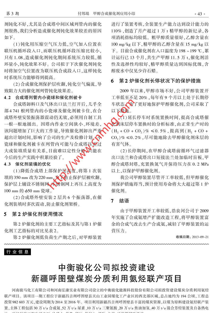 第52卷第3期化肥設(shè)計June 20142014年6月Chemical Fertilizer Design●41甲醇合成催化劑應(yīng)用小結(jié)付邦琨(黑龍江北大荒農(nóng)業(yè)股份有限公司浩良河化肥分公司,黑龍江伊春153103)摘要:介紹了黑龍江北大荒農(nóng)業(yè)股份有限公司浩良河化肥分公司甲醇合成系統(tǒng)的工藝流程和主要設(shè)備;分析了甲醇合成塔第1爐催化劑使用過程中出現(xiàn)的問題;總結(jié)了第2爐催化劑使用過程中的優(yōu)化措施及運行效果;提出了第2爐催化劑在甲醇裝置開工率較低情況下的保護措施。關(guān)鍵詞:甲醇合成;催化劑;應(yīng)用doi : 10.3969/j. issn.1004 - 8901. 2014. 03. 012中圖分類號: TQ426. 64.文獻標(biāo)識碼:B文 章編號:1004 - 8901 (2014)03 -0041 -03Applicationand Summarization of Methanol Synthesis CatalystFU Bang- kun( Haolianghe Chemical Fertilizer Sub- company, Heilongjiang Beidahuang Agriculture Stock Company Ld.,Yichun Heilongjiang 153103 China)Abstract : Author has introduced the process flow and the main equipment of methanol synthesis system in Haolianghe Chemical Fertilizer Sub-compa-ny, Heilongjiang Beidahuang Agriculture Stock Company Ltd. ; has analyzed the existing problems in applying process of catalyst in the first furnace ofmethanol reactor; has summarized the optimized measure and the running effect in applying process of catalyst in the second furnace of methanol reactor;has presented the protecting measure under lower operating rate of methanol plant for catalyst of the second furnace.Key words:methanol synthesis; catalyst; applicationdoi;10. 3969/j. isn.1004 - 8901.2014.03.012黑龍江北大荒農(nóng)業(yè)股份有限公司浩良河化肥貯罐,閃蒸氣送火炬放空。分公司10萬/a甲醇合成塔采用φ3400mm等溫2主要設(shè)備規(guī)格及工藝指標(biāo)反應(yīng)器,第1爐甲醇合成催化劑運行2年,2008年大檢修期間更換了甲醇合成催化劑,以下將合成催主要設(shè)備規(guī)格見表1,主要工藝指標(biāo)見表2?;瘎┑氖褂?、更換情況小結(jié)如下。表1主要設(shè)備規(guī)格1工藝流程序號設(shè)備名稱規(guī)格1 甲醇合成塔φ內(nèi)3 400 mm,H≈11 124 mm .甲醇合成氣凈化系統(tǒng)采用中溫部分一氧化碳.反應(yīng)管:φ38 mm x2 mm,n =4 741根,L =變換、中溫有機硫水解、濕法脫硫、熱鉀堿脫碳、常6000mm,內(nèi)裝觸媒:27.5m3溫有機硫水解、常溫氧化鋅脫硫。為了節(jié)省工程投汽包φ1 200 mm,V=6 m3資,該凈化裝置由浩良河分公司2套閑置的合成氨3入塔氣預(yù)熱器 φμ1400 mm,H≈16152 mm .凈化裝置改造而來。換熱管:φ14 x2 mm,n=3 760根,L=11 500 mm甲醇合成氣經(jīng)聯(lián)合壓縮機合成段壓縮與甲醇3甲醇水冷器中內(nèi)1200mm,L≈9736mm分離器來循環(huán)氣混合,再經(jīng)聯(lián)壓機循環(huán)段壓縮,經(jīng)換熱管:19 mm x2 mm,n=1 737根,L =7000 mm,由循環(huán)氣過濾器濾油后,進人塔氣預(yù)熱器預(yù)熱后進換熱面積:F =698. 1 m2人甲醇合成塔,出塔氣經(jīng)人塔氣預(yù)熱器預(yù)熱甲醇合4甲醇分離器φ內(nèi)2200 mm,H≈7935 mm,V≈21.34 m' ,內(nèi)設(shè)成人塔氣后進人甲醇水冷器、經(jīng)甲醇分離器分離甲高效除沫網(wǎng)δ=150mm.醇和水后,循環(huán)氣返回聯(lián)合壓縮機循環(huán)段壓縮,循環(huán)使用。弛放氣送合成氨凈化裝置- -低變前。甲作者簡介:付邦琨(1978年-),男,黑龍江伊春人,2001年畢業(yè)于齊齊哈爾大學(xué)化學(xué)工程與工藝專業(yè),工程師,現(xiàn)從事甲醇裝置生產(chǎn)技醇分離器內(nèi)的粗甲醇經(jīng)閃蒸槽閃蒸后送往粗甲醇術(shù)管理工作?!?2●化肥設(shè)計2014年第52卷續(xù)表人塔氣量突然增大,合成塔人口溫度有降低的過序號設(shè)備名稱規(guī)格程,低溫反應(yīng)氣進人催化劑床層時易產(chǎn)生石蠟。停.聯(lián)合壓縮機M-17/22 - 47.6-63/47.5 -51.5,附電機:車階段,系統(tǒng)置換不及時、不徹底,殘余的C0、H2通N=1600 kW過合成塔低溫反應(yīng)區(qū)也易產(chǎn)生石蠟。合成段:Q = 19860 m2/h,循環(huán)段:Q= 153 5803.2粗甲醇中乙醇含量過高m'/h甲醇合成塔導(dǎo)投料1個月后,我公司開始分析6循環(huán)器過濾器DNI800mm,H≈7500mm,內(nèi)設(shè)微濾膜、超粗甲醇中的乙醇含量,分析結(jié)果始終較高,平均達濾膜到1 500 mg/kg以上,最高達到5000 mg/kg以上,使表2主要工藝指標(biāo)得一段時間內(nèi)精甲醇產(chǎn)品中乙醇含量高達200 mg/kg之上,不僅增加了精餾過程的消耗,而且降低了甲第1爐第2爐催化劑序號項目催化劑(110%負荷)醇產(chǎn)品在市場上的競爭力。合成塔壓差/kPa .< 200150粗甲醇中的乙醇含量是判斷甲醇合成反應(yīng)副2合成塔 人口壓力/MPa4.5.5反應(yīng)多少的主要依據(jù)。我公司甲醇開車以來的半年內(nèi),由于裝置穩(wěn)定性能較差,開停車及加減負荷3弛放 氣壓力/MPa .4.4.3頻繁,氣體組分經(jīng)常波動,甲醇水冷器結(jié)蠟嚴(yán)重,4合成塔入口溫度/C195 ~ 220196~ 197粗甲醇中乙醇含量過高也是難以避免的。隨著甲5合 成塔出口溫度/C220 ~ 26024醇裝置運行穩(wěn)定性的提高,粗甲醇中的乙醇含量6合成塔殼層爐水溫度/C 220 ~26022逐漸降低至1 500 mg/kg以下,精甲醇中的乙醇含7人塔氣CO含量/%6~85~7量也降至50mg/kg以下,能夠達到產(chǎn)品出口的質(zhì)8人塔氣CO2含量/%2~64~6量要求。3.3甲醇合 成塔壓差過高3第1爐催化劑運行中出現(xiàn)的問題甲醇催化劑使用1年后,甲醇合成塔壓差逐漸升高,經(jīng)常超過設(shè)備要求的工藝指標(biāo)250kPa。為了3.1甲醇水冷器結(jié)蠟2006年11月3日甲醇合