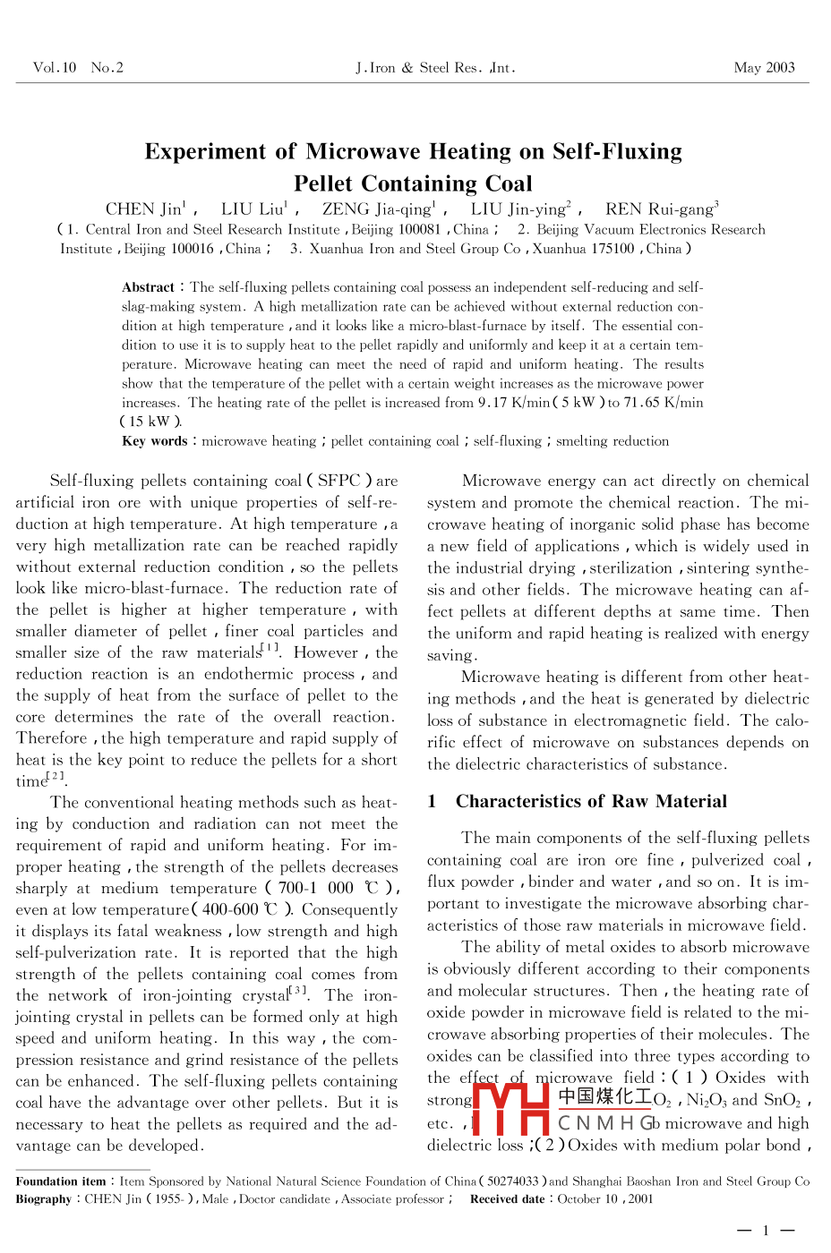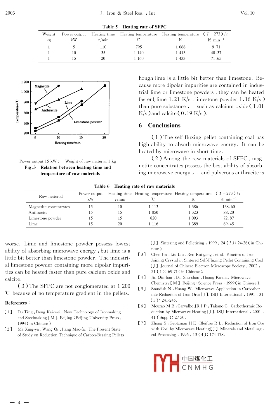J. Iron Steel Res, IntMay 2003Experiment of microwave Heating on Self-FluxingPellet Containing CoalCHEN Jin', LIU Liu, ZENG Jia-qinLIU Jin-ying, REn Rui-gang(1. Central Iron and Steel Research Institute, Beijing 100081, China; 2. Beijing Vacuum Electronics ResearchInstitute, Beijing 100016, China; 3. Xuanhua Iron and Steel Group Co, Xuanhua 175100, China)Abstract: The self-fluxing pellets containing coal possess an independent self-reducing and selfslag-making system. A high metallization rate can be achieved without external reduction condition at high temperature and it looks like a micro-blast-furnace by itself. The essential condition to use it is to supply heat to the pellet rapidly and uniformly and keep it at a certain tem-perature. Microwave heating can meet the need of rapid and uniform heating. The resulshow that the temperature of the pellet with a certain weight increases as the microwave powerincreases. The heating rate of the pellet is increased from 9 17 K/min( 5 kW)to 71.65 K/minKey words: microwave heating i pellet containing coal self-fluxing smelting reductionSelf-fluxing pellets containing coal( SFPC )areMicrowave energy can act directly on chemicalartificial iron ore with unique properties of self-re- system and promote the chemical reaction. The miduction at high temperature. At high temperature a crowave heating of inorganic solid phase has becomevery high metallization rate can be reached rapidly a new field of applications which is widely usedal reduction condition so the pellets the industrial drying sterilization sintering synthelook like micro-blast-furnace. The reduction rate of sis and other fields. The microwave heating can afthe pellet is higher at higher temperature with fect pellets at different depths at same time. Thensmaller diameter of pellet, finer coal particles and the uniform and rapid heating is realized with energysmaller size of the raw materialL. However the savingreduction reaction is an endothermic process andMicrowave heating is different from other heatthe supply of heat from the surface of pellet to the ing methods and the heat is generated by dielectriccore determines the rate of the overall reactionloss of substance in electromagnetic field. The caloTherefore the high temperature and rapid supply of rific effect of microwave on substances depends oheat is the key point to reduce the pellets for a short the dielectric characteristics of substancetime21The conventional heating methods such as heat- 1 Characteristics of Raw Materialng by conduction and radiation can not meet therequirement of rapid and uniform heating. For imThe main components of the self-fluxing pelletsproper heating, the strength of the pellets decreases containing coal are iron ore fine, pulverized coalsharply at medium temperature( 700-1 000 C). flux powder binder and water and so on. It is ineven at low temperature( 400-600 C ) Consequently portant to investigate the microwave absorbing charit displays its fatal weakness low strength and high acteristics of those raw materials in microwave fieldself-pulverization rate. It is reported that the highThe ability of metal oxides to absorbmicrowavestrength of the pellets containing coal comes from is obviously different according to their componentsthe network of iron-jointing crystal[]. The iron- and molecular structures. Then the heating rate ofJointing crystal in pellets can be formed only at high oxide powder in microwave field is related to the mispeed and uniform heating. In this way, the com- crowave absorbing properties of their molecules. Thepression resistance and grind resistance of the pellets oxides can be classified into three types according toI have the advantage over other pellets. B中國煤化工O, Ni,O and Srnecessary to heat the pellets as required and the ad- etcCN MH Gb microwave and highvantage can be developeddielectric loss 2 )Oxides with medium polar bondFoundation item: Item Sponsored by National Natural Science Foundation of China( 50274033)and Shanghai Baoshan Iron and Steel groupBiography: CHEN Jin(1955), Male, Doctor candidate Associate professor; Received date: October 10, 2001J. Iron Steel Res. , I1Vol 10such as Fe3O4, Fe, O3, Cr,O3 and V2 Os, etc. their are shown in Table 14)ability to absorb microwave is weak at the beginningAccording to Table 1 there are a high heatingand becomes stronger after a period ;(3 )Oxideate for coal magnetite and manganese ore in micro-with weak polar bond such as AlO3, TiO2 and wave field a medium rate for lime and siderite andMoO2, etc. are transparent to microwave, anda. In addition, water and sometheir temperature increases very slowly or even does organic compounds are good at absorbing microwavenot increase 41. The heating rates of some substances energy (see Table 2)Table 1 Heating rate of some substancesMolecular Heating temperature Heating temperature Heating time T-273)/tAmorphous carbon(