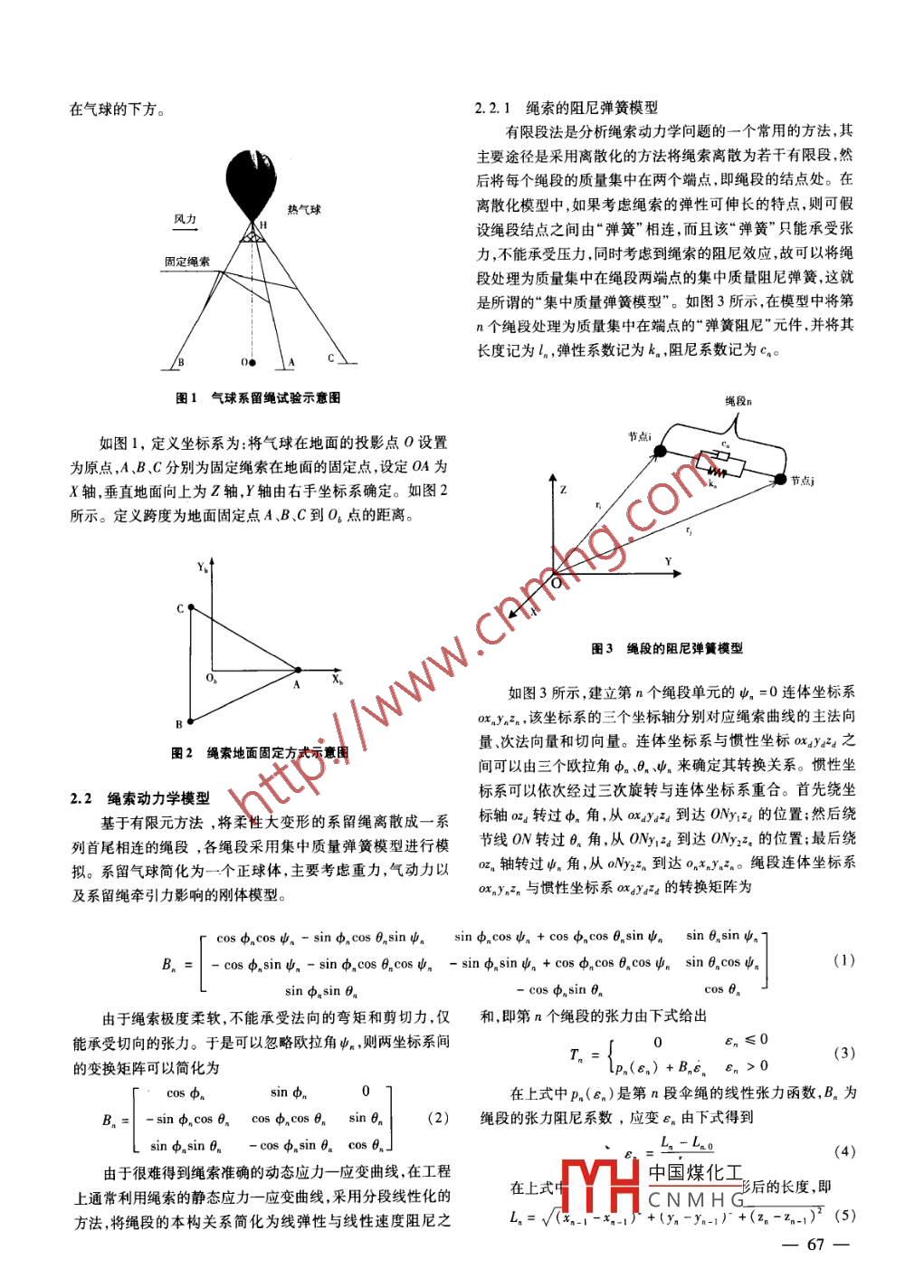 第卷第12期計(jì)算機(jī)仿真2012年12月文章編號(hào):1006-9348(2012)12-0066-05系留氣球平臺(tái)動(dòng)力學(xué)仿真研究楊方,張青斌,豐志偉(國防科技大學(xué)航天與材料工程學(xué)院湖南長沙410073)摘要:研究系留氣球平臺(tái)設(shè)計(jì)問題,隨著人類探索太空技術(shù)的不斷進(jìn)步,空間任務(wù)也變的越來越復(fù)雜。以空間繩網(wǎng)為柔性部件是最近發(fā)展起來的空間概念,在空間任務(wù)中發(fā)揮越來越大的作用,而柔性部件研究是當(dāng)今世界學(xué)術(shù)研究的重點(diǎn)技術(shù),需要通過大量的試驗(yàn)分析繩網(wǎng)的性能。根據(jù)繩網(wǎng)地面試驗(yàn)的需要,建立了系留繩氣球平臺(tái)動(dòng)力學(xué)模型,分析了不同構(gòu)建方式下的系留氣球平臺(tái)的穩(wěn)定性,同時(shí)分析地面環(huán)境下風(fēng)力干擾作用對(duì)系留氣球平臺(tái)穩(wěn)定性的影響,提出了構(gòu)建穩(wěn)定系留氣球平臺(tái)的方法,并將仿真結(jié)果與地面試驗(yàn)結(jié)果進(jìn)行對(duì)比,結(jié)果一致關(guān)鍵詞:系留氣球;仿真;空氣動(dòng)力;地面實(shí)驗(yàn)中圖分類號(hào):0313文獻(xiàn)標(biāo)識(shí)碼:BDynamic Model and Analysis of Tethered Balloon SystemYANG Fang, ZHANG Qing-bin, FENG Zhi-weiCollege of Aerospace and Material Engineering, National Univ. of Defense TechnologyChangsha Hunan 410073, China)ABSTRACT: With the advance of explorating of space technology, space missions become more complex. Repre-sentatives of space webs technology as a flexible rope course is recently developed in the parts of the space concept inthe near future, and plays an increasing role in space missions. The academic research of flexible parts in the worldis a difficult problem that requires a lot of ground tests to analyse the performance of rope. Based on the rope test, weet up a dynamic model of the tethered balloon platform, analysed the stability of the different modes in different tethered balloon platform and the effects on the stability of the platform of the wind power in the ground environment, pro-posed the advise of building a tethered balloon platform approach, and tested the platform with the ground rope emission. The results are no differenceKEYWORDS: Tethered Balloon; Simulation; Aerodynamics; Ground Experiments等參數(shù)對(duì)高空系留氣球設(shè)計(jì)的影響得出風(fēng)場對(duì)系留氣球系1引言統(tǒng)的影響最大。史獻(xiàn)林,余莉施紅等利用有限元法建立隨著空間技術(shù)的發(fā)展,對(duì)以空間繩網(wǎng)為代表的柔性在軌繩索模型,分析了系留氣球的繩孔過程。服務(wù)技術(shù)的需求越來越迫切。相對(duì)剛性結(jié)構(gòu)而言,柔性部件對(duì)系留氣球的研究主要就是要建立一個(gè)穩(wěn)定的空間繩結(jié)構(gòu)小,質(zhì)量輕,設(shè)計(jì)靈活性高,在太空任務(wù)中能夠更好的完網(wǎng)地面試驗(yàn)的平臺(tái)。本文利用集中質(zhì)量彈簧模型建立了系成對(duì)空間非合作目標(biāo)的捕獲。為了研究繩網(wǎng)在太空的展開留繩的仿真模型;主要考慮氣動(dòng)力的影響將氣球簡化為剛抓捕的動(dòng)力學(xué)過程,分析繩網(wǎng)空間抓捕性能,同時(shí)降低成本,體建立氣球動(dòng)力學(xué)模型;對(duì)比不同構(gòu)建模型,同時(shí)分析在自需要進(jìn)行合理的地面試驗(yàn)。本文的目的就是在地面環(huán)境下然風(fēng)力作用下系留氣球系統(tǒng)的穩(wěn)定性提出構(gòu)建系留氣球平建立一個(gè)穩(wěn)定的繩網(wǎng)地面發(fā)射試驗(yàn)平臺(tái)。臺(tái)的方法,為繩網(wǎng)拋射試驗(yàn)提供良好的試驗(yàn)基礎(chǔ)。A. J. Euler等'對(duì)分析了高空系留氣球的可靠性,研究了在20km高空布置系留氣球的可行性;1996年,S.S.Bade.2系留氣球動(dòng)力學(xué)模型sha等分析了阻力系數(shù)下沉氣流、系留繩長度和大氣環(huán)境2.1試驗(yàn)?zāi)P屠K網(wǎng)發(fā)V山中國煤化工氣球、三條固定繩索和有效載收稿日期:2012CNMHGE繩索的一段連接為懸置在空中熱回定在地面上,有效載荷懸掛在氣球的下方。2.2.1繩索的阻尼彈簧模型有限段法是分析繩索動(dòng)力學(xué)問題的一個(gè)常用的方法,其主要途徑是采用離散化的方法將繩索離散為若干有限段,然后將每個(gè)繩段的質(zhì)量集中在兩個(gè)端點(diǎn),即繩段的結(jié)點(diǎn)處。在熱氣球離散化模型中,如果考慮繩索的彈性可伸長的特點(diǎn)則可假A設(shè)繩段結(jié)點(diǎn)之間由“彈簧”相連,而且該“彈簧”只能承受張固定繩索力,不能承受壓力同時(shí)考慮到繩索的阻尼效應(yīng),故可以將繩段處理為質(zhì)量集中在繩段兩端點(diǎn)的集中質(zhì)量阻尼彈簧,這就是所謂的“集中質(zhì)量彈簧模型”。如圖3所示,在模型中將第n個(gè)繩段處理為質(zhì)量集中在端點(diǎn)的“彈簧阻尼”元件,并將其長度記為ln,彈性系數(shù)記為kn阻尼系數(shù)記為Cn。圖1氣球系留繩試驗(yàn)示意圖繩段如圖1,定義坐標(biāo)系為:將氣球在地面的投影點(diǎn)O設(shè)置為原點(diǎn),A、BC分別為固定繩索在地面的固定點(diǎn),設(shè)定OA為X軸,垂直地面向上為Z軸,Y軸由右手坐標(biāo)系確定。如圖2所示。定義跨度為地面固定點(diǎn)A、B、C到O點(diǎn)的距離圖3繩段的阻尼彈簧模型如圖3所示,建立第n個(gè)繩段單元的ψ=0連體坐標(biāo)系ox,y2,該坐標(biāo)系的三個(gè)坐標(biāo)軸分別對(duì)應(yīng)繩索曲線的主法向圖2