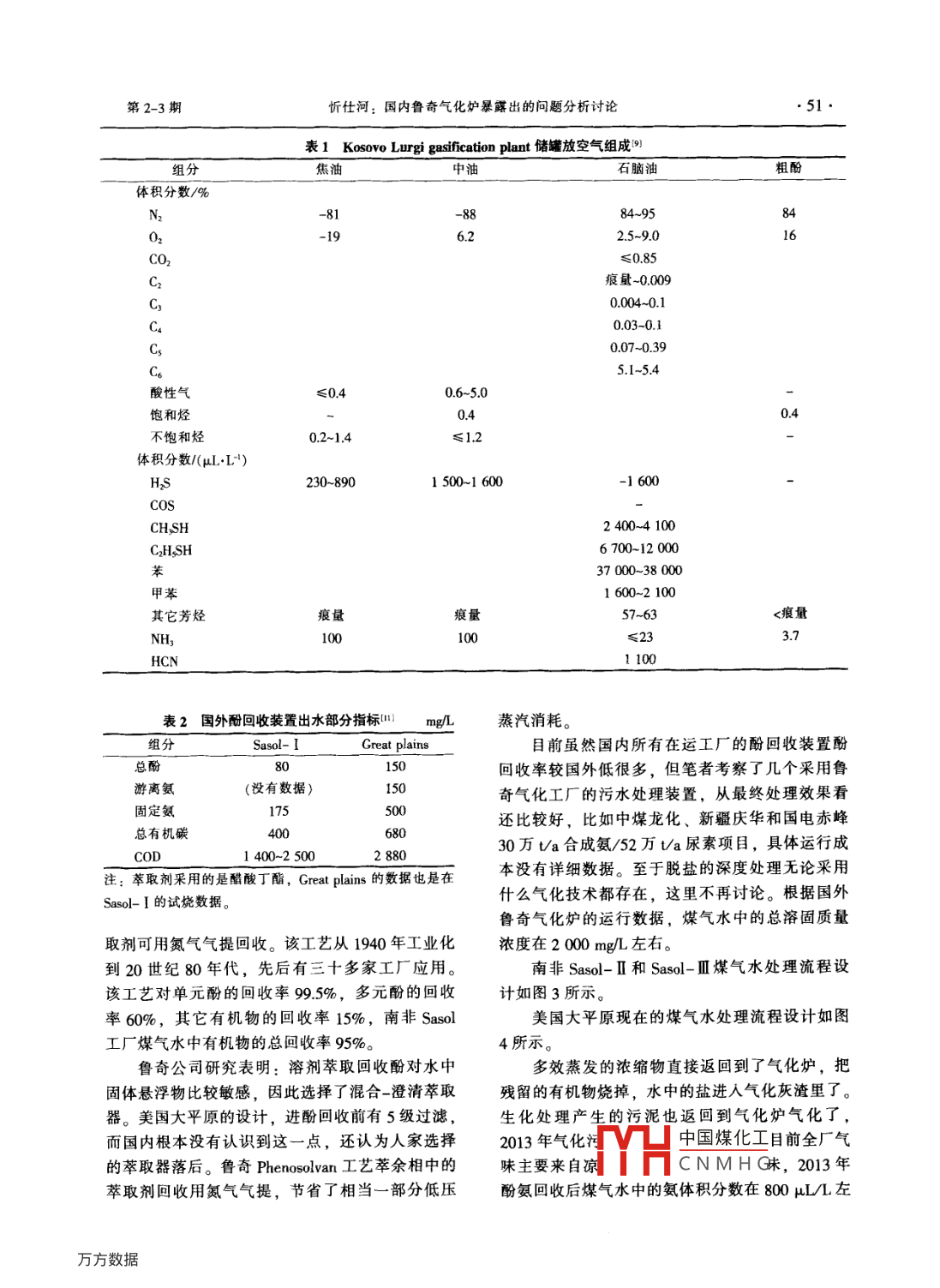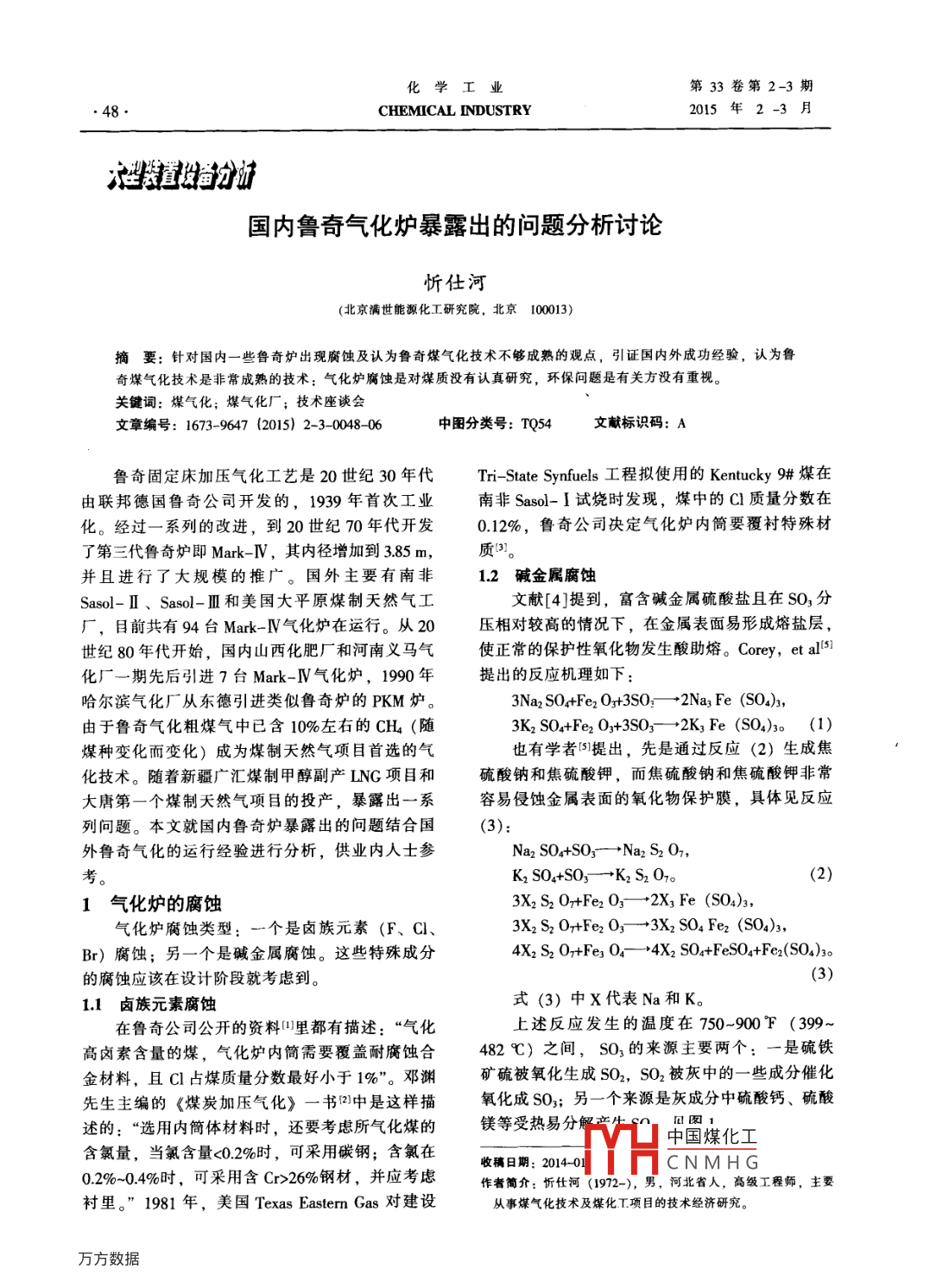 化學(xué)工業(yè)第33卷第2-3期●48●CHEMICAL INDUSTRY2015年2-3漣道越省分征國內(nèi)魯奇氣化爐暴露出的問題分析討論忻仕河(北京滿世能源化工研究院,北京1003)摘要:針對國內(nèi)一些魯奇爐出現(xiàn)腐蝕及認為魯奇煤氣化技術(shù)不夠成熟的觀點,引證國內(nèi)外成功經(jīng)驗,認為魯奇煤氣化技術(shù)是非常成熟的技術(shù):氣化爐腐蝕是對煤質(zhì)沒有認真研究,環(huán)保問題是有關(guān)方?jīng)]有重視。關(guān)鍵詞:煤氣化;煤氣化廠;技術(shù)座談會文章編號: 1673-9647 (2015) 2-3-0048-06中圖分類號: TQ54文獻標識碼: A魯奇固定床加壓氣化工藝是20世紀30年代Tri- State Synfuels工程擬使用的Kentucky 9#煤在由聯(lián)邦德國魯奇公司開發(fā)的,1939 年首次工業(yè)南非Sasol- I試燒時發(fā)現(xiàn),煤中的Cl質(zhì)量分數(shù)在.化。經(jīng)過一系列的改進,到20世紀70年代開發(fā)0.12%,魯奇公司決定氣化爐內(nèi)簡要覆襯特殊材了第三代魯奇爐即Mark -IV,其內(nèi)徑增加到3.85 m,質(zhì)3]。并且進行了大規(guī)模的推廣。國外主要有南非1.2堿金屬腐蝕Sasol-I、Sasol- m和美國大平原煤制天然氣工文獻[4]提到,富含堿金屬硫酸鹽且在SO,分廠,目前共有94臺Mark- IV氣化爐在運行。從20壓相對較高的情況下,在金屬表面易形成熔鹽層,世紀80年代開始,國內(nèi)山西化肥廠和河南義馬氣使正常的保護性氧化物發(fā)生酸助熔。Corey,etal5]化廠一期先后引進7臺Mark- IV氣化爐,1990 年提出的反應(yīng)機理如下:哈爾濱氣化廠從東德引進類似魯奇爐的PKM爐。3Na2 SO+Fer O+3S0-一2Na3 Fe (SO),由于魯奇氣化粗煤氣中已含10%左右的CH (隨3Kz SO4+Fer O,+3SO3-→+2K, Fe (SO)3o (1)煤種變化而變化)成為煤制天然氣項目首選的氣也有學(xué)者[S]提出,先是通過反應(yīng)(2) 生成焦化技術(shù)。隨著新疆廣匯煤制甲醇副產(chǎn)LNG項目和硫酸鈉和焦硫酸鉀,而焦硫酸鈉和焦硫酸鉀非常大唐第一個煤制天然氣項目的投產(chǎn),暴露出一系容易侵蝕金屬表面的氧化物保護膜,具體見反應(yīng)列問題。本文就國內(nèi)魯奇爐暴露出的問題結(jié)合國外魯奇氣化的運行經(jīng)驗進行分析,供業(yè)內(nèi)人士參Na2 SO+SO,- +Naz S2 O,K2 SO4+SO,-→Kz S2 0。(2)1氣化爐的腐 蝕3Xz S2 O+Fe2O;- +2X; Fe (SO4)3,氣化爐腐蝕類型:一個是鹵族元素(F、 CI、3X2 Sr O+Fer 03一→ 3X2 SO4 Fer (S04)3,Br)腐蝕;另一個是堿金屬腐蝕。這些特殊成分4X2 S2 O+Fes 0.- +4X2 SO4+FeSO4+Fer(SO4)3o的腐蝕應(yīng)該在設(shè)計階段就考慮到。(3)1.1 鹵族元素腐蝕式(3) 中x代表Na和K。在魯奇公司公開的資料里都有描述:“氣化上述反應(yīng)發(fā)生的溫度在750-900F (399~高鹵素含量的煤,氣化爐內(nèi)筒需要覆蓋耐腐蝕合482 C)之間,SO, 的來源主要兩個: -是硫鐵金材料,且Cl占煤質(zhì)量分數(shù)最好小于1%”。鄧淵礦硫被氧化生成SO,SO2被灰中的--些成分催化先生主編的《煤炭加壓氣化》一書2)中是這樣描氧化成SO;另一個來源是灰成分中硫酸鈣、硫酸述的:“選用內(nèi)簡體材料時,還要考慮所氣化煤的鎂等受熱易分中國煤化工含氯量,當氯含量<0.2%時,可采用碳鋼;含氯在收稿日期: 2014-01MHCNMHG0.2%~0.4%時,可采用含Cr>26%鋼材,并應(yīng)考慮作者簡介:忻仕河(1972-), 男,河北省人,高級工程師,主要襯里?!?981 年,美國Texas Eastem Gas對建設(shè)從事煤氣化技術(shù)及煤化T項目的技術(shù)經(jīng)濟研究。.第2-3期忻仕河:國內(nèi)魯奇氣化爐暴露出的問題分析討論.49 .下面內(nèi)容按圖2的物流號逐一- 分析。l 與FeS反應(yīng)①低溫甲醇洗排放的CO2廢氣-魯奇氣化 .配套的低溫甲醇洗排放的CO2氣體中硫含量取決S0,溢出于煤中硫的含量和形態(tài)分布,特別是煤中有機硫| NaC、KCI揮發(fā)| ALO,等揮發(fā)脫水ES含量較高時,這股氣體有難聞的臭味。根據(jù)美國.氧化熔融結(jié)渣SiO,等揮發(fā)大平原和Kosovo氣化廠使用高硫煤的經(jīng)驗,低溫260 531 0932 204甲醇洗排放的CO2廢氣是全廠氣味的來源之一-。溫度/C .這兩個廠用的煤有機硫含量都高,煤中的有機硫圖1煤中礦物 質(zhì)加熱過程中的變化(6)高,煤氣中會含有硫醇等有機硫,低級硫醇具有氣化爐腐蝕問題,通過在內(nèi)筒堆焊特殊材質(zhì)惡臭氣味,并且109級就能聞到,空氣中雖然未解決,美國大平原正常生產(chǎn)控制灰中Na20的質(zhì)量達到危害人體健康的濃度,但氣味讓人不舒服,分數(shù)在8%以下”。易引起環(huán)保投訴;另- -方面,該物流中含有約2%~2環(huán)保3%的C2* 烴,標準狀態(tài)體積氣體的熱值大約目前,國內(nèi)采用魯奇氣化的工廠主要環(huán)保問1.7 MJ/m',美國大平原設(shè)計該氣體送人鍋爐爐膛題是全廠氣味(使用有機硫含量高的煤)引起的投燒,使其中的有機硫轉(zhuǎn)化成SO2經(jīng)氨法脫硫處理,訴和污水處理的問題。魯奇氣化污染源見圖2。這樣既回收了C2烴能量,又解決了環(huán)保問題189]。02⑥煤鎖泄壓引射氣焦油中油]揮發(fā)放空氣,。⑨氣化儲罐 ⑦灰渣.變冷卻煤氣水_膨脹氣,分離廣 自酸性C0.排放氣低溫酚氨.廠化__深度處理熱再生塔不凝氣甲醉洗處理回用③②。氣硫回收「石腦油].揮發(fā)放空氣。儲罐圖2 魯奇氣化主要污染源分析②低溫甲醇洗的富酸性氣一-對于硫含 量較采用魯奇氣化運行比較好的硫回收裝置有國電赤高的原料煤,這股氣體一般經(jīng)兩級克勞斯硫回收+峰30萬V/a合成氨/52萬U/a尿素化肥項目和義尾氣焚燒+氨法脫硫,尾氣可以達標