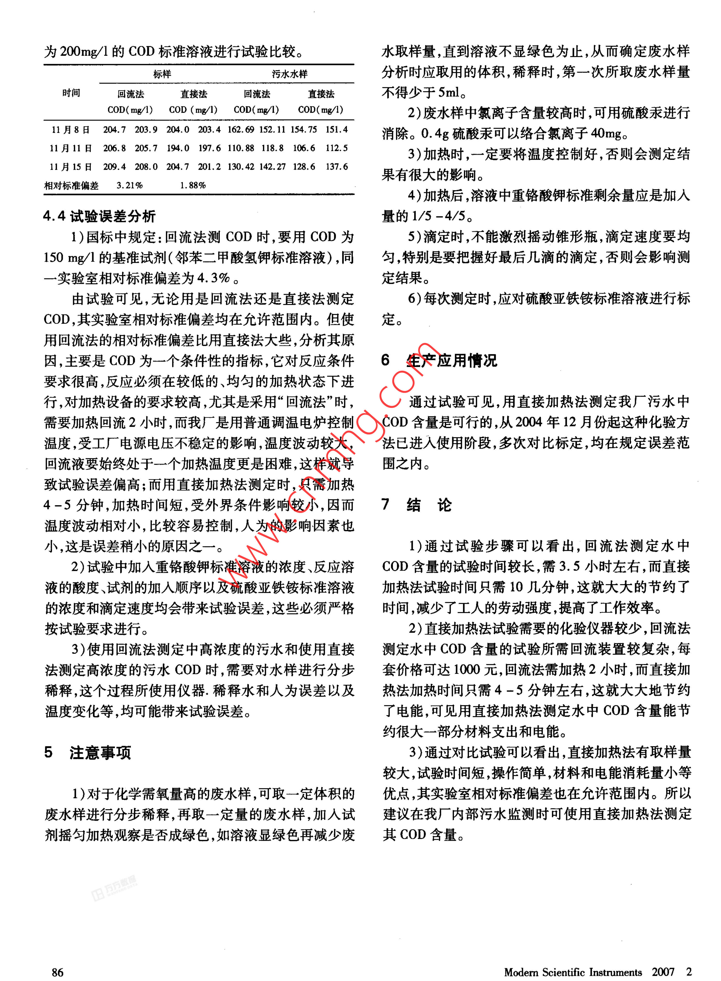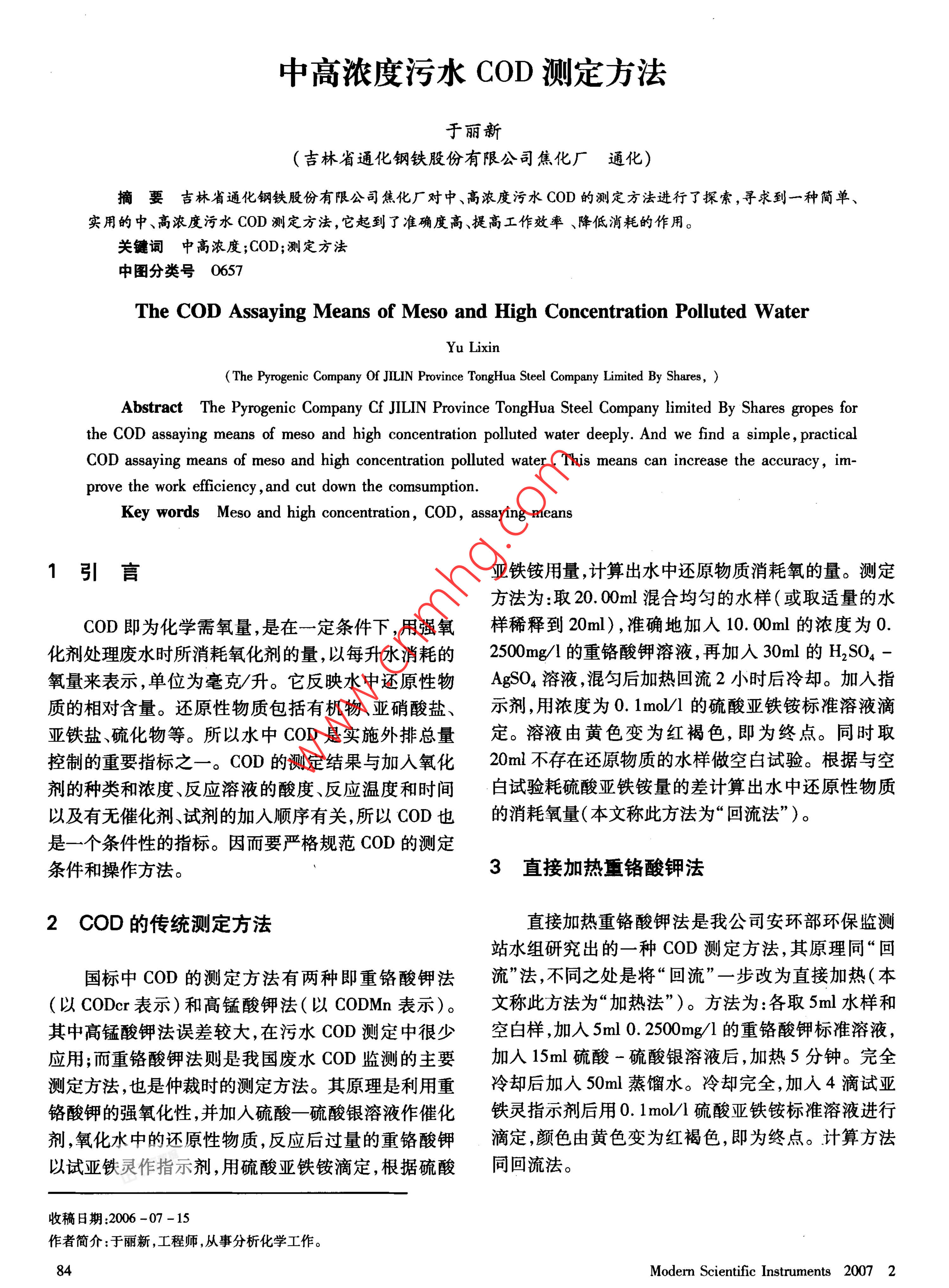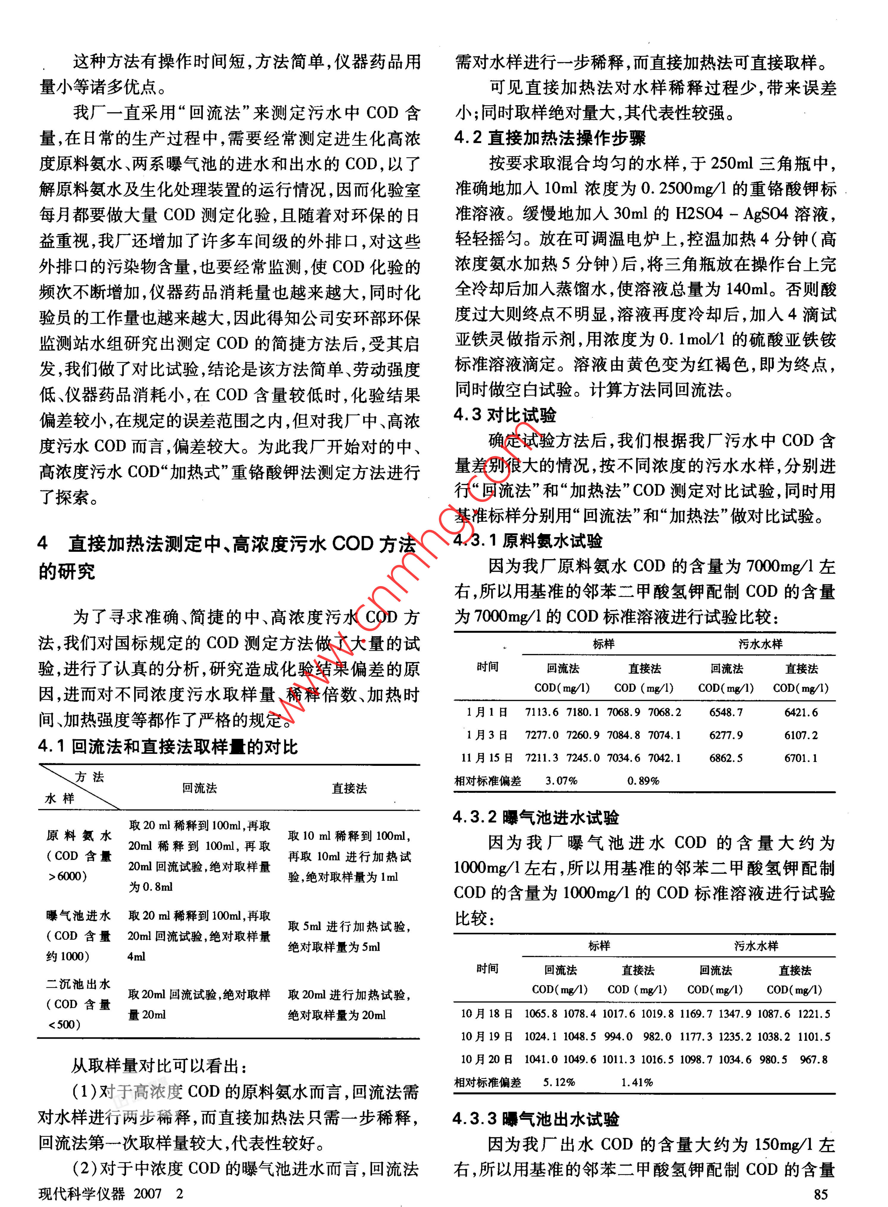中高濃度污水COD測定方法于麗新(吉林省通化鋼鐵股份有限公司焦化廠通化)摘要吉林省通化鋼鐵股份有限公司焦化廠對中、高濃度污水COD的測定方法進行了探索,尋求到一種簡單、實用的中、高濃度污水COD測定方法,它起到了準(zhǔn)確度高、提高工作效率、降低消耗的作用。關(guān)鍵詞中高濃度;COD;測定方法中圖分類號0657The COd Assaying Means of Meso and High Concentration Polluted WaterYu Lixin(The Pyrogenic Company Of JILIN Province Tong Hua Steel Company Limited By Shares,Abstract The Pyrogenic Company Cf JILIN Province Tong Hua Steel Company limited By Shares gropes forthe cod assaying means of meso and high concentration polluted water deeply. and we find a simple, practicalCOD assaying means of meso and high concentration polluted water. This means can increase the accuracy, im-prove the work efficiency, and cut down the comsumptionKey words Meso and high concentration, COD, assaying means1引言亞鐵銨用量計算出水中還原物質(zhì)消耗氧的量。測定方法為:取20.00m1混合均勻的水樣(或取適量的水COD即為化學(xué)需氧量,是在一定條件下,用強氧樣稀釋到20ml),準(zhǔn)確地加入10.00ml的濃度為0化劑處理廢水時所消耗氧化劑的量,以每升水消耗的200mg/1的重鉻酸鉀溶液,再加入30ml的H2SO4氧量來表示,單位為毫克/升。它反映水中還原性物AgSO4溶液,混勻后加熱回流2小時后冷卻。加入指質(zhì)的相對含量。還原性物質(zhì)包括有機物、亞硝酸鹽、示劑,用濃度為0.1mo/l的硫酸亞鐵銨標(biāo)準(zhǔn)溶液滴亞鐵鹽、硫化物等。所以水中COD是實施外排總量定。溶液由黃色變?yōu)榧t褐色,即為終點。同時取控制的重要指標(biāo)之一。COD的測定結(jié)果與加入氧化20m不存在還原物質(zhì)的水樣做空白試驗。根據(jù)與空劑的種類和濃度、反應(yīng)溶液的酸度、反應(yīng)溫度和時間白試驗耗硫酸亞鐵銨量的差計算出水中還原性物質(zhì)以及有無催化劑、試劑的加入順序有關(guān),所以COD也的消耗氧量(本文稱此方法為“回流法”)。是一個條件性的指標(biāo)。因而要嚴(yán)格規(guī)范COD的測定條件和操作方法。3直接加熱量鉻酸鉀法2cOD的傳統(tǒng)測定方法直接加熱重鉻酸鉀法是我公司安環(huán)部環(huán)保監(jiān)測站水組研究出的一種COD測定方法,其原理同“回國標(biāo)中COD的測定方法有兩種即重鉻酸鉀法流”法,不同之處是將“回流”一步改為直接加熱(本(以 CODcr表示)和高錳酸鉀法(以 CODMn表示)。文稱此方法為“加熱法”)。方法為:各取5ml水樣和其中高錳酸鉀法誤差較大,在污水COD測定中很少空白樣,加入5ml0.2500mg/1的重鉻酸鉀標(biāo)準(zhǔn)溶液,應(yīng)用;而重鉻酸鉀法則是我國廢水COD監(jiān)測的主要加人15ml硫酸-硫酸銀溶液后,加熱5分鐘。完全測定方法,也是仲裁時的測定方法。其原理是利用重冷卻后加入50ml蒸餾水。冷卻完全,加入4滴試亞鉻酸鉀的強氧化性,并加入硫酸一硫酸銀溶液作催化鐵靈指示劑后用0.1moM硫酸亞鐵銨標(biāo)準(zhǔn)溶液進行劑,氧化水中的還原性物質(zhì),反應(yīng)后過量的重鉻酸鉀滴定,顏色由黃色變?yōu)榧t褐色,即為終點。計算方法以試亞鐵靈作指示劑,用硫酸亞鐵銨滴定,根據(jù)硫酸同回流法。收稿日期:2006-07-15作者簡介:于麗新,工程師,從事分析化學(xué)工作。Modern scientific instruments 2007 2這種方法有操作時間短,方法簡單,儀器藥品用需對水樣進行一步稀釋,而直接加熱法可直接取樣。量小等諸多優(yōu)點可見直接加熱法對水樣稀釋過程少,帶來誤差我廠一直采用“回流法”來測定污水中COD含小;同時取樣絕對量大,其代表性較強。量,在日常的生產(chǎn)過程中,需要經(jīng)常測定進生化高濃4.2直接加熱法操作步驟度原料氨水、兩系曝氣池的進水和出水的COD,以了按要求取混合均勻的水樣,于250ml三角瓶中解原料氨水及生化處理裝置的運行情況,因而化驗室準(zhǔn)確地加入10ml濃度為0.200mg/l的重鉻酸鉀標(biāo)每月都要做大量COD測定化驗,且隨著對環(huán)保的日準(zhǔn)溶液。緩慢地加入30ml的H2SO4-Ag04溶液,益重視,我廠還增加了許多車間級的外排口,對這些輕輕搖勻。放在可調(diào)溫電爐上,控溫加熱4分鐘(高外排口的污染物含量,也要經(jīng)常監(jiān)測,使COD化驗的濃度氨水加熱5分鐘)后,將三角瓶放在操作臺上完頻次不斷增加,儀器藥品消耗量也越來越大,同時化全冷卻后加入蒸餾水,使溶液總量為140ml否則酸驗員的工作量也越來越大,因此得知公司安環(huán)部環(huán)保度過大則終點不明顯溶液再度冷卻后,加入4滴試監(jiān)測站水組研究出測定COD的簡捷方法后,受其啟亞鐵靈做指示劑,用濃度為0.lmo/1的硫酸亞鐵銨發(fā),我們做了對比試驗,結(jié)論是該方法簡單、勞動強度標(biāo)準(zhǔn)溶液滴定。溶液由黃色變?yōu)榧t褐色,即為終點低、儀器藥品消耗小,在COD含量較低時,化驗結(jié)果同時做空白試驗。計算方法同回流法。偏差較小,在規(guī)定的誤差范圍之內(nèi)但對我廠中、高濃43對比試驗度污水COD而言,偏差較大。為此我廠開始對的中確定試驗方法后,我們根據(jù)我廠污水中COD含高濃度污水COD“加熱式”重鉻酸鉀法測定方法進行量差別很大的情況,按不同濃度的污水水樣,分別進了探索。行“回流法”和“加熱法”COD測定對比試驗,同時用基準(zhǔn)標(biāo)樣分別用“回流法”和“加熱法”做對比試驗。4直接加熱法測定中高濃度污水cOD方法431原料