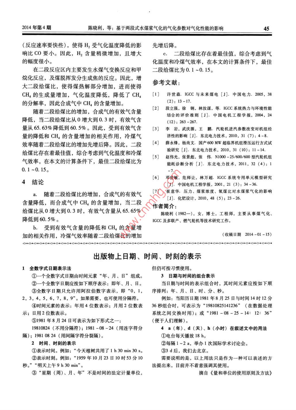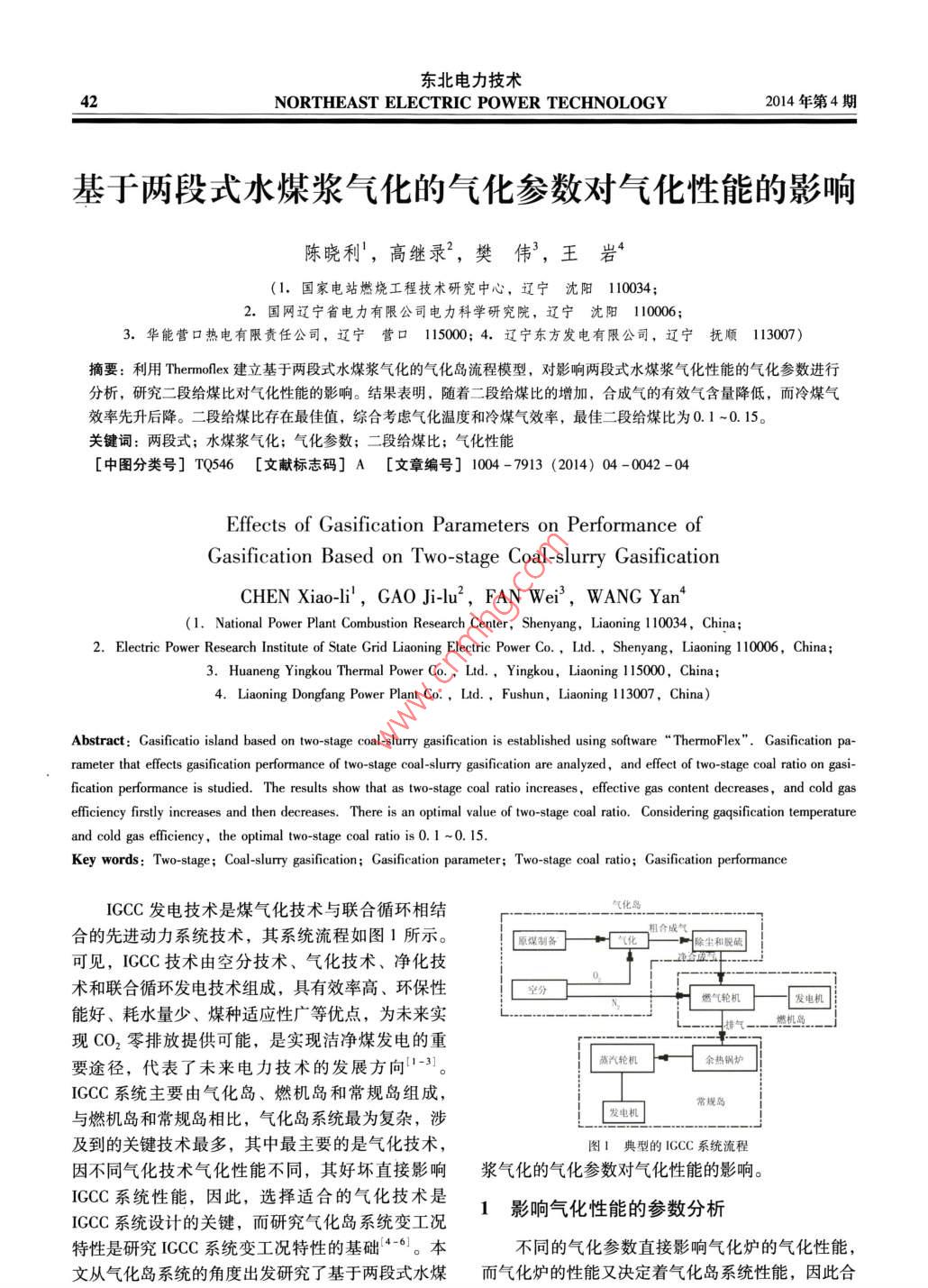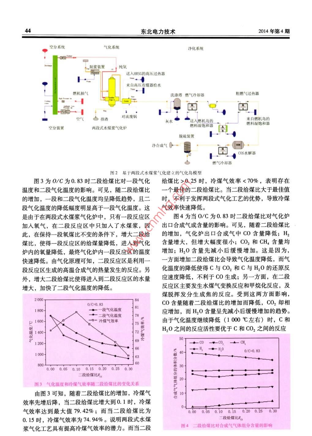 東北電力技術(shù)42NORTHEAST ELECTRIC POWER TECHNOLOGY2014年第4期基于兩段式水煤漿氣化的氣化參數(shù)對(duì)氣化性能的影響陳曉利,高繼錄”,樊偉’,王巖*(1.國(guó)家電站燃燒工程技術(shù)研究中心,遼寧沈陽(yáng)110034;2.國(guó)網(wǎng)遼寧省電力有限公司電力科學(xué)研究院,遼寧沈陽(yáng)10006;3.華能營(yíng)口熱電有限責(zé)任公司,遼寧營(yíng)口115000; 4.遼寧東方發(fā)電有限公司,遼寧撫順113007)摘要:利用Thermoflex建立基于兩段式水煤漿氣化的氣化島流程模型,對(duì)影響兩段式水煤漿氣化性能的氣化參數(shù)進(jìn)行分析,研究二段給煤比對(duì)氣化性能的影響。結(jié)果表明,隨著二段給煤比的增加,合成氣的有效氣含量降低,而冷煤氣效率先升后降。二段給煤比存在最佳值,綜合考慮氣化溫度和冷煤氣效率,最佳二二段給煤比為0. 1 ~0.15。關(guān)鍵詞:兩段式;水煤漿氣化;氣化參數(shù);二段給煤比;氣化性能[中圖分類號(hào)] TQ546 [文獻(xiàn)標(biāo)志碼] A [文章編號(hào)] 1004-7913 (2014) 04 -0042 -04Effects of Gasification Parameters on Performance ofGasification Based on Two-stage Coal-slurry GasificationCHEN Xiao-lil, GAO Ji-lu2, FAN Wei', WANG Yan4(1. National Power Plant Combustion Research Center, Shenyang, Liaoning 110034,China;2. Electric Power Research Institute of State Grid Liaoning Electric Power Co.,Ltd. ,Shenyang, Liaoning 10006,China;3. Huaneng Yingkou Thermal Power Co.,Ltd. ,Yingkou, Liaoning 115000, China;4. Liaoning Dongfang Power Plant Co.,Ltd. ,F(xiàn)ushun, Liaoning 113007,China)Abstract: Gasificatio island based on two-stage coal-slurry gasification is established using software “ThrmoFlex". Gasification pa-rameter that effects gasification performance of two-stage coal-slurry gasification are analyzed, and effect of two-stage coal ratio on gasi-fication performance is studied. The results show that as two-stage coal ratio inereases, efective gas content decreases, and cold gasefficiency firstly inereases and then decreases. There is an optimal value of two-stage coal ratio. Considering gaqsification temperatureand cold gas eficiencey, the oplimal two-stage coal raio is0.1 ~0.15.Key words: Two-stage; Coal-slury gasification; Gasifcation parameter; Two-stage coal ratio; Gasification performanceIGCC發(fā)電技術(shù)是煤氣化技術(shù)與聯(lián)合循環(huán)相結(jié)合的先進(jìn)動(dòng)力系統(tǒng)技術(shù),其系統(tǒng)流程如圖1所示。除塵和脫破可見(jiàn),ICCC 技術(shù)由空分技術(shù)、氣化技術(shù)、凈化技術(shù)和聯(lián)合循環(huán)發(fā)電技術(shù)組成,具有效率高、環(huán)保性空分燃?xì)廨啓C(jī)|發(fā)電機(jī)能好、耗水量少、煤種適應(yīng)性廣等優(yōu)點(diǎn),為未來(lái)實(shí)排氣-__樓機(jī)___現(xiàn)CO2零排放提供可能,是實(shí)現(xiàn)潔凈煤發(fā)電的重蒸汽輪機(jī)t一余熱鋼爐要途徑,代表了未來(lái)電力技術(shù)的發(fā)展方向[1-3]。IGCC系統(tǒng)主要由氣化島、燃機(jī)島和常規(guī)島組成,常規(guī)島| 發(fā)電機(jī)與燃機(jī)島和常規(guī)島相比,氣化島系統(tǒng)最為復(fù)雜,涉及到的關(guān)鍵技術(shù)最多,其中最主要的是氣化技術(shù),圖1典型的ICCC系統(tǒng)流程因不同氣化技術(shù)氣化性能不同,其好壞直接影響漿氣化的氣化參數(shù)對(duì)氣化性能的影響。IGCC系統(tǒng)性能,因此,選擇適合的氣化技術(shù)是1影響氣化性能的參 數(shù)分析IGCC系統(tǒng)設(shè)計(jì)的關(guān)鍵,而研究氣化島系統(tǒng)變工況特性是研究IGCC系統(tǒng)變工況特性的基礎(chǔ)|4-6]。本不同的氣化參數(shù)直接影響氣化爐的氣化性能,文從氣化島系統(tǒng)的角度出發(fā)研究了基于兩段式水煤而氣化爐的性能又決定著氣化島系統(tǒng)性能,因此合2014年第4期陳曉利,等:基于兩段式水煤漿氣化的氣化參數(shù)對(duì)氣化性能的影響43理選擇氣化參數(shù)有利于提高氣化爐的氣化性能。不M。為水煤漿的總供入量,kg/h。同的氣化技術(shù)影響參數(shù)不同,在煤種選定的條件2基于兩段式水煤漿氣化的氣化島模型下,影響水煤漿氣化性能的參數(shù)有氣化溫度、氣化壓力、水煤漿濃度、氧煤比和二段給煤比等,但由兩段式水煤漿氣化技術(shù)在一段式水煤漿 氣化技術(shù)于氣化溫度受水煤漿濃度、氧煤比等參數(shù)的影響,的基礎(chǔ)上發(fā)展而成。兩段式水煤漿氣化技術(shù)的氣化原同時(shí)還受煤灰熔點(diǎn)的制約,而氣化壓力主要取決于理:將一定量的水煤漿和氧氣通過(guò)噴嘴送去-段反應(yīng)產(chǎn)品合成氣的用途,因此影響水煤漿氣化性能的獨(dú)區(qū);在一段反應(yīng)區(qū)內(nèi)水煤漿和氧氣發(fā)生氣化反應(yīng),生立參數(shù)有氧煤比和水煤漿濃度。對(duì)于兩段式氣化技成的高溫合成氣進(jìn)入一段反應(yīng)區(qū)上方的二段反應(yīng)區(qū);術(shù),獨(dú)立參數(shù)還包括二段給煤比。由于水煤漿濃度在二段反應(yīng)區(qū)內(nèi)通過(guò)噴嘴將剩下的水煤漿送人,利用和氧煤比對(duì)一段式 和兩段式水煤漿氣化的氣化性能- -段反應(yīng)區(qū)生成的高溫合成氣的熱量使煤中揮發(fā)分析的影響基本相同,且已有不少關(guān)于這2個(gè)參數(shù)的研出并發(fā)生一部分氣化反應(yīng),提高合成氣的低位發(fā)熱究,因此,本文重點(diǎn)研究了二段給煤比對(duì)兩段式水量,進(jìn)而提高冷煤氣效率,同時(shí)達(dá)到降低合成氣出口煤漿氣化性能的影響。溫度的目