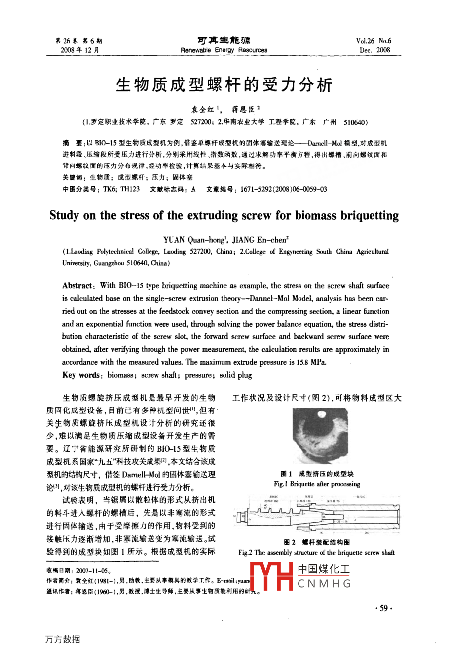 第26卷第6期可真生能驃Vol 26 No 62008年12月Renewable Energy ResourcesDec.2008生物質(zhì)成型螺桿的受力分析袁全紅1,蔣恩臣2(1羅定職業(yè)技術(shù)學(xué)院,廣東羅定527200;2華南農(nóng)業(yè)大學(xué)工程學(xué)院,廣東廣州510640)摘要:以B0-15型生物質(zhì)成型機(jī)為例,借鑒單螺桿成型機(jī)的固體塞輸送理論—Dame-Ml模型,對(duì)成型機(jī)進(jìn)料段、壓縮段所受壓力進(jìn)行分析分別采用線性指數(shù)函數(shù),通過求解功率平衡方程,得出螺槽前向螺紋面和背向螺紋面的壓力分布規(guī)律,經(jīng)功率檢驗(yàn),計(jì)算結(jié)果基本與實(shí)際相符關(guān)鍵詞:生物質(zhì);成型螺桿;壓力;固體塞中圖分類號(hào):TK6;TH123文賦標(biāo)志碼:A文章編號(hào):1671-5292(2008)06005903Study on the stress of the extruding screw for biomass briquettingYUAN Quan-hong, JIANG En-chen2'Polytechnical College, Luoding 527200, China; 2. College of Engyneering South China AgriculturalUniversity, Guangzhou 510640, China)Abstract: With BIO-15 type briquetting machine as example, the stress on the screw shaft surfaceis calculated base on the single-screw extrusion theory--Dannel-Mol Model, analysis has been car-ried out on the stresses at the feedstock convey section and the compressing section, a linear functionand an exponential function were used, through solving the power balance equation, the stress distri-bution characteristic of the screw slot, the forward screw surface and backward screw surface werebtained, after verifying through the power measurement, the calculation results are approximately inaccordance with the measured values. The maximum extrude pressure is 15.8 MPa.Key words: biomass; screw shaft; pressure; solid plug生物質(zhì)螺旋擠壓成型機(jī)是最早開發(fā)的生物工作狀況及設(shè)計(jì)尺寸(圖2),可將物料成型區(qū)大質(zhì)固化成型設(shè)備,目前已有多種機(jī)型問世,但有關(guān)生物質(zhì)螺旋擠壓成型機(jī)設(shè)計(jì)分析的研究還很少,難以滿足生物質(zhì)壓縮成型設(shè)備開發(fā)生產(chǎn)的需要。遼寧省能源研究所研制的BI015型生物質(zhì)成型機(jī)系國(guó)家“九五”科技攻關(guān)成果2,本文結(jié)合該成型機(jī)的結(jié)構(gòu)尺寸,借簽 Darnmelk-Mol的固體塞輸送理圖1成型擠壓的成型塊論習(xí),對(duì)該生物質(zhì)成型機(jī)的螺桿進(jìn)行受力分析Fig. I Briquette after processing試驗(yàn)表明,當(dāng)鋸屑以散粒體的形式從擠出機(jī)的料斗進(jìn)入螺桿的螺槽后,先是以非塞流的形式進(jìn)行固體輸送,由于受摩擦力的作用,物料受到的接觸壓力逐漸增加,非塞流輸送變?yōu)槿鬏斔?。試圖2鄭桿裝配結(jié)構(gòu)圖驗(yàn)得到的成型塊如圖1所示。根據(jù)成型機(jī)的實(shí)際Fig2 The assembly structure of the briquette screw sha收稿日期:2007-11-05作者簡(jiǎn)介:寰全紅(1981-)男助教主要從事模具的教學(xué)工作。E-mail:yuan通訊作者:蔣恩臣(1960-),男教授博士生導(dǎo)師主要從事生物質(zhì)能利用的研幾。TH中國(guó)煤化工CNMHG可耳生能2008,26(6)致分為3個(gè)部分:進(jìn)料區(qū)壓縮區(qū)和保壓區(qū)。成型kW,半空載(加料)功率為3kW,正常工作功率為螺桿的結(jié)構(gòu)則相應(yīng)地分為3段:進(jìn)料段(160mm)、8-12kW,n=240r/min。壓縮段(120mm)保壓段(70mm)。半空載功率與空載功率之差,再扣除部分壓成型螺桿結(jié)構(gòu)參數(shù)的計(jì)算縮段的功耗就是加料段功耗,取為15kW;正常已知條件:螺桿外徑D=63mm,螺棱法向?qū)捁ぷ鞴β逝c半空載功率之差,扣除軸尖導(dǎo)錐段部度e=8mm,螺槽深度H1=13mm,螺距S=40mm,分功耗就是壓縮段功耗,取為7kW。成型棒密度p=1.2gm3,成型機(jī)生產(chǎn)率Q=130kgh當(dāng)固體塞在螺槽中運(yùn)動(dòng)時(shí),作用在固體塞微成型機(jī)轉(zhuǎn)速n=240mmin,可計(jì)算出如下參數(shù)。元上的力有8個(gè)(圖4)。螺桿根徑:D=D-2H1=63-26=37mm平均直徑:D=(D+D)2=50mm;外徑螺旋升角:d=an[S/(xD)}=-1140°;內(nèi)徑螺旋升角:φ= atan(S/(mxD,)=1900°;平均螺旋升角:d= atan(S(丌xD)}=1330°;外徑螺槽法向?qū)挾?W÷ Sxcos-e=302lmm;內(nèi)徑螺槽法向?qū)挾?W= Sxcosoe=28.83mm;平均螺槽法向?qū)挾?W=S× cose=2977mm。圖4固體塞微元受力分析2固體塞的運(yùn)動(dòng)分析Fig 4 The mechanical analysis on solid plug在固體塞上取一微元進(jìn)行運(yùn)動(dòng)分析(圖3)F1-微元和機(jī)筒內(nèi)壁的摩擦力;F2-微元前端的正壓力;F微可得固體塞沿螺桿軸線方向的移動(dòng)速度v(即V元和背向螺槽的摩擦力;F-微元和前向螺槽的摩擦力;F微元和螺槽底面的摩擦力;F6-微元后端的正壓力;F-徽元受背向螺的軸向分量):槽的正壓力;F微元受前向螺槽的正壓力P-固體塞與機(jī)筒內(nèi)壁v=v tan tand=mD, tan Btan g.的正壓力;dZ-機(jī)筒內(nèi)表面沿蝶槽方向的長(zhǎng)度增量tan 0+tan d固體塞輸送的體積流率Q(1)加料段受力分析Q=πhnDH(DH)anan(W由于在進(jìn)料段沒有形成料塞,因此可假設(shè)在此tan 0+lan d wte段螺槽壓力為線性增大,設(shè)此段Z處的螺槽壓力為P Zpz=(Z-16)xp/20(p為Z=136mm處壓力);F=×1+ XW Sin(θ+φ)/ H,lxHiXp'ixdz;F=XH,xp ixdzFsHF1=[1+6× W,xSin(6+φ)/H]×H1xpz×dZ圖3固體塞運(yùn)動(dòng)分析1.3F3Fig 3 The motion analysis on solid plugW-平均螺槽法向?qū)挾?v-回轉(zhuǎn)速度;V-軸向速度;-絕對(duì)速根據(jù)實(shí)測(cè)值,取鋸屑與螺桿的摩擦系數(shù)fs=度;Vaz-沿螺槽方向的速度;0-牽引角075,機(jī)筒內(nèi)壁與鋸屑的摩擦系數(shù)f=0.75,Sin(6+3功率平衡方程φ)=028,設(sh