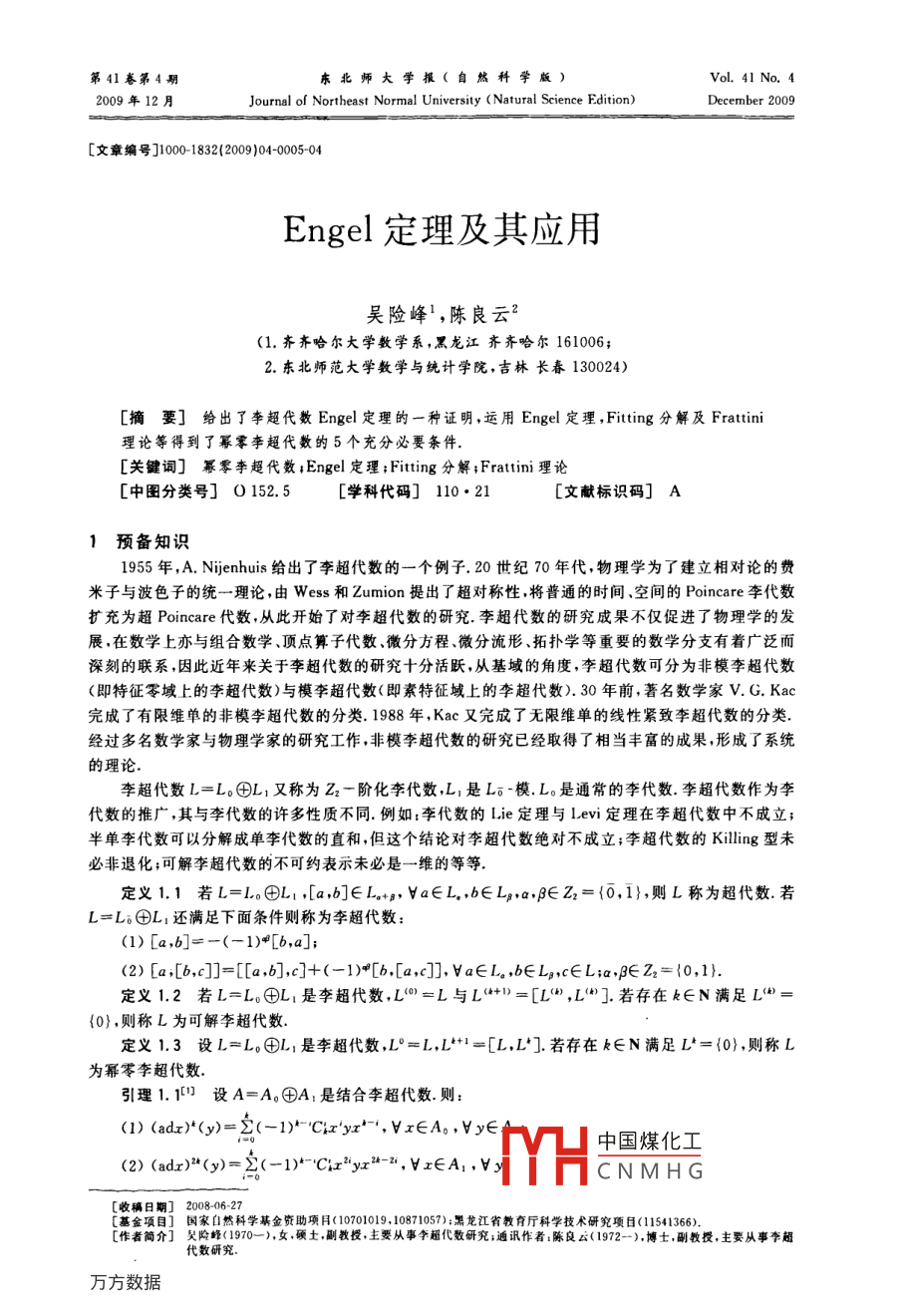 第41卷第4期東北師大學(xué)報(bào)(自然科學(xué)版)VoL. 41 No. 42009年12月Journal of Northeast Normal University(Natural Science Edition)December 2009[文章編號(hào)]10001832(2009)04-000504Engel定理及其應(yīng)用吳險(xiǎn)峰',陳良云2(1.齊齊哈爾大學(xué)數(shù)學(xué)系,黑龍江齊齊哈爾1612.東北師范大學(xué)數(shù)學(xué)與統(tǒng)計(jì)學(xué)院,吉林長(zhǎng)春130024)摘要]給出了李超代數(shù) Engel定理的一種證明,運(yùn)用Enge定理, Fitting分解及 Frattini理論等得到了冪零李超代數(shù)的5個(gè)充分必要條件[關(guān)鍵詞]冪零李超代數(shù); Engel定理; Fitting分解; Frattini理論[中圖分類號(hào)]O152.5[學(xué)科代碼]110·21[文獻(xiàn)標(biāo)識(shí)碼]A1預(yù)備知識(shí)955年,A. Nijenhuis給出了李超代數(shù)的一個(gè)例子.20世紀(jì)70年代,物理學(xué)為了建立相對(duì)論的費(fèi)米子與波色子的統(tǒng)一理論,由Wess和 Union提出了超對(duì)稱性,將普通的時(shí)間空間的 Poincare李代數(shù)擴(kuò)充為超 Poincare代數(shù),從此開(kāi)始了對(duì)李超代數(shù)的研究.李超代數(shù)的研究成果不僅促進(jìn)了物理學(xué)的發(fā)展,在數(shù)學(xué)上亦與組合數(shù)學(xué)、頂點(diǎn)算子代數(shù)、微分方程、微分流形、拓?fù)鋵W(xué)等重要的數(shù)學(xué)分支有著廣泛而深刻的聯(lián)系,因此近年來(lái)關(guān)于李超代數(shù)的研究十分活躍,從基域的角度,李超代數(shù)可分為非模李超代數(shù)即特征零域上的李超代數(shù))與模李超代數(shù)(即素特征域上的李超代數(shù)).30年前,著名數(shù)學(xué)家V.G.Kac完成了有限維單的非模李超代數(shù)的分類.1988年,Kac又完成了無(wú)限維單的線性緊致李超代數(shù)的分類經(jīng)過(guò)多名數(shù)學(xué)家與物理學(xué)家的研究工作,非模李超代數(shù)的研究已經(jīng)取得了相當(dāng)豐富的成果,形成了系統(tǒng)的理論李超代數(shù)L=L。⊕L1又稱為Z2一階化李代數(shù),L是L。-模.L。是通常的李代數(shù).李超代數(shù)作為李代數(shù)的推廣,其與李代數(shù)的許多性質(zhì)不同.例如:李代數(shù)的Le定理與Lev定理在李超代數(shù)中不成立;半單李代數(shù)可以分解成單李代數(shù)的直和,但這個(gè)結(jié)論對(duì)李超代數(shù)絕對(duì)不成立;李超代數(shù)的 Killing型未必非退化;可解李超代數(shù)的不可約表示未必是一維的等等定義1.1若L=L。L1,[a,b]∈L+,va∈L,b∈La,B∈Z2={0,1},則L稱為超代數(shù)若L=L⊕L1還滿足下面條件則稱為李超代數(shù):(1)[a,b1=-(-1)甲[b,a];(2)[a[b,c]=[a,b],c]+(-1)[b,a,c],va∈L,b∈L,c∈L;a,B∈Z2={0,1}定義1.2若L=LL1是李超代數(shù),L)=L與L=[L,L].若存在k∈N滿足L=0},則稱L為可解李超代數(shù)定義1.3設(shè)L=L。團(tuán)L1是李超代數(shù),L=L,L+1=[L,L].若存在k∈N滿足L={0},則稱L為冪零李超代數(shù)引理1.1設(shè)A=AA1是結(jié)合李超代數(shù)則:(1)(adx)*(y)=∑(-1)*Cxyx,Vx∈A。,Vy∈中國(guó)煤化工(2)(ad2)-(y)=20(-1)Cir"yr", VrEA,, vyCNMHG收稿日期]200806-27基金項(xiàng)目]國(guó)家自然科學(xué)基金資助項(xiàng)目(10701019,10871057);黑龍江省教育廳科學(xué)技術(shù)研究項(xiàng)目(11541366)[作者簡(jiǎn)介]吳險(xiǎn)峰(1970-),女,碩土,副教授,主要從事李超代數(shù)研究;通訊作者陳良云(1972-),博土副教授,主要從事李超代數(shù)研究東北師大學(xué)報(bào)(自然科學(xué)版)第41卷(3)(adx)2(y)=∑(-1)C"2xyx2--,x∈A,Hy∈A這里,=(1+i)(1+B)+(k-1)+i(i-1)/2,[i/2]是i/2的整數(shù)部分本文假設(shè)L是任意特征域F上的有限維李超代數(shù),它的理想是階化的.設(shè)P(v)是線性李超代數(shù)有關(guān)李超代數(shù)的知識(shí)可以參考文獻(xiàn)[2-18]Engel定理在李代數(shù)、 Novikov代數(shù)是成立的,但對(duì)李三系來(lái)說(shuō)現(xiàn)在人們已證明對(duì)特征為零的代數(shù)閉域是成立的,對(duì)一般的李三系 Engel定理是否成立還未證明本文給出了李超代數(shù) Engel定理的一種證明,運(yùn)用 Engel定理、 Fitting分解及 frattini理論等得到了冪零李超代數(shù)的5個(gè)充分必要條件2主要結(jié)果引理2.1設(shè)V是域F上的有限維Z2階化向量空間且X是作用在V上的冪零Z2線性變換.若X=0且adX是Pl(v)上的線性變換:Y→adX(Y)=[X,Y],Y∈Pl(v)則adX是冪零的證明由引理1.1和X=0知:(adX)2(Y)=0,vY∈Pl(V).因此(adX)=0,即adX冪零定理2.1設(shè)V≠{0}是域F上的有限維Z2階化向量空間且L是Pl(V)的階化子代數(shù)若L的每個(gè)元素是冪零的,則V中存在一個(gè)非零元素x滿足X(x)=0,YX∈L.證明設(shè)L的維數(shù)為r,對(duì)L的維數(shù)用數(shù)學(xué)歸納法若dimL=0,則顯然.現(xiàn)在假設(shè)定理對(duì)維數(shù)小于r的所有李超代數(shù)都成立,我們將證明定理對(duì)維數(shù)等于r的所有李超代數(shù)也成立首先,我們將證明L包含有一個(gè)維數(shù)為r-1的理想H.設(shè)H是L的一個(gè)維數(shù)為m(m