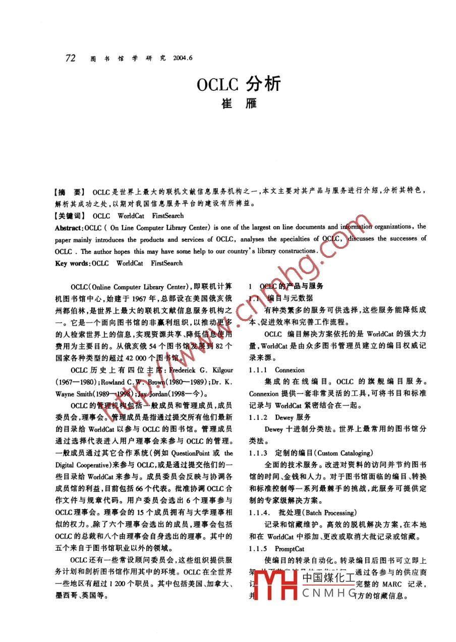 72團書館學(xué)研究2004.6OCLC分析崔雁I摘要] OCLC是世界上最大的聯(lián)機文獻(xiàn)信息服務(wù)機構(gòu)之一,本文主要對其產(chǎn)品與服務(wù)進行介紹,分析其特色,解析其成功之處,以期對我國信息服務(wù)平臺的建設(shè)有所裨益。[關(guān)鍵詞] OCLC WordCat FirstSearchAbstract:OCLC ( On Line Computer Library Center) is one of the largest on line documents and informnation organizaions, thepaper mainly introduces the products and serices of OCLC, analyses the specialties of OCLC, discusses the suceses ofOCLC . The author hopes this may have some help to our country' s library constructions .Key words:OCLC WordCat FirstSearch0CLC( Online Computer Lbrary Center) ,即聯(lián)機計算OCLC的產(chǎn)品與服務(wù)機圖書館中心,始建于1967年,總部設(shè)在美國俄亥俄.1 編目與元數(shù)據(jù)州都伯林,是世界上最大的聯(lián)機文獻(xiàn)信息服務(wù)機構(gòu)之有種類繁多的服務(wù)可供選擇,這些服務(wù)能降低成一。它是一個面向圖書館的非羸利組織,以推動更多本促進效率和完善工作流程。的人檢索世界上的信息,實現(xiàn)資源共享、降低信息使用OCLC編目解決方案依托的是WorldCat 的強大力費用為主要目的。從俄亥俄54個圖書館發(fā)展到82個量,WorldCat是由眾多圖書管理員建立的編目權(quán)威記國家各種類型的超過42 000個圖書館。.錄來源。0CLC歷史上有四位主席: Frederick G. Kilgour1.1.1 Connexion(1967-1980) ;Rowland C. W. Browm( 1980- 1989);Dr. K.集成的在線編目。OCLC 的旗艦編目服務(wù)。Wayne Smith( 1989- -1998) ;Jay Jordan(1998- - 今)。Connexion 提供-套非常靈活的工具,可將書目和標(biāo)準(zhǔn)OCLC的管理機構(gòu)包括一般成員和管理成員,成員記錄與WorldCat緊密結(jié)合在-起。委員會,理事會。管理成員是指通過提交所有他們最新1.1.2 Dewey 服務(wù)的目錄給WorldCat 以參與OCLC的圖書館。管理成員Dewey+進制分類法。世界上最常用的圖書館分通過選擇代表進入用戶理事會來參與OCLC的管理。類法。-.般成員通過其它合作系統(tǒng)(例如QuestionPoint或the1.1.3 定制的編目(Custom Cataloging)Digital Coperative)來參 與0CLC,或是通過提交他們的一全面的技術(shù)服務(wù)。改進對資料的訪問并節(jié)約圖書些目錄給WordCat來參與。成員委員會反映與協(xié)調(diào)各館的時間、金錢和人力。對于圖書館面臨的編目、轉(zhuǎn)換成員館的利益,目前包括66個代表。批準(zhǔn)協(xié)調(diào)OCLC合和標(biāo)準(zhǔn)控制等一系列最棘手的挑戰(zhàn),此服務(wù)可提供定作文件與規(guī)章代碼。用戶委員會選出6個理事參與制的專家級解決方案。OCLC理事會。理事會的15個成員擁有與大學(xué)理事相1.1.4.批處 理( Batch Processing)似的權(quán)力。除了六個理事會選出的成員,理事會包括記錄和館藏維護。高效的脫機解決方案,在本地OCLC的總裁和八個由理事會自身選出的理事。其中的和在WorldCat中添加、更改或取消大批記錄或館藏。五個來自于圖書館職業(yè)以外的領(lǐng)域。1.1.5 PromptCatOCLC還有一些常設(shè)顧問委員會,這些組織提供服使編目的轉(zhuǎn)錄自動化。轉(zhuǎn)錄編目后圖書可立即上務(wù)計劃和剖析圖書館作用其中的環(huán)境。OCLC在全世界中國煤化工通過各參與的供應(yīng)離-些地區(qū)有超過1 200個職員。其中包括美國加拿大、完整的MARC 記錄,墨西哥、英國等。YHCNMHG方的館藏信息。RESEARCHES IN LUBRARY SCIENCE 731.1.6人藏列表(Accession List)指出館藏中的具體強項和弱項。用于為最近編目的圖書生成可在Web上使用的1.2.3. OCLC 為大學(xué)和研究圖書館選擇題名列表,以便向用戶或在管理報告中宣傳。1.3 電子內(nèi)容.1.1.7書 目記錄通知( BIlbliographic Record Noification)這些基于web的數(shù)字資源不會占據(jù)書架空間,但每天自動為圖書館的館藏項目提供更新記錄。卻為用戶提供了大量的全文內(nèi)容??梢栽谌蜃畲蟮?.1.8.CatExpress電子書籍標(biāo)題館藏庫和一整套參考數(shù)據(jù)庫中選擇,用- -種基于Web的工具,對受歡迎的資料進行簡.戶通過這些數(shù)據(jù)庫可以找到成千上萬的摘要、期刊文易的轉(zhuǎn)錄編目。章等等。編目服務(wù)工具:1.3.1 netLibrary(1) WorldCat 收藏集( WordCat Collection Sets ):電子書籍(eBook) ,涉及幾百個主題領(lǐng)域的全文數(shù)MARC記錄的館藏。預(yù)先為通過供應(yīng)商購買的成套內(nèi)字書籍、期刊、報紙和其他出版物??伤阉鞯娜碾娮尤菁M行了記錄編目,可立即裝人圖書館方的本地系圖書大約有幾十種。充中。1.3.2聯(lián)機電子館藏(Electronic Cllectins Online)(2)政府文檔(GorDoc) :供各聯(lián)邦呈交歸檔儲藏機電子期刊。在Web上輕松訪問數(shù)以千計由多家構(gòu)使用,此服務(wù)可向圖書館的館藏提供政府文檔的最出版商出版的學(xué)術(shù)和專業(yè)期刊的全文。新記錄。1.4咨詢(3) CJK編目(CJK Catalonging ):使用本國字符以.這是一些參考服務(wù),它們利用許多重要的數(shù)據(jù)庫中文、日文和韓文進行編目的軟件。最適用于支持亞并更有效地利用圖書館所擁有的資源。這些在線服務(wù)洲研究或亞洲社團的圖書館。能幫助用戶準(zhǔn)確、快速和方便地查找資源(4)阿拉伯語編目(Arabic Cataloging ):用于阿拉伯1.4.1 FirstSearch語資料的編目軟件。此Windows應(yīng)用程序可以讓圖書在線參考。FistSearch 功能強大并且可定制程度館以基本和擴展的阿拉伯字符集進行編目??梢栽跇O高,
