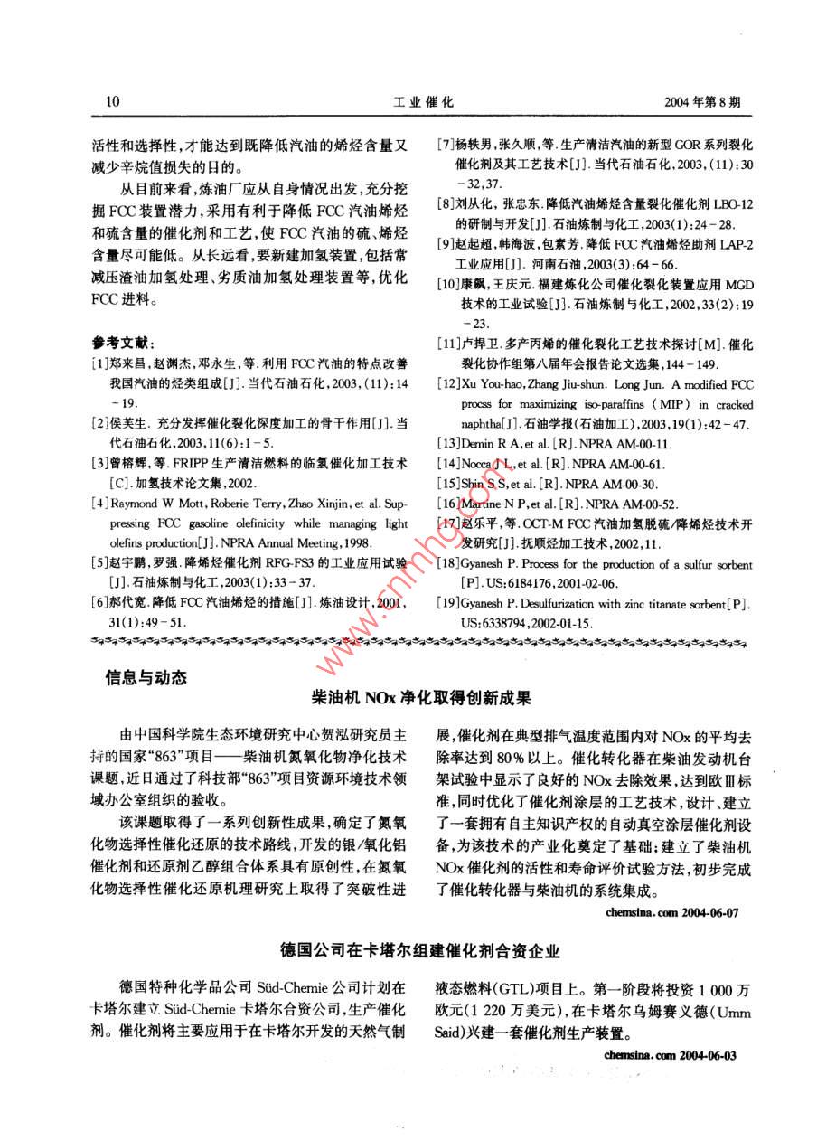 2004年8月工業(yè)催化第12卷第8期INDUSTRIAL CATALYSISVol.12" No.8專家綜述與展望FCC汽油脫硫降烯烴技術(shù)最新進展郇維芳,歐陽福生(華東理工大學石油加工研究所,上海200237)摘要:介紹了 國內(nèi)外降低催化汽油中硫和烯烴的技術(shù)。降低FCC汽油烯烴和硫含量的主要技術(shù)有對FCC原料油進行加氫預處理、在FCC過程中使用具有降低汽油烯烴和硫含量的催化劑或助劑以及對FCC汽油進行脫硫和降烯烴精制處理三類。關(guān)鍵詞:催化裂化(FCC)汽油;加氫脫硫;降烯烴中圖分類號:TE624.4*31;TE626.21文獻標識碼:A 文章編號 1008-1143(2004)8-0006-05Latest advances in hydrodesulfurization and olefin-reducingtechniques for FCC gasolineHUAN Wei-fang,OUYANG Fu-sheng(Research Institute of Petroleum Processing, East China Universityof Science and Technology(ECUST), Shanghai 200237, China)Abstract: Latest advances in hydrodesulfurization and olefin- reducing techniques for FCC gasoline werereviewed. Current techniques for reducing sulfur and olefin content in FCC gasoline include hy-drotreatment of feed oil for FCC, employing olefin- or sulfur reducing catalysts or additives duringFCC process and treatment of FCC gasoline.Key words: FCC gasoline; hydrodesulfurization(HDS); olefin- reducingCLC number: TE624.4+ 31;TE626. 21 Document code:A Article ID: 1008-1 143(2004 )08-0006-05汽車尾氣已成為城市的首要污染源之一一。歐美在排放物達標方面,我國汽油產(chǎn)品存在的主要相繼頒布了汽車尾氣排放標準,限制汽車尾氣中問題是硫含量和烯烴含量偏高。其主要原因如下:CO、HC、SOx .NOx顆粒物(PM)和炭煙等有害污染(1)我國煉油企業(yè)的二次加工以催化裂化物的含量。汽車尾氣排放達標的關(guān)鍵在于提高車用(FCC)為主,F(xiàn)CC汽油比例達80%以上,重整汽油,燃料油的質(zhì)量。因此,歐、美、日等都提出了清潔車只占約6% ,烷基化、醚類汽油比例很少。與此同用汽油標準。時,我國絕大多數(shù)催化裂化裝置摻煉大量渣油,如為了適應我國車用汽油與國際市場接軌的要2001年中國石化、中國石油的催化裂化裝置渣油摻求,我國推出了“空氣凈化工程一清 潔汽車行煉量占原料總量的36.2%,比1999年提高了10.6動”叫,分三階段實施。第- -階段從2000年起實行個百分點(2),而國外催化裂化渣油摻煉量-般為新的《車用有害物質(zhì)控制標準>(GB14761-1999),與15%~20%。摻渣量提高,原料變重,造成原料與催歐洲91/441/EEC(即歐洲I)標準等效;第二階段從化劑接觸不好,熱裂化反應傾向增加,氫轉(zhuǎn)移能力下2004年起,新車達到歐洲94/12/EC(即歐洲II)標降,導致汽油烯烴含量升高。準;第三階段從2010年起,排放物與國際標準同步。(2)我國催化裂化裝置普遍采用超穩(wěn)分子篩催收稿日期:200405-26作者簡介:郇維芳(1973 - ),男,遼寧省人,工程師,1997年畢業(yè)于華東理工大學。在撫順石油化工研究院從事清潔燃料油生產(chǎn)工藝研究工作,現(xiàn)在為華東理工大學石油加工研究所在讀研究生。2004年第8期郇維芳等: FCC汽油脫硫降烯烴技術(shù)最新進展7化劑和高溫短接觸時間的操作條件,以適應摻煉渣(RON)91 .2,馬達法辛烷值(MON)79.2,可作為清油和提高汽油辛烷值的要求,致使催化裂化汽油中潔汽油的調(diào)合組分。烯烴體積分數(shù)高達40% ~ 60%。(3)我國除少數(shù)幾套重油催化裂化采用渣油加2 FCC 過程采用降烯烴催化劑或助劑氫脫硫預處理外,大多數(shù)裝置摻煉未經(jīng)精制的渣油,影響催FCC汽油烯烴含量的因素除了FCC原造成催化汽柴油硫含量升高。料油性質(zhì)外,還包括FCC催化劑和助劑類型以及相目前降低FCC汽油烯烴和硫含量的主要技術(shù)配套的工藝參數(shù), 如溫度、劑油比、反應時間和轉(zhuǎn)化分為三類:(1)對FCC原料油進行加氫預處理;(2)率等。 目前,國內(nèi)外對降烯烴催化劑研究很多,開發(fā)在FCC過程中使用具有降低汽油烯烴和硫含量的了各種降烯烴催化劑、助劑以及降烯烴組合工藝。催化劑和助劑;(3)對FCC汽油進行脫硫和降烯烴Grace Davison開發(fā)的RFG催化劑[4-5]特點是處理,包括選擇性加氫處理、吸附和抽提蒸餾脫在降低FCC汽油烯烴含量的同時,保證輕烯烴產(chǎn)硫等。率、辛烷值和焦炭選擇性不下降,使得生產(chǎn)丙烯、丁烯和異戊烯等輕烯烴產(chǎn)品的靈活性和可操作性大大1 FCC 原料加氫預處理提高。RFG-FS3 催化劑能降低烯烴6個百分點,同-般來說,F(xiàn)CC原料中氫含量越高,其汽油產(chǎn)時使RON提高1個單位,MON提高0.8個單位,品中烯烴含量就越低;原料中硫含量越高,其汽油產(chǎn)RON保持在90以上,MON保持在79以上。品中硫含量就越高。對FCC原料進行加氫預處理為了降低FCC汽油烯烴含量,Akzo Nobel公司能顯著增加原料的氫含量和降低原料的硫含量,從提出了一種新的催化劑技術(shù),稱之為TOM(Total而降低FCC汽油的硫和烯烴含量。Olefins Managenent) Cobral ,該技術(shù)通過三個機中國石化撫順石油化工研究院(FRIPP)開發(fā)的理起作用:(1)通過增加氫轉(zhuǎn)移來飽和烯烴;(2)將劣質(zhì)減壓蠟油加氫處理技術(shù)是針對我國催化裂化裝汽油中的烯烴選擇裂解成液化石油氣(LPG);(3)置普遍摻煉劣質(zhì)減壓蠟油如焦化蠟油(CGO)和脫增大飽和烴或烯烴的支鏈度。他們認為,用特殊的瀝青油(DAO)而開發(fā)的。采用該技術(shù)處理管輸沸石技術(shù)可實現(xiàn)氫轉(zhuǎn)移的增加,其中一.部分是通過CGO、孤島減三線油和CGO混合油,在總壓6.0~增加稀土量的方法來實現(xiàn)