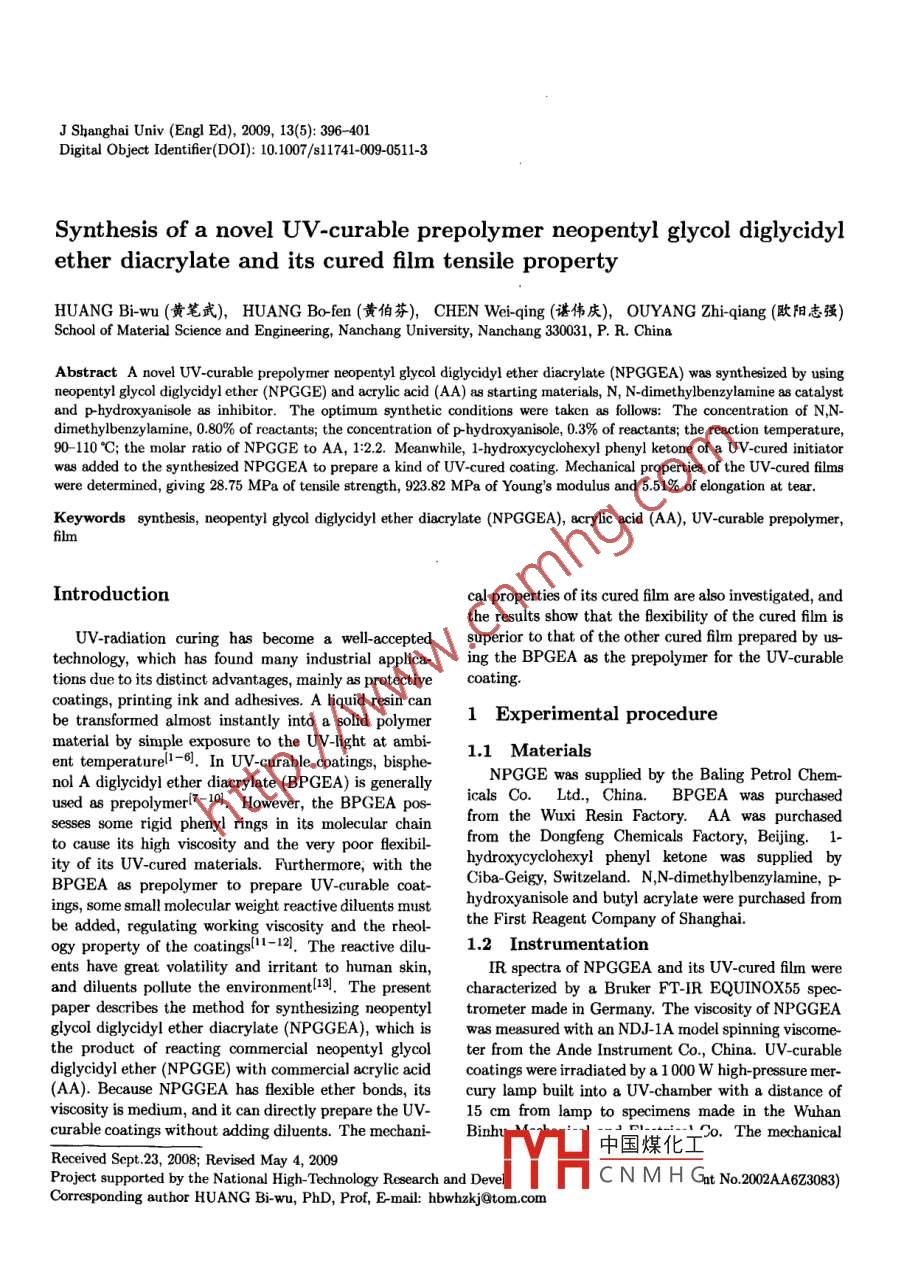 J Shanghai Univ (Engl Ed), 2009, 13(5): 396 401Digital Object Identifer(DOI): 10.1007/s11741-009-0511-3Synthesis of a novel UV-curable prepolymer neopentyl glycol diglycidylether diacrylate and its cured film tensile propertyHUANG Bi-wu (黃筆武),HUANG Bo-fen (黃伯芬),CHEN Wei-qing (諶偉慶),OUYANG Zhi-qiang (歐陽志強)School of Material Science and Engineering, Nanchang University, Nanchang 330031, P. R. ChinaAbstract A novel UV-curable prepolymer neopentyl glycol diglycidyl ether diacrylate (NPGGEA) was synthesized by usingneopentyl glycol diglycidyl ether (NPGGE) and acrylic acid (AA) as starting materials, N, N-dimethylbenzylamine as catalystand p-hydroxyanisole as inhibitor. The optimum synthetic conditions were taken as fllows: The concentration of N,N-dimethylbenzylamine, 0.80% of reactants; the concentration of p-hydroxyanisole, 0.3% of reactants; the reaction temperature,90-110 °C; the molar ratio of NPGGE to AA, 12.2. Meanwhile, 1-hydroxycyclohexyl phenyl ketone of a UV-cured initiatorwas added to the synthesized NPGGEA to prepare a kind of UV-cured coating. Mechanical properties of the UV-cured filmswere determined, giving 28.75 MPa of tensile strength, 923.82 MPa of Young's modulus and 5.51% of elongation at tear.Keywords synthesis, neopentyl glycol digycidyl ether diacrylate (NPGGEA), Bcryic acid (AA), UV-curable prepolymer,fimIntroductioncal properties of its cured film are also investigated, andthe results show that the flexibility of the cured flm isUV-radiation curing has become a well- acceptedsuperior to that of the other cured film prepared by u8-technology, which has found many industrial applica-ing the BPGEA as the prepolymer for the UV-curabletions due to its distinct advantages, mainly as protectivecoating.coatings, printing ink and adhesives. A liquid resin can1 Experimental procedurebe transformed almost instantly into a solid polymermaterial by simple exposure to the UV-light at ambi-1.1 Materialsent temperaturel1-6]. In UV-curable coatings, bisphe-nol A diglycidyl ether diacrylate (BPGEA) is generallyNPGGE was supplied by the Baling Petrol Chem-used as prepolymer(7- 10]. However, the BPGEA pos-icals Co. Ltd., China. BPGEA was purchasedfrom the Wuxi Resin Factory.AA was purchasedsesses some rigid phenyl rings in its molecular chainfrom the Dongfeng Chemcals Factory, Bejing. 1-to cause its high viscosity and the very poor flexibil-ity of its UV-cured materials. Furthermore, with thehydroxycyclohexyl phenyl ketone was supplied byBPGEA as prepolymer to prepare UV-curable coat-Ciba-Geigy, Switzeland. N,N- dimethylbenzylamine, p-ings, some small molecular weight reactive diluents musthydroxyanisole and butyl acrylate were purchased frombe added, regulating working viscosity and the rheol-the First Reagent Company of Shanghai.ogy property of the coatingl1-12. The reactive dilu-1.2 Instrumentationents have great volatility and irritant to human skin,IR spectra of NPGGEA and its UV-cured film werend diluents pollute the environment[13]. The presentcharacterized by a Bruker FT-IR EQUINOX55 spec-paper describes the method for synthesizing neopentyltrometer made in Germany. The viscosity of NPGGEAglycol diglycidyl ether diacrylate (NPGGEA), which iswas measured with an NDJ-1A model spinning viscome-the product of reacting commercial neopentyl glycolter from the Ande Instrument Co., China. UV-curablediglycidyl ether (NPGGE) with commercial acrylic acidcoatings were irradiated by a 1 000 W high-pressure mer-(AA). Because NPGGEA has flexible ether bonds, itscury lamp built into a UV-chamber with a distance ofviscosity is medium, and it can directly prepare the UV-15 cm from lamp to specimens made in the Wuhancurable coatings without adding diluents. The mechani-Binhu中國煤化工_2o. The mechanicalReceived Sept.23, 2008; Revised May 4, 2009Prject supported by the National High-Technology Research and DevelTYHC N M H Gat No.20202623088)Corresponding author HUANG Bi-wu, PhD, Prof, E-mail: hbwhzkj@tom.comJ Shanghai Univ (Eagl Ed), 2009, 13(5); 396 401397properties of the cured films were tested with a WDW-the reaction systerm. The methodl14I for analyzing the50 universal testing machine made in Shenzhen, China.acid value was as follows: The mixture (0.5 -1.0 g) in the.3 Synthesis of neopentyl glycol diglycidylflask was precisely weighted to place in a 250 mL conicalether diacrylate (NPGGEA)bottle, then it was dissolved in acetone, and phenolph-1.0 mol NPGGE was placed in a 1000 mL four-thalein indicator was added to the conical bottle. Potas-neck round-bottom fiask with a stirrer, a thermome-sium hydroxide ethanol standard solution (0.1 mol/L)er, a condenser and a dropping funnel. 0.40%-was used to titrate the mixture solution in the conical1.00% N, N-dimethylbenzylamine and 0.20%- 0.40% pbottle, and the appearance of rose pink was the titratedhydroxyanisole were also placed in the fAask, and theend point. The conversion of reaction was defined asmixture was then stirred and heated. AA in the drop-the fraction of carboxyl group that had reacted at timeping funnel was added dropwise to the mixture at 80-t. It was calculated from the acid value of the mi120 °C. After the completion of AA addition, the reac-ture which was a measure of the concentration of car-tion was kept at 90-120°C for 2-6 h. The acid valueboxyl groups using the following equation: conversionof the mixture in the flask was determined at definite(%)=100 (1- M/Mo), where Mo is the initial acid valuetime intervals. The reaction was terrminated when theof the mixture in the flask, and M the acid value of thecid value was lowered to 5 mg KOH/g. The obtainedmixture in the flask at time t.product was slightly yellow viscous liquid, its acid value2 Results and discussionwas 5.0 mg KOH/g, and its viscosity was approximately930 mPas at 25 °C.2.1 Synthesized reaction formula1.4 Determination of conversion percent-When a small amount of N, N-dimethylbenzylamineage of NPGGE into NPGGEAexisted in NPGGE with 