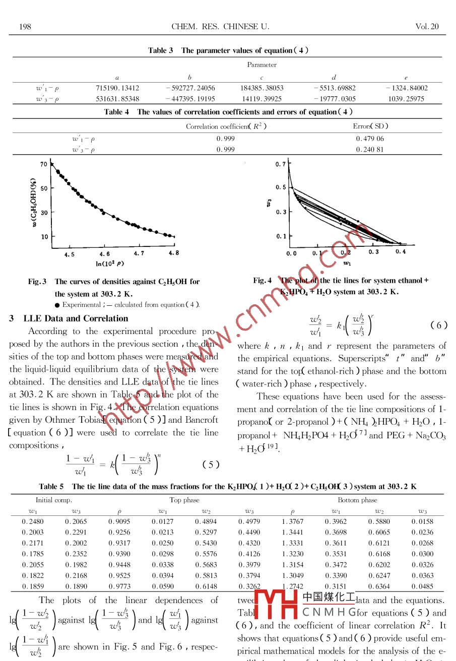 CHEM. RES CHINESE U. 2004, 202),195--199Measurement and Correlation of equilibriumData for Aqueous Two-phase SystemEthanol Water+ K2HPO4LiN Jin-qing, TAN Ping-hua JIN Chun-ying and LI Ming-chunCollege of Material Science and Engineering Huaqiao University, Quanzhou 362011, P.R. ChinaReceived Nov. 22 2003The isothermal solubility data of aqueous two-phase system ethanol water +K, HPO4 were determined withthe turbidity titration method at 303. 2 K. The binodal curves were described by using the Mistry equation verywell. An experimental procedure for measuring the liquid-liquid equilibrium data of the aqueous two-phase systemwas proposed in which the concentrations of the coexisting phases were determined with the corresponding densitiesof the solution. The tie lines were satisfactorily described by using the Othmer-Tobias and Bancroft equationKeywords Aqueous two-phase system, Solubility Turbidity titration LLE Ethanol, K,HPO4Article|D1005-9040(2004)02-19505IntroductionSome of the systems have proved to be efficient inThe aqueous two-phase partitioning method of partitioning processes both with biomaterials and withseparating materials of different biological origins is a metal ions. Therefore it has received more and moremethod by which two liquid phases are created from a attention from researchers. Wang 5] provided partialsingle homogeneous aqueous phase to which one or information for the systems of aqueous solutionsmore compounds are added. The additives are usually ethanol, propanol or acetone with NaCl, Mg2 SO 4either two structurally different hydrophilic polymers, Na2 SO4, (NH )SO4, and K2 HPO4 Cheluget 6 pre-such as dextran and polyethylene glyco PEG ) or a sented the system of 1-propanol with NaCl at 298Knd a salt, such as PEG and potassium phos- Zafarani-Moattar MT 78 presented the systems of Iphate. It has been observed that many solutes of large propano or 2-propanol )+ NH4 )HPO4 +H,O andmolecular weights including biomolecules such as 2-propanol+ NHH, PO4 water at 25 C. Greve 93proteins and enzymes, are distributed unevenly in presented some systems of aliphatic alcohols +salts+such systems with different components being prefer- water. Several other studies have been carried out onentially retained in one of the phases l-3. This pro- the separation of biological materials 10-12,metalvides a basis for the separationIons13-15] and other compoAlthough the phase forming agents originallyAlthough most of the published studies have beenem-focused on the partitioning distribution of the separatployed in aqueous two-phase systems are polymersed materials the equilibrium phase diagrams are inother solutes with lower molecular weights which pos- complete and the theoretical and empirical models aresess hydrogen bonds such as aliphatic alcohols and scarce. Herein we report the results of the experimenboth neutral and charged surfactants, may form tal study on an aqueous two-phase system ethanolbiphasic systems with inorganic salts. The major adwater+ K,HPO4 and the correlation of the solubilityandd om.l:L-.um data at temperaturevartages of the systems formed by aqtof 30中國煤化工ethanol and inorganic salts is low inCNMHGnoninflammable, nonemulsive and easy to handle].1MaterialsSupported by Naturd Science Foundation of Fujian Province( No. E0210022), Japan Science and Technology Corporation(.石點(diǎn)數(shù)揭 dence should be addressed196CHEM. RES CHINESE UVol 20Ethanol and K,HPO4 were purchased fromFor the determination of the tie lines, differentShanghai Chemical Co. ethanol. A.R. grade, 99. mixtures of known concentrations within the two-7%K,HPO4, A.R. grade, 99%). The ethanol phase area in the phase diagram were prepared. Thesewas used without further purification. K,HPO4 was mixtures were kept in the vessel at the temperature ofdried in an oven at about 383 K for 24 h and stored in (303. 2+0.1)K, stirred for 2 h, and then kept ina desiccater before use, double distilled and deionized the same water bath to allow the formation of twowater was usedaqueous phases. Having been settled for over 24 h2 Apparatus and procedurethe densities of the top and bottom phases were deter2.1 Binodal Curvemined by using 10 mL pycnometers, respectivelyThe experimental apparatus employed is essenAccording to the analysis of the phase rule of thetially similar to the one used in the literature 51. A system in the previous section, we have concludedglass vessel with a volume of 0. 05 L was used to carry that the density of the saturated solution is a singleout the phase equilibrium determination. Thefunction of the composition of any one of the threevessel was provided with an external jacket in wlcomponents and vice versa( the composition of anywater was circulated at a constant temperatureone of the three components is a single function of the(303.2+0. 1)k by using a thermostatdensity ) Thus based on the relation equations beThe binodal curve was determined by the turbidi- tween p and w; obtained with the method describedtitration method. A salt solution of a known con- in the previous section, the concentrations of thecentration was titrated with ethanol until the solution existing phases can be determined easily with the denbecame turbid which indicated the presence of a sec- sities. Furthermore the calculated concentrations ofond liquid phase. The composition of the mixture was the tie lines were verified by performing the mass badetermined by using an electric analytical balance with ances to determine if the amounts of k, HPO4 anda precision of +0 0001 from Sartorius Company ) ethanol used to create the feed phase correspondedof the mixture was determined by using a 10 mL pyc- below 0.75 relai and bottom phases. The resultThe relative error is below 0. 25 %( against the solu- thethetion net weight of 30 g ) The corresponding density shows that the error of the mass balances isnometer. The feasibility of the apparatus and the ac- Experimental Data and Correlationcuracy of this method h