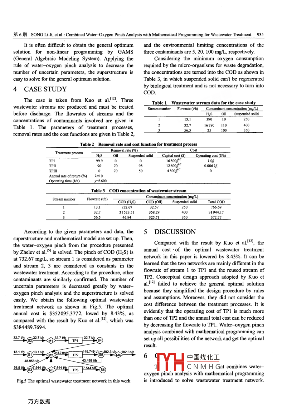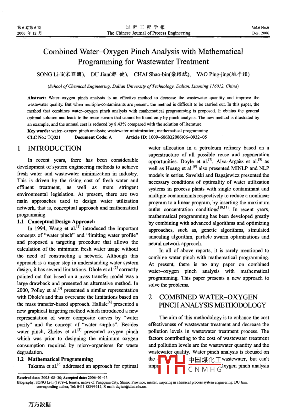 第6卷第6期過(guò)程工程學(xué)報(bào)Vol.6 No.62006年12月The Chinese Journal of Process EngineeringDec. 2006Combined Water -Oxygen Pinch Analysis with MathematicalProgramming for Wastewater TreatmentSONG Li-l(宋麗麗),DU Jian(都健),CHAI Shao-bin(柴紹斌),YAO Ping-jing(姚平經(jīng))(School of Chemical Engineering, Dalian University of Technology, Dalian, Liaoning 116012, China)Abstract: Water - oxygen pinch analysis is an effective method to decrease the wastewater quantity and improve thewastewater quality. But when multiple-contaminants are present, the method is difcult to be carried out. In this paper, themethod that combines water- oxygen pinch analysis with mathematical programming is proposed. It obtains the generaloptimal solution and leads to the reuse stream that cannot be found only by pinch analysis. The new method is ilustrated byan example, and the annual cost is reduced by 8.43% compared with the solution of literature.Key words: water-oxygen pinch analysis; wastewater minimization; mathematical programmingCLC No.: TQ021Document Code: AArticle ID: 1009- 606X(2006)06- -0932- -05INTRODUCTIONwater allocation in a petroleum refinery based on asuperstructure of all possible reuse and regenerationIn recent years, there has been considerableopportunities. Doyle et al.", Alva-Argaez et al.8l asdevelopment of system engineering methods to achievewell as Huang et al.91 also presented MINLP and NLPfresh water and wastewater minimization in industry.models in series. Savelski and Bagajewicz presented theThis is driven by the rising cost of fresh water andnecessary conditions of optimality of water utilizationeffuent treatment, as well1S morestringentsystems in process plants with single contaminant andenvironmental legislation. At present, there are twomultiple contaminants respectively to reduce a nonlinearmainapproaches used to design water utilizationprogram to a linear program, by inserting the maximumnetwork, that is, conceptual approach and mathematicaloutlet concentration conditionslol. In recent years,programming.mathematical programming has been developed greatly1.1 Conceptual Design Approachby combining with advanced algorithms and optimizingIn 1994, Wang et al."] introduced the importantapproaches, such as, genetic algorithms, simulatedconcepts of“water pinch"" and“l(fā)imiting water profile”annealing algorithm, particle swarm optimizations andand proposed a targeting procedure that allows theneural network approach.calculation of the minimum fresh water usage withoutIn all of above reports, it is rarely mentioned tothe need of constructing a network. Although thiscombine water pinch with mathematical programming.approach is a major step in understanding water systemAt present, there is no any paper on combineddesign, it has several limitations. Dhole et al.2 correctlywater- oxygen pinch analysis with mathematicalpointed out that based on a mass transfer model was aprogramming. This paper presents a new approach tolarge drawback and presented an alternative method. Insolve the problems.2000, Polley et al.5) presented a similar representationwith Dhole's and thus overcame the limitations based on2 COMBINED WATER-OXYGENthe mass transfer-based approach. Halle! presented aPINCH ANALYSIS METHODOLOGYnew graphical targeting method which introduced a newrepresentation of water composite curves by“waterThe aim of this methodology is to enhance the costpurity”and the concept of“water surplus". Besideseffectiveness of wastewater treatment and decrease thewater pinch, Zhelev et al.5 presented oxygen pinchpollution levels in wastewater treatment process. Thewhich was prior to designing the minimum oxygenfactors contributing to the cost of wastewater treatmentconsumption required by micro-organisms for wasteand pollution levels are the wastewater quantity and thedegradation.wastewater quality. Water pinch analysis is focused on1.2 Mathematical Programmingthe中國(guó)煤化工wastewater, but can'tTakama et al.6 addressed an approach for optimalimpr.MYHCNMHGOxygen pinch analysisReceived date: 2005- -08- -30; Acepted date: 2006 -01-13Blograpby:第6期SONG Li-li, et al: Combined Water- Oxygen Pinch Analysis with Mathematical Programming for Wastewater Treatment 933was found effective to solve the problem'9.shown as Fig.l(a). Since the relation is usually not2.1 Oxygen Pinch Analysislinear, it is difficult to use it in pinch analysis. However,Since almost all wastewater can be treatedthe reciprocal of substrate concentration and thebiologically withproper environmental control,reciprocal of D follow a linear correlation. Oxygenbiological treatment has been widely used as core partpinch analysis is defined by graphical targeting methodof the treatment processes. In biological treatment,similar to water pinch analysis [shown in Fig.1(b) andwaste substances are oxidized and converted into simple1(c)].end products, in which the oxidizer is oxygenThe oxygen pinch concept focuses on mass transfertransferred from air into the liquid. Oxygen demand ispinch analysis but exceeds the classical pinch targetdirectly related to not only wastewater quality but alsoexpectations. It succeeds to set quantitative targetsenergy required. So oxygen pinch analysis was(oxygen solubility, residence time, oxidation energynecessary to design the minimum oxygen consumptionload), as well as additional qualitative targets, namelyrequired by the micro-organisms for waste degradationthe growth rate directly addressing the micro-organismsand suggest flowsheet.age and health. Water pinch and oxygen pinch areOxygen demand D is proportional to substrateshown in Fig.2.concentration S, the relationship between D and S isr1單二>S古(舊) Relationship(6) Linear trace(C) Oxygen pinchFig.1 Oxygen pinch stream definitiss'lPinchMinimum freshMinimum oxygenwaterconsumiptionm. Fig.2 Water pinch and oxygen pinch analyses2.2 Water- Oxygen Pinch Analysistreatment was achieved by the application of a