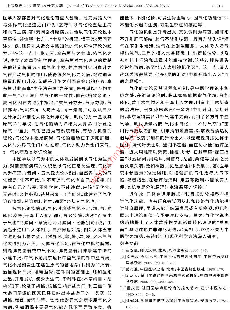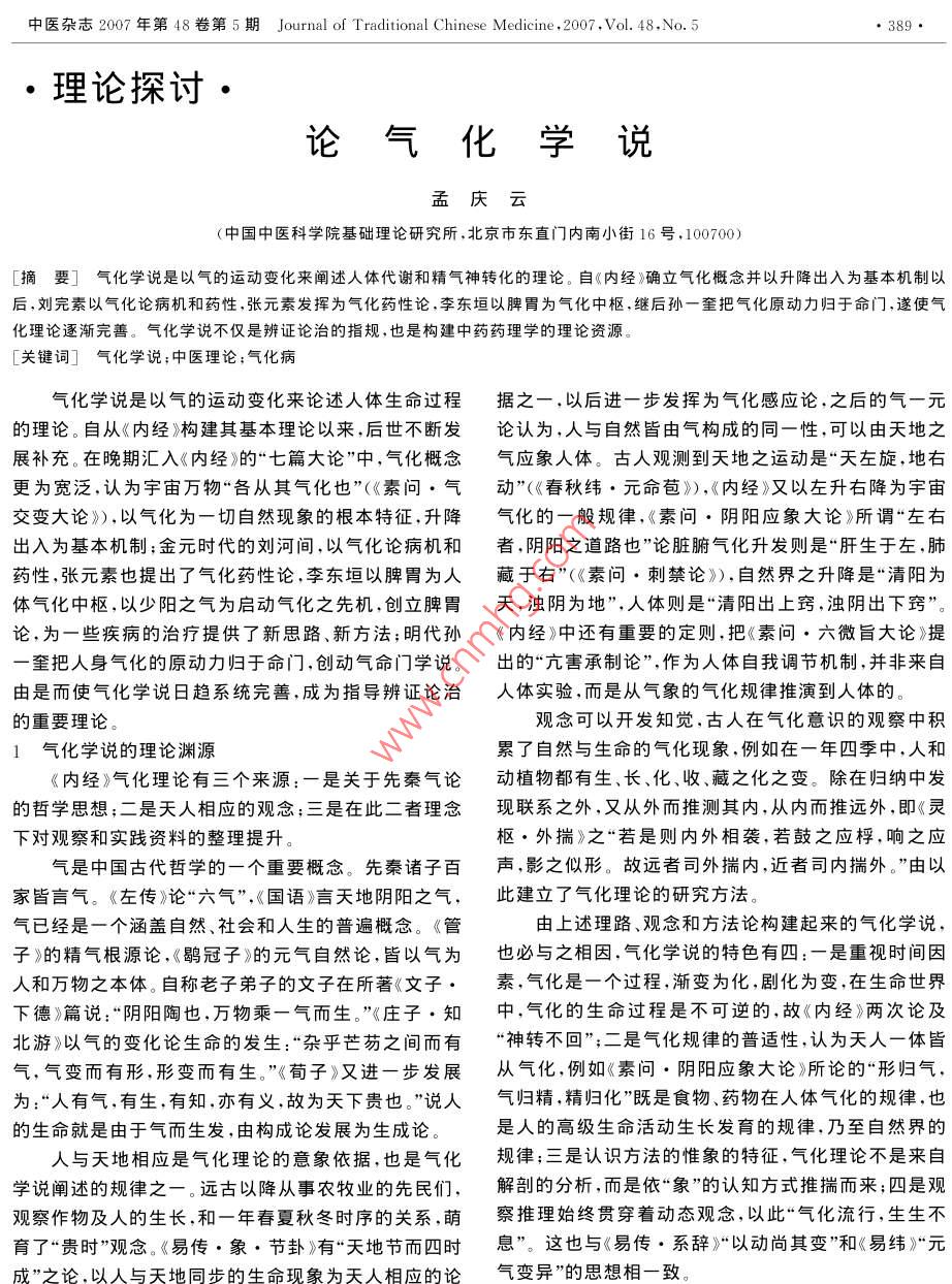 中醫(yī)雜志2007 年第48卷第5期Journal of Traditional Chinese Medicine ,2007 ,Vol.48,No. 5●389.●理論探討●論氣化學(xué)說(shuō)孟慶云(中國(guó)中醫(yī)科學(xué)院基礎(chǔ)理論研究所,北京市東直門(mén)內(nèi)南小街16號(hào),100700)[摘要]氣化學(xué)說(shuō)是以氣的運(yùn)動(dòng)變化來(lái)闡述人體代謝和精氣神轉(zhuǎn)化的理論。自《內(nèi)經(jīng)》>確立氣化概念并以升降出入為基本機(jī)制以后,劉完素以氣化論病機(jī)和藥性,張?jiān)匕l(fā)揮為氣化藥性論,李東垣以脾胃為氣化中樞,繼后孫. -奎把氣化原動(dòng)力歸于命門(mén),遂使氣化理論逐漸完善。氣化學(xué)說(shuō)不僅是辨證論治的指規(guī),也是構(gòu)建中藥藥理學(xué)的理論資源。[關(guān)鍵詞]氣化學(xué)說(shuō);中醫(yī)理論 ;氣化病氣化學(xué)說(shuō)是以氣的運(yùn)動(dòng)變化來(lái)論述人體生命過(guò)程據(jù)之一,以后進(jìn)一步發(fā)揮為氣化感應(yīng)論,之后的氣一元的理論。自從《內(nèi)經(jīng)》構(gòu)建其基本理論以來(lái),后世不斷發(fā)論認(rèn)為,人與自然皆由氣構(gòu)成的同一性,可以由天地之展補(bǔ)充。在晚期匯入《內(nèi)經(jīng)》的“七篇大論”中,氣化概念氣應(yīng)象人體。古人觀測(cè)到天地之運(yùn)動(dòng)是“天左旋,地右更為寬泛,認(rèn)為宇宙萬(wàn)物“各從其氣化也”(《素問(wèn)●氣動(dòng)”《春秋緯●元命苞》),《內(nèi)經(jīng)》又以左升右降為宇宙交變大論》,以氣化為一切自然現(xiàn)象的根本特征,升降氣化的一般規(guī)律,《素問(wèn)●陰陽(yáng)應(yīng)象大論》所謂“左右出入為基本機(jī)制;金元時(shí)代的劉河間,以氣化論病機(jī)和者,陰陽(yáng)之道路也”論臟腑氣化升發(fā)則是“肝生于左,肺藥性,張?jiān)匾蔡岢隽藲饣幮哉?李東垣以脾胃為人藏 于右”《素問(wèn)●刺禁論》),自然界之升降是“清陽(yáng)為體氣化中樞,以少陽(yáng)之氣為啟動(dòng)氣化之先機(jī),創(chuàng)立脾胃天.濁陰為地”,人體則是“清陽(yáng)出上竅,濁陰出下竅”。論,為一些疾病的治療提供了新思路、新方法;明代孫《內(nèi)經(jīng)》中還有 重要的定則,把《素問(wèn)●六微旨大論》提一奎把人身氣化的原動(dòng)力歸于命門(mén),創(chuàng)動(dòng)氣命門(mén)學(xué)說(shuō)。出的“亢害承制論”,作為人體自我調(diào)節(jié)機(jī)制,并非來(lái)自由是而使氣化學(xué)說(shuō)日趨系統(tǒng)完善,成為指導(dǎo)辨證論治人體實(shí)驗(yàn),而是從氣象的氣化規(guī)律推演到人體的。的重要理論。觀念可以開(kāi)發(fā)知覺(jué),古人在氣化意識(shí)的觀察中積1氣化學(xué)說(shuō) 的理論淵源累了自然與生命的氣化現(xiàn)象,例如在一年四季中,人和《內(nèi)經(jīng)》氣化理論有三個(gè)來(lái)源:一是關(guān)于先秦氣論動(dòng)植物都有生、長(zhǎng)、化、收、藏之化之變。除在歸納中發(fā)的哲學(xué)思想;二是天人相應(yīng)的觀念;三是在此二者理念現(xiàn)聯(lián)系之外,又從外而推測(cè)其內(nèi),從內(nèi)而推遠(yuǎn)外,即《靈下對(duì)觀察和實(shí)踐資料的整理提升。樞●外揣》之“若是則內(nèi)外相襲,若鼓之應(yīng)桴,響之應(yīng)氣是中國(guó)古代哲學(xué)的一個(gè)重要概念。先秦諸子百聲,影之似形。故遠(yuǎn)者司外揣內(nèi),近者司內(nèi)揣外。”由以家皆言氣。《左傳》論“六氣”,《國(guó)語(yǔ)>言天地陰陽(yáng)之氣,此 建立了氣化理論的研究方法。氣已經(jīng)是一個(gè)涵蓋自然、社會(huì)和人生的普遍概念?!豆苡缮鲜隼砺?、觀念和方法論構(gòu)建起來(lái)的氣化學(xué)說(shuō),子》的精氣根源論,《鸚冠子》的元?dú)庾匀徽?皆以氣為.也必與之相因,氣化學(xué)說(shuō)的特色有四:一是重視時(shí)間因人和萬(wàn)物之本體。自稱(chēng)老子弟子的文子在所著《文子●素,氣化是一個(gè)過(guò)程,漸變?yōu)榛?,劇化為?在生命世界下德》篇說(shuō):“陰陽(yáng)陶也,萬(wàn)物乘一氣而生。”《莊子●知中,氣化的生命過(guò)程是不可逆的,故《內(nèi)經(jīng)》兩次論及北游》以氣的變化論生命的發(fā)生:“雜乎芒芴之間而有“神轉(zhuǎn)不回”;二是氣化規(guī)律的普適性,認(rèn)為天人一體皆氣,氣變而有形,形變而有生?!薄盾髯印酚诌M(jìn)一步發(fā)展從氣化,例如《素問(wèn)●陰陽(yáng)應(yīng)象大論》所論的“形歸氣,為:“人有氣,有生,有知,亦有義,故為天下貴也?!闭f(shuō)人氣歸精,精歸化”既是食物、藥物在人體氣化的規(guī)律,也的生命就是由于氣而生發(fā),由構(gòu)成論發(fā)展為生成論。是人的高級(jí)生命活動(dòng)生長(zhǎng)發(fā)育的規(guī)律,乃至自然界的人與天地相應(yīng)是氣化理論的意象依據(jù),也是氣化.規(guī)律;三是認(rèn)識(shí)方法的惟象的特征,氣化理論不是來(lái)自學(xué)說(shuō)闡述的規(guī)律之一。遠(yuǎn)古以降從事農(nóng)牧業(yè)的先民們,解剖的分析 ,而是依“象”的認(rèn)知方式推揣而來(lái);四是觀觀察作物及人的生長(zhǎng),和一年春夏秋冬時(shí)序的關(guān)系,萌察推理始終貫穿著動(dòng)態(tài)觀念,以此“氣化流行,生生不:育了“貴時(shí)”觀念?!兑讉鳌裣蟆窆?jié)卦》有“天地節(jié)而四時(shí)息”。這也與《易傳●系辭》“以動(dòng)尚其變”和《易緯》“元成”之