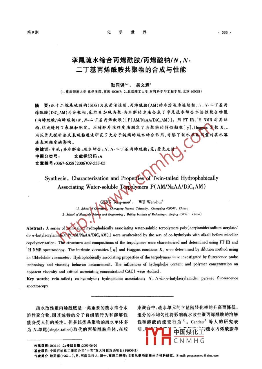 第9期533孿尾疏水締合丙烯酰胺/丙烯酸鈉/N,N二丁基丙烯酰胺共聚物的合成與性能耿同謀2,吳文輝2(1重慶師范大學(xué)化學(xué)學(xué)院,重慶40007;2.北京理工大學(xué)材料科學(xué)與工程學(xué)院,北京10081摘要:以十二烷基硫酸鈉(SDS)為衷面活性劑,丙烯酰胺(AM)的水溶液為連續(xù)相,A,N-二丁基丙烯酰胺( DiC AM)為分散相,采取先加堿共聚-共水解的方法合成了孿尾疏水締合水溶性聚合物聚(丙烯酰胺/丙烯酸鈉/N,N-二丁基丙烯酰胺)[P( AM/NaAA/ DiC AM)]。用FTIR、HNMR對其結(jié)構(gòu)、組威進(jìn)行了表征和測定。用稀釋外推粘度法測定了共聚物的特性粘數(shù)[n]、 Huggins常數(shù)Ks。用芘熒光探針法及表觀粘度法研究了大分子鏈間的疏水締合作用,考察了疏水單體用量對其水溶液表觀粘度的影響。關(guān)鍵詞:孿尾;共水解法;疏水締合;N,N-二丁基丙烯酰胺;芘;熒光光譜中圖分類號文獻(xiàn)標(biāo)識碼:A文章編號:0367-6358(2006)0953305Synthesis, Characterization and Properties of Twin-tailed HydrophobicallyAssociating Water-soluble Terpolymers P(AM/NaAA/DiC,AM)GENG Tong-mou, WU W(1. School of Chemistry, Chongging Normal Unirersity, Chongqing 400047,China2. School of Materials Science and Engineering, Beiing Institute of Technology, Beijing 100w!. China)Abstract: A series of twin-tailed hydrophobically associating water- soluble terpolymers poly( acrylamide/ sodium acrylatedi-n-butylacrylamide)[P(AM/NaAA/DiC, AM)] were synthesized by the way of co-hydrolysis with alkali before micellarcopolymerization. The structures and compositions of the terpolymers were characterized and determined using FT IR andH NMR spectroscopy. The intrinsic viscosities 7] and Huggins constants KH were determined by dilution method usingan Ubbelohde viscometer. Hydrophobically associating properties of the terpolymers were investigated by flurescence probetechnology and viscosity behavior measurement. The influences of hydrophobe content and polymer concentrationapparent viscosity and critical associating concentration( CAC)were studiedKey words: twin-tailed; co-hydrolysis; hydrophobic association; N, N-di-n-butylacrylamide; pyrene; fluorescencespectroscop疏水改性聚丙烯酰胺是一類重要的疏水締合水束聚合中,疏水單元的含量隨轉(zhuǎn)化率的升高而降低溶性聚合物,因其獨特的分子自組裝行為和溶解性組分的不均勻性將影響疏水改性聚丙烯酰胺的溶解能備受人們的關(guān)注。但是該類共聚物的疏水單體多性和溶液的流變行為。 Candar2等人的研究表為N單尾( single-tailed)取代的丙烯酰胺單體,在膠明中國煤化工硫水丙烯酰胺單CNMHG收稿日期:20051012;修回日期:20060620基金項目:中國石油化工集團(tuán)公司“十五”重大科技攻關(guān)項目(P100043)作者簡介:耿同謀(1962~),男,河南民權(quán)人,博士高級工程師;主要從事功能高分子材料研究。Emil: e gengtongmou@in_,com化學(xué)世界年體氮原子上的氫原子取代后生成N,N-雙取代丙烯DM攪拌使其完全溶解。在通氮的條件下攪拌0.5酰胺,疏水單體的極性降低,可以使共聚物的平均組h,加入過硫酸銨。使總單體質(zhì)量濃度c(總單體)=分不隨轉(zhuǎn)化率、表面活性劑疏水單體的摩爾比率15~30g/d,其中疏水單體質(zhì)量分?jǐn)?shù)x(DiC4AM)( surfactant to hydrophobic monomer molar ratio,簡稱0.200%~5.0%,SMR為1-25,x(水解度)=15%SMR值)的改變而改變;若N,N雙取代丙烯酰胺為m(總單體)m(引發(fā)劑)=1000,m(還原劑)/m(氧化N,N·李尾( twin-tailed)雙取代丙烯酰胺,兩個硫水長劑)=1.5。換成水浴,繼續(xù)通氮氣,恒溫反應(yīng)數(shù)小鏈在同一個N原子上,疏水密度較大,增粘效果顯時。將體系升溫至85℃,水解一定時間后停止,即著增強(qiáng)。因此,李尾( twin-tailed)雙取代丙烯酰胺成得P( AM/NaAA/DiC AM)膠體。將膠體剪碎,加水溶為近年來人們研究的熱點它可能在許多領(lǐng)域得到脹、溶解后,倒入大量兩酮中沉淀并用丙酮洗滌;將應(yīng)用,如三次采油制藥、太陽能轉(zhuǎn)換、化妝品涂料、沉淀得到的P( AM/NaAA/DiCAM)用無水乙醇洗提8水處理及減阻劑等3。本文利用氧化還原體系,h以除去殘留的SDs和水;最后在50℃下真空干燥采用先加堿共聚共水解的方法,在較低的溫度和較24h,粉碎,放入干燥器中備用。高的總單體濃度下合成了孿尾疏水締合水溶性聚合1.2,2P( AM/NaAA/DiC AM)特性粘數(shù)[n]及物聚丙烯酰胺丙烯酸鈉/N,N二丁基丙烯酰胺) Huggins常數(shù)k:的測試[簡稱P(AM/ NaAA/DiC4AM)],并研究了它們的結(jié)構(gòu)、組成與水溶液粘度的關(guān)系。準(zhǔn)確稱取提純的P( AM/NaAA/DiC4AM)、NaCl實驗部分加入蒸餾水,溶解后轉(zhuǎn)移到100mL容量瓶中,稀釋11主要試劑與儀器至刻度,配成一定聚合物質(zhì)量濃度的1.000mol/L丙烯酰胺(AM),分析純,北京益利精細(xì)化學(xué)品NaNO3溶液;在聚合物稀溶液范圍內(nèi),用逐步稀釋法有限公司;十二烷基硫酸鈉(SDs),化學(xué)純,北京益測定聚合物在1.000mol/ L NaNO3溶液中的特性粘利精細(xì)化學(xué)品有限公司;碳酸氫鈉,無水氯化鈣,氯數(shù)[y1及 Huggins常數(shù)k化鎂,氫氧化鈉,均為分析純,北京化工廠;過硫酸1.2.3熒光光譜的測試6銨,分析純,北京世紀(jì)紅星化工有限責(zé)任公司;尿素準(zhǔn)確稱取芘10.1mg,溶于甲醇后,轉(zhuǎn)移到50分析純,北京劉李店化工廠;氨水,分析純,天津市化mL容量瓶中,稀釋至刻度,即為1×10moL的芘學(xué)試劑三廠;N,N二甲基胺基乙基2甲基丙烯酸的甲醇溶液。用微量進(jìn)樣器吸取上述芘的甲醇溶液酯(DM),9%, Acros Organics公司;乙二胺四乙酸二50.0于潔