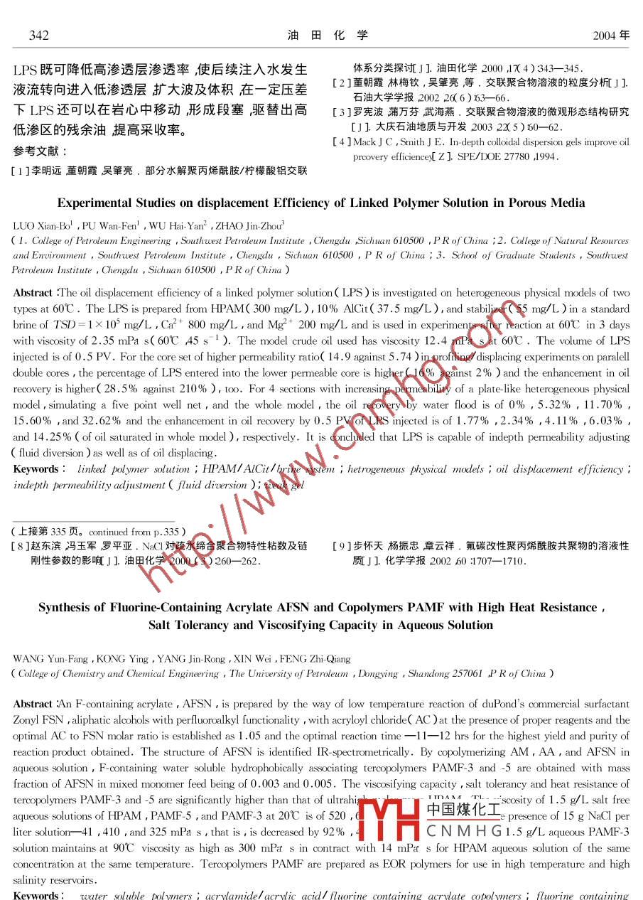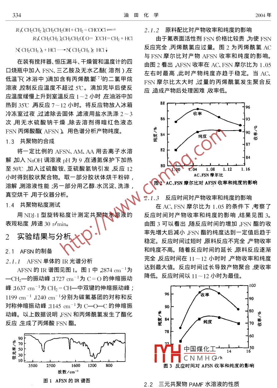 第21卷第4期油田化學(xué)Vol 21 No 42004年12月25日Oilfield Chemist25Dec,2004文章編號:1000-409x(2004)4033303含氟丙烯酸酯AFSN及其與丙烯酰胺、丙烯酸的共聚物PAMF的合成與共聚物水溶液粘度性能王云芳,孔瑛,楊金榮,辛偉,馮志強(石油大學(xué)華東光學(xué)化工學(xué)院山東東營257061)摘要將將杜邦公司的商品氟表面活性劑 Zonyl FSN含全氟烷基的脂肪醇)與丙烯酰氯AC)等在低溫下反應(yīng)合成了含氟丙烯酸酯AFSN按產(chǎn)物收率和純度確定最佳摩爾比FSN:AC=1:1.05最佳反應(yīng)時間為11~12小時。用IR譜表征了AFSN的結(jié)構(gòu)。將 AFSNAM、AA在水溶液中共聚得到了含氟疏水締合水溶性聚合物PAMF3和PAMF孓混合單體總質(zhì)量中AFSN分別占0.3%和0.5%)PAMF共聚物在水溶液中的增粘性、抗鹽性和耐溫性遠高于超高分子量HPAM。室溫下濃度為1.5g/L的HPAM、PAMF5、PAMF3水溶液不含鹽時粘度分別為520、690、530 mPa s nacl濃度為15g/L時粘度分別為41、410、325mPas粘度下降率分別為92%、40%、38%。1.5L PAME-3水溶液在90℃時保有的粘度高達300mPas而1.5g/ L HPAM水溶液在9o℃時粘度為14mPasPAMF共聚物可望用作耐溫抗鹽的驅(qū)油聚合物。圖5參9。關(guān)鍵詞∶水溶性聚合物丙烯酰胺/丙烯酸/′含氟丙烯酸酯共聚物含氟聚合物浛氟丙烯酸酯冾成水溶液粘度驅(qū)油用聚合物中圖分類號:IE39扛IE357.46文獻標識碼A化學(xué)驅(qū)油技術(shù)是符合我國國情的較經(jīng)濟的提高采收率方法1部分水解聚丙烯酰膠HPM炸為1實驗部分驅(qū)油聚合物已在我國廣泛應(yīng)用但HPAM耐溫抗1.1儀器及試劑鹽能力差2不能用于高溫高鹽油藏。疏水締合水(1)器美國 Varian Unity400型核磁共振溶性聚合物(丙烯酰胺與少量疏水單體的共聚儀3i0 Rad digital division fts-80型紅外光譜儀物}3是為提高耐溫抗鹽性而開發(fā)的一大類驅(qū)油聚 Varian(C3800型色譜儀。合物目前大多數(shù)研究中引入的疏水基團是碳氫基(2試劑 Zonyl FSN氟表面活性劑美國杜邦團。相同碳鏈長度的碳氟基團與碳氫基團相比內(nèi)公司產(chǎn)旵昞丙烯酸過硫酸銨亞硫酸氬鈉氫氧化聚能密度和表面能更低疏水性更強45含氟疏鈉丙烯酰胺均為分析純水單體與丙烯酰胺一般需在含氟表面活性劑存在下1.2FSN丙烯酸釀AFSN合成進行水溶液共聚合含氟表面活性劑不僅價格昂貴,氟表面活性劑FSN)結(jié)構(gòu)式為還可能對共聚物的性能產(chǎn)生不良影響6。本文報道一種含氟單體及其與丙烯酰胺、丙烯酸在水溶液R(CH,CH22CH,CHOH中生成的共聚物該共聚物具有良好的增粘耐溫、其中抗鹽性能。合成YHa中國煤化工y=1-7CNMHG收稿日期200404-22修改日期2004-12-14基金項目國家科技部十五”攻關(guān)項目(2002BA312B05)資助課題作者簡1962-)男副教授頑士從事化學(xué)工程方面研究工作通訊地址257061山東省東營市石油大學(xué)(華東光化學(xué)化工mail:angy(@mail.dpu.edu.cn電話546-8391029334油田化學(xué)2004年R(,,OH+CH2=CHCOCI-2.1.2原料配比對產(chǎn)物收率和純度的影響RA( CH2 2CH,CHao= XCH=CH,+HCI由于氟表面活性劑FSN價格比較貴為使FSNNCH2CH3+HC→NCH2CH3)HCl↓反應(yīng)完全,丙烯酰氯應(yīng)過量。圖2為丙烯酰氯AC與FSN摩爾比對產(chǎn)物AFSN收率和純度的影響在裝有攪拌器、恒壓漏斗、干燥管和溫度計的四由圖2看出AFSN收率在AC、FSN摩爾比為1.05口燒瓶中加入FSN三乙膠及無水乙醚洛劑)在左右時最高,此時產(chǎn)物純度亦趨于穩(wěn)定。當(dāng)AC低溫下(冰浴中)滴加含有丙烯酰氯η的二氯甲烷FSN摩爾比太大時過量的丙烯酰氯發(fā)生聚合反溶液控制反應(yīng)溫度不超過5℃。滴加完畢后使反應(yīng)造成產(chǎn)物后處理困難收率低。應(yīng)溫度緩慢上升到室溫反應(yīng)1~2小時在油浴中加熱到35℃再反應(yīng)7~12小時。將反應(yīng)物放入冰箱冷凍室過夜過濾除去固體濾液用鹽水洗滌2-3收率次用無水硫酸鈉干燥除去溶劑得暗紅色液態(tài)FSN丙烯酸醵AFSN)用色譜分析產(chǎn)物純度1.3共聚物的合成將一定比例的AFSN、AM、AA用去離子水溶解加入NaOH調(diào)溶液pH為9在通氮保護下加熱至50℃加入過硫酸銨、亞硫酸氫鈉引發(fā),反應(yīng)12小時得到膠狀聚合物。取一部分膠狀體烘干粉碎,AC、FSN摩爾比溶解測溶液性能;另一部分用乙醇-水沉淀、洗滌圖2AC、FSN摩爾比對AFSN收率和純度的影響真空烘干用于儀器分析2.1.3反應(yīng)時間對產(chǎn)物收率和純度的影響1.4共聚物粘度測試在AC、FSN摩爾比為1.05的條件下,考察了用NDJ-1型旋轉(zhuǎn)粘度計測定共聚物水溶液的反應(yīng)時間對產(chǎn)物收率和純度的影響結(jié)果見圖3。表觀粘度轉(zhuǎn)速30r/min。由圖3可以看出隨反應(yīng)時間的增加,FSN酯的收2實驗結(jié)果與分析率先增大后減小FSN酯的純度達到一定值后趨于穩(wěn)定。反應(yīng)時間過短時原料反應(yīng)不完全產(chǎn)物收率2.1AFSN的制備和純度不高。隨著反應(yīng)時間的延長原料反應(yīng)逐漸2.1.1AFSN單體的IR光譜分析完全反應(yīng)時間在11~12小時時產(chǎn)物收率和純度AFSN的R譜圖見圖1。圖1中2874cm為達到最大值。反應(yīng)時間過長導(dǎo)致產(chǎn)物聚合使收率CH-的振動峰;727cm-1為C=O的伸縮振動降低。反應(yīng)時間以11~12小時為最佳。峰;1637cm-1為CH2=CH—中雙鍵的伸縮振動峰1199cm1,1240cm-1分別為碳氟基團的對稱和反對稱伸縮振動峰;145cm-1為C-O-C的伸縮振動峰。以上數(shù)據(jù)說明FSN和丙烯酰氯發(fā)生了酯化反應(yīng)生成