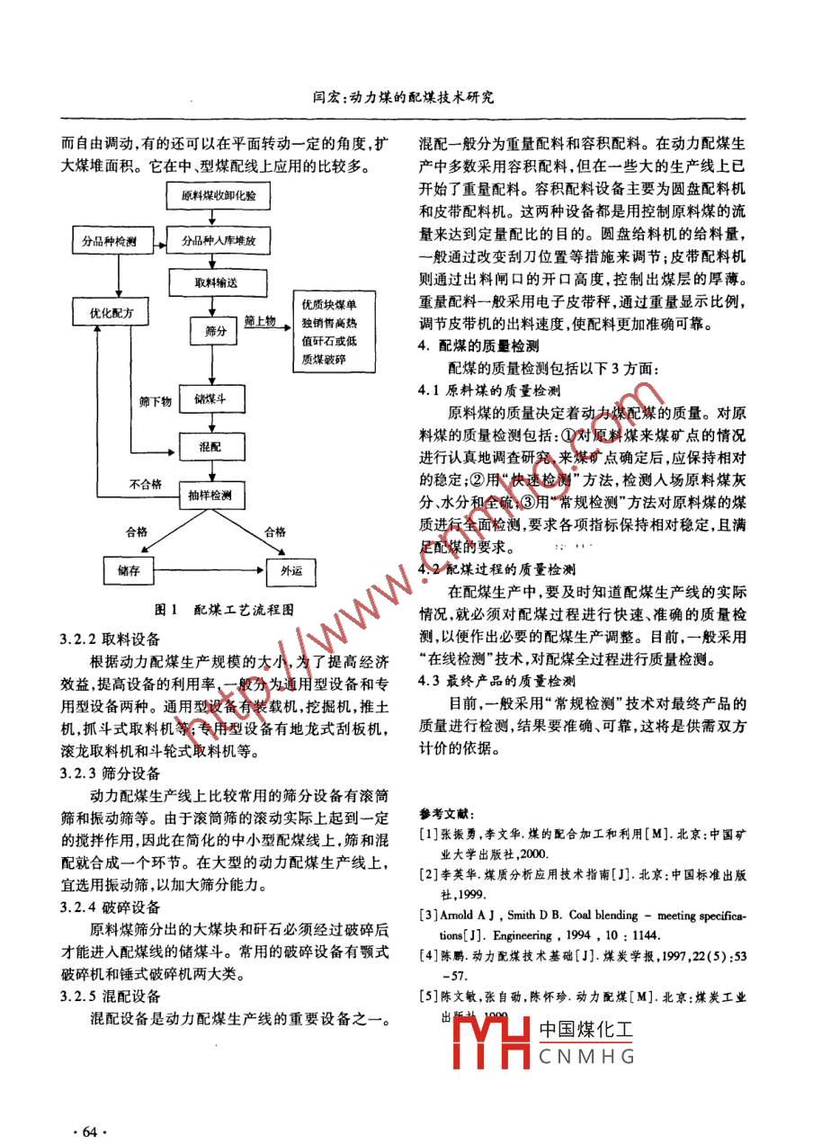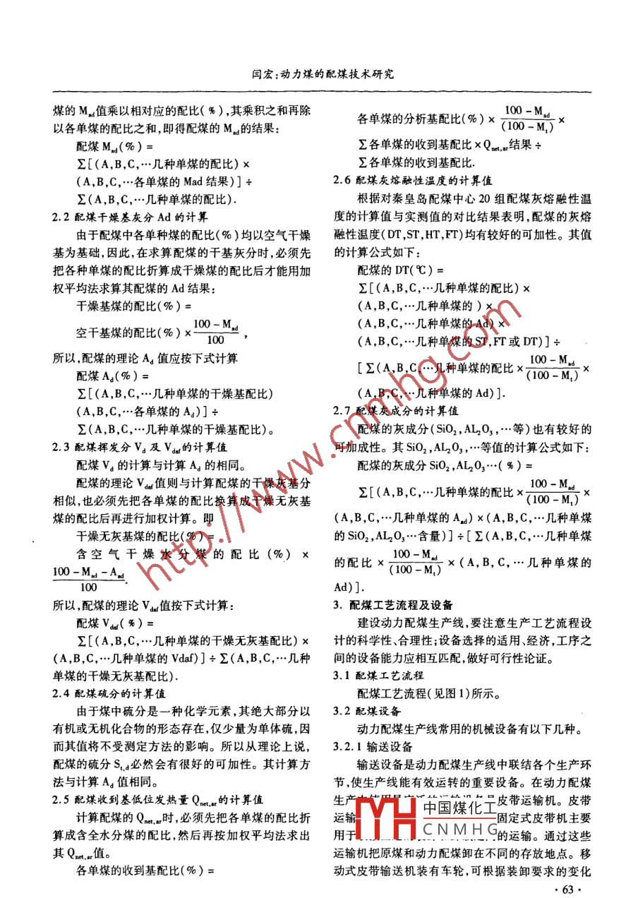第3期(總37期)河北能源職業(yè)技術(shù)學(xué)院學(xué)報(bào)No.3( SumNo.37)2010年9月Jourmal of Hebei Energy Institute of Vocation and TechnologySep. 2010.動(dòng)力煤的配煤技術(shù)研究閆宏(大同煤礦集團(tuán),山西大同037000)摘要:本文論述了 動(dòng)力煤配煤技術(shù)的優(yōu)化方案、主要質(zhì)量指標(biāo)的計(jì)算方法、配煤生產(chǎn)線的工藝流程和設(shè)備及配煤的質(zhì)量檢測(cè)方法。關(guān)鍵詞:動(dòng)力煤;配煤;煤質(zhì)指標(biāo)中圖分類號(hào):TQ520.62文獻(xiàn)標(biāo)識(shí)碼:A文章編號(hào):1671 - 3974(2010)03 -0062 -03Steam Coal Blending TechnologyYAN Hong(Datong Coal Mining Group, Datong 037000, China)Abstract: This paper discusses the steam coal blending optimization program. The main quality indexis calculated. Coal blending production line blending process and quality testing equipment areintroduced here.Key words:steam coal; coal blending; quality index動(dòng)力煤的配煤是指兩種或兩種以上的不同性質(zhì)2TX;≥B;的煤經(jīng)過(guò)篩選、破碎和按比例混合在- -起,形成- -種1.1.3在配煤計(jì)劃期內(nèi),單煤配比不能大于它占配煤“新煤種”。其作用是改變動(dòng)力煤的化學(xué)組分,優(yōu)化其計(jì)劃量的比例:燃燒特性,以適應(yīng)用戶對(duì)不同煤質(zhì)的要求。20世紀(jì)80X≤H/S;年代初期開(kāi)始,國(guó)內(nèi)外學(xué)者對(duì)動(dòng)力配煤已作了大量的1.1.4由n種單煤相配,配比之和必須達(dá)到100%:研究,近年來(lái),在我國(guó)一些用煤量大的城市、大的煤炭集散地以及- -些煤種較多且煤質(zhì)復(fù)雜的礦區(qū)也建起了&x;=100%;動(dòng)力配煤廠。為了更好地推廣動(dòng)力配煤技術(shù),本文在前1.1.5 單煤配比。各種單煤的配比不能為負(fù)值:人研究的基礎(chǔ).上,對(duì)動(dòng)力配煤技術(shù)作概括和分析。X;>0.1.動(dòng)力煤配煤方案的數(shù)學(xué)模型1.2 目標(biāo)函數(shù)的確定動(dòng)力煤配煤技術(shù)的基礎(chǔ)是確定最優(yōu)化的配煤方確定目標(biāo)函數(shù),- -般采用如下數(shù)學(xué)模型。案,而確定最優(yōu)化的配煤方案,即確定約束條件,求1.2.1 n種單煤相配,優(yōu)質(zhì)煤配比成本價(jià)應(yīng)最低:出目標(biāo)函數(shù)的極值。為此,假設(shè):①所選各煤質(zhì)指標(biāo)MinZ= scx;均具有直線可加性;②各指標(biāo)之間相互獨(dú)立,無(wú)交互1.2.2 n種單煤相配,優(yōu)質(zhì)煤配比應(yīng)最小:影響;③各單質(zhì)煤的煤質(zhì)指標(biāo)是個(gè)常量。在此基礎(chǔ)上MinZ=X;建立數(shù)學(xué)模型,并用以下步驟求解。1.2.3 n種單煤相配,低質(zhì)煤配比應(yīng)最大:1.1約束條件的數(shù)學(xué)模型MaxZ =x.約束條件- -般由5方面構(gòu)成,其數(shù)學(xué)模型如下。1.3求解.1.1.1用n種單煤相配,第i個(gè)技術(shù)指標(biāo)不能大于配確定了約束條件及目標(biāo)函數(shù)后,求解則成了純數(shù)學(xué)煤技術(shù)指標(biāo)的上限:問(wèn)題,目前有求多種解方法,也有相應(yīng)的計(jì)算機(jī)軟件。&TyX≤A;2.配煤主要質(zhì)量指標(biāo)的計(jì)算. 1.1.2用n種單煤相配,第i個(gè)技術(shù)指標(biāo)不能小于配2.1中國(guó)煤化工煤空氣干燥基水分煤技術(shù)指標(biāo)的下限:MHC N MH G計(jì)算的,即把各單收稿日期:2010 -04-27作者簡(jiǎn)介:制宏(1965- ),男,大學(xué),理學(xué)學(xué)土,大同煤礦集團(tuán)地煤公司工程師。研究方向:煤質(zhì)檢測(cè)。●62.閆宏:動(dòng)力煤的配煤技術(shù)研究煤的M。值乘以相對(duì)應(yīng)的配比( % ) ,其乘積之和再除各單煤的分析基配比(%)x100 - M..以各單煤的配比之和,即得配煤的M。的結(jié)果:(100-M,)配煤M.J(%)=E各單煤的收到基配比Qm .結(jié)果+E[(A, B,C,.幾種單煤的配比) xE各單煤的收到基配比.(A,B,..各單煤的Mad結(jié)果)] +2.6配煤灰熔融性溫度的計(jì)算值E(A,B,C,-.幾種單煤的配比).根據(jù)對(duì)秦皇島配煤中心20組配煤灰熔融性溫2.2配煤干燥基灰分Ad的計(jì)算度的計(jì)算值與實(shí)測(cè)值的對(duì)比結(jié)果表明,配煤的灰熔由于配煤中各單種煤的配比( % )均以空氣干燥融性溫度( DT ,ST,HT,FT)均有較好的可加性。其值基為基礎(chǔ),因此,在求算配煤的干基灰分時(shí),必須先的計(jì)算公式如下:把各種單煤的配比折算成干燥煤的配比后才能用加配煤的DT(C) =權(quán)平均法求算其配煤的Ad結(jié)果:E[(A,B,C,.幾種單煤的配比)x干燥基煤的配比(%)= .(A,B,,.幾種單煤的)x100- M.。(A,B,C,-幾種單煤的Ad) x空干基煤的配比(%)x- 100(A,B,C,.幾種單煤的ST,FT或DT)]。所以,配煤的理論As值應(yīng)按下式計(jì)算[ 2(A,B,C,.幾種單煤的配比x.100- M.配煤AJ(%) =(100 -M,)E[(A,B,C,-幾種單煤的干燥基配比)(A, B,C,-.幾種單煤的Ad)].(A,B,C,..各單煤的A.)] +2.7配煤灰成分的計(jì)算值E(A,B,C,幾種單煤的干燥基配比)。配煤的灰成分(SiO2, AL20,.等)也有較好的2.3配煤揮發(fā)分V。及Va的計(jì)算值可加成性。其SiO2 ,AL203 ,.等值的計(jì)算公式如下:配煤V。的計(jì)算與計(jì)算As的相同。配煤的灰成分SiO2,AL20...( %)=配煤的理論Vau值則與計(jì)算配煤的干燥灰基分E[(A,B,C,-幾種單煤的配比x-相似,也必須先把各單煤的配比換算成干燥無(wú)灰基(100- M,)煤的配比后再進(jìn)行加權(quán)計(jì)算。即(A,B ,C,-幾種單煤的A.J) x(A,B,C,.幾種單煤干燥無(wú)灰基煤的配比(%)=的SiO2 ,AL20...含量)]+[ E(A,B,C,.幾種單煤含空氣干燥水分煤的