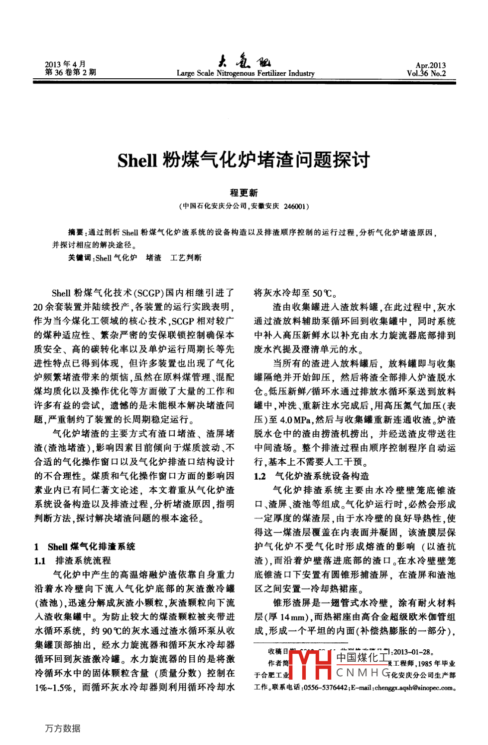 2013年4月大氛職、Apr2013第36卷第2期Large Scale Nitrogenous Fertilizer IndustryVol.36 No.2Shell粉煤氣化爐堵渣問題探討程更新(中國石化安慶分公司,安徽安慶246001)摘要:通過剖析Shell粉煤氣化爐渣系統(tǒng)的設備構造以及排渣順序控制的運行過程,分析氣化爐堵渣原因,并探討相應的解決途徑。關鍵詞:Shell氣化爐堵渣工藝判斷Shell粉煤氣化技術(SCGP)國內相繼引進了將灰水冷卻至50。20余套裝置并陸續(xù)投產,各裝置的運行實踐表明,渣由收集罐進入渣放料罐,在此過程中,灰水作為當今煤化工領域的核心技術,SCGP相對較廣通過渣放料輔助泵循環(huán)回到收集罐中,同時系統(tǒng)的煤種適應性、繁雜嚴密的安保聯(lián)鎖控制確保本中補人高壓新鮮水以補充由水力旋流器底部排到質安全、高的碳轉化率以及單爐運行周期長等先廢水汽提及澄清單元的水。進性特點已得到體現(xiàn),但許多裝置也出現(xiàn)了氣化當所有的渣進人放料罐后,放料罐即與收集爐頻繁堵渣帶來的煩惱,雖然在原料煤管理、混配罐隔絕并開始卸壓,然后將渣全部排入爐渣脫水煤均質化以及操作優(yōu)化等方面做了大量的工作和倉。低壓新鮮/循環(huán)水通過排放水循環(huán)泵送到放料許多有益的嘗試,遺憾的是未能根本解決堵渣問罐中,沖洗、重新注水完成后,用高壓氮氣加壓(表題,嚴重制約了裝置的長周期穩(wěn)定運行。壓)至4.0MPa,然后與收集罐重新連通收渣。爐渣氣化爐堵渣的主要方式有渣口堵渣、渣屏堵脫水倉中的渣由撈渣機撈出,并經送渣皮帶送往渣(渣池堵渣),影響因素目前傾向于煤質波動、不中間渣場。整個排渣過程由順序控制程序自動運合適的氣化操作窗口以及氣化爐排渣口結構設計行,基本上不需要人工干預。的不合理性。煤質和氣化操作窗口方面的影響因1.2氣化爐渣系統(tǒng)設備構造素業(yè)內已有同仁著文論述,本文著重從氣化爐渣氣化爐排渣系統(tǒng)主要由水冷壁壁籠底錐渣系統(tǒng)設備構造以及排渣過程,分析堵渣原因,指明口渣屏、渣池等組成。氣化爐運行時,必然會形成判斷方法,探討解決堵渣問題的根本途徑。- -定厚度的煤渣層,由于水冷壁的良好導熱性,使得這一煤渣層覆蓋在內表面并凝固,該渣膜層保1 Shell 煤氣化排渣系統(tǒng)護氣化爐不受氣化時形成熔渣的影響(以渣抗1.1 排渣系統(tǒng)流程渣),而沿著爐壁落進底部的渣口。在水冷壁壁籠氣化爐中產生的高溫熔融爐渣依靠自身重力底錐渣口下安置有圓錐形捕渣屏,在渣屏和渣池沿著水冷壁向下流人氣化爐底部的灰渣激冷罐區(qū)之間安置- -冷卻熱裙座。(渣池),迅速分解成灰渣小顆粒,灰渣顆粒向下流錐形渣屏是一翅管式水冷壁,涂有耐火材料人渣收集罐中。為防止較大的煤渣顆粒被夾帶進層(厚14mm),而熱裙座由高合金超級歐米伽管組水循環(huán)系統(tǒng),約90 C的灰水通過渣水循環(huán)泵從收成,形成一個平坦的內面(補償熱膨脹的一部分),集罐頂部抽出,經水力旋流器和循環(huán)灰水冷卻器收稿日*1:2013-01-28.循環(huán)回到灰渣激冷罐。水力旋流器的目的是將激作者簡中國煤化工及工程師,1985年畢業(yè)冷循環(huán)水中的固體顆粒含量(質量分數(shù))控制在于合肥工業(yè)MYHc N M H G化安慶分公司生產部1%~1.5%,而循環(huán)灰水冷卻器則利用循環(huán)冷卻水工作。聯(lián)系電話:0556 -5376442;E- -mail:chenggx.aqsh@sinopec.com。86大氛肥2013年第36 卷在氣化爐水冷壁壁籠下面,由渣池料斗和噴淋環(huán)渣屏的特殊結構;②渣池內部有氣體紊流,無規(guī)則組成渣池區(qū)。的氣流將氣化爐下渣口的液態(tài)渣吹向渣屏。液態(tài)渣在錐形渣屏表面不斷凝周,經過長時間的累積,2堵渣機理在渣屏上形成的周態(tài)渣越積越大,一旦形成的大堵渣“架橋"一般指極度的“細渣屑”或渣放料渣塊脫落,就會造成渣池底部架橋堵渣。渣屏渣形輔助泵故障,導致渣收集罐或渣放料罐中的橋接,成過程如圖2所示:①飛灰、渣滴、渣末由于旋流或者是大渣塊在渣池底部或破渣機上方架橋。裝.從渣口飛人而沉積在渣口帽內;②渣滴和針狀渣置開工初期堵渣主要發(fā)生在氣化爐設備泄漏或爐從渣口沿沉積在渣池壁;③飛灰、渣滴、渣末由于溫波動情況下,堵渣大部分在渣收集罐或渣放料旋流沉積在渣池壁和環(huán)形空間;④飛灰/渣滴/渣罐;隨著裝置運行時間的延長,堵渣衍變?yōu)榇笤鼔K末由于高溫易在渣屏的耐火泥上沉積;⑤沉積物在渣池底部或破渣機上方架橋,而且是穩(wěn)定運行的逐漸堆積形成較脆和易斷裂的渣塊;⑥剝落的的情況下突然發(fā)生。從爐內清出的渣型及組分推渣塊導致渣池堵渣架橋;⑦沉積物使渣口架橋.使斷,主要是渣口和渣屏累積結渣形成大塊,脫落在渣沿渣口流到渣池壁。渣池或以下部位架橋聚集,造成下渣閑難導致停2.1細渣屑的形成極度的“細渣屑”生成大多由以下因素所導致:①氣化爐溫度控制偏低;②助熔劑添加不當;氣附-~0③裝置剛開車過程中;④氣化爐設備泄漏導致爐溫波動;⑤上述因素的綜合作用。除了調節(jié)氣化條件外,通過“除橋”的方法一d般能夠恢復生產,即在爐渣放料順控運行過程中,改變氣化爐和渣鎖斗重新連接的壓差設定點,通過收集的“爐渣/細屑混合物"和隔離閥下面的重圖2渣屏渣形成機理量/壓差破壞橋接(如需要可重復進行)。2.3渣放料順控運行對渣屏掛渣的影響2.2渣屏掛渣的形成