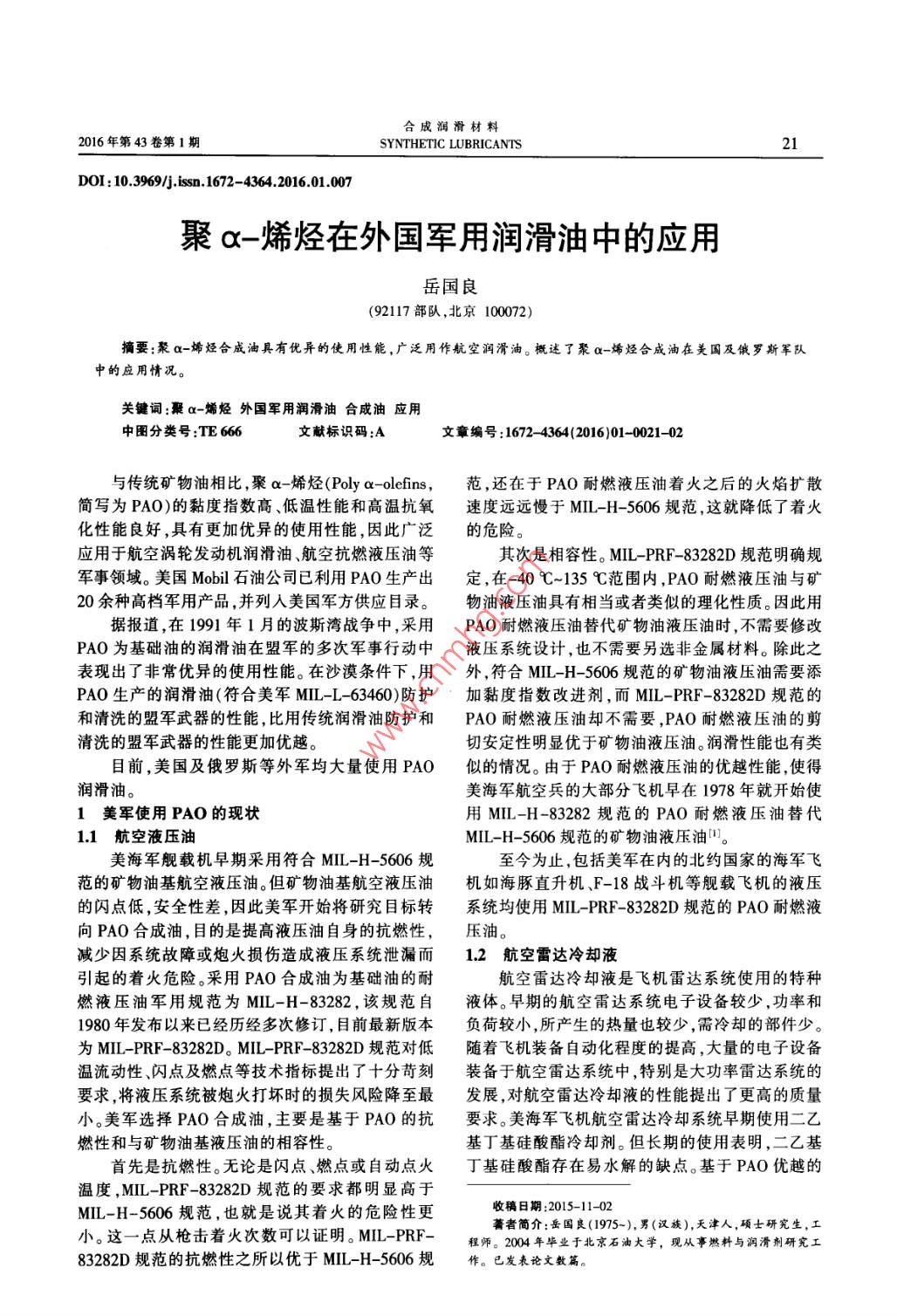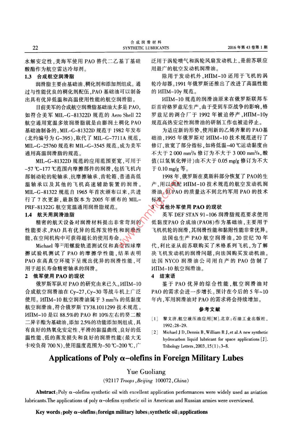 合成潤滑材料2SYNTHETIC LUBRICANTS2016年第43卷第1期水解安定性,美海軍使用PAO替代二乙基丁基硅泛用于渦輪噴氣和渦輪風(fēng)扇發(fā)動(dòng)機(jī)上,是前蘇聯(lián)應(yīng)酸酯作為航空雷達(dá)冷卻劑。用最廣的航空發(fā)動(dòng)機(jī)潤滑油。1.3合 成航空潤滑脂除用于發(fā)動(dòng)機(jī)外,HIM-10還用于飛機(jī)的渦潤滑脂主要由基礎(chǔ)油、稠化劑和添加劑組成。通輪冷卻器。1991年俄羅斯還推出了改進(jìn)了高溫性能.過與性能優(yōu)良的稠化劑配伍,PAO基礎(chǔ)油可以制備的HIIM-10y規(guī)范。出具有優(yōu)異低溫和高溫使用性能的航空潤滑脂。HIIM-10規(guī)范的潤滑油原來在俄羅斯聯(lián)邦車目前美軍的合成航空潤滑脂基礎(chǔ)油大多是PAO,臣首府格羅茲尼生產(chǎn),由于受到車臣戰(zhàn)爭(zhēng)的影響,格如符合美軍MIL-G-81322D規(guī)范的Aero Shell 22羅茲尼的調(diào)合廠于1992年被迫停產(chǎn),HIIM-10y航空通用寬溫多效潤滑脂就是由膨潤土稠化PAO規(guī)范高熱安定性潤滑油的研制工作也被迫停止。基礎(chǔ)油制備的。MIL- -G -81322D規(guī)范于1982年發(fā)布為適應(yīng)新的形勢(shì),使用新的乙烯齊聚的PA0基(北約編號(hào)為G -395),取代了MIL-G-7711A規(guī)范,礎(chǔ)油,1995年俄羅斯對(duì)KIIM-10技術(shù)規(guī)范進(jìn)行了MIL-G- -25760規(guī)范和MIL-G- -3545規(guī)范,成為美軍修訂,放寬了部分指標(biāo),如將低溫.-40C運(yùn)動(dòng)黏度由通用高溫潤滑脂的規(guī)范。不大于2000mm2/s修訂為不大于3000mm2/s,酸MIL-C-81322D規(guī)范的應(yīng)用范圍更寬,可用于值(以氫氧化鉀計(jì))由不大于0.05 mg/g修訂為不大-57 C~177 C范圍內(nèi)摩擦部件的潤滑,包括飛機(jī)內(nèi)于0.10 mg/g等。部制動(dòng)輪的輪軸承抗摩擦軸承、齒輪箱、普通高低1998年,俄羅斯在莫斯科部分恢復(fù)了PA0的生溫軸承以及其他的飛機(jī)高速輔助裝置的潤滑。產(chǎn),用以調(diào)配MIIM-10技術(shù)規(guī)范的航空發(fā)動(dòng)機(jī)潤MIL -C -81322規(guī)范自1965年首次頒布以來,共進(jìn)滑油。但PA0的質(zhì)量達(dá)不到北約軍用PAO的技術(shù)行了7次更新,最新版本為2005年頒布的MIL-標(biāo)準(zhǔn)。PRF-81322G航空寬溫通用潤滑脂規(guī)范。3其他外軍使用PAO的現(xiàn)狀1.4航天用潤滑油脂英軍DEF STAN 91-106潤滑脂規(guī)范要求使用精密的航天設(shè)備對(duì)潤滑材料提出非??量痰牡宛ざ萈AO合成油(PA08)作為基礎(chǔ)油,主要用于性能要求,PAO具有優(yōu)異的低揮發(fā)特性和潤滑性.飛機(jī)機(jī)輪的潤滑,其潤滑性能和黏附性能非常優(yōu)異。能,在空間機(jī)構(gòu)中可獲得超長的使用壽命。法國也生產(chǎn)PAO航空潤滑油。20世紀(jì)70年Michael等(2)用螺旋軌道測(cè)試儀和真空四球摩代,利比亞從前蘇聯(lián)購買了米格系列飛機(jī),為了解擦試驗(yàn)機(jī)測(cè)試了PAO的摩擦學(xué)性能,結(jié)果表明決飛機(jī)發(fā)動(dòng)機(jī)的潤滑問題,向法國購買發(fā)動(dòng)機(jī)油。PAO在高真空環(huán)境下呈現(xiàn)出優(yōu)異的潤滑性能,可法國NYCO潤滑油公司用自產(chǎn)的PAO仿制了用于超長壽命精密軸承的潤滑。HIIM--10航空潤滑油。2俄軍使用 PAO的現(xiàn)狀4結(jié)束語俄羅斯軍隊(duì)對(duì)PA0的研究由來已久。WIIM-10鑒于PAO優(yōu)異的綜合性能,航空潤滑油對(duì)合成航空潤滑油在Cy- 27, Cy- -30等戰(zhàn)斗機(jī)上廣泛.PAO的需求會(huì)進(jìn)一- 步增長。預(yù)計(jì)在今后的5年~10使用。MIM-10航空潤滑油屬于3mm2/s的低黏度年內(nèi),軍用潤滑油對(duì)PAO的需求將會(huì)持續(xù)增加。航空潤滑油,符合俄羅斯TY38.1011299技術(shù)規(guī)范。參考文獻(xiàn)HIIM-10是以88.5%的PAO和10%左右的癸二酸[1]黎文濟(jì).航空液壓油應(yīng)用[M].北京:石油工業(yè)出版社,二異辛酯為基礎(chǔ)油,添加2.5%的功能添加劑組成,具1992 :28- -29.有良好的熱氧化安定性、平滑的黏溫曲線、良好的低2] Michael J D,Dennis B , William R J,et al.A new synthetic溫性能、低的蒸發(fā)損失和良好的潤滑性能(最大無hydrocarbon liquid lubricant for space applications [J].卡咬負(fù)荷700 N),使用溫度范圍為-50 C~200C,廣Tribology Letters , 2003,15(1):3-8.Applications of Poly a-olefins in Foreign Military LubesYue Guoliang(92117 Troops , Beijing 100072 ,China)Abstract :Poly a -olefins synthetic oil with excellent application performances were widely used as aviationlubricants.The applications of poly a- -olefins synthetic oil in American and Russian armies were overviewed.Key words :poly c- -olefins ;foreign military lubes ;synthetic oil ;applications