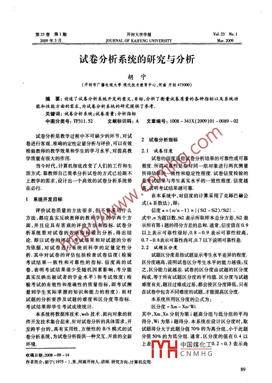 第23卷第1期開封大學(xué)學(xué)報Vol.23 No. 12009年3月JOURNAL OF KAIFENG UNIVERSITYMar. 2009試卷分析系統(tǒng)的研究與分析胡寧(開封市廣播電視大學(xué)現(xiàn)代技術(shù)教育中心,河南開封475000)摘要:論述了試卷分析系統(tǒng)開發(fā)的意義、目標(biāo),分析了衡量試卷質(zhì)量的各種指標(biāo)以及系統(tǒng)功能和性能方面的需求,為試卷分析系統(tǒng)的研究提供了參考.關(guān)鍵詞:試卷分析系統(tǒng);試卷質(zhì)量;分析指標(biāo)中圖分類號: TP311.52文獻(xiàn)標(biāo)識碼: A文章編號: 1008 -343X(2009)01 -0089 -02試卷分析是教學(xué)過程中不可缺少的環(huán)節(jié),對試2試卷分析指標(biāo)卷進行客觀、準(zhǔn)確的定性定量分析與評價,可以有效檢驗教師的教學(xué)效果和學(xué)生的學(xué)習(xí)水平,對提高教2.1試卷信度學(xué)質(zhì)量有很大的作用.試卷的信度是指試卷分析結(jié)果的可靠性或可靠當(dāng)今時代,計算機徹底改變了人們的工作和生程度.所謂可靠性是指對同- -組對象進行兩次測量活方式.靠教師自己簡單分析試卷的方式已經(jīng)跟不所得結(jié)果的一致性和穩(wěn)定性程度.試卷信度檢驗的上教學(xué)的需求,,設(shè)計出一一個高效的試卷分析系統(tǒng)勢是考試結(jié)果與考生真實水平的-致性程度.信度越在必行. .高,表明考試結(jié)果越可靠.在本系統(tǒng)中,對信度的計算采用了克郎巴赫公1系統(tǒng)開發(fā)目標(biāo).式(a系數(shù)法) ,即:評價試卷質(zhì)量的方法很多,但不管采用什么信度a=(n/n-1)x{(S2 -Si2)/Sl2} .方法,都應(yīng)真實反映教師的教和學(xué)生的學(xué)兩個方式中,n為題目數(shù),S02表示所取樣本總分方差,Si2表面,并且應(yīng)具有客觀的評價方法和指標(biāo).試卷分示所有第i題的得分方差的總和.通常,信度值在0.9析系統(tǒng)要對試卷的各項指標(biāo)做出分析,得出結(jié)以上表示可靠性很好,0.8 ~0.9表示可靠性較高,論.即以試卷的評估、考試結(jié)果和對試題的分析0.7~0. 8表示可靠性尚可,0.7以下說明可靠性差.為依據(jù),對試卷進行系統(tǒng)而科學(xué)的定量定性分2.2試題區(qū)分度析.其中對試卷的評估包括檢查試卷信度(檢驗試題區(qū)分度是指試題顯示考生水平差異的程度.考試結(jié)果一致性和可靠性的指標(biāo).信度高的試區(qū)分度越高,說明試卷區(qū)分考生水平的能力越強;反卷,表明考試結(jié)果很少受隨機因素影響,考分能之,區(qū)分能力就越差.試卷的區(qū)分度由試題的區(qū)分度真實反映出被試者的學(xué)業(yè)水平)和考試效度(檢構(gòu)成,等于所有試題區(qū)分度的平均值.區(qū)分度與試題驗考試的有效性和準(zhǔn)確性的質(zhì)量指標(biāo),即考試測難度有關(guān),題目過難或過易,都會使區(qū)分度降低,只有量到學(xué)生實際掌握的知識和能力的程度).而對在試卷中包含不同難度的試題,才能提高區(qū)分度.試題的分析要涉及試題的難度和區(qū)分度等指標(biāo).本系統(tǒng)所用區(qū)分度的公式為: .考試結(jié)果即學(xué)生考試成績統(tǒng)計.區(qū)分度= Xm - Xn/Wi本系統(tǒng)將數(shù)據(jù)庫技術(shù)、web技術(shù)、面向?qū)ο蟮能浿?Xm.Xn分別為第i題高分組與低分組的平均件開發(fā)技術(shù)集合起來,針對試卷分析的具體需求,開得分,Wi為第i題得分.本系統(tǒng)在設(shè)計區(qū)分度時,取發(fā)跨平臺的,具有實用性、方便性的B/S模式的試試題得分大于此題分值70%的為高分組,小于此題卷分析系統(tǒng),為試卷分析提供- -種交互、開放的全新分值50%的為低分組.通常,區(qū)分度的值在0.4以環(huán)境.上表中國煤化T0.2 ~0.3表示尚收稿日期:2008 -09 -14MYHCNMHG作者簡介:胡寧(1975-),男,河南開封人,講師.研究方向:計算機應(yīng)用.可,0.2以下應(yīng)淘汰.和刪除的權(quán)限.2.3試題難度試題難度是指考生答題的難易程度.難度越高4試卷分析 系統(tǒng)的性能需求說明考生正確回答試題越困難;反之,說明考生正確4.1可交互性回答試題越容易.難度值以0.3 ~0.7為宜.本系統(tǒng)用戶界面要友好,操作要簡單,方便用戶使用,的難度公式為:有很好的交互性.難度=(Xi/Wi) x 100%4.2準(zhǔn)確性和及 時性其中Xi、Wi分別表示此試題所得的平均分和此試處理信息的準(zhǔn)確性和及時性是系統(tǒng)的必要性題的分值.通常,難度值在0.7以上表示較易題,0.4能.在本系統(tǒng)設(shè)計和開發(fā)過程中,要充分考慮系統(tǒng)當(dāng)~0. 7表示中等難度題,0.4以下表示難題.前的工作量和將來可能承受的工作量.系統(tǒng)的處理2.4試題得分率能力和響應(yīng)時間應(yīng)滿足用戶對信息處理的需求.系試題得分率是指此試題的總得分占分值的比統(tǒng)在日常處理中的響應(yīng)速度應(yīng)達(dá)到實時要求.原則例.計算公式為:是保證操作人員不會因為速度問題影響工作效率.得分率=此題總得分/(考生人數(shù)x此題分值)4.3可靠性2.5其 他分析指標(biāo)資源的高可靠性對系統(tǒng)工作來說是至關(guān)重要以下分析指標(biāo)均可在數(shù)據(jù)庫中直接調(diào)用其函數(shù)的.系統(tǒng)要求采用性能優(yōu)越的數(shù)據(jù)庫系統(tǒng),這樣有利來計算:標(biāo)準(zhǔn)差(STDEV)、平均分(AVG)、樣本方差于縮短大批量數(shù)據(jù)的吞吐時間,使整個系統(tǒng)管理規(guī)(VAR).范化,能夠執(zhí)行備份操作而不影響系統(tǒng)的正常運