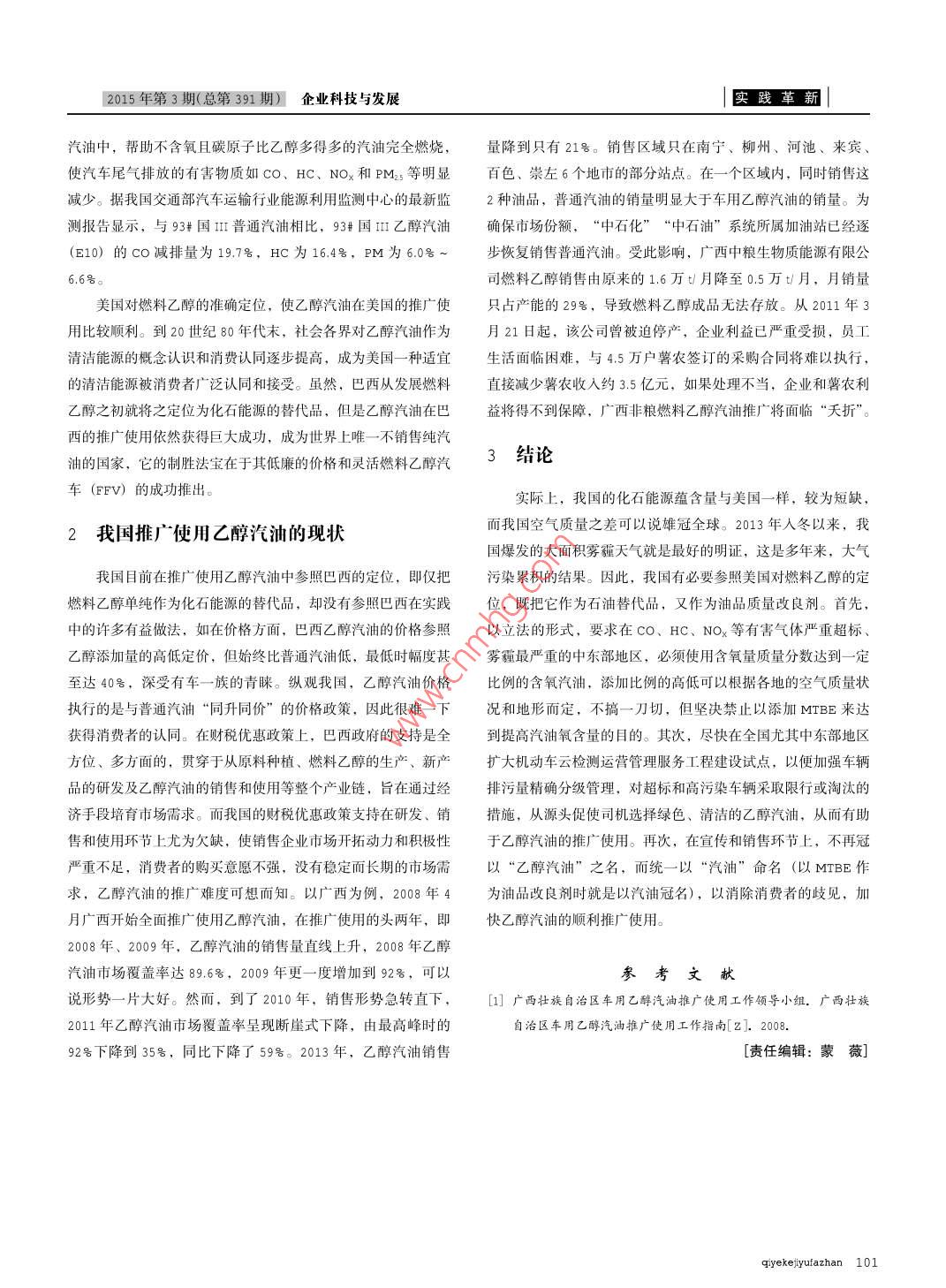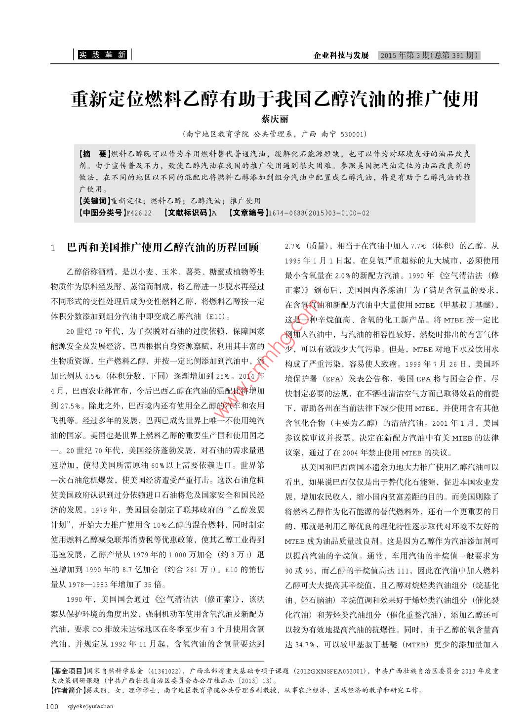 郾踐革新企業(yè)科技與發(fā)展2015年第3期(總第391期)重新定位燃料乙醇有助于我國乙醇汽油的推廣使用蔡慶麗(南寧地區(qū)教育學院公共管理系,廣西南寧53001)【摘要】燃料乙醇既可以作為車用燃料替代普通汽油,緩解石能源短缺,也可以作為對環(huán)境攴妤的油品改良劑。由于宣傳普及不力,致使乙醇汽油在我國的推廣使用遇到很大困難。參照美國把汽油定位為油品改良劑的做法,在不同的地區(qū)以不同的混配比將燃料乙醇添加到組分汽油中配置成乙醇汽油,將更有助于乙醇汽油的推廣使用【關鍵詞】重新定位;燃料乙醇;乙醇汽油;推廣使用【中圖分類號】42622【文獻標識碼】A【文章編號】674-0688(2015)03-0100-021巴西和美國推廣使用乙醇汽油的歷程回顧2.78(質量),相當于在汽油中加入77號(體積)的乙醇。從1995年1月1日起,在臭氧嚴重超標的九大城市,必須使用乙醇俗稱酒精,是以小麥、玉米、薯類、糖蜜或植物等生最小含氧量在2.0%的新配方汽油。1990年空氣清潔法(修物質作為原料經(jīng)發(fā)酵、蒸餾而制成,將乙醇進一步脫水再經(jīng)過正案)》頒布后,美國國內(nèi)各煉油廠為了滿足含氧量的要求,不同形式的變性處理后成為變性燃料乙醇,將燃料乙醇按一定在含氧汽油和新配方汽油中大量使用MTBE(甲基叔丁基醚體積分數(shù)添加到組分汽油中即變成乙醇汽油(E10)。這是一種辛烷值高、含氧的化工新產(chǎn)品。將MTBE按一定比20世紀70年代,為了擺脫對石油的過度依賴,保障國家例加入汽油中,與汽油的相容性較好,燃燒時排出的有害氣體能源安全及發(fā)展經(jīng)濟,巴西根據(jù)自身資源稟賦,利用其豐富的少,可以有效減少大氣污染。但是,MTBE對地下水及飲用水生物質資源,生產(chǎn)燃料乙醇,并按一定比例添加到汽油中,添構成了嚴重污染,容易使人致癌。19997月26日,美國環(huán)加比例從45號(體積分數(shù),下同)逐漸增加到25號。2014年境保護署(EPA)發(fā)表公告稱,美國EA將與國會合作,盡月,巴西農(nóng)業(yè)部宣布,今后巴西乙醇在汽油的混配比將增加快制定必要的法規(guī),在不犧牲清潔空氣方面已取得效益的前提到27.58。除此之外,巴西境內(nèi)還有使用全乙醇的汽車和農(nóng)用下,幫助各州在當前法律下減少使用MBE,并使用含有其他飛機等。經(jīng)過多年的發(fā)展,巴西已成為世界上唯一不使用純汽含氧化合物(主要為乙醇)的清潔汽油。2001年1月,美國油的國家。美國也是世界上燃料乙醇的重要生產(chǎn)國和使用國之參議院審議并投票,決定在新配方汽油中有關MTEB的法律20世紀70年代,美國經(jīng)濟蓬勃發(fā)展,對石油的需求量迅議案,通過了在2004年禁止使用MTEB的決議。速增加,使得美國所需原油60號以上需要依賴進口。世界第從美國和巴西兩國不遺余力地大力推廣使用乙醇汽油可以次石油危機爆發(fā),使美國經(jīng)濟遭受嚴重打擊。這次石油危機看出,如果說巴西僅僅是出于替代化石能源,促進本國農(nóng)業(yè)發(fā)使美國政府認識到過分依賴進口石油將危及國家安全和國民經(jīng)展,增加農(nóng)民收入,縮小國內(nèi)貧富差距的目的。而美國則除了濟的發(fā)展。1979年,美國國會制定了聯(lián)邦政府的“乙醇發(fā)展將燃料乙醇作為化石能源的替代燃料外,還有一個更重要的目計劃”,開始大力推廣使用含10號乙醇的混合燃料,同時制定的,那就是利用乙醇優(yōu)良的理化特性逐步取代對環(huán)境不友好的使用燃料乙醇減免聯(lián)邦消費稅等優(yōu)惠政策,使其乙醇工業(yè)得到MTE成為油品質量改良劑。這是因為乙醇作為汽油添加劑可迅速發(fā)展,乙醇產(chǎn)量從1979年的1000萬加侖(約3萬t)迅以提高汽油的辛烷值。通常,車用汽油的辛烷值一般要求為速增加到1990年的8.7億加侖(約合261萬)。E10的銷售90或93,而乙醇的辛烷值高達111,因此在汽油中加入燃料量從1978-1983年增加了35倍。乙醇可大大提高其辛烷值,且乙醇對烷烴類汽油組分(烷基化1990年,美國國會通過《空氣清潔法(修正案)》,該法油、輕石腦油)辛烷值調(diào)和效果好于烯烴類汽油組分(催化裂案從保護環(huán)境的角度出發(fā),強制機動車使用含氧汽油及新配方化汽油)和芳烴類汽油組分(催化重整汽油),添加乙醇還可汽油,要求Co排放未達標地區(qū)在冬季至少有3個月使用含氧以較為有效地提高汽油的抗爆性。同時,由于乙醇的氧含量高汽油,并規(guī)定從1992年11月起,含氧汽油的含氧量要達到達34.7號,可以較甲基叔丁基醚(MTEB)更少的添加量加入【基金項目】國家自然科學基金(41361022),廣西北部灣重大基礎專項子課題(2012 GXNSEEA053001),中共廣西壯族自治區(qū)委員會2013年度重決策調(diào)研課題(中共廣西壯族自治區(qū)委員會辦公廳桂函辦[2013)13)【作者簡介】蔡慶麗,女,理學學士,南寧地區(qū)教育學院公共管理系副教授,從事農(nóng)業(yè)經(jīng)濟、區(qū)域經(jīng)濟的教學和研究工作。2015年第3期(總第391期)企業(yè)科技與發(fā)展實踐革新汽油中,幫助不含氧且碳原子比乙醇多得多的汽油完全燃燒,量降到只有21號。銷售區(qū)域只在南寧、柳州、河池、來賓使汽車尾氣排放的有害物質如co、HC、NoOx和PM3等明顯百色、崇左6個地市的部分站點。在一個區(qū)域內(nèi),同時銷售這減少。據(jù)我國交通部汽車運輸行業(yè)能源利用監(jiān)測中心的最新監(jiān)2種油品,普通汽油