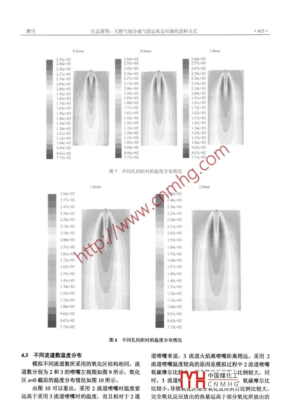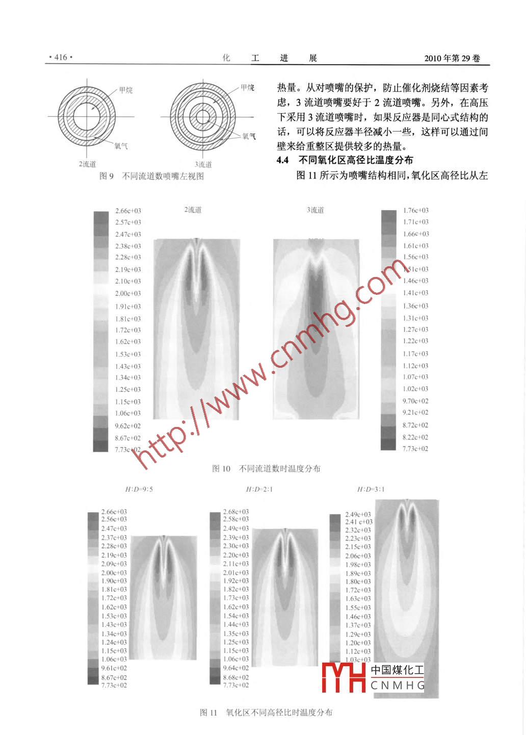 化工進展2010年第29卷增刊CHEMICAL INDUSTRY AND ENGINEERING PROGRESS·411·天然氣制合成氣固定床反應器的進料方式莊志國,魏偉勝,徐建(中國石油大學(北京)CNPC催化重點實驗室,北京102249)摘要:對高壓下適于工業(yè)規(guī)模的進料方式進行了討論,得出采用反應器內混合進料是最佳的進料方式。采用CFD軟件 Fluent對實驗所用噴嘴及反應器進行了數(shù)值模擬,其中,湍流模型選擇標準k-ε模型,用通用有限速率模型及渦耗散模型計算組分輸運和化學反應。結果顯示氧化區(qū)內氧碳摩爾比與溫度分布和實驗值吻合較好,說明模擬結果是可信的。通過考察不同噴嘴及氧化區(qū)結構的溫度分布得出:收縮角在10°,15°和20°中,15°為宜,孔間距在0.2~2mm中,0.6mm為宜,3流道噴嘴優(yōu)于2流道噴嘴,而氧化區(qū)采用高徑比為3:1的B型結構較好關鍵詞:天然氣;合成氣;進料方式;CFD模擬;溫度分布天然氣制合成氣是天然氣大規(guī)模利用的主要混合型,天然氣和氧氣反應器內混合型,氧分布器途徑,合成氣制備過程的設備投資和操作費用占全型以及分步進氧型四種類型。過程投資和操作費用的50%~75%,改進和革新造預混合型是指原料氣在進入反應器之前就預氣過程是天然氣化工利用節(jié)能降耗的關鍵。合成先混合好,然后一同進入反應器進行反應。 Barrio氣的后續(xù)利用過程(包括FT合成,合成氨的生產(chǎn)等6驗證催化部分氧化和蒸汽重整反應器模型時以及甲醇的制備)都是在高壓(2MPa以上)條件所采用的就是這種進料方式。預混合可以將原料下進行的,原料氣中的天然氣也是通過高壓輸氣管氣充分混合,但是,容易發(fā)生爆炸,操作危險,線輸運的,這就要求天然氣制合成氣過程必須在它只適用于實驗室小試或催化劑評價實驗,而對高壓下進行。但是,合成氣制備的主要反應是一于稍大型的實驗,因反應放熱量大將使原料氣溫個體積增大的反應,高壓對反應不利23。為了得度升高,在預混合過程中就會出現(xiàn)燃燒反應,即到和常壓同樣的合成氣收率就需要提高反應溫回火問題度,然而,工業(yè)上要想在800~900℃的基礎上提反應器內混合型與預混合型正好相反,原料氣高反應溫度,供熱是比較困難的,因此,可以通由各自孔道(如噴嘴)分別進入反應器,在反應器過提高原料氣的預熱溫度來提高反應溫度。通過內進行混合后反應。反應器內混合型雖然不會有爆熱力學計算得出最佳的預熱溫度為773~923K,炸的危險,但是如果原料氣混合不均勻,就會產(chǎn)生在如此高的預熱溫度下,原料氣如何進入反應器積碳以及高溫熱點。采用反應器內混合的關鍵是如并快速均勻的混合便成了急需解決的問題。如果何實現(xiàn)原料氣的快速均勻混合原料氣混合不均勻,就會出現(xiàn)富甲烷區(qū)和富氧區(qū),華東理工大學發(fā)明的帶有內分布器的三流道在富氧區(qū)會發(fā)生甲烷的完全氧化反應,放出大量天然氣部分氧化制合成氣噴嘴,主要采用的就是的熱量,造成局部的高溫熱點;在富甲烷區(qū),甲天然氣與氧氣在反應器內混合的內混合型。如圖1烷在高溫下會發(fā)生高溫裂解而產(chǎn)生積碳,影響過和圖2所示。噴嘴主要由中心流道、內環(huán)隙流道程的穩(wěn)定性及整個反應的順利進行。另外,天然外環(huán)流道、內分布器和冷卻系統(tǒng)諸零部件組合安裝氣在氧氣中的爆炸極限為50%~600%,盡可能而成。由于這一噴嘴在其噴口處形成了兩股天然氣保證最高的安全性是必要的。因此,采用什么樣夾氣化劑(氧氣)的流動形態(tài),促進了氣化劑與天的進料方式對天然氣催化部分氧化制合成氣過程然氣的快速均勻混合,從而提高天然氣的轉化率和至關重要。氣化爐出口中國煤化工氣體流速和縮適于工業(yè)規(guī)模的進料方式小噴口收縮CNMHG撚燒強度。此外通過設置冷卻系統(tǒng)——水冷夾套,良好地保護了原料氣的進料方式可以分為天然氣和氧氣預噴嘴,延長了噴嘴的使用壽命。412·化工進展2010年第29卷比如:采用分步進氧進料的方式中,一段出口處反應溫度高達1073~1273K,在此加入二段氧后很容易立刻發(fā)生均相燃燒反應,而且催化劑床層的中段仍然存在高溫熱點。綜上所述,適于工業(yè)規(guī)模的進料方式最好采用雙流道外混合型噴嘴。使原料氣通過噴嘴的各流道分別噴入到反應器內,并快速均勻混合2數(shù)值模擬2.1物理模型圖3所示為模擬過程所用的其中一種噴嘴及氧圖1燒嘴外形圖化區(qū)結構示意圖。氧化區(qū)頂部為一雙流道外混合型噴嘴,中心流道走天然氣,外圍流道走氧氣,也可以為三流道噴嘴。圖3中所示氧化區(qū)為圓柱形(A型),也可以為臺柱形(B型)。22控制方程所采用的質量、組分、動量及能量守恒基本方程山如下。連續(xù)方程c+d(m)=0(1)組分方程a(pc)圖2A-A剖視圖+div(puc,)=div(D, grad(pc, ))+S,(2氧分布器型是將天然氣、水和化學計量氧中動量方程的一部分先混合好后通入到反應器,其余氧氣則由0()+d)=dp(8n)-x+S(3氧分布器通入到催化劑床層;而分步進氧型1則是指化學計量氧中的一部分先與天然氣在反應器外能量方程進行混合后一起進入反應器,其余氧氣可以分幾步(pr)+div(pur)=div-gradT +Sr(4)加入到反應器內。因此,分布器進氧和采用分步進氧原理基本相同,都是將一部分氧氣和天然氣混合以上各式中,p為密度,u為速度矢量,P為壓好后加入到反應器,避開甲烷的爆炸極限,然后再力,為動力黏度,t為時間,T