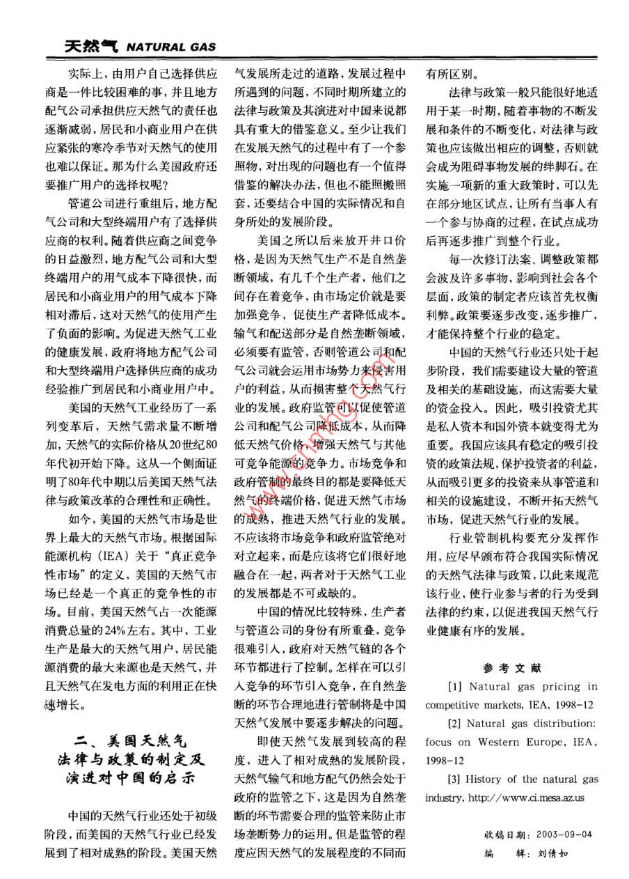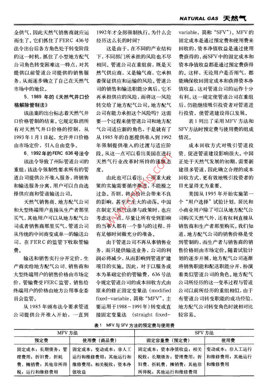 NATURAL GAS天氣對(duì)美國(guó)天然氣法律與政策的思索楊鳳玲王海旭楊慶泉(同濟(jì)大學(xué))摘要美國(guó)天然氣工業(yè)歷經(jīng)了百余年的歷史,政府在天然氣的不同發(fā)展時(shí)期制定了不同的法律與政策。1938年頒布了《天然氣法》,主要是加強(qiáng)政府對(duì)自然壟斷的管道運(yùn)輸行業(yè)的監(jiān)管;1954年制定的菲利普斯決議和1978年出臺(tái)的《天然氣政策法》雖然在天然氣定價(jià)方面顯得背道而馳,但都是為了解決當(dāng)時(shí)的問(wèn)題;1985年頒布的FERC436號(hào)法令與1992年頒布的FERC636號(hào)法令為天然氣行業(yè)引入竟?fàn)?、?guī)范行業(yè)行為做出了重要貢獻(xiàn)。美國(guó)天然氣法律與政策的演進(jìn)對(duì)中國(guó)的夭然氣行業(yè)具有借鑒意義和參考價(jià)值。目前,中國(guó)天然氣行業(yè)的發(fā)展還處于初級(jí)階段,應(yīng)結(jié)合我國(guó)的具休情況,借鑒美國(guó)的成功經(jīng)驗(yàn)和失敗教訓(xùn),逐壚建立和完善我國(guó)的天然氣立法與政策,促進(jìn)天然氣行業(yè)健康有序的發(fā)展。關(guān)鍵詞美國(guó)天然氣工業(yè)天然氣法天然氣管道公司地方配氣公司終端用戶美國(guó)的天然氣工業(yè)發(fā)展歷經(jīng)了之長(zhǎng),避之其短,對(duì)我國(guó)天然氣行天然氣管道的建設(shè)耗資大且工期百余年的歷史。為配合其發(fā)展,政業(yè)法律的制定具有實(shí)際參考意義。長(zhǎng)。為合理配置資源,避免人力、物府制定了不少相關(guān)的法律與政策,力和資金的浪費(fèi),實(shí)現(xiàn)規(guī)模經(jīng)濟(jì)效雖然有些經(jīng)歷了反復(fù),但多數(shù)是在美國(guó)天然氣益,同時(shí),考慮到管道公司運(yùn)用市已有法律政策的基礎(chǔ)上針對(duì)新問(wèn)題法律與政的演進(jìn)場(chǎng)勢(shì)力定價(jià)的潛在可能性,美國(guó)政做出改進(jìn),進(jìn)而使法規(guī)不斷得到完府認(rèn)為應(yīng)該對(duì)天然氣的輸送進(jìn)行監(jiān)善,以促進(jìn)天然氣行業(yè)健康有序的美國(guó)的天然氣工業(yè)經(jīng)歷了較長(zhǎng)管。這也是美國(guó)天然氣發(fā)展經(jīng)歷多發(fā)展。時(shí)期的發(fā)展,在其不同的發(fā)展時(shí)期年以后,管道輸送和地方配氣仍然我國(guó)天然氣工業(yè)雖起步不久,存在不同的矛盾與問(wèn)題。聯(lián)邦政府處于政府監(jiān)管之下的原因。國(guó)會(huì)授卻已得到了較大的發(fā)展,特別是西為解決這些問(wèn)題而制定了相關(guān)的法權(quán)FPC為州際管道公司的輸送制氣東輸項(xiàng)目的啟動(dòng),必將進(jìn)一步推律政策,并使其不斷完善,為天然定公平合理的價(jià)格,但井口價(jià)格和動(dòng)我國(guó)天然氣的利用與發(fā)展。但迄氣工業(yè)的發(fā)展鋪平了道路。州內(nèi)天然氣的輸氣和配送不受今為止,我國(guó)還沒(méi)有出臺(tái)一部天然下面介紹在美國(guó)天然氣發(fā)展史FPC監(jiān)管,由各州公用事業(yè)委員會(huì)氣行業(yè)的法律,無(wú)法規(guī)范該行業(yè)參中,一些主要的天然氣法律與政策負(fù)責(zé)監(jiān)管。美國(guó)政府在因自然壟斷與者的行為,進(jìn)而規(guī)范整個(gè)天然氣形成的背景及其所產(chǎn)生的影響。而無(wú)法引入競(jìng)爭(zhēng)的情況下,首先對(duì)市場(chǎng),也沒(méi)有具體的政策來(lái)擴(kuò)大天1.1938年的《天然氣法》該行業(yè)進(jìn)行了監(jiān)管然氣的有效利用。隨著我國(guó)天然氣該法規(guī)定成立美國(guó)聯(lián)邦電力委2.1954年的菲利普斯決議工業(yè)的不斷發(fā)展,要解決發(fā)展過(guò)程員會(huì)(以下簡(jiǎn)稱“FPC”,是聯(lián)邦能(Phi| lips Decision)中出現(xiàn)的各種矛盾和問(wèn)題,政府必源管理委員會(huì)的前身)來(lái)管制州際20世紀(jì)40年代和50年代,美須制定出相關(guān)的法律政策。研究美天然氣管道運(yùn)輸。國(guó)天然氣工業(yè)發(fā)展迅速,但管道建國(guó)天然氣法律與政策的演變,借其天然氣輸送具有自然壟斷性,設(shè)速度相對(duì)緩慢,由此導(dǎo)致了天然天然氣 NATURAL GAS氣價(jià)格的急劇波動(dòng)和一些地區(qū)的供改和完善,必要時(shí)甚至完全推翻。展需要一個(gè)過(guò)程,只有發(fā)展成熟應(yīng)短缺,這也促成了1954年的菲利針對(duì)當(dāng)時(shí)供應(yīng)短缺的情況,美了,才能充分發(fā)揮市場(chǎng)的功能,在普斯決議的出臺(tái)。根據(jù)這一協(xié)議,國(guó)國(guó)會(huì)在1978年還頒布了《電廠和市場(chǎng)還沒(méi)完全成熟前,還需要政府國(guó)會(huì)授予了FPC設(shè)定價(jià)格限制的工業(yè)燃料使用法案》,該法案禁止的適當(dāng)干預(yù)。美國(guó)天然氣發(fā)展的這權(quán)利。新的工業(yè)鍋爐和新電廠使用天然段歷史教訓(xùn)對(duì)其以后的發(fā)展起到了美國(guó)最高法院決定:《天然氣氣,目的是為了保證對(duì)居民的供很好的借鑒作用,以后政府在實(shí)施法》應(yīng)該包括對(duì)天然氣州際管道和應(yīng)。重大政策時(shí)都比較謹(jǐn)慎,逐步開(kāi)井口價(jià)格的監(jiān)管,并由國(guó)會(huì)授權(quán)1978年底,世界第二大石油出展FPC設(shè)定州際井口價(jià)格??趪?guó)伊朗發(fā)生政變,石油生產(chǎn)受到美國(guó)20世紀(jì)70年代天然氣政這個(gè)決議確立了美國(guó)早期的天影響,世界石油市