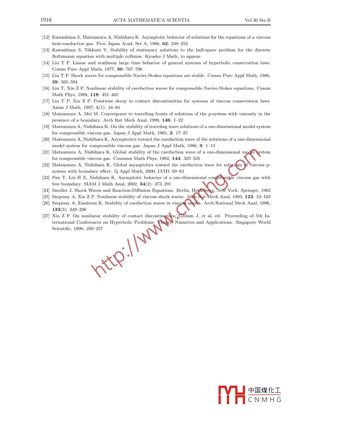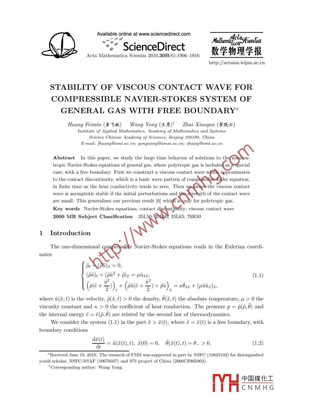 Availableonlineatwww.sciencedirect.comMalena cla● ScienceDirectActa Mathematica Scientia. 2010, 30B (6): 1906-1916數(shù)學(xué)物理學(xué)報(bào)http://actams.wipm.ac.cnSTABILITY OF VISCOUS CONTACT WAVE FORCOMPRESSIBLE NAVIER-STOKES SYSTEM OFGENERAL GAS WITH FREE BOUNDARYHuang Feimin(黃飛敏) Wang Yong(王勇) f Zhai xiaoyun(翟曉云)Institute of Applied MatheAcademy of Mathematics and SystemsScience Chinese Academy of Sciences, Beijing 100190, ChinaE-mail: huang @amt. accn; yongwang@amss. accn; hairy @amt. accnAbstract In this paper, we study the large time behavior of solutions to the nonisen-tropic Navier-Stokes equations of general gas, where polytropic gas is included as a specialcase, with a free boundary. First we construct a viscous contact wave which approximatesto the contact discontinuity, which is a basic wave pattern of compressible Euler equationin finite time as the heat conductivity tends to zero. Then we prove the viscous contactwave is asymptotic stable if the initial perturbations and the strength of the contact waveare small. This generalizes our previous result 6 which is only for polytropic gasKey words Navier-Stokes equations; contact discontinuity; viscous contact wave2000 MR Subject Classification 35L50; 3560; 35L65: 76R501 IntroductionThe one-dimensional compressible Navier-Stokes equations reads in the Eulerian coordp+(m)正=0,(pu)t +(pu+pa=uuit,(a+"),+(G+2)+0)2=Ab+(n)where i(, t)is the velocity, p(i, t)>0 the density, e(i, t)the absolute temperature, u>0 theviscosity constant and k>0 the coefficient of heat conduction. The pressure p=p(p, 0)andthe internal energy e=e(p, 0) are related by the second law of thermodynamicsider th(t)is a free boundathboundary conditionsdi(t)u((t),t),元(0)=0,(x(t),t)=b->0(1.2)Received June 10, 2010. The research of FMH was supported in part by NSFC(10825102)for distinguishedyouth scholar, NSFC-NSAF (10676037) and 973 project of China(2006CB805902中國(guó)煤化工CNMHGNo 6F.M. Huang et al: STABILITY OF VISCOUS CONTACT WAVE1907a(p-1u)|(1.3)which means the gas is attached at the free boundary i=i(t)to the atmosphere with pressurep(see [23)and the initial data(F,0,0)(G,0)=(0,0,60)(),lim(o,o,o)(x)=(p+,0,0+),(1.4)where p+, 0+ are positive constants and 80(0)=0. Here we assumeD-=p+=p(P+,+)Since one dimension Lagrangian coordinate is convenient to study, we transform the Eu-lerian coordinates(i, t)to the Lagrangian coordinates(a, t)byP(y, t)dy, t=t,and our free boundary value problem(1. 1)-(1.5)is changed intox>0,t>ut+p(u, 0)x=pr>0,t>0e(0, 0)(p(v,0))>0,t>0(v,u,6)(x,0)=(v0,u0,60)(x)→(v+,0,0+)asx→+∞whe(x,)=(G,1),0(x,)=0(,1)>0,.+=+andt=0(,1)=m>0 denotesthe specific volume. The pressure p, the internal energy e and the entropy s are the functionsof v and 0. Since there are only two independent thermodynamic variables, p and e are alsoregarded as the functions of v and s. We denoteP=p(v,0)=p(t,s),e=e(v,6)=e(t,s)We assume thatD<0,e0>0,p>0,(1.8)p(u, s) is a convex function of (v, s)(1.9)The study of fuid motion has a very long history and the pioneering work on wave phe-nomena dates back to Riemann in 1860s on gas dynamic. It is well known that for systems ofhyperbolic conservation laws of the formUt+ F(Ux=0,(1.10)there are there basic wave patterns in one-dimensional space. For compressible Euletions, these basic wave pattern are two nonlinear waves, shock wave and rarefaction wave, and中國(guó)煤化工CNMHG1908ACTA MATHEMATICA SCIENTIAVol30 Ser. Ba linearly degenerate wave, contact discontinuity. Since(1.10)is an idealization when the dis-sipative effects are neglected, thus it is significant to study the large time asymptotic behaviorof solutions to the corresponding viscous systems in the form ofUt+F(U)x=(B(U)Ur)x(1.11)toward the viscous versions of the three basic wavesSince A Mutsmura and K Nishihara 19 in 1985 proved the stability of viscous shock wavefor isentropic Navier-Stokes system. There have been a lot of works on the asymptotic behaof the solutions for the system(1. 1). We refer to 11, 15, 18, 19, 25 for viscous shock wave, 16-22, 26 for rarefaction wave and [6-10, 27 for viscous contact wave and references theAlthough considerable progress have been obtained, however most of these results are forthe polytropic gas. In particular, all results concerning viscous contact wave are only for thepolytropic gas. Thus a natural question arises: can we show similar stability of viscous contactwave for general gas not only for polytropic gas. In this paper, we give a positive answer tothis question for a free boundary problem, see Theorem 2. 2 below for detailsThe rest of the paper will be arranged as follows. In the next section, we will the viscouscontact wave and state the main result. In Section 3, we proved the main theorem by theelementary energ y estimates2 Viscous contact Wave and main theoremFirst we consider the following Riemann problemat+p(u, 0)x=0p(v,0))0)(x,0)=(v-,0,6-),ifx<0,(v,u,0)(x,0)=(v+,0.,0+),ifm>0where v+ and 0+ are given positive constants. It is known that the Riemann problem(2.1)admits a contact discontinuity(V,U,)(x,t)=(v-,0,6-),x<0(v+,0,O+)provided thatp(U-,6-)=p+=p(+,b+Motivated by [6 and(2. 2)-(2. 3), we begin to construct a viscous contact wave for NavierStokes system. Since in(2. 3) the pressure p is constant, we conjecturp(V, e)=pNote that Pu< 0. If 0 +-0- is small, then the implicit function theorem yields that therexists a C function f(8) such thaf(-),t+=f(0+),中國(guó)煤化工CNMHGNo 6F.M. Huang et al: STABILITY OF VISCOUS CONTACT WAVE1909in a small neighborhood N+ of 8+. From(2. 4) and(2.5), we havee)where pe(e)=pe(f(e), 0) and pu(e)=po(f(e), e). It is noted that the third equation of(1.7) can be reducedWe further conjecture that(V, U, e)is governed by the following equationsVt-Ux=0,eo(6+p(=/ne(0,t)=0-,e(+∞,t)=6+,where ee(e)=ee(f(e),e)We compute from(2.6) and(2.8)9()f(ee(0,t)=0-,(+∞0,t)wheeo(e、ep2By the same method as in [1],(2.9)admits a unique self similarity solu