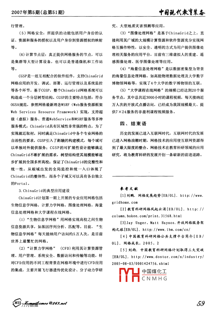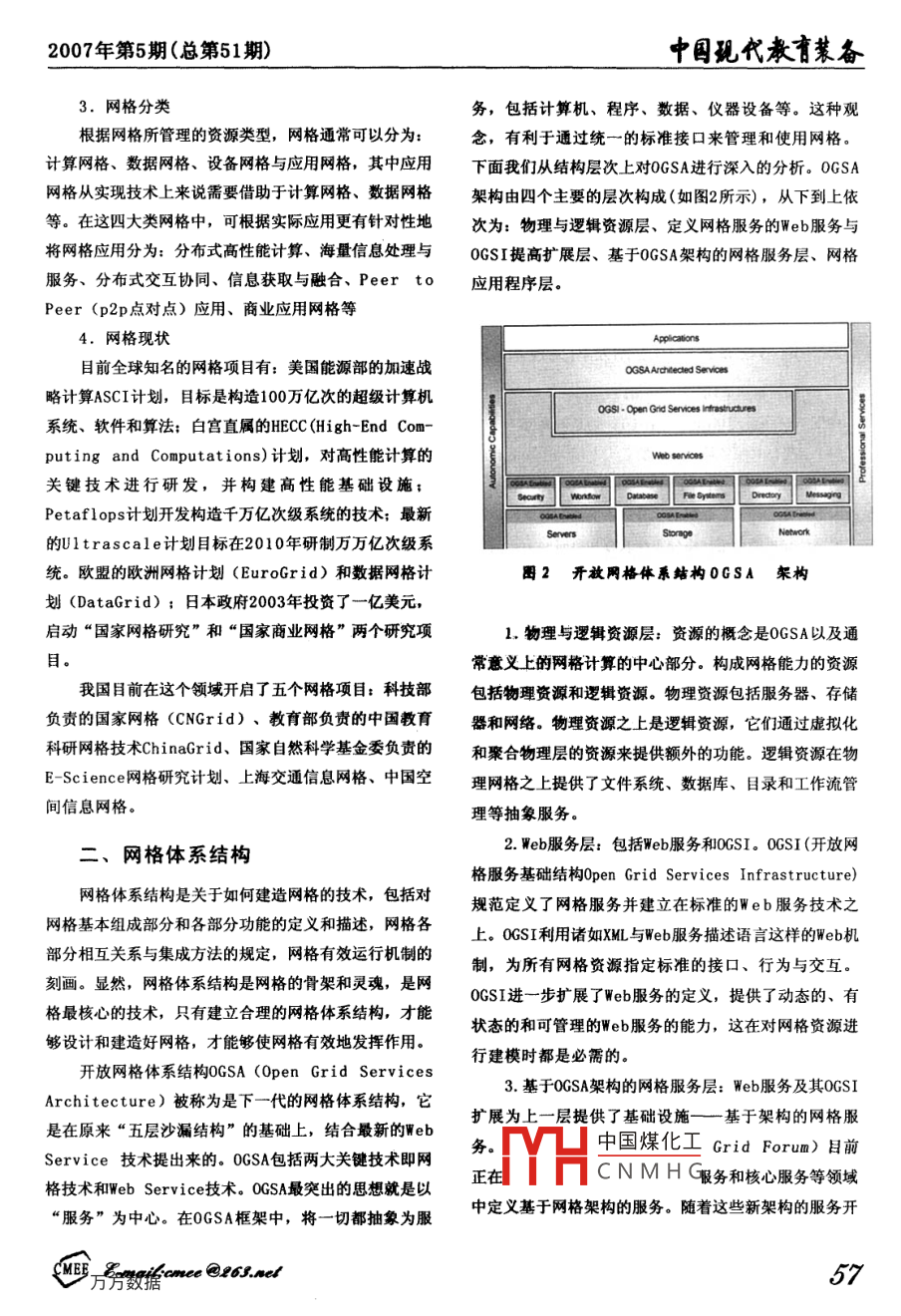 中國璣代彖有裝備2007年第5期(總第51期)網(wǎng)格技術(shù)的教育應(yīng)用王琳刁永鋒西華師范大學(xué)四川南充637002)摘要:網(wǎng)格是因特網(wǎng)應(yīng)用的新發(fā)展,是繼因特網(wǎng)之后的第三次互聯(lián)網(wǎng)浪潮,是“下一代因特網(wǎng)”。本文概述了網(wǎng)格技術(shù)的有關(guān)內(nèi)容,介紹了開放網(wǎng)格體系結(jié)構(gòu)0GSA,論述了我國教育科研網(wǎng)格 Chinagrid及中國教育科研網(wǎng)格公共支撐平臺(tái)CGSP。關(guān)健詞:網(wǎng)格0 GSa ChinaGrid CGSP互聯(lián)網(wǎng)經(jīng)歷了三個(gè)大的時(shí)期,第一個(gè)時(shí)期為源,正如電力網(wǎng)為千家萬戶供電一樣,用戶不必關(guān)心使Internet時(shí)期,第二個(gè)時(shí)期為Web時(shí)期,第三個(gè),被稱的電力來源于何處(三峽水庫還是大亞灣核電站),或?yàn)橄乱淮?Internet-Grid,網(wǎng)格時(shí)期。這三個(gè)主以何種方式產(chǎn)生(水力發(fā)電、火力發(fā)電或核能發(fā)電),而流時(shí)期的演變及區(qū)別如圖1所示。只需接通電源即可獲得源源不斷的電力供應(yīng)。目前網(wǎng)格權(quán)威的定義是2001年堪稱世界網(wǎng)格之父[1965年到現(xiàn)在1980年到現(xiàn)在1993年到現(xiàn)在Ian Foster對(duì)網(wǎng)格的定義:動(dòng)態(tài)多機(jī)構(gòu)虛擬組織中的Internet計(jì)算機(jī)的連通|網(wǎng)頁的連通資源的全面連通和共享資源共享和協(xié)同問題的解決。網(wǎng)格的全部核心就是分布Grid:∥2式計(jì)算與資源管理,網(wǎng)格的實(shí)質(zhì)就是共享與協(xié)作,共享是基礎(chǔ),協(xié)作是結(jié)果。沒有開放資源(包括硬件和軟圖1互連網(wǎng)主流的演變件),就不可能有共享,協(xié)作也就成了泡影。如果說傳統(tǒng)互聯(lián)網(wǎng)實(shí)現(xiàn)了計(jì)算機(jī)硬件的連通,萬維2.網(wǎng)格特征網(wǎng)實(shí)現(xiàn)了全球網(wǎng)頁的連通,網(wǎng)格技術(shù)則是要利用互聯(lián)網(wǎng)簡(jiǎn)單地講,網(wǎng)格是把整個(gè)因特網(wǎng)整合成一臺(tái)巨大的把分散在不同地理位置的計(jì)算機(jī)、硬件設(shè)備、軟件、數(shù)超級(jí)計(jì)算機(jī),實(shí)現(xiàn)計(jì)算資源、存儲(chǔ)資源、數(shù)據(jù)資源、信據(jù)等資源組織成一臺(tái)“虛擬的超級(jí)計(jì)算機(jī)”。息資源、軟件資源、通信資源、知識(shí)資源、專家資源等的全面共享和協(xié)同。當(dāng)然,網(wǎng)格并不一定非要這么大、網(wǎng)格概況我們也可以構(gòu)造地區(qū)性的網(wǎng)格、企事業(yè)內(nèi)部網(wǎng)格、局域網(wǎng)格來源網(wǎng)網(wǎng)格,甚至家庭網(wǎng)格和個(gè)人網(wǎng)格。網(wǎng)格的根本特征不網(wǎng)格(Grid)概念產(chǎn)生于上世紀(jì)90年代中期,是是它的規(guī)模,而是資源共享,消除資源孤島。網(wǎng)格的技從電力網(wǎng)( Power grid)概念借鑒過來的,網(wǎng)格把分術(shù)特征包括:布在各地的計(jì)算機(jī)連接起來,讓不同用戶分享網(wǎng)上資◆資源共享、協(xié)同工作M凵中國煤化工控制、非平凡服務(wù)質(zhì)收稿日期:2006-11-01CNMHG作者簡(jiǎn)介:王琳,研究生。刁永鋒,教授,碩士生導(dǎo)師◆動(dòng)態(tài)功能、開放系統(tǒng)。·四川省科技廳重點(diǎn)科研項(xiàng)目資助(05JY029-093)562maitemee @net2007年第5期(總第51期)中目代盲萊備3.網(wǎng)格分類務(wù),包括計(jì)算機(jī)、程序、數(shù)據(jù)、儀器設(shè)備等。這種觀根據(jù)網(wǎng)格所管理的資源類型,網(wǎng)格通??梢苑譃?念,有利于通過統(tǒng)一的標(biāo)準(zhǔn)接口來管理和使用網(wǎng)格。計(jì)算網(wǎng)格、數(shù)據(jù)網(wǎng)格、設(shè)備網(wǎng)格與應(yīng)用網(wǎng)格,其中應(yīng)用下面我們從結(jié)構(gòu)層次上對(duì)OGSA進(jìn)行深入的分析。OGSA網(wǎng)格從實(shí)現(xiàn)技術(shù)上來說需要借助于計(jì)算網(wǎng)格、數(shù)據(jù)網(wǎng)格架構(gòu)由四個(gè)主要的層次構(gòu)成(如圖2所示),從下到上依等。在這四大類網(wǎng)格中,可根據(jù)實(shí)際應(yīng)用更有針對(duì)性地次為:物理與邏輯資源層、定義網(wǎng)格服務(wù)的Web服務(wù)與將網(wǎng)格應(yīng)用分為:分布式高性能計(jì)算、海量信息處理與oGs提高擴(kuò)展層、基于0GSA架構(gòu)的網(wǎng)格服務(wù)層、網(wǎng)格服務(wù)、分布式交互協(xié)同、信息獲取與融合、 Peer to應(yīng)用程序?qū)?。Peer(p2p點(diǎn)對(duì)點(diǎn))應(yīng)用、商業(yè)應(yīng)用網(wǎng)格等網(wǎng)格現(xiàn)狀目前全球知名的網(wǎng)格項(xiàng)目有:美國能源部的加速戰(zhàn)OGSAAchdeded Servces略計(jì)算ASCI計(jì)劃,目標(biāo)是構(gòu)造100萬億次的超級(jí)計(jì)算機(jī)OGSI Open Gnd Servces ntrastrucres系統(tǒng)、軟件和算法:白宮直屬的HECC(High- End Com-puting and computations)計(jì)劃,對(duì)高性能計(jì)算的Web sorces關(guān)鍵技術(shù)進(jìn)行研發(fā),并構(gòu)建高性能基礎(chǔ)設(shè)施;Petaflops計(jì)劃開發(fā)構(gòu)造千萬億次級(jí)系統(tǒng)的技術(shù);最新的 UItrascale計(jì)劃目標(biāo)在2010年研制萬萬億次級(jí)系統(tǒng)。歐盟的歐洲網(wǎng)格計(jì)劃( Eurogrid)和數(shù)據(jù)網(wǎng)格計(jì)圖2開放網(wǎng)格體系站構(gòu)0GSA架構(gòu)劃( DataGrid);日本政府2003年投資了一億美元,啟動(dòng)“國家網(wǎng)格研究”和“國家商