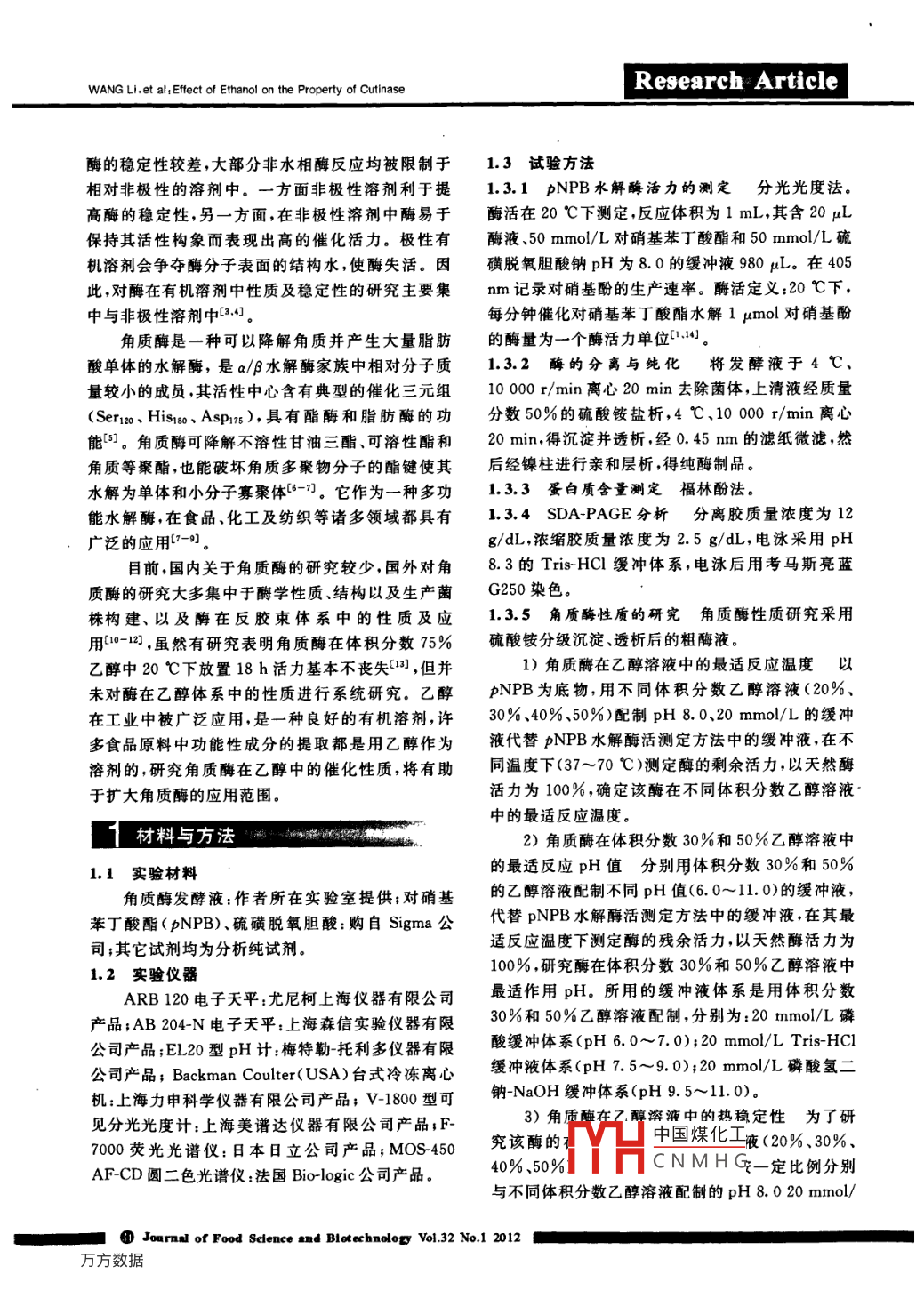 研究論文乙醇對(duì)角質(zhì)酶性質(zhì)的影響王莉,王淼k」,2(1.江南大學(xué)食品學(xué)院,江蘇無(wú)錫214122:2,食品科學(xué)與技術(shù)國(guó)家重點(diǎn)實(shí)驗(yàn)室,江南大學(xué),江蘇無(wú)錫214122)摘要:研究了乙醇溶液對(duì)角質(zhì)酶性質(zhì)的影響,同時(shí)用圓二色光譜和熒光光譜法對(duì)經(jīng)過(guò)硫酸銨沉淀、鎳柱親和層析等方法獲得的電泳純角質(zhì)酶進(jìn)行了構(gòu)象研究。結(jié)果表明,在體積分?jǐn)?shù)40%30%和20%乙醇溶液中角質(zhì)酶催化反應(yīng)的最適溫度分別為50、55和65℃;在37℃下,酶在體積分?jǐn)?shù)20%~50%乙醇中具有較妤的穩(wěn)定性,體積分教30%和40%乙醇對(duì)角質(zhì)酶具有激活作用;角質(zhì)酶在體積分?jǐn)?shù)30%和50%乙醇中催化反應(yīng)的最適pH分別為9.5和9.0;在體積分?jǐn)?shù)30%乙醇溶液中角質(zhì)酶的pH穩(wěn)定范圍為6.5~10.5。角質(zhì)酶在50℃的乙醇溶液中的失活動(dòng)力學(xué)研究表明,角質(zhì)酶的失活屬于一級(jí)動(dòng)力學(xué)反應(yīng)(R2>0.98)。從角質(zhì)酶構(gòu)象的研究結(jié)果可以看出,在乙醇體系中角質(zhì)酶的二級(jí)結(jié)構(gòu)和三級(jí)結(jié)構(gòu)都發(fā)生了相應(yīng)的變化,關(guān)鍵詞:角質(zhì)酶;乙醇;酶學(xué)性質(zhì);構(gòu)象中圖分類(lèi)號(hào):Q814.9文獻(xiàn)標(biāo)識(shí)碼:A文章編號(hào):1673-1689(2012)01-033-07Effect of Ethanol on the property of CutinaseWANG Li, WANG Miao“l(fā)2(1. The School of Food Science and Technology, Jiangnan University, Wuxi 214122, China: 2. State Key Laboratory of FoodScience and Technology, Jiangnan University, Wuxi 214122. China)Abstract: In this manuscript, effect of ethanol solutions on the biochemical property and conformation of cutinase were studied. The results showed that the optimum temperatures of cuti-nase were 65C, 55 C and 50 C respectively in 20%(V/V), 30% and 40% ethanol solutions.In 20% and 50% ethanol solutions cutinase was stable at 37C. In 30% and 50% ethanol solu-tions the optimum ph of cutinase were 9. 5 and 9. 0 respectively. In 30% ethanol solution theph stability range of cutinase was 6.. 5. In 30% and 40% ethanol solutions activity ofcutinase at 37 C was enhanced. The inactivation kinetic of cutinase was researched in ethanolsolutions at 50C. The results showed that the inactivation kinetic of cutinase in ethanol solu-tions followed the first order reaction(R2>0. 98). And the secondary and the tertiary structureconformations greatly changed in ethanol solutiods.Key words: cutinase, ethanol, enzymatic property, conformation生物酶作為高效的生物催化劑,傳統(tǒng)意義上是的催化反應(yīng)已經(jīng)倍受關(guān)注,酶學(xué)領(lǐng)域也有了一個(gè)全在水溶液中進(jìn)行的,但是,目前對(duì)其在有機(jī)溶液中新的分支一非水酶學(xué)(21。通常認(rèn)為在極性溶劑中中國(guó)煤化工收稿日期:2011-03-23基金項(xiàng)目:國(guó)家自然科學(xué)基金項(xiàng)目(20776063);國(guó)家計(jì)劃863項(xiàng)目(2011AA100905)CNMHG通倌作者:王森(1962-),女,江蘇無(wú)錫人,工學(xué)博士,教授博士研究生導(dǎo)師,主要從事食品生物化學(xué)方面的研究Email:mwang@jiangnan.edu.cn食品與生物技術(shù)學(xué)報(bào)2012年第32第1期WANG LI, et al, Effect of Ethanol on the Property of CutinaseResearch article酶的穩(wěn)定性較差,大部分非水相酶反應(yīng)均被限制于13試驗(yàn)方法相對(duì)非極性的溶劑中。一方面非極性溶劑利于提1.3.1pNPB水解酶活力的測(cè)定分光光度法。高酶的穩(wěn)定性,另一方面,在非極性溶劑中酶易于酶活在20℃下測(cè)定,反應(yīng)體積為1mL,其含20μL保持其活性構(gòu)象而表現(xiàn)出高的催化活力。極性有酶液、50mmol/L對(duì)硝基苯丁酸酯和50mmol/L硫機(jī)溶劑會(huì)爭(zhēng)奪酶分子表面的結(jié)構(gòu)水,使酶失活。因磺脫氧膽酸鈉pH為80的緩沖液980μL。在405此,對(duì)酶在有機(jī)溶劑中性質(zhì)及穩(wěn)定性的研究主要集mm記錄對(duì)硝基酚的生產(chǎn)速率。酶活定義:20℃下,中與非極性溶劑中3,4。每分鐘催化對(duì)硝基苯丁酸酯水解1μmol對(duì)硝基酚角質(zhì)酶是一種可以降解角質(zhì)并產(chǎn)生大量脂肪的酶量為一個(gè)酶活力單位口1。酸單體的水解酶,是a/B水解酶家族中相對(duì)分子質(zhì)1.3.2酶的分離與純化將發(fā)酵液于4℃量較小的成員,其活性中心含有典型的催化三元組10000r/min離心20min去除菌體,上清液經(jīng)質(zhì)量Ser1o、His1、Aspn5),具有酯酶和脂肪酶的功分?jǐn)?shù)50%的硫酸銨鹽析,4℃、1000r/min離心能。角質(zhì)酶可降解不溶性甘油三酯、可溶性酯和20min,得沉淀并透析,經(jīng)0.45m的濾紙微濾,然角質(zhì)等聚酯,也能破壞角質(zhì)多聚物分子的酯鍵使其后經(jīng)鎳柱進(jìn)行親和層析得純酶制品。水解為單體和小分子寡聚體6-。它作為一種多功1.3.3蛋白質(zhì)含量測(cè)定福林酚法。能水解酶,在食品、化工及紡織等諸多領(lǐng)域都具有L3.4 SDA-PAGE分析分離膠質(zhì)量濃度為12廣泛的應(yīng)用g/dL,濃編膠質(zhì)量濃度為2.5g/dL,電泳采用pH目前,國(guó)內(nèi)關(guān)于角質(zhì)酶的研究較少,國(guó)外對(duì)角8.3的 Tris-HO1緩沖體系,電泳后用考馬斯亮藍(lán)質(zhì)酶的研究大多集中于酶學(xué)性質(zhì)結(jié)構(gòu)以及生產(chǎn)菌G250染色株構(gòu)建、以及酶在反膠束體系中的性質(zhì)及應(yīng)1.3.5角質(zhì)酶性質(zhì)的研究角質(zhì)酶性質(zhì)研究