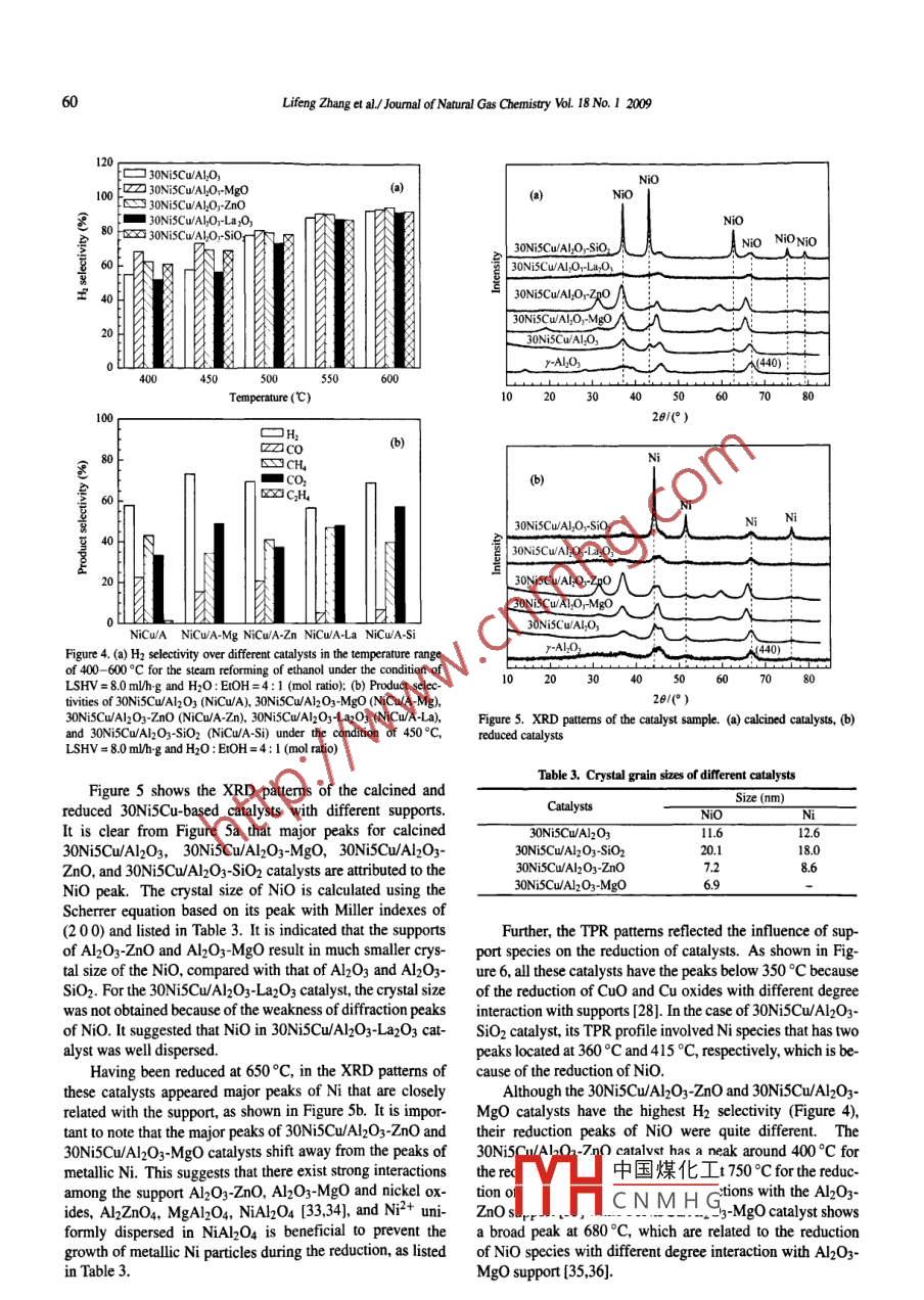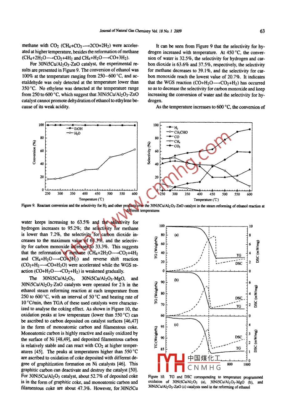 Availableonlineatwww.sciencedirect.comScience DirectNATURAL GASCHEMISTRYELSEVIERJoumal of Natural Gas Chemistry 18(2009)55:www.elsevier.com/locate/jngEthanol steam reforming over Ni-Cu/A12O3-MyO2M=Si, La, Mg,and zn) catalystsLifeng Zhang, Jie Liu, Wei Li, Cuili Guo, Jinli ZhangSchool of Chemical Engineering and Technology Tianjin University Tianjin 300072, ChinaManuscript received September 17, 2008; revised December 11, 2008AbstractNi-based catalysts doped with copper additives were studied on their role in ethanol steam reforming reaction. The effects of Cu content,upport species involving Al2O3-SiO2, Al2O3-MgO, Al2O3-ZnO, and Al2O3-La2O3, on the catalytic performance were studied. Characteriza-ons by TPR, XRD, NH3-TPD, XPS, and TGA indicated that catalysts 30Ni5Cw/Al2O3-MgO and 30NiSCwAl2O3-Zno have much higher Hselectivity than 30Ni5Cu/Al2O3-SiOz, as well as good coke resistance. H] selectivity for 30NiSCwAlO3- MgO catalyst was 73. 3%at 450Cand increased to 94.0% at 600C, whereas for 30Ni5Cu/Al2O3-Zno catalyst, the H2 selectivity was 63.6% at 450C and 95.2% at 600C.These AlO3-Mg0 and Al2O3-ZnO supported Ni-Cu bimetallic catalysts may have important applications in the production of hydrogen byethanol steam reforming reactionsKey words: ethanol steam reforming; nickel-copper- based catalyst; Al2O3-SiOz support; Al2O3-MgO support; Al2O3-ZnO support; Al2 O3-a203 support1. Introductioninto CO2 through the water-gas shift(wGS)reaction [4]Along with the increasing demand for carbon-neutralTo improve the production of hydrogen, transition met-and zero-emission alternative fuels, considerable attention haals involving Ni [51, Co [6,7], PL, Pd, and Rh [1, 8-10] havebeen paid to transform the biomass-derived compounds into been reported to show good activity and selectivity for ethanolhydrogen-rich gas. Among such compounds, bioethanol ob. steam reforming reactions. Especially, nickel is widely usedtained by biomass fermentation is of particular interest be. as the catalytic component for hydrogenation and dehydro-cause of the increasing availability of raw material, ease of genation reactions because of its high activity to break C-chandling in the liquid state, high hydrogen content, and lotbonds and the relatively low cost. However, there exists se-toxicity [1.2]. Hydrogen can be produced by following the vere catalyst deactivation by sintering or carbon depositionoverall steam reforming reaction of ethanol [3][11-13]over Ni-based catalyst. The secondary metal speciesis added into Ni-based catalysts so as to promote the cokingCH3CH20H+3H20-6H2+2C02 AH98=+347. 4 kJ/mol resistance. For instances, Vizcaino reported that the additionof Cu into Sio -supported Ni-based catalysts could reduceThe thermodynamic favorable ethanol steam reforming CO generation and improve coke resistance in the steam re-reaction includes several catalytic steps as follows: (i)the de- forming reaction of ethanol [14]. Marino et al. [15-18re-hydrogenation or dehydration reaction of ethanol; (ii)the de- ported that Cu/Ni/K/y-Al2O3 catalyst showed acceptable ac-hydrogenation reaction produces acetaldehyde as the interme- tivity, stability, and selectivity for hydrogen at 300C in thediate product that can be transferred to CO and CHa through steam reforming reaction of bioethanol. It is considered thatcarbon-carbon(C-C)bond breaking, and the dehydration re- Cu has limited steam reforming activity but good activity inaction produces ethylene that can be easily transformed into dehydrogenation [19, 20] and WGS reactioncarbon deposition; and (ii)methane can generate hydrogenAmong the oxide supports, alumina-based supports areand carbon monoxide by steam reforming reaction while the often used in reforming catalysts because of their mechanicalgenerated carbon monoxide can be subsequently transformed and中國煤化工 conditions. WhereasCorresponding author. Tel: +86-22-27890643; Fax: +86-22-27890643: E-mail: zhanundation items: 973 Program(2006CB202500), the National Natural ScienceCNMHntury Excellent Talents inpyright 02009, Dalian Institute of Chemical Physics, Chinese Academy of Sciences, All nights reserveddoi:l0.0l6S1003-99Lifeng Zhang et al/ Joumal of Natural Gas Chemistry Vol 18 No. I 2009over the support of Al2O3, catalyst deactivationoccurs prepared by precipitation-impregnation method using a com-by carbon deposition through the ethylene intergener- mercial ?-Al2O3 powder(SBET=177 m/g, Tianjin R&D Inated via the dehydration reactions of ethanolhe basic stitute of Chemical Industry, China). In all experiments, theadditives or promoters, which are beneficial to water adsorp- weight ratio of M, O2 /Al2O was fixed at 0.25 in the mixedtion and -OH surface mobility, have been extensively stud- supports. A stoichiometric amount of 0.1 M La(NO3)3so-led to improve the coke resistance of Al2O3-supported cata- lution, 0. 1 M Mg(NO3) solution, or 0.1 M Zn(NO3)solulysts. For example, alkali and alkali earth metal oxides, such tion was added to 0. 1 M H2N-CO-NH2 solution by continuas Mgo [21, 22] and solid solution(MgAl204)[23], were re- ously stirring at 100C, respectively, together with introducported to prevent the coke formation on the Ni-based cata- ing y-Al O3 powder at the same time. The obtained solutionlysts. It was reported that MgAl2O4 solid solution could re- was filtered after stirring for 6 h. The filtered solid was thenduce the Ni particle size so as to suppress the coke formation dried at 120C overnight and calcined in air at 650C for 6h[24]. Zno [25] and lanthanide oxides [5] were reported to The mixed supports were ground and the powder sieved topromote the dehydrogenation reaction to acetaldehyde. In ad- 0. 2-0. 3 mm size was used as the catalyst support. they weredition, the support of silica-stabilized alumina was reported designated as Al2O3-M, Ox, where M referred to the elementto improve the activity performance of palladium-supported (Mg, Zn, and La)added into y-Al2O3 carriercatalyst for the combustion of