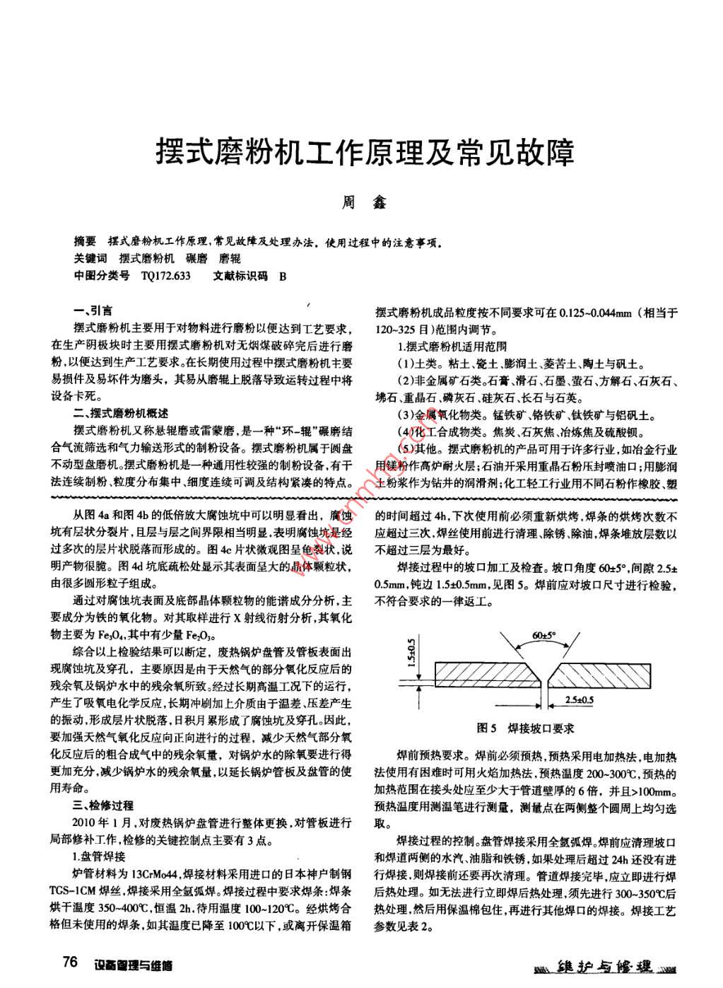 氣化廢熱爐管失效分析及檢修李仰泉吳健摘要分析合成氨裝置謝爾氣化廢熱鍋爐管板及盤(pán)管外表面出現(xiàn)的點(diǎn)狀腐蝕坑及穿孔原因,發(fā)現(xiàn)材料為13CrMo44的盤(pán)管外表面有點(diǎn)狀腐蝕坑及穿孔的原因?qū)儆谖蹼娀瘜W(xué)腐蝕,給出相應(yīng)解決措施和廢熱鍋爐更換盤(pán)管的檢修過(guò)程。關(guān)鍵詞廢熱鍋爐盤(pán)管失效分析檢修中圖分類(lèi)號(hào)U664.58 文獻(xiàn)標(biāo)識(shí)碼一、簡(jiǎn)介.表1材料化學(xué)成分分析結(jié)果(w,%)化肥廠合成氨裝置謝爾氣化廢熱鍋爐CGr系內(nèi)盤(pán)管式鍋爐,分別由6根盤(pán)管螟旋纏繞13C-Mo44 標(biāo)準(zhǔn)t 0.1-0.18 ?0.4-1 0.15-0.35 0.7-1.1 0.4-0.6 1-2 |≤0.3 |≤0.3成內(nèi)外四層,最外層直徑1550mm ,最內(nèi)層直分析數(shù)據(jù)0.130.520.210.810.45.1 | 0.11| 0.02徑600mm,原設(shè)計(jì)將每根盤(pán)管分4次變徑。管板及盤(pán)管材料為13CrMo44(德系材料牌號(hào)),其撓性多層螺旋2.材料金相分析盤(pán)管既增大了換熱面積,同時(shí)又可利用撓性變形來(lái)吸收部分熱從腐蝕坑處沿管子膨脹差。剖面截取式樣進(jìn)行金相以甲烷為主要成分的天然氣、純氧和過(guò)熱蒸汽在氣化爐中檢查,見(jiàn)圖3。燃燒,進(jìn)行部分氧化反應(yīng),其天然氣部分氧化反應(yīng)方程式為:13CrMo44材料正常2CH+Oz 2C0+4H(此反應(yīng)為可逆反應(yīng))。甲烷和蒸汽之間的蒸金相組織應(yīng)為鐵素體+片汽轉(zhuǎn)化反應(yīng)為:CH+H20=C0+3H2(此反應(yīng)為可逆反應(yīng))。狀的珠光體,但是從圖3離開(kāi)氣化爐的粗合成氣溫度約1300-1500C,在廢熱鍋爐中看出,外表面、內(nèi)表面中將其降至350C以下,同時(shí)副產(chǎn)10+0.5MPa的飽和蒸汽。2010及壁厚中部的金相組織圖3材料金相照片200X年1月氣化廢鍋盤(pán)管因外表面出現(xiàn)點(diǎn)狀腐蝕坑和穿孔而失效,基本相同,均為鐵素體+見(jiàn)圖1和圖2。球化的珠光體,珠光體的片狀已不太明顯,屬于中度球化。這是二、失效原因分析材料在長(zhǎng)期高溫工況下運(yùn)行的結(jié)果,珠光體出現(xiàn)球化是正?,F(xiàn)根據(jù)腐蝕坑的宏觀形貌可以確認(rèn),腐蝕坑起3.腐蝕坑形貌微觀分析和表面能譜成分分析源于外表面。管板外表面為了進(jìn)一步研究腐蝕坑及穿孔現(xiàn)象形成的原因,對(duì)其在掃描主要與天然氣部分氧化電鏡下進(jìn)行腐蝕坑形貌的微觀分析和表面能譜成分分析,見(jiàn)圖4。反應(yīng)后的粗合成氣接觸,盤(pán)管外表面主要與鍋爐水接觸,因此失效原因可能與介質(zhì)有關(guān),也可能是由于超溫導(dǎo)致外表面氧圖1盤(pán)管表面點(diǎn)狀腐蝕坑化或局部氣化。因此,主要進(jìn)行材料化學(xué)成分分析;材料金相分析;腐蝕坑形貌微觀分析和表面能譜成分分析。1.材料化學(xué)成分分析材料的化學(xué)成分分析結(jié)果見(jiàn)表1。分析結(jié)果顯示,材料成分符合13CrMo44的標(biāo)準(zhǔn)。圖2管板表面長(zhǎng)期腐蝕沖刷成槽圖4雛護(hù)與修理設(shè)備智理與維德i 75擺式磨粉機(jī)工作原理及常見(jiàn)故障周鑫摘要擺式磨粉機(jī)工作原理, 常見(jiàn)故障及處理辦法。使用過(guò)程中的注意事項(xiàng)。關(guān)鍵詞擺式磨粉機(jī)碾磨磨輥中圖分類(lèi)號(hào)TQ172.633文獻(xiàn)標(biāo)識(shí)碼B- .引言擺式磨粉機(jī)成品粒度按不同要求可在0.125-0.044mm (相當(dāng)于擺式磨粉機(jī)主要用于對(duì)物料進(jìn)行磨粉以便達(dá)到工藝要求,120~325目)范圍內(nèi)調(diào)節(jié)。在生產(chǎn)陰極塊時(shí)主要用擺式磨粉機(jī)對(duì)無(wú)煙煤破碎完后進(jìn)行磨1.擺式磨粉機(jī)適用范圍粉,以便達(dá)到生產(chǎn)工藝要求。在長(zhǎng)期使用過(guò)程中擺式磨粉機(jī)主要(1)土類(lèi)。粘土、瓷土、膨潤(rùn)土菱苦土、陶土與礬土。易損件及易壞件為磨頭,其易從磨輥上脫落導(dǎo)致運(yùn)轉(zhuǎn)過(guò)程中將(2)非金屬礦石類(lèi)。石膏、滑石、石墨、螢石、方解石、石灰石、設(shè)備卡死。紼石、重晶石、磷灰石、硅灰石、長(zhǎng)石與石英。二、擺式磨粉機(jī)概述(3)金屬氧化物類(lèi)。錳鐵礦、鉻鐵礦、鈦鐵礦與鋁礬土。擺式磨粉機(jī)又稱(chēng)懸輥磨或雷蒙磨,是- -種“環(huán)-輥”碾磨結(jié)(4)化工合成物類(lèi)。焦炭石灰焦、冶煉焦及硫酸鋇。合氣流篩選和氣力輸送形式的制粉設(shè)備。擺式磨粉機(jī)屬于圓盤(pán)(5)其他。擺式磨粉機(jī)的產(chǎn)品可用于許多行業(yè),如冶金行業(yè)不動(dòng)型盤(pán)磨機(jī)。擺式磨粉機(jī)是- -種通用性較強(qiáng)的制粉設(shè)備,有干用鎂粉作高爐耐火層;石油開(kāi)采用重晶石粉樂(lè)封噴油口;用膨潤(rùn)法連續(xù)制粉、粒度分布集中、細(xì)度連續(xù)可調(diào)及結(jié)構(gòu)緊湊的特點(diǎn)。土粉漿作為鉆井的潤(rùn)滑劑;化工輕工行業(yè)用不同石粉作橡膠、塑從圖4a和圖4b的低倍放大腐蝕坑中可以明顯看出,廣蝕的時(shí)間超過(guò)4h,下次使用前必須重新烘烤.焊條的烘烤次數(shù)不坑有層狀分裂片,且層與層之間界限相當(dāng)明顯,表明腐蝕坑是經(jīng)應(yīng)超過(guò)三次,焊絲使用前進(jìn)行清理、除銹、除油,焊條堆放層數(shù)以過(guò)多次的層片狀脫落而形成的。圖4e片狀微觀圖呈龜裂狀,說(shuō)不超過(guò)三層為最好。明產(chǎn)物很脆。圖4d坑底疏松處