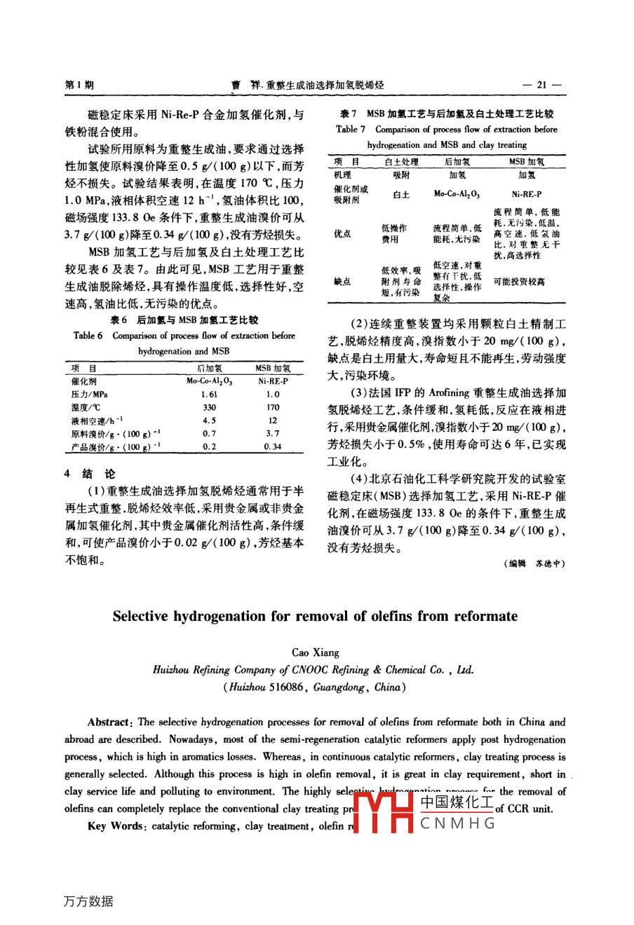 煉油技術(shù)與工程2010年1月PETROLEUM REFINERY ENGINEERING第40卷第1期重整生成油選擇加氫脫烯烴曹祥中海煉化惠州煉油分公司(廣東省惠州市516086)摘要:介紹了國內(nèi)外重整生成油脫烯烴工藝及催化劑。目前半再生重整通常采用后加氫工藝芳烴損失大連續(xù)重整一般釆用噘粒白土糖制工藝脫烯烴精度高白土用量大,壽命短,污染環(huán)境。采用高選擇性加氫脫烯烴技術(shù)處理連續(xù)重整生成油可取代傳統(tǒng)的白土精制工藝。關(guān)鍵詞:催化量整自土精制脫烯烴催化劑近十年來我國連續(xù)重整工藝發(fā)展迅速,已逐烴同時被加氫飽和,導(dǎo)致芳烴損失,影響經(jīng)濟(jì)效步取代窄餾分重整。連續(xù)重整技術(shù)一直由美國益。但這種流程投資及操作費用均較低,我國大UOP及法國IFP長期壟斷,其芳烴精制大都采用部分半再生式重整裝置均采用這一流程顆粒白土脫烯烴工藝,我國引進(jìn)的連續(xù)重整裝置1.1.2先抽提后加氫精制工藝流程也均采用該工藝,尚未見到采用選擇加氫工藝的先抽提后加氫精制工藝流程見圖2報道。重整生成油加氫反應(yīng)不僅使烯烴飽和,同非芳溶劑油時也使部分芳烴飽和,芳烴的存在影響烯烴的加整生成油餾分氫氫活性及選擇性,這也可能是UOP及IFP沒有采用這種工藝的原因。因此開發(fā)重整生成油加氫脫烯烴技術(shù),可以取代現(xiàn)有白土精制工藝,進(jìn)一步提田2先抽提后加氯流程高芳烴及溶劑油的產(chǎn)品質(zhì)量,減輕工人勞動強(qiáng)度,Fig. 2 Process flow of extraction before hydrogenation避免廢渣排放造成的環(huán)境污染。該流程是先將重整生成油進(jìn)脫戊烷塔后送入抽提塔抽提后的非芳抽余油再去后加氫反應(yīng)器1國內(nèi)重整生成油脫烯烴工藝路線這樣可以降低加氫反應(yīng)器的操作負(fù)荷,減少催化1.1加氫精制工藝劑用量,避免芳烴損失。1.1.1先加氫后抽提流程中國石化大慶石化分公司和錦州石化分公司在加氫精制流程中增設(shè)一個后加氫反應(yīng)器,是將抽提出的非芳抽余油先經(jīng)分餾切割出各種重整生成油及循環(huán)氫全部通過后加氫反應(yīng)器進(jìn)行溶劑油餾分后再去加氫精制,這樣加氫反應(yīng)器的加氫飽和反應(yīng)從而脫除重整生成油中的烯烴,然操作負(fù)荷更低。后抽提非芳抽余油,送分餾塔切割,生產(chǎn)出符合產(chǎn)1.2顆粒白土精制工藝品質(zhì)量標(biāo)準(zhǔn)的6號、90號及120號溶劑油,示意顆粒白土精制工藝主要用于寬餾分連續(xù)重整流程見圖1。裝置的C6~C芳烴精制。目前我國連續(xù)重整裝置芳烴精制均采用顆粒白土作為吸附劑,一次裝重整生成油氫非芳抽余油分[溶劑油填量約300~600t,反應(yīng)器龐大,由于重整生成油烯烴含量高,芳烴產(chǎn)品顏色較深,白土的使用壽命只有3~6個月,且不能再生,嚴(yán)重影響裝置的正圖1先加氯后抽提流程中國煤化工x001014該工藝操作負(fù)荷大,由于重整生成油的芳烴CNMHG及工藝管理工作多含量很高,在加氫反應(yīng)中,不可避免的會有少量芳年。聯(lián)系電話0752-36851772曹祥重整生成油選擇加氫脫烯烴19常操作和產(chǎn)品質(zhì)量,而且白土的頻繁更換產(chǎn)生大2重整生成油后加氫催化劑量固體廢物,增加了工人的勞動強(qiáng)度,處理成本2.1非貴金屬/Al2O3催化劑高,同時造成環(huán)境污染。另外,連續(xù)重整裝置所產(chǎn)國內(nèi)許多半再生式重整裝置大多采用后加氫非芳烯烴含量也很高,分離后生產(chǎn)的溶劑油溴價脫除重整生成油中的微量烯烴,所用催化劑為重較高,雖然經(jīng)后加氫精制,但處理高溴價原料時效整原料預(yù)加氫催化劑。國內(nèi)開發(fā)的這類催化劑見果仍不理想。表2白土精制工藝條件如下非貴金屬/Al2O3催化劑的操作條件通常為:溫度150~160℃,壓力1.0-1.5MPa,空速反應(yīng)溫度300~320℃,壓力1.5~2.2MPa,液體08-1.0h-,原料溴指數(shù)50~100mg/(100g),體積空速2~3h-,氫油體積比400-1000加氫出口溴指數(shù)<20mg/(100g)。產(chǎn)物溴價0.07-1.0g/(100g)。國內(nèi)主要顆粒白土指標(biāo)見表1。2.2貴金屬/Al2O3催化劑表1國內(nèi)主要顆粒白土指標(biāo)中國科學(xué)院山西煤炭化學(xué)研究所研制了2種Table 1 Indexes of domestic clay particles貴金屬/A2O3催化劑用于半再生重整裝置生成撫颙油后加氫,見表3,兩種催化劑比目前工業(yè)應(yīng)用的JH-OlNC-OI顆粒白土預(yù)加氫類催化劑的效率高得多,在較溫和的反應(yīng)水分,%≤10pH值條件下可使加氫生成油的溴價<0.02g/(100g)堆密度/g,a1014-09074-.9065-08而芳烴基本不飽和壓碎強(qiáng)度/N·?!?.0>0.51重整生成油采自長嶺煉油廠,溴價為1.7020-60g/(100g),進(jìn)料總芳烴質(zhì)量分?jǐn)?shù)42.49%,2種催比表面積/m2·g1化劑操作條件見表4。衰2國產(chǎn)預(yù)加氫催化劑種類Table 2 Domestic pre-hydrogenation catalysts堆密度/g·cm活性組分/開發(fā)單位0.83-0.85Mo-NV/Y-Al石油撫順石化Mo-Co/y- A2O,中國石油撫順石化分公司石油三廠d1.6x(6-8)Mo-Co-Ni/YAlO,中國石油撫順石化分公司石油三廠d1.8x6-8Mo-Ni/Y-Al中國石化長嶺分公司煉油42-3球0.7-0.8Mo-Si-NV/Y- Al, 0撫順石油化工研究院d2-3球0.7-0.8Mo-Co-NV/Y-A,O,撫順石油化工研究院當(dāng)量φ】.2三葉草型W-NVy-Al0,北京石油化工科學(xué)研究院表32種貴金屬/Al2O3催化劑的物化性質(zhì)表4催化劑的操作條件Table 3 Physicochemical properties of the two nobleTable 4 Operating conditions for catametal/AL, O