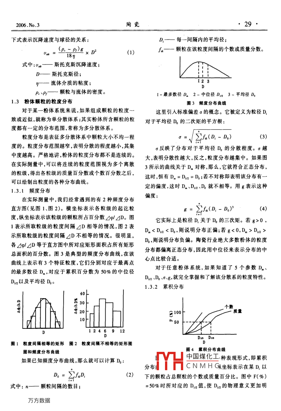28陶瓷2006.No,3水煤漿顆粒的測(cè)定方法賈玉寶(廣東博德精工建材有限公司三水528139)摘要介紹了粉體的基本物理性能和幾種描述粉體的方式,利用等沉降速度相當(dāng)徑推導(dǎo)出了水煤漿粉體顆粒的計(jì)算公式,并設(shè)計(jì)了一種用比重計(jì)測(cè)定水煤漿顆粒直徑的方法,便于指導(dǎo)我們對(duì)水煤漿顆粒的性能有更深入的了解,幫助我們解決水煤漿方面的實(shí)際問(wèn)題。關(guān)鍵詞粉體等沉降速度相當(dāng)徑粒度分布比重計(jì)測(cè)定方法The Determination of the Particle Size about the Particulate in the Coal Water SlurryJia Yubao( Guangdong BODE Fine Building Material CO, LTD, Sanshui, 528139)Abstract: This paper discussed the foundational physical properties of the powder, and some presenting modes. Making use of equivalentfauing-speed diameter derived the computing formulae, and designed a kind of the diametral measurement method with the gravimeter. Itin-depth understanding to us, and helped us to solve the practical problem in the coal water mixturewords: Powder; Equivalent fauing- speed diameter; Partical size distribution; Gravimeter; Measurement method所謂粉體,是表示物質(zhì)的一種狀態(tài),既不同于氣晶鑲嵌結(jié)構(gòu)出現(xiàn),即使以一顆單晶構(gòu)成,在不同程度上體、液體,也不完全同于固體,粉體是氣、液、固三相之也存在一些諸如表面層錯(cuò)等缺陷。在實(shí)際應(yīng)用的粉體外的第四相。粉體是由多個(gè)固體顆粒組成,所以它仍原料中,往往都是在一定程度上團(tuán)聚了的顆粒,即二次然具有固體的很多屬性,如物質(zhì)結(jié)構(gòu)、密度等。但它與顆粒,尤其是制作水煤漿的煤粉,由于一般比較微細(xì),固體最直接、最簡(jiǎn)單的區(qū)別在于:當(dāng)我們用手輕輕地觸表面活性比較大,更易發(fā)生團(tuán)聚。團(tuán)聚的原因:①分子及它時(shí),會(huì)表現(xiàn)出固體所不具備的流動(dòng)性和變形。粉間的范德華引力;②顆粒間的靜電引力;③吸附水分的體的粒徑大小影響著粉體的性質(zhì),如粉體的比表面積、毛細(xì)管力;④顆粒間的磁引力;⑤顆粒表面不平滑引起可壓縮性、流動(dòng)性,也影響著粉體的應(yīng)用范疇。土木、的機(jī)械糾纏力。我們認(rèn)為一次顆粒直接與物質(zhì)的本質(zhì)水利行業(yè)的粉體的粒徑一般在1cm以上,冶金、火藥、結(jié)構(gòu)相關(guān)聯(lián),二次顆粒是作為研究和應(yīng)用工作中的食品等行業(yè)的粉體粒徑為40m~1cm,納米材料的粒種對(duì)顆粒的物態(tài)描述指標(biāo)。徑則為幾納米到十幾納米,特種陶瓷的粉體粒徑為0.1.2粉體顆粒的粒度05~40gm,這里我們探討的粉體是建筑陶瓷工業(yè)中使由于粉體是具有粒度分布的大量固體顆粒的分散用的水煤漿,其粒徑為10~100gm的物系。相,因此不能用單一的顆粒大小來(lái)描述。構(gòu)成某種粉體的顆粒群,其粒徑的平均大小被定義為粉體的粒度。1水煤漿粉體的基本物理性能實(shí)際粉體的顆粒形狀有球狀、條狀、多邊形狀、片狀或各種形狀兼而有之的不規(guī)則體。表示顆粒群粒度的方1粉體的粒度及粒度分布法較多,有等體積球相當(dāng)徑、等面積球相當(dāng)徑、等沉降粉體顆粒是指在物質(zhì)的本質(zhì)結(jié)構(gòu)不發(fā)生改變的情速微下測(cè)徂的粒徑,這里主要介紹等況下,分散或細(xì)化而得到的固態(tài)基本顆粒?;绢w粒沉陣中國(guó)煤化工是指沒(méi)有堆積、絮聯(lián)等結(jié)構(gòu)的最小單元,即一次顆粒。NMH托克斯徑,斯托克斯假但一次顆粒由完整的單晶物質(zhì)構(gòu)成的情況還是比較少設(shè):當(dāng)速度達(dá)到極限時(shí),在無(wú)限大范圍的粘性流體中沉見(jiàn)的,很多外形規(guī)則的顆粒,常常以完整的單晶體的微降的球體顆粒的阻力,完全由流體的粘滯力所致。用2006.No.3陶瓷29下式表示沉降速度與球徑的關(guān)系:D—每一間隔內(nèi)的平均徑;o(P, -Pf)6x D2f—顆粒在該粒度間隔的個(gè)數(shù)或質(zhì)量分?jǐn)?shù)。式中:a斯托克斯沉降速度D—斯托克斯徑;n流體介質(zhì)的粘度;顆粒與流體的密度。最多數(shù)徑D。2-中位徑D1n3-平均徑D013粉體顆粒的粒度分布圖3頻度分布曲線(xiàn)對(duì)于某一粉體系統(tǒng)來(lái)說(shuō),如果組成顆粒的粒度這里引入標(biāo)準(zhǔn)偏差a的概念。它被定義為粒徑D致或近似就稱(chēng)為單分散體系;其實(shí)粉體所含顆粒的粒對(duì)于平均徑D1的二次矩的平方根:度都有一定的分布范圍,常稱(chēng)為多分散體系。粒度分布是表征多分散體系中顆粒大小不均一程y∑(D-D)(3)度的。粒度分布范圍越窄,表明分散的程度越小,其集σ反映了分布對(duì)于平均徑D的分散程度。a越中度越高。嚴(yán)格地講粉體的粒度分布都不是連續(xù)的。大表明分散性越大,反之粒度分布越集中。如果圖在實(shí)際測(cè)量中,可以將連續(xù)的粒度范圍視為多個(gè)離散3所示的曲線(xiàn)關(guān)于Dn對(duì)稱(chēng),那么,它就符合正態(tài)分布,的粒級(jí)得出各粒級(jí)的質(zhì)量百分?jǐn)?shù)或個(gè)數(shù)百分?jǐn)?shù)之后,這時(shí),恒有D=Dn=D;若不對(duì)稱(chēng)即表明該分布有可以繪制出粒度的各種分布曲線(xiàn)。定的偏度,這時(shí)Dn、Da、D就不相等。用g表示這種1.3.1頻度分布在實(shí)際測(cè)量中我們經(jīng)常遇到的有2種頻度分布偏度:直方圖(見(jiàn)圖1、圖2)。橫坐標(biāo)表示各