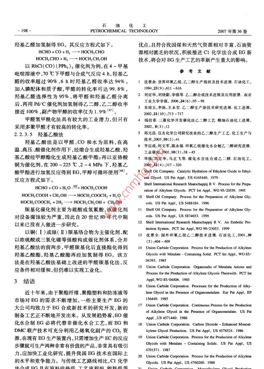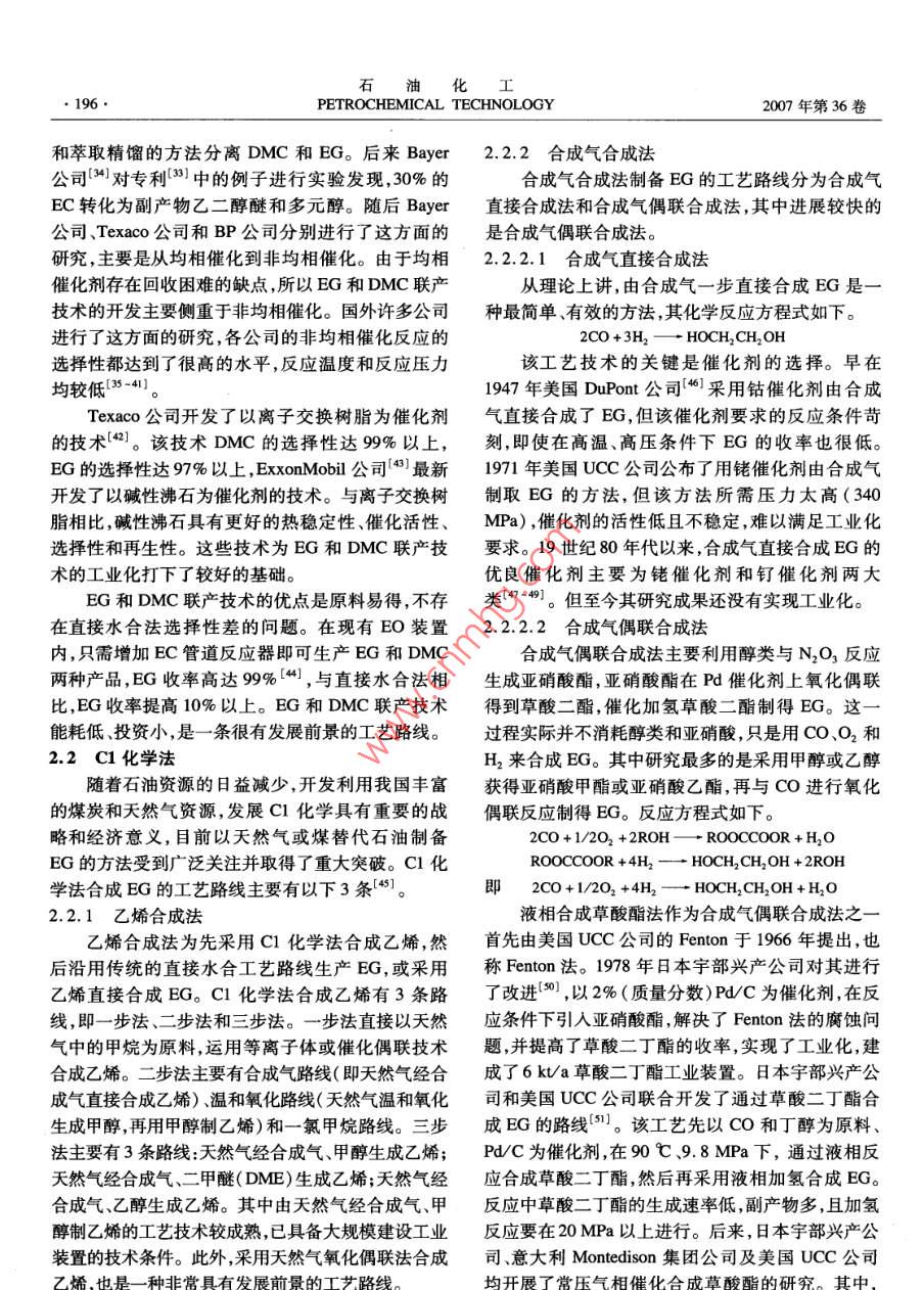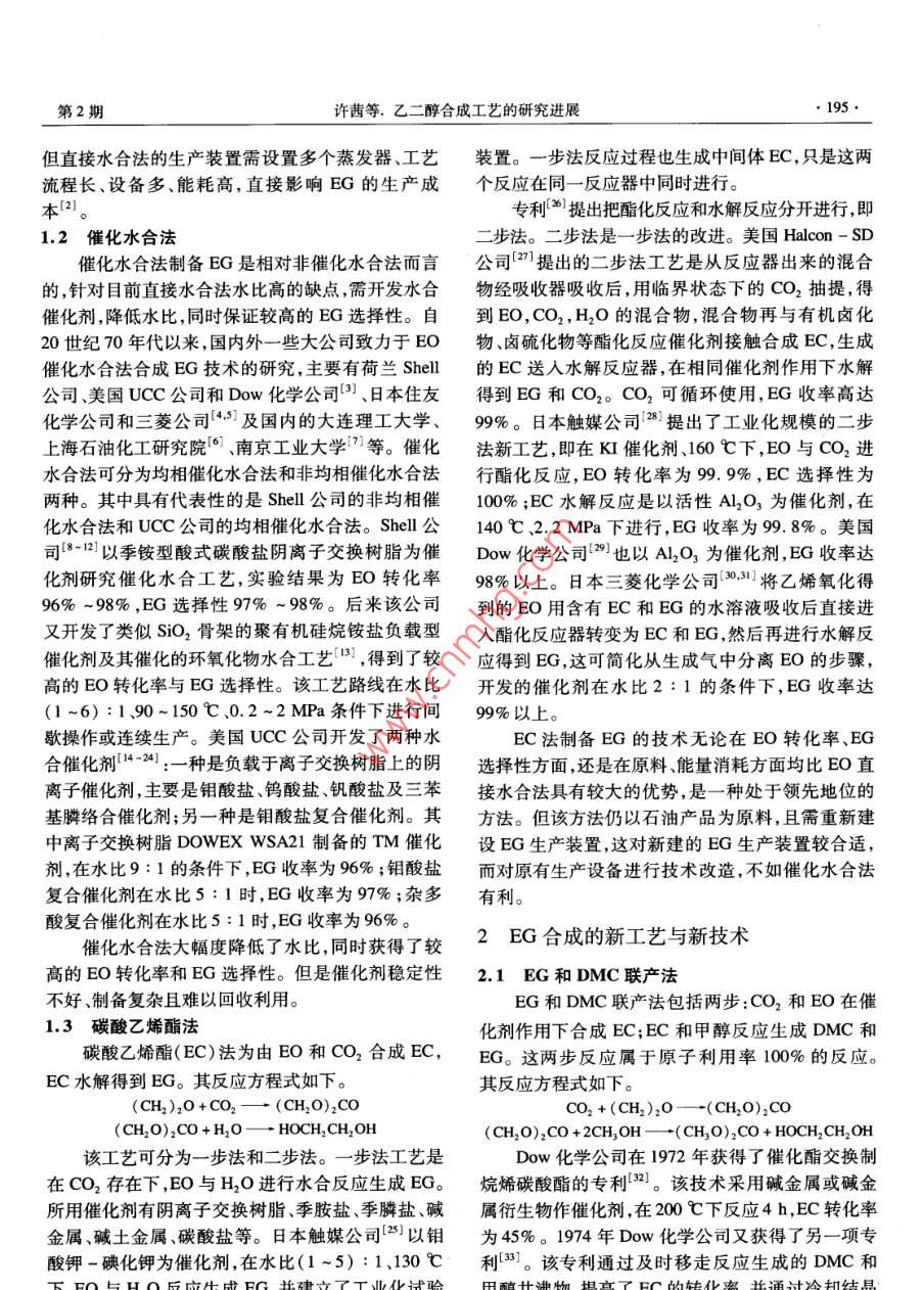 石油化工PETROCHEMICAL TECHNOLOGY2007年第36卷進展與述評乙二醇合成工藝的研究進展許茜,王保偉,許根慧(天津大學化工學院綠色合成與轉(zhuǎn)化教育部重點實驗室,天津300072)[摘要]對國內(nèi)外乙二醇合成的傳統(tǒng)工藝:直接水合法催化水合法和碳酸乙烯酯法進行了介紹;對乙二醇合成的新工藝,包括乙醇和碳酸二甲酯聯(lián)產(chǎn)法和C1化學法的工藝流程和發(fā)展前景進行了綜述,其中,C1化學法主要分為乙烯合成法合成氣合成法和甲醛、甲醇合成法。作為合成氣合成法之一的合成氣偶聯(lián)合成法,具有工藝要求不高、反應(yīng)條件溫和等優(yōu)點,是目前最有希望大規(guī)模工業(yè)化生產(chǎn)乙二醇的工藝路線[關(guān)鍵詞]乙二醇;環(huán)氧乙烷;催化水合;碳一化學[文章編號]1000-8144(2007)02-0194-06中圖分類號]TQ223.16[文獻標識碼]ATechnological Development of Ethylene Glycol ProductionXu Qian, Wang Baowei, Xu Genhui(Key Laboratory for Green Chemical Technology, School of Chemical Engineering and TechnologyTianjin University, Tianjin 300072, China)Abstract] The traditional technology for manufacturing ethylene glycol at home and abroad wasreviewed, including direct hydration and catalytic hydration of ethylene oxide. Development of thetechnology was also described as following co-production of dimethyl carbonate and ethylene glycoland Cl chemistry technology. The latter involved ethylene process, syngas process and indirectsynthesis by methanol and formaldehyde. Among these, indirect synthesis by oxalate, one of thesyngas processes, gains advantage over the others. The reaction conditions are relatively mild and greatprosperity in future will be expected. But based on the fact of currently high crude oil price, andcomparison of various synthetic processes, the relevant development in China should be decidedaccording to recent economical and technological conditionsKeywords] ethylene glycol; ethylene oxide; catalytic hydration; CI chemistry乙二醇(EG)又稱甘醇,是一種重要的有機化工接水合法,亦稱加壓水合法,該工藝是將水與環(huán)原料,它可以任意比例與水混合,沸點高、凝固點低。氧乙烷(EO)按摩爾比(簡稱水比)(20~22):1配成EG與對苯二甲酸反應(yīng)生成聚對苯二甲酸乙二醇混合水溶液,在管式反應(yīng)器中于130~180℃、1.0~酯,可作為聚酯纖維和聚酯塑料的原料,廣泛用于潤2.5MPa下反應(yīng)18-30min,EO全部轉(zhuǎn)化,生成質(zhì)量滑劑、增塑劑、油漆、膠黏劑、表面活性劑、炸藥等領(lǐng)分數(shù)約為10%的EG水溶液,經(jīng)多效蒸發(fā)器脫水提域,同時也可用來配制防凍液或直接用作有機溶劑。濃、減壓精餾分離得到EG及副產(chǎn)物二甘醇(DEG)、本文綜述了國內(nèi)外EG合成的傳統(tǒng)工藝以及三甘醇(TEG)等。反應(yīng)產(chǎn)物中EG,DEG,TEG的摩EG合成的新工藝和發(fā)展前景,包括EG和碳酸二甲爾比約為100:10:1,產(chǎn)品總收率為88%。增加水酯(DMC)聯(lián)產(chǎn)法C1化學法等。的用量可減少副產(chǎn)物含量,同時提高EO的轉(zhuǎn)化率。1EG合成的傳統(tǒng)工藝[收稿日期]2006-09-16;[修改稿日期]2006-101.1直接水合法[作者簡介]許茜(1983—),女,新疆維吾爾自治區(qū)哈密市人,碩士生,電郵xuqian@gmail.com。聯(lián)系人:王保偉,電話022-目前國內(nèi)外大型EG裝置的生產(chǎn)方法均采用直2740294,電郵 wangbw@ tiu.cd,cn第2期茜等.乙二醇合成工藝的研究進展但直接水合法的生產(chǎn)裝置需設(shè)置多個蒸發(fā)器、工藝裝置。一步法反應(yīng)過程也生成中間體EC,只是這兩流程長、設(shè)備多、能耗高,直接影響EG的生產(chǎn)成個反應(yīng)在同一反應(yīng)器中同時進行。專利提出把酯化反應(yīng)和水解反應(yīng)分開進行,即12催化水合法二步法。二步法是一步法的改進。美國 Halcon-SD催化水合法制備EG是相對非催化水合法而言公司2提出的二步法工藝是從反應(yīng)器出來的混合的,針對目前直接水合法水比高的缺點需開發(fā)水合物經(jīng)吸收器吸收后,用臨界狀態(tài)下的CO2抽提,得催化劑,降低水比,同時保證較高的EG選擇性。自到EO,CO2,H2O的混合物,混合物再與有機鹵化20世紀70年代以來,國內(nèi)外一些大公司致力于EO物、鹵硫化物等酯化反應(yīng)催化劑接觸合成EC,生成催化水合法合成EG技術(shù)的研究,主要有荷蘭 Shell的EC送入水解反應(yīng)器,在相同催化劑作用下水解公司、美國UCC公司和Dow化學公司3、日本住友得到EG和CO2。CO2可循環(huán)使用,EG收率高達化學公司和三菱公司43及國內(nèi)的大連理工大學、99%。日本觸媒公司21提出了工業(yè)化規(guī)模的二步上海石油化工研究院°、南京工業(yè)大學等。催化法新工藝,即在K催化劑、160℃下,EO與CO2進水合法可分為均相催化水合法和非均相催化水合法行酯化反應(yīng),EO轉(zhuǎn)化率為9.9%,EC選擇性為兩種。其中具有代表性的是Shel公司的非均相催100%;EC水解反應(yīng)是以活性Al2O3為催化劑,在化水合法和UCC公司的均相催化水合法。Shl公140℃、2,2MPa下進行,EG收率為99.8%。美國司-12以季銨型酸式碳酸鹽陰離子交換樹脂為催Dow化學公司)也以A1QO3為催化劑EG收率達化劑研究催化水合工藝,實驗結(jié)果為EO轉(zhuǎn)化率98%以上。日本三菱化學公司0,將乙烯氧化得96%-98%,EG選擇性97%-98%。后來該公司到的EO用含有EC和EG的水溶液吸收后直接進又開發(fā)了類似SiO2骨架的聚有機硅烷銨鹽負載型入酯化反應(yīng)器轉(zhuǎn)變?yōu)镋C和EG,然后再進行水解反催化劑及其催化的環(huán