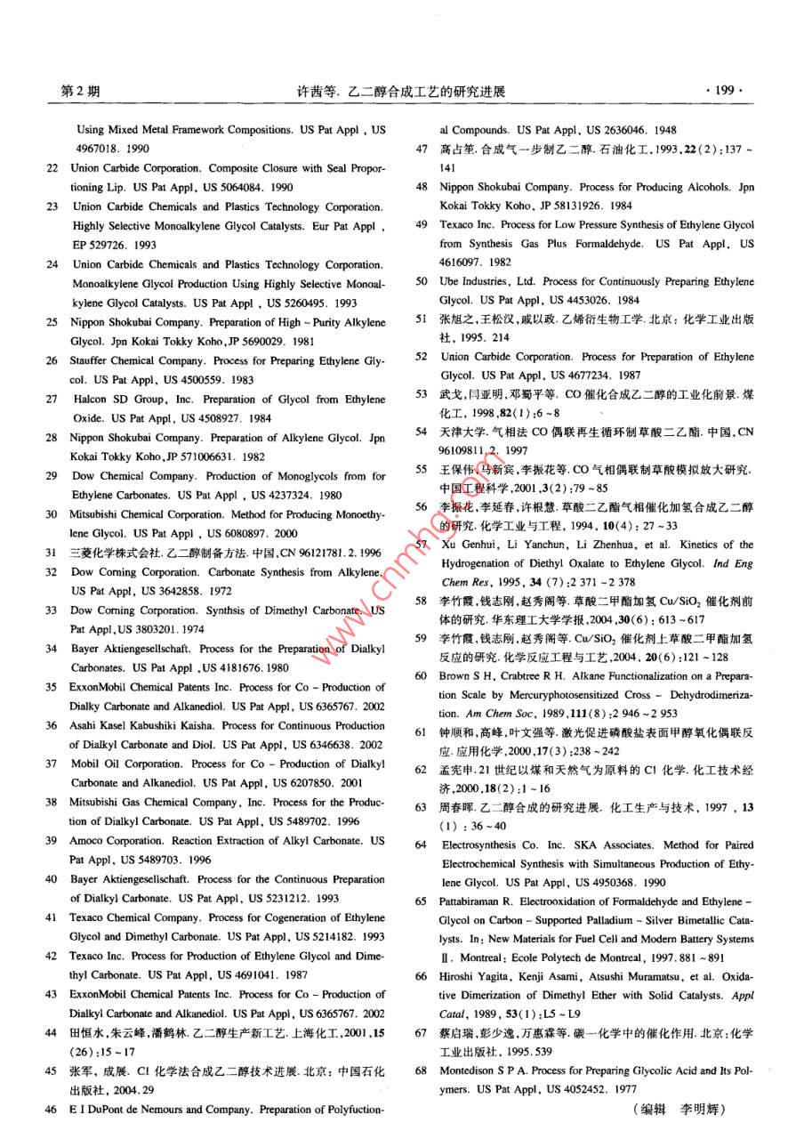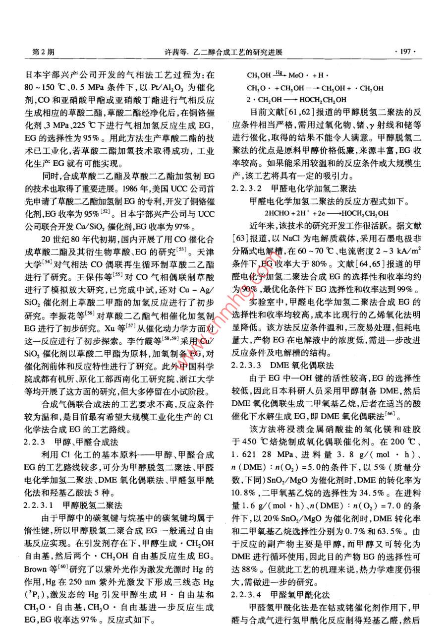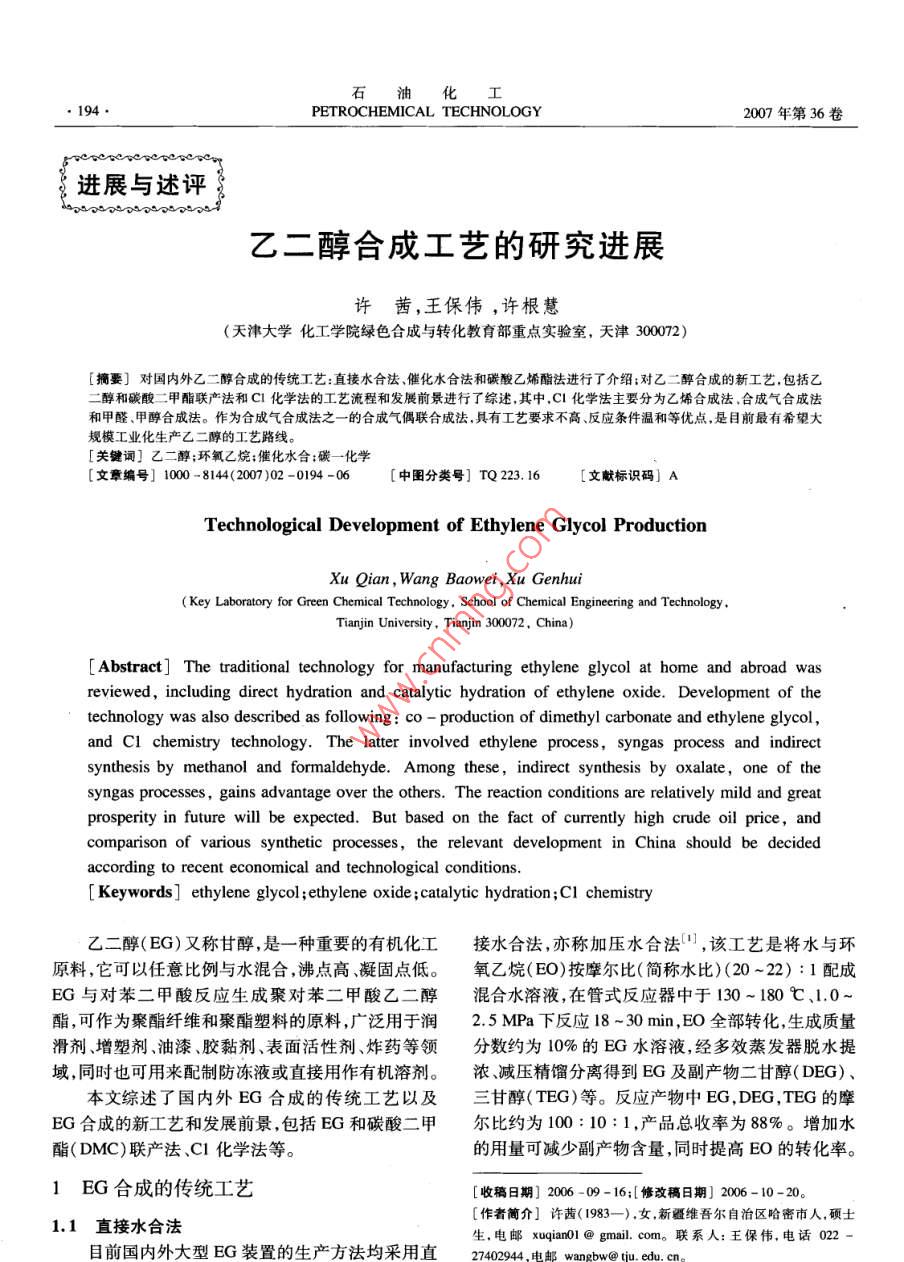 石油化工PETROCHEMICAL TECHNOLOGY2007年第36卷進展與述評乙二醇合成工藝的研究進展許茜,王保偉,許根慧(天津大學化工學院綠色合成與轉(zhuǎn)化教育部重點實驗室,天津300072)[摘要]對國內(nèi)外乙二醇合成的傳統(tǒng)工藝:直接水合法催化水合法和碳酸乙烯酯法進行了介紹;對乙二醇合成的新工藝,包括乙醇和碳酸二甲酯聯(lián)產(chǎn)法和C1化學法的工藝流程和發(fā)展前景進行了綜述,其中,C1化學法主要分為乙烯合成法合成氣合成法和甲醛、甲醇合成法。作為合成氣合成法之一的合成氣偶聯(lián)合成法,具有工藝要求不高、反應(yīng)條件溫和等優(yōu)點,是目前最有希望大規(guī)模工業(yè)化生產(chǎn)乙二醇的工藝路線[關(guān)鍵詞]乙二醇;環(huán)氧乙烷;催化水合;碳一化學[文章編號]1000-8144(2007)02-0194-06中圖分類號]TQ223.16[文獻標識碼]ATechnological Development of Ethylene Glycol ProductionXu Qian, Wang Baowei, Xu Genhui(Key Laboratory for Green Chemical Technology, School of Chemical Engineering and TechnologyTianjin University, Tianjin 300072, China)Abstract] The traditional technology for manufacturing ethylene glycol at home and abroad wasreviewed, including direct hydration and catalytic hydration of ethylene oxide. Development of thetechnology was also described as following co-production of dimethyl carbonate and ethylene glycoland Cl chemistry technology. The latter involved ethylene process, syngas process and indirectsynthesis by methanol and formaldehyde. Among these, indirect synthesis by oxalate, one of thesyngas processes, gains advantage over the others. The reaction conditions are relatively mild and greatprosperity in future will be expected. But based on the fact of currently high crude oil price, andcomparison of various synthetic processes, the relevant development in China should be decidedaccording to recent economical and technological conditionsKeywords] ethylene glycol; ethylene oxide; catalytic hydration; CI chemistry乙二醇(EG)又稱甘醇,是一種重要的有機化工接水合法,亦稱加壓水合法,該工藝是將水與環(huán)原料,它可以任意比例與水混合,沸點高、凝固點低。氧乙烷(EO)按摩爾比(簡稱水比)(20~22):1配成EG與對苯二甲酸反應(yīng)生成聚對苯二甲酸乙二醇混合水溶液,在管式反應(yīng)器中于130~180℃、1.0~酯,可作為聚酯纖維和聚酯塑料的原料,廣泛用于潤2.5MPa下反應(yīng)18-30min,EO全部轉(zhuǎn)化,生成質(zhì)量滑劑、增塑劑、油漆、膠黏劑、表面活性劑、炸藥等領(lǐng)分數(shù)約為10%的EG水溶液,經(jīng)多效蒸發(fā)器脫水提域,同時也可用來配制防凍液或直接用作有機溶劑。濃、減壓精餾分離得到EG及副產(chǎn)物二甘醇(DEG)、本文綜述了國內(nèi)外EG合成的傳統(tǒng)工藝以及三甘醇(TEG)等。反應(yīng)產(chǎn)物中EG,DEG,TEG的摩EG合成的新工藝和發(fā)展前景,包括EG和碳酸二甲爾比約為100:10:1,產(chǎn)品總收率為88%。增加水酯(DMC)聯(lián)產(chǎn)法C1化學法等。的用量可減少副產(chǎn)物含量,同時提高EO的轉(zhuǎn)化率。1EG合成的傳統(tǒng)工藝[收稿日期]2006-09-16;[修改稿日期]2006-101.1直接水合法[作者簡介]許茜(1983—),女,新疆維吾爾自治區(qū)哈密市人,碩士生,電郵xuqian@gmail.com。聯(lián)系人:王保偉,電話022-目前國內(nèi)外大型EG裝置的生產(chǎn)方法均采用直2740294,電郵 wangbw@ tiu.cd,cn第2期茜等.乙二醇合成工藝的研究進展但直接水合法的生產(chǎn)裝置需設(shè)置多個蒸發(fā)器、工藝裝置。一步法反應(yīng)過程也生成中間體EC,只是這兩流程長、設(shè)備多、能耗高,直接影響EG的生產(chǎn)成個反應(yīng)在同一反應(yīng)器中同時進行。專利提出把酯化反應(yīng)和水解反應(yīng)分開進行,即12催化水合法二步法。二步法是一步法的改進。美國 Halcon-SD催化水合法制備EG是相對非催化水合法而言公司2提出的二步法工藝是從反應(yīng)器出來的混合的,針對目前直接水合法水比高的缺點需開發(fā)水合物經(jīng)吸收器吸收后,用臨界狀態(tài)下的CO2抽提,得催化劑,降低水比,同時保證較高的EG選擇性。自到EO,CO2,H2O的混合物,混合物再與有機鹵化20世紀70年代以來,國內(nèi)外一些大公司致力于EO物、鹵硫化物等酯化反應(yīng)催化劑接觸合成EC,生成催化水合法合成EG技術(shù)的研究,主要有荷蘭 Shell的EC送入水解反應(yīng)器,在相同催化劑作用下水解公司、美國UCC公司和Dow化學公司3、日本住友得到EG和CO2。CO2可循環(huán)使用,EG收率高達化學公司和三菱公司43及國內(nèi)的大連理工大學、99%。日本觸媒公司21提出了工業(yè)化規(guī)模的二步上海石油化工研究院°、南京工業(yè)大學等。催化法新工藝,即在K催化劑、160℃下,EO與CO2進水合法可分為均相催化水合法和非均相催化水合法行酯化反應(yīng),EO轉(zhuǎn)化率為9.9%,EC選擇性為兩種。其中具有代表性的是Shel公司的非均相催100%;EC水解反應(yīng)是以活性Al2O3為催化劑,在化水合法和UCC公司的均相催化水合法。Shl公140℃、2,2MPa下進行,EG收率為99.8%。美國司-12以季銨型酸式碳酸鹽陰離子交換樹脂為催Dow化學公司)也以A1QO3為催化劑EG收率達化劑研究催化水合工藝,實驗結(jié)果為EO轉(zhuǎn)化率98%以上。日本三菱化學公司0,將乙烯氧化得96%-98%,EG選擇性97%-98%。后來該公司到的EO用含有EC和EG的水溶液吸收后直接進又開發(fā)了類似SiO2骨架的聚有機硅烷銨鹽負載型入酯化反應(yīng)器轉(zhuǎn)變?yōu)镋C和EG,然后再進行水解反催化劑及其催化的環(huán