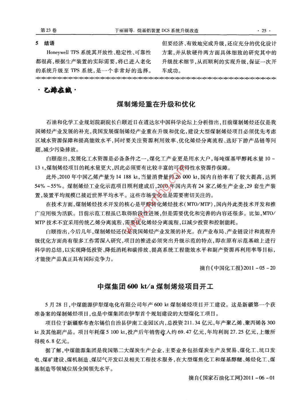 第23卷于麗麗等.烷基鋁裝置DCS系統(tǒng)升級改造5結(jié)語但要經(jīng)濟、有效地完成升級,還應充分的優(yōu)化設計Honeywell TPS系統(tǒng)其開放性、穩(wěn)定性、可靠性方案,并從軟硬件兩方面具體細致的研究其中的都很高,根據(jù)生產(chǎn)裝置的實際需要,將已進入老化升級技術細節(jié),從而順利的實現(xiàn)升級,保證-一次開的系統(tǒng)升級至TPS系統(tǒng),是一個非常好的選擇。車成功。●己烯在緘.煤制烯烴重在升級和優(yōu)化石油和化學工業(yè)規(guī)劃院副院長白頤近日在道達爾中國科學論壇上分析指出,目前煤制烯烴還僅是我國烯烴產(chǎn)業(yè)發(fā)展的補充,我國發(fā)展煤制烯烴產(chǎn)業(yè)重在升級和優(yōu)化,建設大型煤制烯烴項目必須優(yōu)先考慮區(qū)域水資源保障和提高能效水平,同時要關注資源利用效率、優(yōu)化烯烴分離流程、選好下游產(chǎn)品鏈等問題,減少污染排放。白頤指出,發(fā)展化工水資源是必備條件之--,煤化工產(chǎn)業(yè)更是用水大戶,每噸煤基甲醇耗水量10~13 t,煤制烯烴項目的耗水量更大,因此必須要有比較豐富的可獲得性水資源作保障。此外,2010年中國乙烯產(chǎn)量為14188 kt, 當量消費量約26 000 kt,國內(nèi)自給率有了較大提高,達到54% ~ 55%。煤制烯烴工業(yè)化示范項目順利建成后,2010年國內(nèi)共有24家乙烯生產(chǎn)企業(yè), 29套生產(chǎn)裝置,裝置平均規(guī)模已接近世界平均水平。這些市場變化也是需要密切關注的。在技術方面,煤制烯烴技術開發(fā)的核心是甲醇轉(zhuǎn)化烯烴技術(MTO/MTP),國內(nèi)外此類技術開發(fā)和推廣應用極為活躍。目前示范工程雖已取得階段性進展,但是需要優(yōu)化和完善的內(nèi)容還很多。比如,MTO/MTP技術不宜采用傳統(tǒng)乙烯分離流程,需要優(yōu)化烯烴分離流程,以減少投資和控制能耗。白頤指出,今后幾年,煤制烯烴還僅是我國烯烴產(chǎn)業(yè)發(fā)展的補充。在產(chǎn)業(yè)布局、產(chǎn)業(yè)鏈設計和流程升級優(yōu)化方面尚有很多工作需深人研究,項目的推進必須突出升級示范的特點,即在原有示范基礎上進行科學的總結(jié),以實現(xiàn)降低投資、降低消耗和碳排放、提高系統(tǒng)工程能效水平和副產(chǎn)資源再利用率等目標,才能使產(chǎn)品真正具有國際競爭力。摘自《中國化工報》2011 -05 -20中煤集團600 kt/a煤制烯烴項目開工5月28日,中煤能源伊犁煤電化有限公司年產(chǎn)600 kt 煤制烯烴項目開工建設。這是新疆第一-個獲準備案的煤制烯烴項目,也是中煤集團在伊犁首個規(guī)劃建設的大型煤化工項目。項目位于新疆察布查爾錫伯自治縣伊南工業(yè)園區(qū)內(nèi),總投資211.34億元,年產(chǎn)聚乙烯、聚丙烯各300kt及其他副產(chǎn)品。項目年耗煤5 100 kt,投產(chǎn)后年銷售收人約69. 47億元,年均利潤27. 25億元,上繳所得稅6.8億元。據(jù)了解,中煤能源集團是我國第二大煤炭生產(chǎn)企業(yè),主要業(yè)務包括煤炭生產(chǎn)及貿(mào)易煤化工、坑口發(fā)電、煤礦建設、煤機制造、煤層氣開發(fā)以及相關工程技術服務,在大型煤焦化工和煤基醇醚、烯烴化工、煤基制造等領域位居全國領先水平。摘自《國家石油化工網(wǎng)》2011 -06 -01.