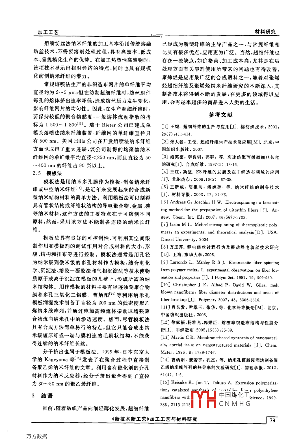 材料研究加工工藝聚烯烴超細(xì)纖維的制備技術(shù)*趙娜12,劉太奇1,劉瑞雪l,2(1.北京石油化工學(xué)院環(huán)境材料研究中心,北京102617;2. 北京化工大學(xué)材料科學(xué)與工程學(xué)院,北京1002020摘要:聚烯烴超細(xì)纖維特有的結(jié)構(gòu)與性能使其研究與生產(chǎn)技術(shù)發(fā)展迅速,生產(chǎn)量也在 飛速地增長。本文綜述了聚烯烴超細(xì)纖維的制備技術(shù),詳細(xì)介紹了直接紡絲法、復(fù)合紡絲法、高壓靜電紡絲法、熔噴非織造技術(shù)、模板合成法等聚烯烴超細(xì)纖維制備方法。迄今為止,國內(nèi)及國際對于超細(xì)纖維的概念并沒有公認(rèn)的定義,一般認(rèn)為單纖維線密度為0.1~1.0 dtex的纖維屬于超細(xì)纖維,而線密度<0.1 dtex的纖維一般稱為極細(xì)纖維。關(guān)鍵詞:超細(xì)纖維;聚烯烴;電紡絲;制備技術(shù)中圖分類號:TQ 342文獻(xiàn)標(biāo)志碼:ATechnology of Polyolefin Microfiber PreparationZHAO Na'.', LIU Taiqit ,LIU Ruixue'."(1. Environment Materials Research Center, Beijing Institute of Petrochemical Technology, Beiing 102617, China;2. School of Material Science and Engineering, Beijing University of Chemical Technology, Beiing 100029, China)Abstraet: The research and production technology of polyolefin microfiber preparation have developed quickly due to theunique structure and properties,, the output has also grown rapidly in recent years. In this paper, the technology of polyole-fin microfiber preparation was reviewed. Several preparation methods were introduced, including direct spinning method,composite spinning, electrospinning method, melt blown technology and template method. So far, there are no proverbialdefinitions for superfine fibre in domestic and abroad, normally, single fiber density with 0. 1~1.0 dtex belongs to superfinefiber, and fiber less than 0. 1 dtex was called super fine fiber.Key words : microfiber, polyolefin, electrospinning, preparation technology生產(chǎn)聚烯烴超細(xì)纖維的方法主要有直接紡絲l 聚烯烴超細(xì)纖維法、復(fù)合紡絲法、靜電紡絲法、熔噴非織造技術(shù)、模板目前,各類品種的合成纖維都可紡制超細(xì)纖維,法等。如聚酯、聚酰胺、聚丙烯腈、聚丙烯纖維等[1]。超細(xì)2聚烯烴超細(xì)纖維的制備方法纖維最顯著的特征就是它具有比普通纖維小得多的線密度,目前人工制造的最細(xì)超細(xì)纖維線密度為2.1 直接紡絲法0.000 11 dtex,其直徑僅有0.095 μm,達(dá)到了納米直接紡絲法制造超細(xì)纖維的生產(chǎn)技術(shù),是相對級水平[2]。由于超細(xì)纖維纖維線密度的降低而具有于復(fù)合紡絲法和共混紡絲法而言的,即在紡絲過程許多超越常規(guī)纖維的優(yōu)越性能,如織物手感柔軟、垂中使用單--原料,直接利用熔體紡絲工藝或溶液紡懸性好、保暖性及防水透氣性好、比表面積大、吸附絲工藝制成超細(xì)纖維的技術(shù),是對原有紡絲方法的性強、去污力及過濾性能好、毛細(xì)效應(yīng)強等。技術(shù)改進(jìn)。聚烯烴材料包括聚乙烯、聚丙烯,是5大通用合直接紡絲法常用于生產(chǎn)PET、PP. PA6及成樹脂的主要組成部分,也是合成材料的重要組成PA66纖維。由于聚丙烯原料易結(jié)晶,且不同晶型之一。自1933年實現(xiàn)聚乙烯工業(yè)化生產(chǎn)以來,已形結(jié)構(gòu)的PP具有不同的拉伸性能;因此,PP超細(xì)纖成低密度聚乙烯(LDPE) .高密度聚乙烯(HDPE)和維的生產(chǎn)技術(shù)關(guān)鍵在于控制卷繞絲形成次晶為主體線性低密度聚乙烯(LLDPE)3大系列,是合成樹脂的結(jié)構(gòu)。應(yīng)采用熔體流動指數(shù)較高且分子量分布較的第1大品種。聚丙烯是合成樹脂的第2大品種,窄的原料,或采用較高的紡絲溫度進(jìn)行紡絲,從而得生產(chǎn)工藝簡單,原料來源豐富,具有良好的加工性能到性能良好的PP超細(xì)纖維[田。和使用性能。聚烯烴樹脂是綜合性能優(yōu)異的合成材2.2復(fù)合紡絲法料,為現(xiàn)代農(nóng)業(yè)提供了必不可少的農(nóng)膜、灌溉材料,復(fù)合紡絲中國煤化工比學(xué)結(jié)構(gòu)和性為汽車、機械及電子等產(chǎn)業(yè)提供了大量性能優(yōu)異的能的成纖高:MHCN MH G各自管道,再基礎(chǔ)材料。由多塊分配板組合而成的復(fù)合組件進(jìn)行分配,以各《新技術(shù)新工藝》加工工藝與材料研究「77加工工藝材料研究熔噴紡絲法納米纖維的加工基本沿用傳統(tǒng)熔融已經(jīng)成為新型纖維的主導(dǎo)產(chǎn)品之一,與常規(guī)纖維相紡絲技術(shù),不需要溶劑處理過程,具有高效率.低成比具有很多優(yōu)點,應(yīng)用更為廣泛。當(dāng)然,超細(xì)纖維也本.易規(guī)?;a(chǎn)的優(yōu)勢。在加工熱塑性高聚物時,存在一些缺點,如價格高、加工成本高,尤其是在后該項技術(shù)顯示出相對經(jīng)濟的特點,同時也具有規(guī)模處理方面有關(guān)溶劑使用所帶來的問題也有待改善?;徶萍{米纖維的潛力。聚烯烴是應(yīng)用最廣泛的合成塑料之一,隨著對聚烯.常規(guī)熔噴法生產(chǎn)的非織造布網(wǎng)片的單纖維平均烴超細(xì)纖維及聚烯烴納米纖維研究的不斷深人,其直徑約為2~5μm;但在紡制超細(xì)纖維時,紡絲組件制備技術(shù)將得到不斷的發(fā)展,在更多的領(lǐng)域得以應(yīng)每孔的熔體擠出速率降低,造成紡絲壓力發(fā)生變化,用,會有越來越多的商品進(jìn)人人類的生活。影響纖維網(wǎng)片的均勻性。因此,在生產(chǎn)超細(xì)纖