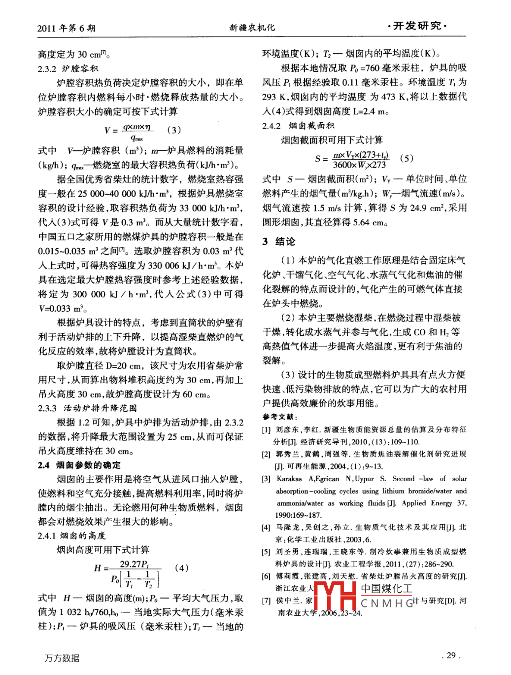 2011年第6期新疆農(nóng)機(jī)化.開發(fā)研究●戶用型生物質(zhì)濕柴直燃?xì)饣癄t的設(shè)計(jì)馬飛',王維新1,鄭美娥2(1.石河子大學(xué)機(jī)械電氣工程學(xué)院,新疆石河子832000;2.長(zhǎng)樂(lè)市 第二中學(xué))摘要:為了解決 當(dāng)前農(nóng)村面臨的用能負(fù)擔(dān)問(wèn)題,依據(jù)當(dāng)前農(nóng)村普遍炊事用能習(xí)慣,設(shè)計(jì)出戶用型炊事所需要的生物質(zhì)濕柴直燃?xì)饣癄t,并通過(guò)實(shí)驗(yàn)設(shè)計(jì)和數(shù)據(jù)分析,確定了其燃料消耗量、爐膛容積、吊火高度、煙囪高度及煙囪截面積等主要設(shè)計(jì)參數(shù)。關(guān)鍵詞:戶用型;濕柴直燃;爐膛;吊火高度中圍分類號(hào):TP273.5文獻(xiàn)標(biāo)識(shí)碼:A因此研究和發(fā)展農(nóng)村戶用型生物質(zhì)爐具,充分利用文章編號(hào): 1007-7782(2011 )06 -0027-03農(nóng)村秸稈資源,是減輕這一負(fù)擔(dān)的有效方法。由于目近年來(lái),隨著國(guó)民經(jīng)濟(jì)快速增長(zhǎng),用能問(wèn)題已經(jīng)前市場(chǎng)上的各種生物質(zhì)爐具在使用的過(guò)程中,普遍成為世界各國(guó)人民面臨的最緊迫問(wèn)題之-,與此同存在熱效率低、點(diǎn)火困難和產(chǎn)生焦油等問(wèn)題。故從節(jié)時(shí)商品化熱源價(jià)格也隨之上漲,我國(guó)的廣大農(nóng)村面能減排的角度出發(fā),設(shè)計(jì)- -種經(jīng)濟(jì)環(huán)保的戶用型生臨嚴(yán)重的用能負(fù)擔(dān)。新疆是一個(gè)農(nóng)業(yè)大省,農(nóng)作物物質(zhì)濕柴直燃?xì)饣癄t,減輕農(nóng)民用能負(fù)擔(dān),促進(jìn)農(nóng)村秸稈資源豐富,據(jù)新疆2007年農(nóng)作物產(chǎn)品產(chǎn)量利用經(jīng)濟(jì)可持續(xù)發(fā)展。農(nóng)作物秸稈資源量估算,新疆農(nóng)作物秸稈資源量估1爐具結(jié)構(gòu)及工作原理算值為4073.558萬(wàn)t,折合2154.912萬(wàn)t標(biāo)準(zhǔn)煤"。1.1爐具結(jié)構(gòu).爐具采用符合農(nóng)村炊事習(xí)慣的傳統(tǒng)爐型,整個(gè)收藊日期:2011-11-30肥箱上的鏈輪帶動(dòng)有機(jī)施肥箱上的撥肥軸進(jìn)行傳化學(xué)顆粒肥施肥量根據(jù)需求調(diào)整動(dòng),撥肥軸上的撥肥齒撥動(dòng)有機(jī)肥料進(jìn)人排肥口。農(nóng)家肥施肥量(kg/667m2) 500~1 500 (可調(diào))同時(shí)撥肥軸通過(guò)鏈輪轉(zhuǎn)動(dòng)將動(dòng)力傳遞給排肥軸,排4機(jī)具特點(diǎn)肥軸和撥肥軸的工作原理基本相同,不同之處是排肥口兩側(cè)的排肥軸上焊接有螺旋葉片,可將肥料向(1)由于該機(jī)開溝裝置在右側(cè)(旋耕刀在拖拉排肥口移動(dòng)。排肥口處的排肥軸上焊接有3片排肥機(jī)右輪正后方),作業(yè)時(shí)拖拉機(jī)行間行走可將施肥溝開在距樹干0.5~1.0 m處,而不受樹冠樹葉的影響。葉片,將有機(jī)肥料排進(jìn)溝內(nèi)進(jìn)行施肥。(2)該開溝施肥機(jī)一機(jī)多用,不僅適用果園,還.3主要技術(shù)參數(shù)適用農(nóng)田和林帶的開溝、開渠和斷根作業(yè)。(3)體積小、重量輕操作方便、可靠、生產(chǎn)效率外形尺寸(mm)1 700x1 060x1 230高成本低,生產(chǎn)效率比人工作業(yè)高出35倍。配套動(dòng)力(kW)29.4~36.75結(jié)構(gòu)質(zhì)量(kg)3005試驗(yàn)應(yīng)用傳動(dòng)方式減速換向器總成2011年.中國(guó)煤化工把樣機(jī)在阿拉掛接方式作業(yè)速度(km/h)三點(diǎn)懸掛爾地區(qū)紅棗THCNMH友的認(rèn)可經(jīng)2~5過(guò)試驗(yàn),開溝施肥效果良好,樣機(jī)各項(xiàng)性能指標(biāo)全部溝深范圍(cm)200- ~350達(dá)到了設(shè)計(jì)要求。溝寬范圍(cm)200~300.7.●開發(fā)研究.新疆農(nóng)機(jī)化2011年第6期爐具分為上、中、下三個(gè)部分,灶頭主要是氣化氣與高氣化效 率。爐排設(shè)計(jì)成活動(dòng)式爐排,主要是考慮到空氣接觸并燃燒的場(chǎng)所,爐體主要是濕柴燃燒和氣傳統(tǒng)的固定爐排爐具工作時(shí),物料消耗到- -定量后,化場(chǎng)所,爐底座的主要功能是支持爐體和灶頭,并且氧化層會(huì)隨之下降,導(dǎo)致吊火高度相應(yīng)增高,火焰溫可以調(diào)節(jié)一次風(fēng)進(jìn)風(fēng)口,結(jié)構(gòu)如圖1。 根據(jù)燃料燃燒度較高處與鍋底的接觸不良,不利于熱源利用效率,的特性,爐具燃燒方式分別設(shè)計(jì)為層燃和上點(diǎn)火。而活動(dòng)爐排可以解決這一-問(wèn)題,當(dāng)氧化層下降時(shí),用1.2工作原理戶可通過(guò)手動(dòng)提升爐排,從而維持吊火高度在設(shè)計(jì)爐體由三個(gè)不同內(nèi)徑的圓簡(jiǎn)組成蒸汽腔道和二二范圍內(nèi),提高熱源利用率。次風(fēng)道,中間形成濕柴的燃燒爐膛(見圖2)。使用2濕柴爐具主要設(shè)計(jì)參數(shù)的確定時(shí),濕柴物料由爐膛上方加入,落至爐膛底部的活動(dòng)爐排上,達(dá)到一定量后,再加入少量點(diǎn)燃的易燃干2.1爐具熱負(fù)荷的確定柴,關(guān)閉爐底座上的- -次風(fēng)進(jìn)風(fēng)口,干燥并引燃下方爐具熱負(fù)荷的確定是爐具設(shè)計(jì)中的關(guān)鍵,熱負(fù)的濕柴,觀察濕柴燃燒的火焰情況,并調(diào)節(jié)- -次風(fēng)進(jìn)荷的大小直接影響到炊事活動(dòng)的正常進(jìn)行。據(jù)資料風(fēng)口大小,至火焰足夠大后,進(jìn)行炊事活動(dòng)。本爐設(shè)顯示,中國(guó)農(nóng)村以五口之家為例,要維持起碼的生活計(jì)成上點(diǎn)火式爐型,點(diǎ