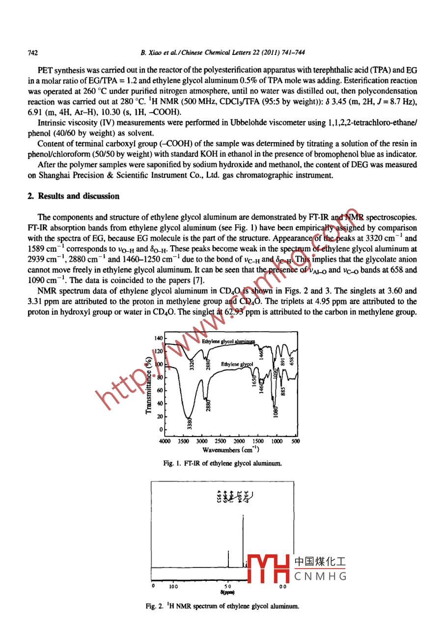 Available online at www.sciencedirect.comCHINES EScienceDirectCHEMICALL ETTERSEL SEVIERChinese Chemical Letters 22 (2011) 741-744www. elsevier.com/locate/ccletEthylene glycol aluminum as a novel catalystfor the synthesis of poly(ethylene terephthalate)Bin Xiao a,b,e, Li Ping Wang a,b.c, Ren Hao Mei a,b.c, Gong Ying Wang a,b,c,*: Chengdu Institute of Orgaric Chemistry, Chinese Academy of Sciences, Chengdu 610041, Chinab Changzhou Key Laboratory of Green Chemistry and Technology, Changzhou Instiute of Chemistry, Changzhou 213164, ChinaC Graduate School of Chinese Academry of Sciences, Bejing 100039, ChinaReceived 14 September 2010AbstractEthylene glycol aluminum was prepared eficiently and characterized by FT-IR and NMR. It exhibited higher catalytic activityand had proftable effect than titanium glycolate and ethylene glycol antimony for the synthesis of poly(ethylene terephthalate)(PET). It was only used as polycondensation catalyst because it was sensitive to water. For this catalyst, the degree of esterificationof the theoretical amount of water was produced up to 95% at 260 °C, while the intrinsic viscosity and content of terminal carboxylgroups of the corresponding PET polyester, polymerized at 280。C, 70 Pa for 39 min, was 0.87 dL/g and 23.0 μmolg, respectively.Ethylene glycol aluminum was a promising catalyst for the synthesis of PET polyester.◎2010 Gong Ying Wang. Published by Elsevier B.V. on behalf of Chinese Chemical Society. All rights reserved.Keywords: Aluminum alkoxide; PET; Polycondensation; Catalyst; Ethylene glycol; Terephthalic acidPoly(ethylene terephthalate) (PET) is used as a commodity as well as engineering product for diverse applications.Its main end products are fibers, packaging articles and films [1,2]. PET has one of the fastest growing markets and willcontinue this trend in the future boosted by world economic growth and continuous development of new applicationfields. In the production of high molecular weight PET by the polycondensation of ethylene terephthalate, the presenceof a catalyst is essential.Despite the large number of papers and reviews published in the literature on the kinetic and catalytic aspects of theformation of PET [3- -6], the report is rare which aluminum alkoxide is used as the polycondensation catalyst. In thiswork, ethylene glycol aluminum was prepared and used as a new catalyst for the synthesis of PET polyester.1. ExperimentalEthylene glycol aluminum was prepared from aluminum isopropoxide and ethylene glycol (EG) in a molar ratio of2/3 in quantitative distilled isopropanol at 190 °C for 8 h. The solution was cooled to room temperature, then 200 mLtoluene was added to precipitate the product as a white solid. Then the white solid sample was dried in vacum at roomtemperature [7].* Corresponding author at: Chengdu Institute of Organic Chemistry, Chinese A中國煤化工,ChineE-mail addresses: gywang@cioc.ac.cn, bxwisdom. _886@yahoo.com.cn (G.Y:MYHCNMHG1001-8417/S- see front matter心2010 Gong Ying Wang. Published by Elsevier B.V. on behalf of Chinese Chemical Society. All nights reserved.doi: 1.016/.cet.2010.12.036742B. Xiao et al./Chinese Chemical Lters 22 (2011) 741-744PET synthesis was carried out in the reactor of the polyesterifcation apparatus with terephthalic acid (TPA) and EGin a molar ratio of EG/TPA = 1.2 and ethylene glycol aluminum 0.5% of TPA mole was adding. Esterfcation reactionwas operated at 260 °C under purified nitrogen atmosphere, until no water was distilled out, then polycondensationreaction was carried out at 280。C. 'H NMR (500 MHz, CDCI]yTFA (95:5 by weight): 8 3.45 (m, 2H, J= 8.7 H2),6.91 (m, 4H, Ar-H), 10.30 (s, 1H, -COOH).Intrinsic viscosity (IV) measurements were performed in Ubbelohde viscometer using 1,1 ,2,2 tetrachloro-ethane/phenol (40/60 by weight) as solvent.Content of terminal carboxyI group (- COOH) of the sample was determined by titrating a solution of the resin inphenol/chloroform (50/50 by weight) with standard KOH in ethanol in the presence of bromophenol blue as indicator.After the polymer samples were saponified by sodium hydroxide and methanol, the content of DEG was measuredon Shanghai Precision & Scientific Instrument Co., Ltd. gas chromatographic instrument.2. Results and discussionThe components and structure of ethylene glycol aluminum are demonstrated by FT-IR and NMR spectroscopies.FT-IR absorption bands from ethylene glycol aluminum (see Fig. 1) have been empirically assigned by comparisonwith the spectra of EG, because EG molecule is the part of the structure. Appearance of the peaks at 3320 cm- and1589 cm~ ! corresponds to vo H and δ H These peaks become weak in the spectrum of ethylene glycol aluminum at2939 cm-' , 2880 cm - I and 1460- 1250 cm~' due to the bond of Uc H and δc H This implies that the glycolate anioncannot move freely in ethylene glycol aluminum. It can be seen that the presence of VAL o and VC o bands at 658 and1090 cm . The data is coincided to the papers [7].NMR spectrum data of ethylene glycol aluminum in CD2O is shown in Figs. 2 and 3. The singlets at 3.60 and3.31 ppm are atrbuted to the proton in methylene group and CD4O. The triplets at 4.95 ppm are attributed to theproton in hydroxyl group or water in CD40. The singlet at 62.93 ppm is attributed to the carbon in methylene group.1401208 100Eerylene glyel80∞0星自g 40}20[ot4000 3500 3000 2500 2000 1500 1000 500Waveaumbers (cm* )Fig. 1. FT-IR of ethylene glycol aluminum.中國煤化工TYHCNMHG0108uppFig. 2. 'H NMR specrm of ethylene glycol aluminum.B. Xiao et al./Chinese Chemical Letters 22 (2011) 741- -744743100Fig 3. 'C NMR spectrum of ethylene glycol aluminum.The multiplets at 47.95 ppm are atributed to the solvent CD2O. From FT-IR and NMR spectrums, we can justify thatthe received sample is ethylene glycol aluminum.The IV data in Table 1 ilustrates that the catalytic activity of titanium glycolate is higher than ethylene glycolaluminum and ethylene glycol antimony. The catalytic activity i