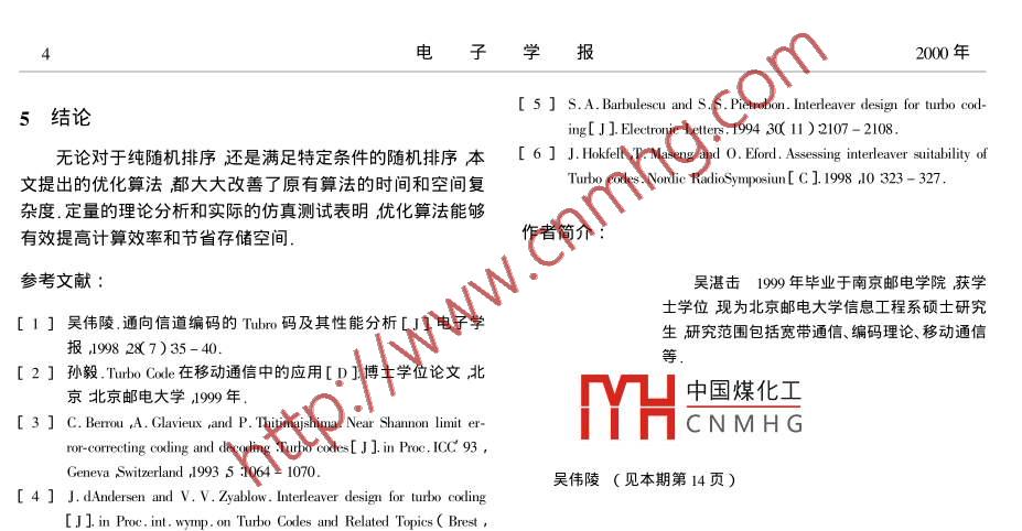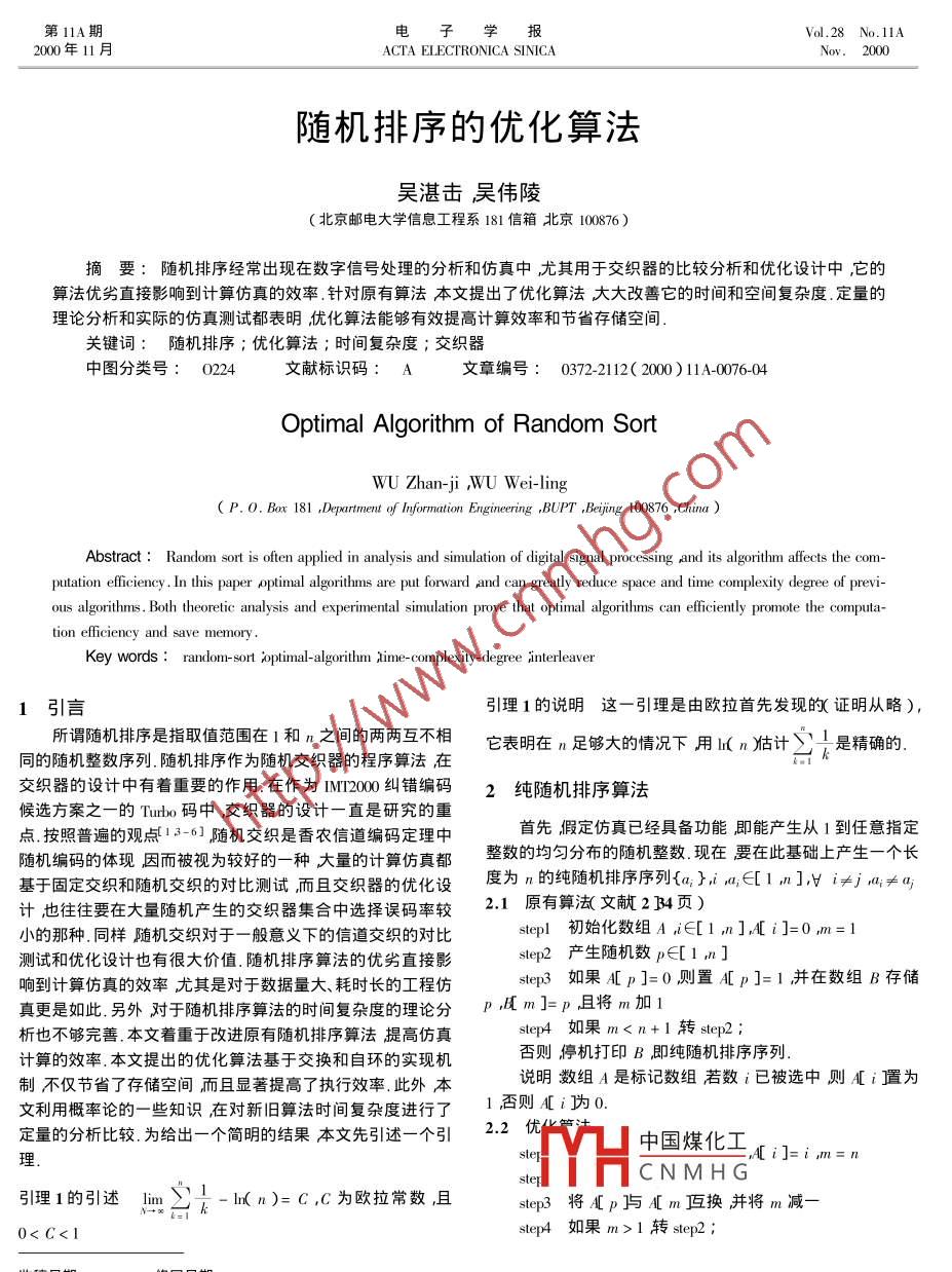 第11A期電子學(xué)報Vol.28 No.11A2000年11月ACTA ELECTRONICA SINICANov.2000隨機排序的優(yōu)化算法.吳湛擊吳偉陵(北京郵電大學(xué)信息工程系181 信箱北京100876 )摘要:隨機排序經(jīng)常出現(xiàn)在數(shù)字信號處理的分析和仿真中尤其用于交織器的比較分析和優(yōu)化設(shè)計中,它的算法優(yōu)劣直接影響到計算仿真的效率.針對原有算法本文提出了優(yōu)化算法大大改善它的時間和空間復(fù)雜度.定量的理論分析和實際的仿真測試都表明優(yōu)化算法能夠有效提高計算效率和節(jié)省存儲空間.關(guān)鍵詞:隨機排序;優(yōu)化算法;時間復(fù)雜度;交織器中圖分類號: 0224文獻標識碼: A文章編號: 0372-2112( 2000 ) 11A-0076-04Optimal Algorithm of Random SortWU Zhan-ji ,WU Wei-ling( P.0. Box 181 ,Department of Information Engineering ,BUPT ,Beijing 100876 ,China )Abstract : Random sort is often applied in analysis and simulation of digital signal processing ,and its algorithm afects the com-putation fficiency . In this paper optimal algorithms are put forward ,and can greatly reduce space and time complexity degree of previ-ous algorithms . Both theoretic analysis and experimental simulation prove that optimal algorithms can efficiently promote the computa-tion eficiency and save memory.Key words : randon-sort optimal-algorithm ,ime-complexity-degree Ainterleaver1引言引理1的說明這-引理是由歐拉首先發(fā)現(xiàn)的(證明從略),所謂隨機排序是指取值范圍在1和n之間的兩兩互不相它表明在n足夠大的情況下用l( n)估計2T是精確的.同的隨機整數(shù)序列.隨機排序作為隨機交織器的程序算法在交織器的設(shè)計中有著重要的作用.在作為IMT2000糾錯編碼2純隨機排序算法候選方案之-的Turbo碼中交織器的設(shè)計--直是研究的重點.按照普遍的觀點[13-6]隨機交織是香農(nóng)信道編碼定理中首先假定仿真已經(jīng)具備功能即能產(chǎn)生從1到任意指定隨機編碼的體現(xiàn),因而被視為較好的一種大量的計算仿真都整數(shù)的均勻分布的隨機整數(shù).現(xiàn)在要在此基礎(chǔ)上產(chǎn)生一個長基于固定交織和隨機交織的對比測試,而且交織器的優(yōu)化設(shè)度為n的純隨機排序序列{a;}i a,∈[1 n],v i≠j ,a;≠a;計也往往要在大量隨機產(chǎn)生的交織器集合中選擇誤碼率較.1 原有算法(文獻2B4頁)小的那種.同樣隨機交織對于. -般意義下的信道交織的對比stepl初始化數(shù)組 A ,i∈[1 n]A[ i]=0 ,m=1測試和優(yōu)化設(shè)計也有很大價值.隨機排序算法的優(yōu)劣直接影step2產(chǎn)生隨機數(shù) p∈[1 n]響到計算仿真的效率尤其是對于數(shù)據(jù)量大、耗時長的工程仿step3如果A[p]=0則置A[p]=1并在數(shù)組B存儲真更是如此.另外對于隨機排序算法的時間復(fù)雜度的理論分p風m]=p ,且將m加1析也不夠完善.本文著重于改進原有隨機排序算法提高仿真step4如果 m1轉(zhuǎn)step2;收稿日期209014修回日期200-07-11基金項目國家自然科學(xué)基金重大項目( No. 69896243資助課題2電子學(xué)報2000年否則停機打印A即純隨機排序序列.布可知{n;獨立分布則π(η:)也獨立分布,那么時間復(fù)雜說明:●優(yōu)化算法的基本思想是:首先初始化-一個簡單遞增排度TCD= 2X K(η:))序的數(shù)組A={1 2.. ,幾}然后產(chǎn)生一個[ 1 ,n 止均勻分布的由引理2,TCD=>;1-;=n;隨機整數(shù)設(shè)為p1)將A[n]與A[p1交換然后,A[ n固定.不變再產(chǎn)生一個[1,n-1]上均勻分布的隨機整數(shù)(設(shè)為由引理1 ,TCD= nlr( n)p2)并將A[ n-1]與A[ P2交換如此反復(fù)直到進行完n-1.:原算法時間復(fù)雜度是( nl( n))次交換得到一個純隨機排序數(shù)組A.2.5小結(jié)●從中可以看出純隨機的優(yōu)化算法基于交換的實現(xiàn)機對于純隨機排序,優(yōu)化算法比原算法節(jié)省50%存儲空制休在step3)實現(xiàn)了動態(tài)排序.在每一次交換時,它將A數(shù)間且計算效率是原算法的lI( n )倍.組分為兩部分:[ m+1侄A[ n是固定部分,已實現(xiàn)隨機排.3符合特定條件的隨機排序算法序不再變動;A[1]至A[m是可變部分需產(chǎn)生均勻分布的隨機數(shù)p∈[1 m]并將A[ m]與A[p交換.之后,可認為A在研究中有時需要產(chǎn)生滿足-定條件的隨機排序例如[ m已實現(xiàn)隨機排序置于固定部分故將m減一,如此重S隨機序列其產(chǎn)生的基本步驟是:首先產(chǎn)生隨機數(shù)j J≤j≤.復(fù)直到m為1.n并與前S個已產(chǎn)生的隨機數(shù)比較如果與其距離都小于●所以,可得出結(jié)論:優(yōu)化算法的實現(xiàn)基于數(shù)組不同位置s則丟棄j重新產(chǎn)生,否則記錄j然后尋找下一個位置,直的隨機交換這-點保證了它排序的隨機性;同時每次產(chǎn)生到所有n個數(shù)都找完.我們把這種特定條件抽象成布爾代數(shù)的隨機數(shù)其概率分布不同這一點保證 了它排序的動態(tài)性每Fj)∈{0 1}當然也可能不存在使F(j)= 1成立的j那么產(chǎn)生-個隨機數(shù)就能決定一個排序位置這與原算法不同,從可強行插入一個數(shù)并進行后繼搜索.而大大提高了運算效率.3.1原有算法( 文獻2B5頁)2.3 優(yōu)化算法的成立性證明step1初始化數(shù)組A A[ i]=0,i∈[1 n]m=1我們知道每個長度為n的純隨機排序序列的發(fā)生概率step2初始化數(shù)組 C ,C[ i]=0ji∈[1 m],t=0為1/n!如果優(yōu)化算法產(chǎn)生的每個數(shù)組都滿足此條件則說step3產(chǎn)生隨機數(shù) p∈[ 1 ,mn]明該算法成立.由算法可知,step4如果A[p]=1轉(zhuǎn)step3RA)= P{ξ1=an &2=an-1.. 5-1=a2}step5如
