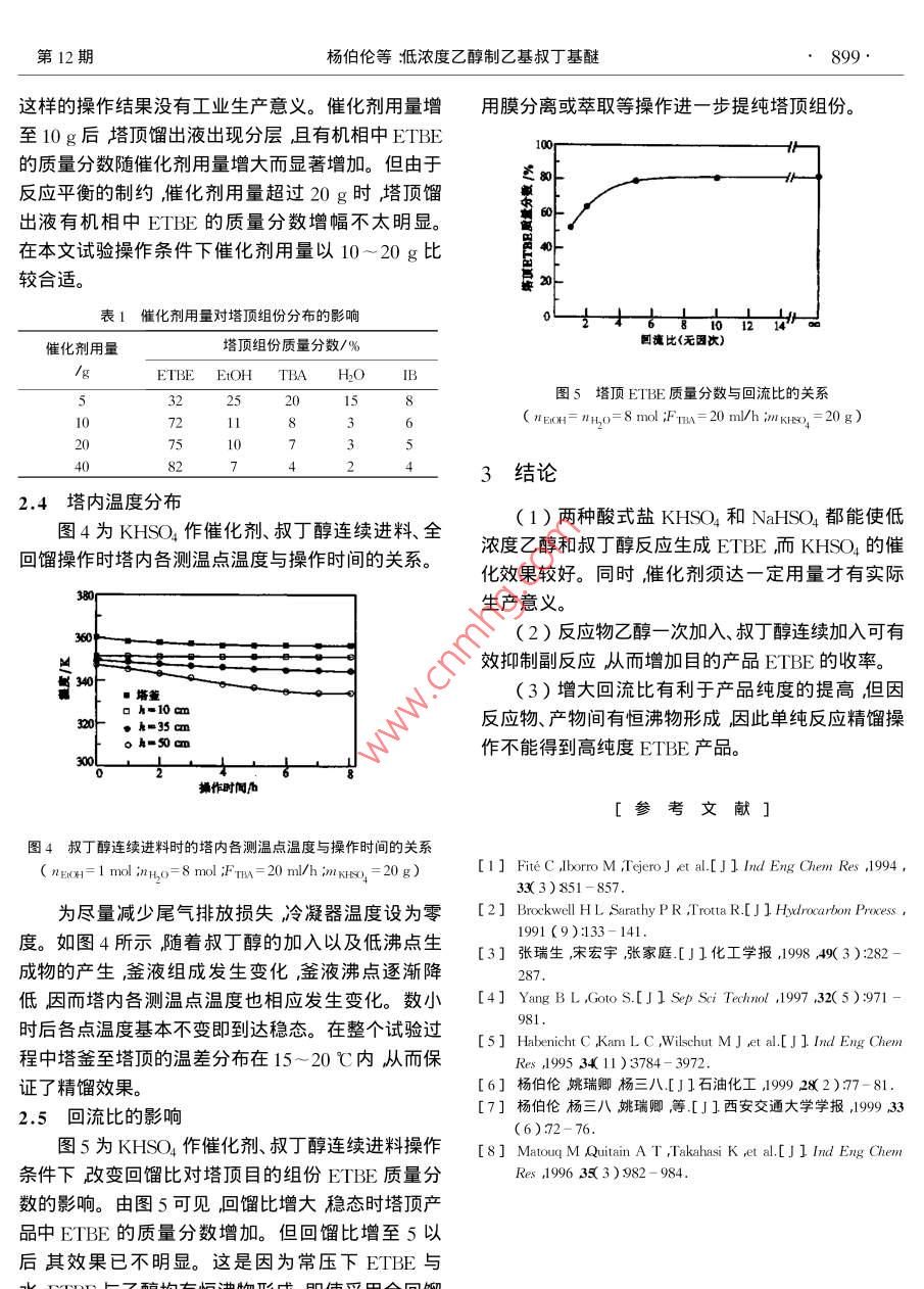 第12期楊伯倫等泜濃度乙醇制乙基叔丁基醚研究與開發(fā),,,2低濃度乙醇制乙基叔丁基醚楊伯倫楊三八西安交通大學環(huán)境與化工學院陜西西安710049)摘要]研究了以叔丁醇及低濃度乙醇為原料用催化精餾技術(shù)制乙基叔丁基醚(EI巸肭工藝。比較了兩種酸式鹽的催化效果。試驗結(jié)果表明在同樣操作祭件下硫酸氫鉀的催化效果優(yōu)于硫酸氫鈉乙醵一次加入、叔丁醇連續(xù)加入可有效抑制叔丁醇分解的副反應(yīng)從而提高產(chǎn)物中EIBE的濃度。[關(guān)鍵詞]乙基叔丁基醚低濃度乙醇摧化精餾[文章編號]1000-814420002-0897-04[中圖分類號]TQ03241[文獻標識碼]A乙基叔丁基醚ETE湜一種在國際上引起廣試劑:化學純,日本東京化成生產(chǎn):硫酸氫鉀:分析泛關(guān)注的環(huán)境友好汽油添加劑其辛烷值、蒸汽壓、純北京市新華試劑廠生產(chǎn)H離子交換容量為含氧量以及調(diào)和性等方面均優(yōu)于甲基叔丁基醚1。7.34mo/kg流酸氫鈉汾析純西安化學試劑廠生因此在一些發(fā)達國家ETEE已進入規(guī)?;a(chǎn)階產(chǎn)H離子交換容量為8.33mo/kg8冰水去離子段2。在我國,因其原料之一乙醇的價格高于甲高純水。醇所以對該產(chǎn)品的開發(fā)還未能引起廣泛重視僅有1.2試驗裝置少量基礎(chǔ)研究報道3試驗裝置如圖1所示以丙烯氧化副產(chǎn)品叔丁釀TBA)代替異丁烯(IB片產(chǎn)ETBE是本文作者提出的一種新的技術(shù)路線4。因為叔丁醇比異丁烯更易與乙醇在酸性催化劑作用下合成ETBE。其主反應(yīng)為Etoh TBafEtbe+h,o該工藝一方面將較高壓力下的醇烯合成改為常壓下的醇縮合從而緩和生產(chǎn)條件;另一方面,可節(jié)約異丁烯原料。而醇之間縮合所得的水可由滲透蒸發(fā)膜分離有效除去6該工藝的另一個特點是降低了對原料乙醇純度的要求因此可以考慮用生物發(fā)酵所得低純度乙醇生產(chǎn)ETBE這樣可大大降低生產(chǎn)成本但是作為合圖1試驗裝置示意圖成用催化劑,陽離子交換樹脂易受水的阻害影1.電加熱套2.恒流泵;3.反應(yīng)錱.填料塔5.溫度計呵7。本工作采用可溶性酸式鹽為催化劑用反應(yīng)6.冷凝器η.回流比控制器♂.低溫恒溫槽⑨.循環(huán)水泵10.貯料糟丌1測溫點精餾的方法將低純度乙醇與叔丁醇反應(yīng)直接合成反應(yīng)釜兼再沸器是一個500ml三口燒瓶上接ETBE。1試驗部分收稿日期]2000-01-241.1原料[作者簡介]楊伯俗1954-)男陜西省西安市人搏士教授電話石油化工898PETROCHEMICAL TECHNOLOGY2000年第29卷內(nèi)徑3cm、高60cm的精餾柱柱內(nèi)填有自制的不銹鋼絲網(wǎng)填料塔身設(shè)有3個測溫點。塔釜由電v EtOH TBA述即0·EmBE·Ho加熱套加熱塔頂所接冷凝器由低溫恒溫槽冷卻冷凝器下部連接一電磁循環(huán)定時控制器以控制回流比。連續(xù)進料時使用蠕動泵。1.3試驗程序在反應(yīng)釜內(nèi)先加入1mo乙醇以及8m水近似于生物發(fā)酵所得乙醇濃度)同時稱取一定量的酸操作時間式鹽KHSO4或 NaSO4)與上述混合物在反應(yīng)釜內(nèi)加熱至沸騰。待穩(wěn)定后再將另一反應(yīng)物叔丁醇圖ⅩB)叔丁醇連續(xù)進料時塔頂組份的質(zhì)量分數(shù)分別以一次加入1mol)連續(xù)式加入(20ml/h)兩與操作時間的關(guān)系(nEIOH=I mol ;n,=8 mol FTBA-20 ml/h int KHso, 20 g)種方式加入并以叔丁醇加入時間為操作開始時間。本文將乙醇、叔丁醇及催化劑一次加入的間歇操作,叔丁醇以體積流率(Fm)0m/h連續(xù)加入時(圖與乙醇、催化劑一次加入而叔丁醇以一定流速加入2B)反應(yīng)場內(nèi)總是保持乙醇過量,使叔丁醇分解的的半連續(xù)操作時的催化精餾效果進行了試驗比較。副反應(yīng)得以有效抑制,從而保證生成ETHE的主反塔頂組份采用上海分析儀器廠的(C-122氣應(yīng)進行。因此達穩(wěn)態(tài)后塔頂產(chǎn)物中IB的質(zhì)量分數(shù)相色譜儀進行分析。在試驗條件下塔頂餾出物一降低到4.5%而ETBE的質(zhì)量分數(shù)增高到77%。般分層形成水相和有機相2.2催化劑種類的影響圖3為同樣取20 gNaHSO4作催化劑叔丁醇2結(jié)果與討論連續(xù)進料且采用全回餾操作時塔頂組份的質(zhì)量分數(shù)2.1加料方式的影響與操作時間的關(guān)系。與相同的反應(yīng)條件下的圖2B前期動力學研究結(jié)果表硏,常壓下,叔丁醇比較穩(wěn)態(tài)時所獲產(chǎn)物中ETBE的質(zhì)量分數(shù)較低,除了與乙醇反應(yīng)生成ETBE外還同時有自身分解副產(chǎn)物B的質(zhì)量分數(shù)較高。這一結(jié)果可用兩種催為異丁烯和水的副反應(yīng)發(fā)生(TBA→H2O+邗B)因化劑的酸性強弱解釋。因為 Naso4的酸性強于此盡量抑制分解副反應(yīng)發(fā)生,對于提高目的產(chǎn)品KHSO這將使叔丁醇分解的副反應(yīng)更易進行因ETBE的收率至關(guān)重要。本試驗采用兩種加料方此其總體效果遜于KHSO式考察其抑制副反應(yīng)的作用。圖2A圖2B為采用20 g KHSO4作催化劑全BtOH。TBA回流操作兩種不同進料方式的試驗結(jié)果。當叔丁醇遲8·EBE·Hp次性加入圖2A)穩(wěn)態(tài)后塔頂ETBE、IB的質(zhì)量分數(shù)分別為72%、7.5%。與一次性進料比較當v EtOH。TBA0·ETBE·Hp操作時間h圖3使用 NaSO4時塔頂組份的質(zhì)量分數(shù)與操作時間的關(guān)系(nEIGH=I mol nHo=8 mol :FTBA=20 mI/h mI NHso.=20 g)2.3催化劑用量的影響婚作時聞西表1為叔丁醇連續(xù)進料且采用全回餾操作、KHSO催化劑用量改變時操作達穩(wěn)態(tài)(6h