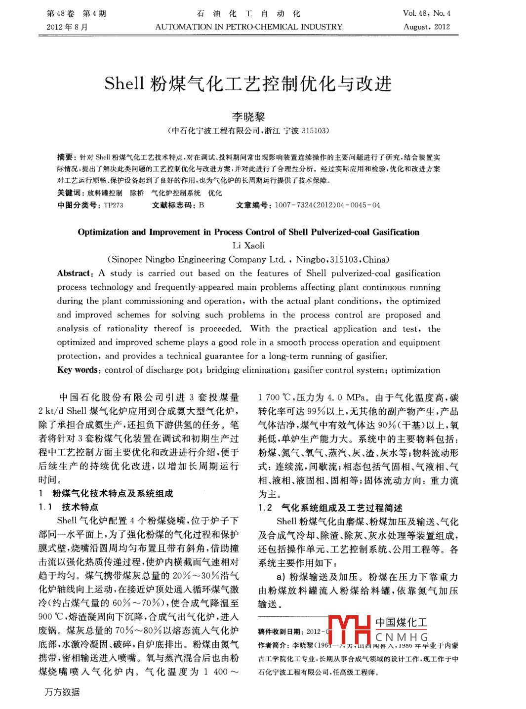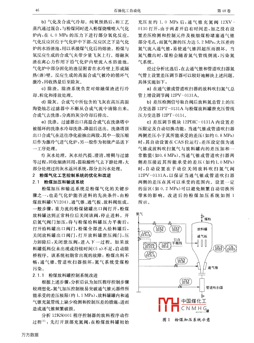 第48卷第4期石油化工自動(dòng)化Vol. 48, No. 42012年8月AUTOMATION IN PETRO-CHEMICAL INDUSTRYAugust, 2012Shell粉煤氣化工藝控制優(yōu)化與改進(jìn)李曉黎(中石化寧波工程有限公司,浙江寧波315103)摘要:針對(duì)Shel粉煤氣化工藝技術(shù)特點(diǎn),對(duì)在調(diào)試、投料期間常出現(xiàn)影響裝置連續(xù)操作的主要問(wèn)題進(jìn)行了研究,結(jié)合裝置實(shí)際情況,提出了解決此類(lèi)問(wèn)題的工藝控制優(yōu)化與改進(jìn)方案,并對(duì)此進(jìn)行了合理性分析。經(jīng)過(guò)實(shí)際應(yīng)用和檢驗(yàn),優(yōu)化和改進(jìn)方案對(duì)工藝運(yùn)行順暢、保護(hù)設(shè)備起到了良好的作用,也為氣化爐的長(zhǎng)周期運(yùn)行提供了技術(shù)保障。關(guān)鍵詞:放料罐控制除橋氣化爐控制系統(tǒng) 優(yōu)化中圖分類(lèi)號(hào): TP273文獻(xiàn)標(biāo)志碼: B文章編號(hào): 1007 - 7324(2012)04 -0045-04Optimization and Improvement in Process Control of Shell Pulverized-coal GasificationLi Xaoli(Sinopec Ningbo Engineering Company Ltd.,Ningbo,315103 ,China)Abstract: A study is carried out based on the features of Shell pulverized-coal gasificationprocess technology and frequently- appeared main problems affecting plant continuous runningduring the plant commissioning and operation, with the actual plant conditions, the optimizedand improved schemes for solving such problems in the process control are proposed andanalysis of rationality thereof is proceeded. With the practical application and test, thoptimized and improved scheme plays a good role in a smooth process operation and equipmentprotection, and provides a technical guarantee for a long-term running of gasifier.Key words: control of discharge pot; bridging elimination; gasifier control system; optimization中國(guó)石化股份有限公司引進(jìn)3套投煤量1 700°C,壓力為4.0 MPa。 由于氣化溫度高,碳2 kt/d Shell煤氣化爐應(yīng)用到合成氨大型氣化爐,轉(zhuǎn)化率可達(dá)99%以上,無(wú)其他的副產(chǎn)物產(chǎn)生,產(chǎn)品除了承擔(dān)合成氨生產(chǎn),還擔(dān)負(fù)下游供氫的任務(wù)。筆氣體潔凈,煤氣中有效氣體達(dá)90%(干基)以上,氧者將針對(duì)3套粉煤氣化裝置在調(diào)試和初期生產(chǎn)過(guò)耗低,單爐生產(chǎn)能力大。系統(tǒng)中的主要物料包括:程中工藝控制方面主要優(yōu)化和改進(jìn)進(jìn)行介紹,便于粉煤氮?dú)狻⒀鯕?、蒸汽、灰、渣、灰水?物料流動(dòng)形后續(xù)生產(chǎn)的持續(xù)優(yōu)化改進(jìn),以增加長(zhǎng)周期運(yùn)行式:連續(xù)流,間歇流;相態(tài)包括氣固相、氣液相、氣時(shí)間。相、液相、液固相、固相等;固體流動(dòng)方向:重力流1粉煤氣化技術(shù)特 點(diǎn)及系統(tǒng)組成為主。1.1 技術(shù)特點(diǎn)1.2氣化 系統(tǒng)組成及工藝過(guò)程簡(jiǎn)述Shell氣化爐配置4個(gè)粉煤燒嘴,位于爐子下Shell粉煤氣化由磨煤、粉煤加壓及輸送、氣化部同一水平面上,為了強(qiáng)化粉煤的氣化過(guò)程和保護(hù)及合成氣冷卻、除渣除灰、灰水處理等裝置組成,膜式壁,燒嘴沿圓周均勻布置且?guī)в行苯?借助撞還包括操作單元、工藝控制系統(tǒng)、公用工程等。各擊流以強(qiáng)化熱質(zhì)傳遞過(guò)程,使?fàn)t內(nèi)橫截面氣速相對(duì)系統(tǒng)主要作用如下:趨于均勻。煤氣攜帶煤灰總量的20% ~30%沿氣a)粉煤輸送及加壓。粉煤在壓力下靠重力化爐軸線(xiàn)向上運(yùn)動(dòng),在接近爐頂處通人循環(huán)煤氣激由粉煤放料罐流入粉煤給料罐,依靠氮?dú)饧訅豪?約占煤氣量的60% ~70%),使合成氣降溫至輸送。900 °C ,熔渣凝固向下沉降,合成氣出氣化爐,進(jìn)入中國(guó)煤化工廢鍋。煤灰總量的70%~80%以熔態(tài)流人氣化爐稿件收到日期: 2012-底部,水激冷凝固、破碎,自爐底排出。粉煤由氮?dú)?THCNMH G作者簡(jiǎn)介:李曉黎(1964一),另,山四網(wǎng)昌人,1980平畢業(yè)于內(nèi)蒙攜帶,密相輸送進(jìn)人噴嘴。氧與蒸汽混合后也由粉古工學(xué)院化工專(zhuān)業(yè),長(zhǎng)期從事合成氣領(lǐng)域的設(shè)計(jì)工作,現(xiàn)工作于中煤燒嘴噴人氣化爐內(nèi)。氣化溫度為1400~石化寧波工程有限公司,任高級(jí)工程師。40石油化工自動(dòng)化第48卷b)氣化及合成氣冷卻。純氧預(yù)熱后,和工藝充壓至約1.0MPa后,通氣錐充氮閥12XV-蒸汽通過(guò)混合,與粉煤同時(shí)進(jìn)人粉煤燒嘴噴入氣化0130打開(kāi),由于兩者開(kāi)啟有時(shí)間差,加之沒(méi)有設(shè)爐內(nèi),在4.0MPa的壓力下進(jìn)行部分氧化反應(yīng)。置差壓檢測(cè)和控制元件及極細(xì)煤粉堵塞通氣錐氣化反應(yīng)區(qū)位于氣化爐中下部,反應(yīng)區(qū)之下是氣化部分毛孔,而氮?dú)庠吹膲毫_(dá)5. 2 MPa,大壓差的爐的水浴渣池,用以承接煤氣化后的熔渣。粉煤與氮?dú)饬魅送忮F, 易使通氣錐因超壓而損壞。當(dāng)氧反應(yīng)生成的合成氣夾帶少量飛灰上行。熔融灰氮?dú)獬烦鰰r(shí),煤粉會(huì)隨著氨氣管線(xiàn)倒流,污染氮渣在離心力作用下沿氣化爐內(nèi)壁流入水浴渣池。氣系統(tǒng)。氣化爐中部分固化的渣層附著在水冷壁上形成隔經(jīng)過(guò)分析比選后,在去通氣錐和管道吹掃器氮熱(渣)壁。反應(yīng)生成的高溫合成氣被冷的循環(huán)氣氣管上設(shè)置差壓調(diào)節(jié)器可以較好地解決上述問(wèn)題。激冷,回收熱量后至除灰。具體實(shí)施如下:c)除渣。除渣系統(tǒng)