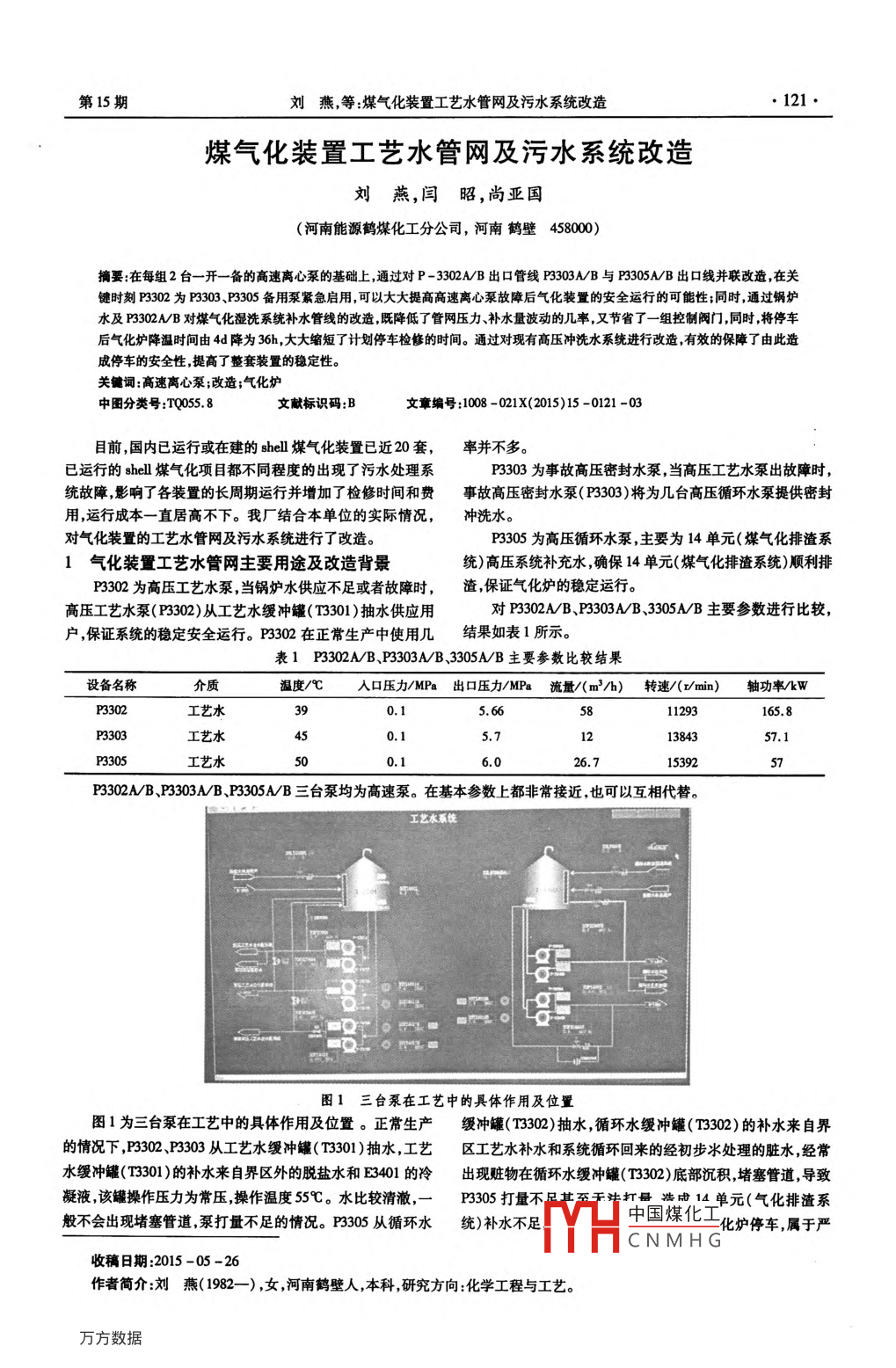 山東化工122●SHANDONG CHEMICAL INDUSTRY2015年第44卷重的生產(chǎn)事故。在這樣的環(huán)境下,為保證氣化爐的安全長穩(wěn)- 3301經(jīng)高速離心泵P - 3302AVB后,經(jīng)閥門33PV0008B8和運行,將不經(jīng)常使用的P3302作為P3303、P3305的備用泵,16FV0014后進人C- 1601。在P3303、P3305出現(xiàn)故障或者打量不足的情況下,啟動由于殼牌煤氣化污水處理系統(tǒng)所處理污水主要來自于P3302為系統(tǒng)補水,確保系統(tǒng)的穩(wěn)定運行,避免不必要的停車排渣系統(tǒng)及濕洗系統(tǒng),污水固含量較高,其主要組份為煤泥、造成的損失。飛灰等。污水處理系統(tǒng)中的重要設(shè)備C- 1701內(nèi)有三段填另外,在氣化裝置停車檢修期間,氣化爐降溫一直是一料層,主要填料為馬鞍環(huán)。在系統(tǒng)運行過程中,污水處理系個較為費事的問題,通常情況下,通過自然通風(fēng)降溫,時間至統(tǒng)易出現(xiàn)管道磨損、汽提塔堵塞、煤泥真空過濾機運行效果少需要4天以上,在溫度較高季節(jié)可能長達一周,嚴重影響差等問題。檢修進度,因而,如何縮短氣化爐停車后降溫時間是一項亟2 氣化裝 置工藝水管網(wǎng)改造內(nèi)容待解決的問題。P3302改為P3303、P3305的主要內(nèi)容就是將使用幾率不如果能將C1601(氣化濕洗系統(tǒng))的補水引人氣化水汽大的P3302改為容易出現(xiàn)故障或者打量不足的P3303、P3305系統(tǒng),就會大大的縮短降溫速率,為氣化裝置檢修節(jié)省時間。的備用泵,在P3303、P3305出現(xiàn)故障或者打量不足的時候,在實際使用中,C- 1601的補水有兩路,分別為正常生產(chǎn)期P3302可以緊急為14單元(氣化排渣系統(tǒng))補充所需的工藝間外來鍋爐水經(jīng)33PV0008A、E - 3301冷卻降溫,然后再經(jīng)循環(huán)水,以保證系統(tǒng)的安全長穩(wěn)運行。16FV0014后進人C - 1601,另-路為備用水,由工藝水管T改造圖如圖2所示。T3301T3302去用戶QP3305EABE3301P330316FV001433P0008B33PV0008A西P3302A/BC1601]去氣化爐循環(huán)冷卻水系統(tǒng)圖2改造圖由于氣化爐內(nèi)部為-套水冷結(jié)構(gòu) ,通過向其注人溫度較提和漿料濃縮系統(tǒng)可分為兩步;第-步是酸性灰漿氣提,它低的鍋爐水,可有效降溫,從而達到縮短停車后降爐溫的目是在C-1701內(nèi),溫度控制在135~140C,壓力控制在0.18的。在鍋爐補水進入C- 1601之前,在主管線上加- -支線,~0. 20MPa,低壓蒸汽自下而上,從除渣、濕洗來的循環(huán)水自連接氣化爐循環(huán)冷卻水系統(tǒng)的驅(qū)動泵P- 1301的出口導(dǎo)淋.上而下,在填料床層上充分接觸,交換熱量,分離出CO2、上,可在氣化爐停車后經(jīng)E -3301降溫后的鍋爐水輸人氣化HS、NIH,、HCN HCl等氣體;第二步是氣提后的循環(huán)水以及爐水汽系統(tǒng)來有效降溫。也可以通過P3302代替P3303、從脫水槽來循環(huán)水從澄清槽中央加人,同時加人絮凝劑,使P3305供應(yīng)工藝水降溫。其固體懸浮物濃縮、長大、自然沉淀,沉降至澄清槽底部,形系統(tǒng)開停車的過程中或者系統(tǒng)大幅波動的情況下,經(jīng)常成液固分離,干凈的水從澄清槽外側(cè)溢出,流人溢流槽,再經(jīng)造成排渣系統(tǒng)固含量較高,尤其在系統(tǒng)開車時固含量可達泵打到分配系統(tǒng)。底部出來的灰漿繼續(xù)濃縮,最后通過真空1025 kg/Nm' ,經(jīng)sss給料泵送至酸性灰漿氣提塔時,造成填吸附形成灰漿餅,含固量達到50%。料層堵塞汽提塔底排污水泵進口過濾器堵塞、汽提塔底排3.2工藝特點污水泵進口管道堵塞,嚴重影響了污水處理系統(tǒng)的正常利用酸性氣體在水中溶解度隨溫度升高而降低,壓力降運行。低而降低的原理.格循環(huán)水的酸性氣體分離出來。3污水處理 系統(tǒng)的工藝原理及特點加人絮中國煤化工,起到了清水灰漿3.1 工藝原理.分離的效果。YHCNMHG從除渣系統(tǒng)、濕洗系統(tǒng)來的循環(huán)水既是富含酸性氣體的從濕洗系統(tǒng)來的循環(huán)水富含酸性氣體,從渣池處理系統(tǒng)循環(huán)水又是含有一-定濃度灰分的循環(huán)水。整個酸性灰漿氣來的循環(huán)水富含 Ca2*、Mg*等離子,為防止在氣體中形成第15期劉燕,等:煤氣化裝置工藝水管網(wǎng)及污水系統(tǒng)改造●123●CaCO3、MgCO3等沉淀,將濕洗循環(huán)水打到氣提塔上部填料尤其是排渣系統(tǒng)來的渣水,經(jīng)水力旋流器后,其水中全固最層頂部,渣處理循環(huán)水打到氣提塔下層填料層頂部。同時鹽基本在 2%左右。在開車初期,煤粉管線控制不好的情況下,酸的加人更進- -步 防止沉淀物的出現(xiàn)。全固含量最高可達10%,對現(xiàn)場管道、閥門、設(shè)備磨損較為4污水處理 系統(tǒng)主要存在的問題嚴重。Shell煤氣化污水處理工藝在正常的生產(chǎn)過程中主要存5 污水 處理系統(tǒng)工藝改造在以下問題:酸性灰漿氣提塔填料堵塞,造成系統(tǒng)癱瘓;閥系統(tǒng)開停車的過程中或者系統(tǒng)大幅波動的情況下,經(jīng)常門、設(shè)備磨損嚴重,現(xiàn)場泄漏嚴重;密封水壓力低,造成機泵造成排渣系統(tǒng)固含量較高,尤其在系統(tǒng)開車時固含量可達損壞;污水外排指標( COD、氨氮)超標;真空過濾機過濾效果1025 kg/Nm' ,經(jīng)sss給料泵送至酸性灰漿氣提塔時,造成填不好等。料層堵塞、汽提塔底排污水泵進口過濾器堵塞、汽提塔底排4.1 C-1701堵塞問題污水泵進口管道堵塞,嚴重影響了污水處理系統(tǒng)的正常填料堵塞;運行