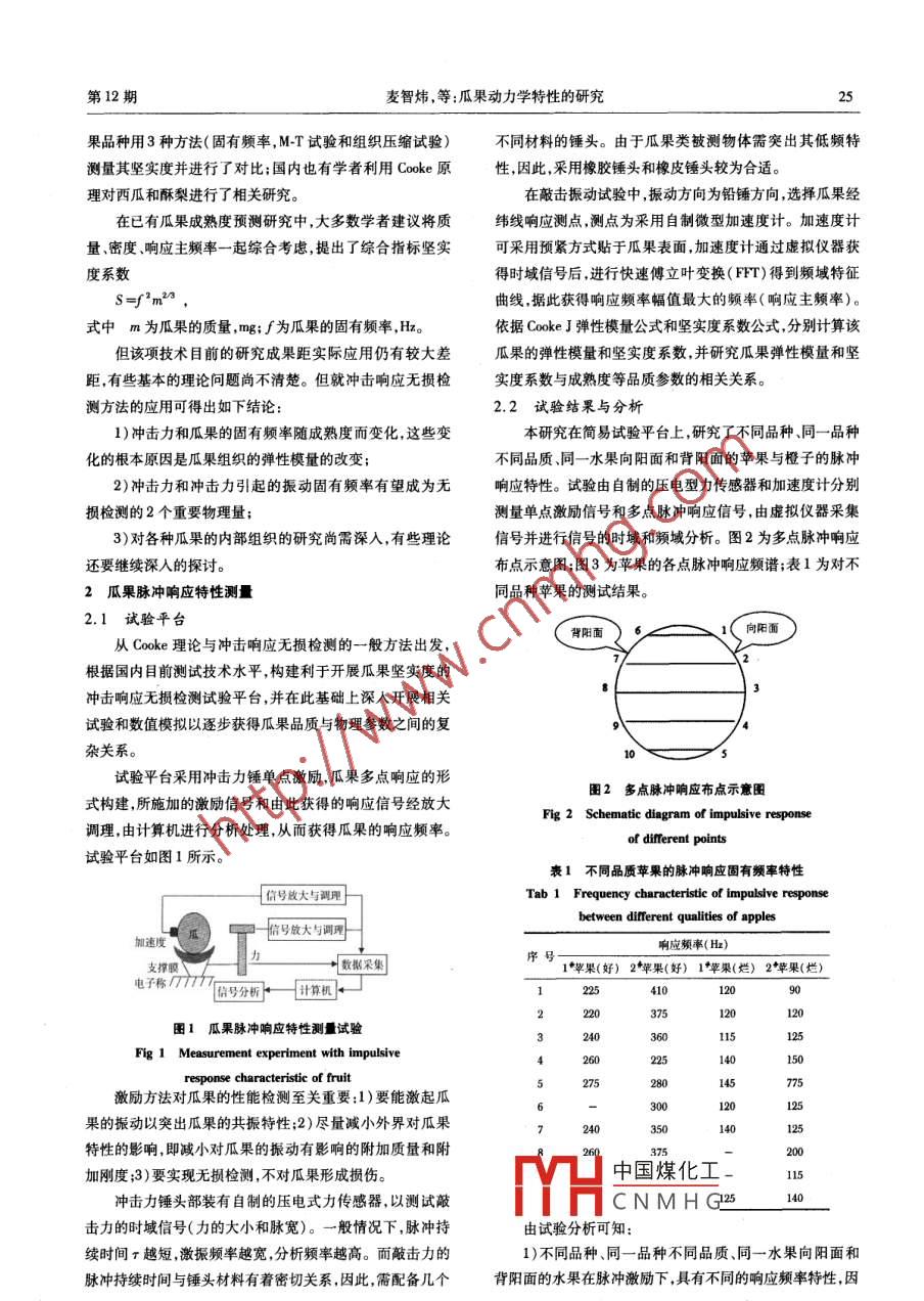 傳感器與微系統(tǒng)( Transducer and Microsystem Technologies2009年第28卷第12期瓜果動力學(xué)特性的研究麥智煒,劉洪山,李明(華南農(nóng)業(yè)大學(xué)工程學(xué)院廣東廣州510642)摘要:同傳統(tǒng)的瓜果品質(zhì)檢測技術(shù)相比,瓜果無損檢測技術(shù)能對每個瓜果進(jìn)行品質(zhì)鑒定,鑒定結(jié)果更加準(zhǔn)確。從 Cooke理論出發(fā),采用自行研制的微型壓電加速度計構(gòu)建試驗平臺,對不同品種、同一品種不同品質(zhì)、同一水果不同部位的蘋果和橙子的脈沖響應(yīng)特性進(jìn)行了初步研究,試驗結(jié)果表明:不同品質(zhì)的水果具有不同的沖擊響應(yīng)頻率,由此提出了瓜果品質(zhì)脈沖響應(yīng)特性檢測系統(tǒng)的構(gòu)想關(guān)鍵詞:水果;壓電加速度計;脈沖響應(yīng)特性;檢測系統(tǒng)中圖分類號:TH82文獻(xiàn)標(biāo)識碼:A文章編號:1000-9787(2009)12-0024-0Study on melon and fruits dynamic characteristicMAI Zhi-wei, LIU Hong-shan, LI MingCollege of Engineering, South China Agricultural University, Guangzhou 510642, China)Abstract: Compared with traditional measurement technique of fruits, non-destructive testing of fruit is suitablefor testing every fruits. From the Cooke theory, the experimental platform based on a self-developed micro-piezoelectric accelerometer is used. The platform is used to study the impulsive response charactoristic betweendifferent kinds of fruits, different quality of same fruits, and different parts of one fruit. The experiment resultsshow that the detection system of melon and fruit with the impulsive excitation response is advancedKey words: fruit; piezoelectric accelerometer; impulsive response charactoristic; detection system0引言貯存過程中,表征細(xì)胞間結(jié)合力變化的物理指標(biāo)。一般情瓜果的力學(xué)特性是對瓜果進(jìn)行品質(zhì)評價的主要指標(biāo)之況下,細(xì)胞間的結(jié)合力變小,堅實度變?nèi)?成熟度提高其中,瓜果堅實度是表示瓜果軟硬程度的量。它主要取Cooke J等人利用瓜果振動的固有頻率檢測其堅實度,決于瓜果本身的彈性模量、屈服強度、塑性、脆性以及內(nèi)部建立了瓜果簡化為線彈性球體的動力學(xué)模型,并通過理論分子結(jié)構(gòu)、結(jié)晶狀態(tài)及原子間的鍵合力等因素。分析得到了各向同性的線彈性球狀瓜果的固有頻率與其材Salveit M E等人田(1985)和 Armstrong P等人2料彈性模量的關(guān)系為(1990)的研究表明:蘋果、西紅柿和西瓜的共振頻率均隨E-2(1ta)(6m著貯藏時間的延長而減小,并與硬度顯著相關(guān)。 Chen H等人2(196。)研制出了一種低質(zhì)量高速的撞擊傳感器用來式中E為瓜果的彈性模量,MPap為瓜果的密度,gmm測量桃子硬度。饒秀勤和應(yīng)義斌(2004)用他們設(shè)計的為瓜果的泊松比;m為瓜果的質(zhì)量,mg;為歸一化頻率水果聲學(xué)特性測試系統(tǒng)測試了14只麒麟西瓜。G6 mez A H Hz; f為瓜果的固有頻率Hz等人5(2005)肯定了敲擊共振法與其他物理測定法在梨經(jīng)測量得到固有頻率f后,由上式可以估算出瓜果的質(zhì)地狀況檢測上的相關(guān)性。屠康等人6(2008)利用敲擊彈性模量E,從而確定其堅實度此即為用沖擊響應(yīng)固有頻共振方法對新高梨的品質(zhì)進(jìn)行了無損檢測。率檢測瓜果堅實度的基本原理。本文從 Cooke理論出發(fā),采用自行研制的加速度計,利用瓜果振動的固有頻率檢測其堅實度為眾多學(xué)者所對不同情況下的球形水果進(jìn)行脈沖響應(yīng)特性測量從而判關(guān)注,雖然他們的測量方法和技術(shù)不完全相同,但其基本原斷水果的堅實度并由此提出采用瓜果動力學(xué)特性判斷瓜理均np第用沖擊振動產(chǎn)生的噪品質(zhì)研究的構(gòu)想。聲和中國煤化工士的堅實度; Louis等人1瓜果動力學(xué)特性研究的基本原理研CNMHG-T結(jié)果的變化及蘋沖擊響應(yīng)無損檢測瓜果堅實度是基于檢測瓜果生長和果皮對固有頻率的影響;Abot等人對美國的2個主要蘋收稿日期:2009-060第12期麥智煒,等:瓜果動力學(xué)特性的研究果品種用3種方法(固有頻率,M-T試驗和組織壓縮試驗)不同材料的錘頭。由于瓜果類被測物體需突出其低頻特測量其堅實度并進(jìn)行了對比;國內(nèi)也有學(xué)者利用 Cooke原性,因此,采用橡膠錘頭和橡皮錘頭較為合適。理對西瓜和酥梨進(jìn)行了相關(guān)研究。在敲擊振動試驗中,振動方向為鉛錘方向,選擇瓜果經(jīng)在已有瓜果成熟度預(yù)測研究中,大多數(shù)學(xué)者建議將質(zhì)緯線響應(yīng)測點測點為采用自制微型加速度計。加速度計量、密度、響應(yīng)主頻率一起綜合考慮,提出了綜合指標(biāo)堅實可釆用預(yù)緊方式貼于瓜果表面加速度計通過虛擬儀器獲度系數(shù)得時域信號后,進(jìn)行快速傅立葉變換(FFT)得到頻域特征曲線,據(jù)此獲得響應(yīng)頻率幅值最大的頻率(響應(yīng)主頻率)式中m為瓜果的質(zhì)量,mg;f為瓜果的固有頻率,Hz依據(jù) Cooke J彈性模量公式和堅實度系數(shù)公式,分別計算該但該項技術(shù)目前的研究成果距實際應(yīng)用仍有較大差瓜果的彈性模量和堅實度系數(shù),并研究瓜果彈性模量和堅距,有些基本的理論問題尚不清楚。但就沖擊響應(yīng)無損檢實度系數(shù)與成熟度等品質(zhì)參數(shù)的相關(guān)關(guān)系測方法的應(yīng)用可得出如下結(jié)論2.2試驗結(jié)果與分析1)沖擊力和瓜果的固有頻率隨成熟度而變化,這些變本研