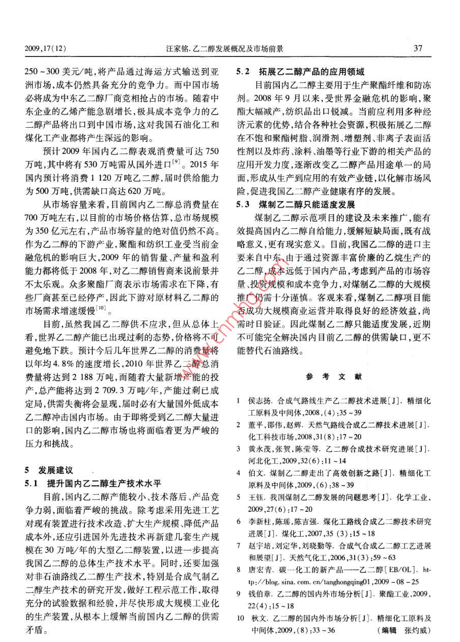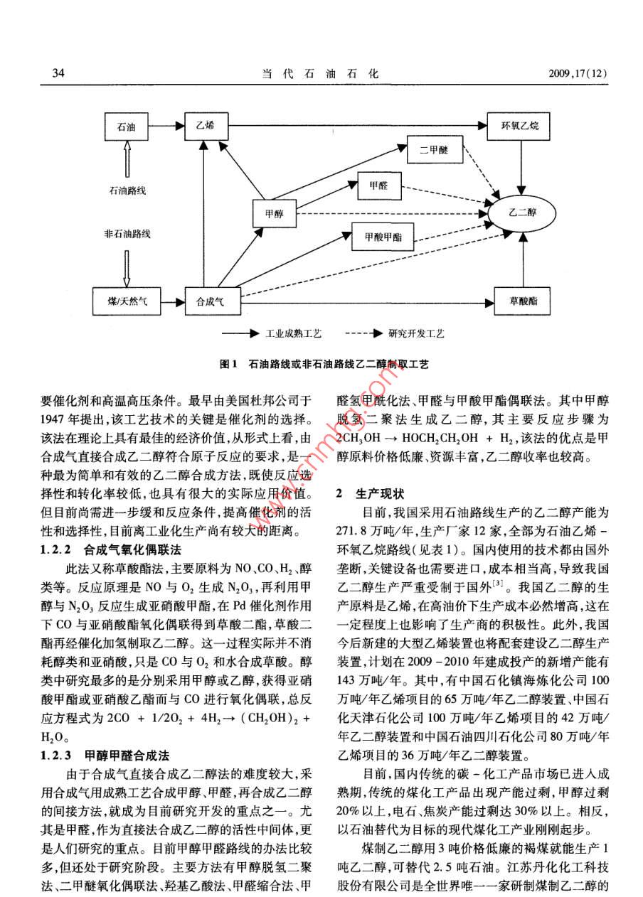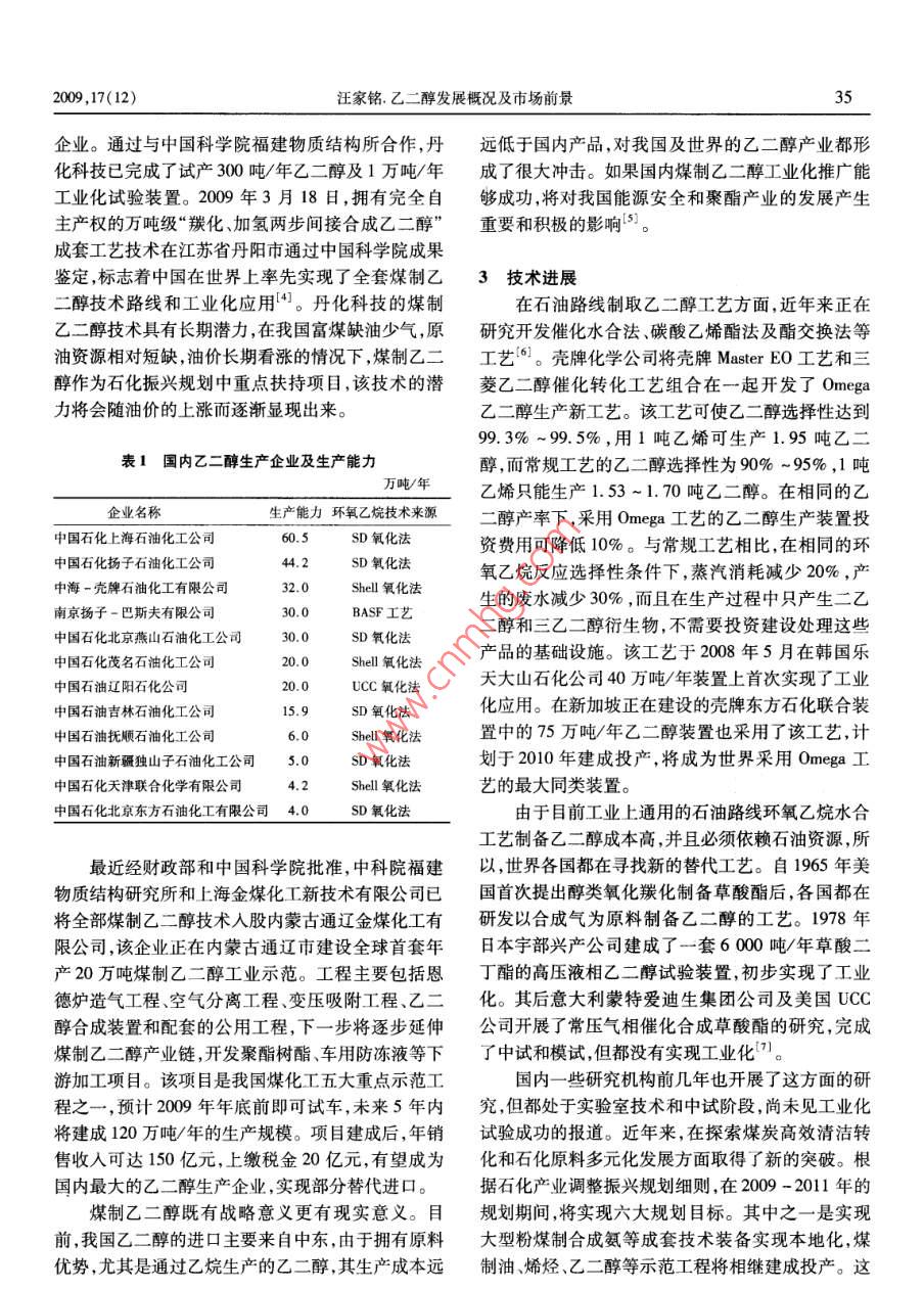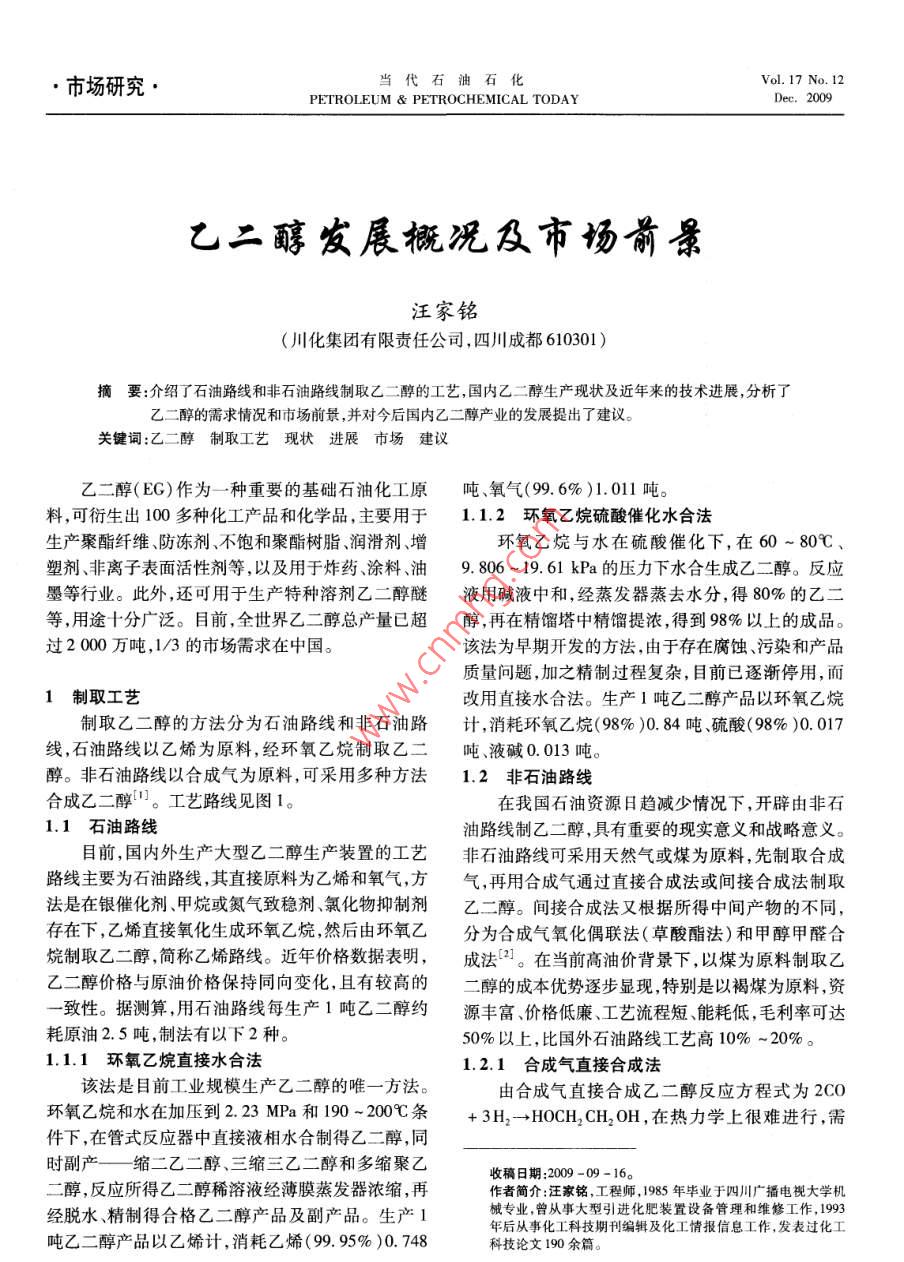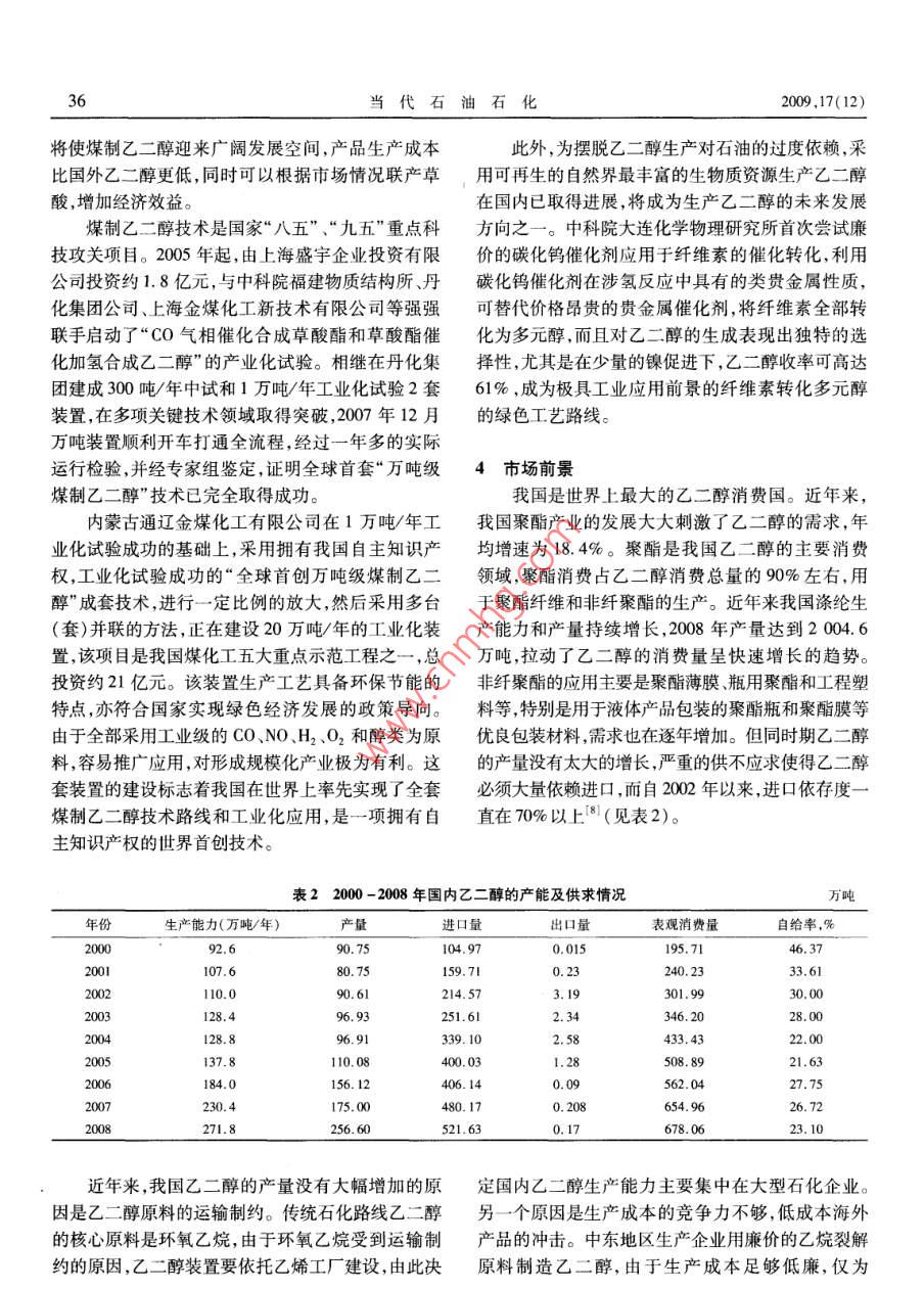 ·市場研究當代石油石化 Vol. 17 No. 12 PETROLEUM PETROCHEMICAL TODAYDec.2009乙二醇發(fā)展概況及市場前景汪家銘(川化集團有限責任公司,四川成都610301)摘要:介紹了石油路線和非石油路線制取乙二醇的工藝,國內乙二醇生產(chǎn)現(xiàn)狀及近年來的技術進展,分析了乙二醇的需求情況和市場前景,并對今后國內乙二醇產(chǎn)業(yè)的發(fā)展提出了建議。關鍵詞:乙二醇制取工藝現(xiàn)狀進展市場建議乙二醇(EG)作為一種重要的基礎石油化工原噸、氧氣(99.6%)1.011噸。料,可衍生出100多種化工產(chǎn)品和化學品,主要用于1.1.2環(huán)氧乙烷硫酸催化水合法生產(chǎn)聚酯纖維、防凍劑、不飽和聚酯樹脂、潤滑劑、增環(huán)氧乙烷與水在硫酸催化下,在60~80℃、塑劑非離子表面活性劑等,以及用于炸藥涂料、油9.806~19.61kPa的壓力下水合生成乙二醇。反應墨等行業(yè)。此外,還可用于生產(chǎn)特種溶劑乙二醇醚液用堿液中和,經(jīng)蒸發(fā)器蒸去水分,得80%的乙二等,用途十分廣泛。目前,全世界乙二醇總產(chǎn)量已超醇,再在精餾塔中精餾提濃,得到98%以上的成品。過2000萬噸,1/3的市場需求在中國。該法為早期開發(fā)的方法,由于存在腐蝕、污染和產(chǎn)品質量問題,加之精制過程復雜,目前已逐漸停用,而1制取工藝改用直接水合法。生產(chǎn)1噸乙二醇產(chǎn)品以環(huán)氧乙烷制取乙二醇的方法分為石油路線和非石油路計,消耗環(huán)氧乙烷(98%)0.84噸、硫酸(98%)0.017線,石油路線以乙烯為原料,經(jīng)環(huán)氧乙烷制取乙二噸、液堿0.013噸。醇。非石油路線以合成氣為原料,可采用多種方法1.2非石油路線合成乙二醇。工藝路線見圖1。在我國石油資源日趨減少情況下,開辟由非石1.1石油路線油路線制乙二醇,具有重要的現(xiàn)實意義和戰(zhàn)略意義。目前,國內外生產(chǎn)大型乙二醇生產(chǎn)裝置的工藝非石油路線可采用天然氣或煤為原料,先制取合成路線主要為石油路線,其直接原料為乙烯和氧氣方氣,再用合成氣通過直接合成法或間接合成法制取法是在銀催化劑、甲烷或氮氣致穩(wěn)劑、氯化物抑制劑乙二醇。間接合成法又根據(jù)所得中間產(chǎn)物的不同,存在下,乙烯直接氧化生成環(huán)氧乙烷,然后由環(huán)氧乙分為合成氣氧化偶聯(lián)法(草酸酯法)和甲醇甲醛合烷制取乙二醇,簡稱乙烯路線。近年價格數(shù)據(jù)表明成法。在當前高油價背景下,以煤為原料制取乙乙二醇價格與原油價格保持同向變化,且有較高的二醇的成本優(yōu)勢逐步顯現(xiàn),特別是以褐煤為原料,資一致性。據(jù)測算,用石油路線每生產(chǎn)1噸乙二醇約源豐富、價格低廉、工藝流程短、能耗低,毛利率可達耗原油2.5噸,制法有以下2種。50%以上,比國外石油路線工藝高10%~20%。1.1.1環(huán)氧乙烷直接水合法1.2.1合成氣直接合成法該法是目前工業(yè)規(guī)模生產(chǎn)乙二醇的唯一方法。由合成氣直接合成乙二醇反應方程式為2CO環(huán)氧乙烷和水在加壓到2.23MPa和190200℃條+3h2→hoch2CH2OH,在熱力學上很難進行,需件下,在管式反應器中直接液相水合制得乙二醇,同時副產(chǎn)縮二乙二醇、三縮三乙二醇和多縮聚乙收稿日期:2009-09-16二醇,反應所得乙二醇稀溶液經(jīng)薄膜蒸發(fā)器濃縮,再作者簡介:汪家銘,工程師,1985年畢業(yè)于四川廣播電視大學機經(jīng)脫水、精制得合格乙二醇產(chǎn)品及副產(chǎn)品。生產(chǎn)1械專業(yè),曾從事大型引進化肥裝置設備管理和維修工作,1993年后從事化工科技期刊編輯及化工情報信息工作,發(fā)表過化工噸乙二醇產(chǎn)品以乙烯計,消耗乙烯(99.95%)0.748科技論文190余篇。34當代石油石化2009,17(12)石油乙烯環(huán)氧乙烷二甲醚石油路線甲醛甲醇乙二醇非石油路線甲酸甲酯煤/天然氣合成氣草酸酯工業(yè)成熟工藝--研究開發(fā)工藝圖1石油路線或非石油路線乙二醇制取工藝要催化劑和高溫高壓條件最早由美國杜邦公司于醛氫甲?;ā⒓兹┡c甲酸甲酯偶聯(lián)法。其中甲醇1947年提出,該工藝技術的關鍵是催化劑的選擇。脫氫二聚法生成乙二醇,其主要反應步驟為該法在理論上具有最佳的經(jīng)濟價值,從形式上看,由2cH3OH→HOCH2CH2OHH2,該法的優(yōu)點是甲合成氣直接合成乙二醇符合原子反應的要求,是一醇原料價格低廉、資源豐富,乙二醇收率也較高。種最為簡單和有效的乙二醇合成方法,既使反應選擇性和轉化率較低,也具有很大的實際應用價值2生產(chǎn)現(xiàn)狀但目前尚需進一步緩和反應條件,提高催化劑的活目前,我國采用石油路線生產(chǎn)的乙二醇產(chǎn)能為性和選擇性,目前離工業(yè)化生產(chǎn)尚有較大的距離。271.8萬噸/年,生產(chǎn)廠家12家,全部為石油乙烯1.2.2合成氣氧化偶聯(lián)法環(huán)氧乙烷路線(見表1)。國內使用的技術都由國外此法又稱草酸酯法,主要原料為NO、COH2、醇壟斷,關鍵設備也需要進口,成本相當高,導致我國類等。反應原理是NO與O2生成N2O3,利用甲乙二醇生產(chǎn)嚴重受制于國外我國乙二醇的生醇與N2O3反應生成亞硝酸甲酯,在Pd催化劑作用產(chǎn)原料是乙烯,在高油價下生產(chǎn)成本必然增高,這在下CO與亞硝酸酯氧化偶聯(lián)得到草酸二酯,草酸二一定程度上也影響了生產(chǎn)商的積極性。此外,我國酯再經(jīng)催化加氫制取乙二醇。這一過程實際并不消今后新建的大型乙烯裝置也將配套建設乙二醇生