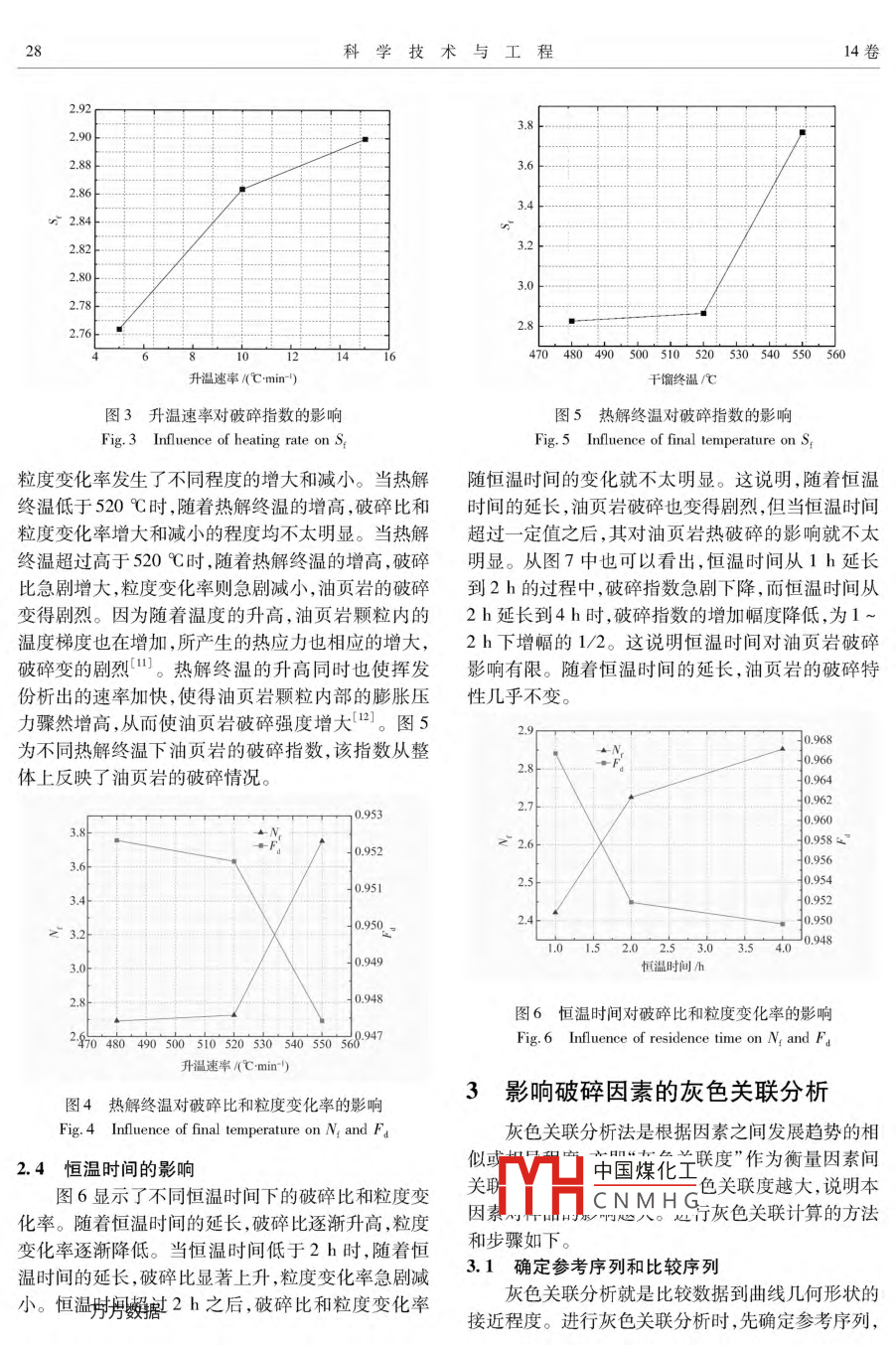 第14卷第13期2014年5月科學(xué)技術(shù)與工程VoL 14 No 13 May 20141671-1815(2014)13-0026-0Science Technology and EngineerinC 2014 Sci Tech Engrg油頁巖熱解過程中的熱破碎特性秦宏許方平劉洪鵬遲銘書王擎柏靜儒(油頁巖綜合利用教育部工程研究中心,東北電力大學(xué),吉林132012)摘要在小型于餾裝置中進(jìn)行油頁巖熱解破碎特性實驗,考察升溫速率、熟解終溫、恒溫時間對油頁巖熱破碎的影響。結(jié)果表明:提商升溫速率、熱解終溫和延長恒溫時間,均在不同程度上促進(jìn)油頁巖的熱破碎。升溫速率的影響主要體現(xiàn)在10℃/min之下,熱解終溫的影響主要體現(xiàn)在520℃以上,而恒溫時間的影響主要是在2h之前。經(jīng)灰色關(guān)聯(lián)計算,結(jié)果表明:熱解終溫對油頁巖破碎產(chǎn)生的影響最大,升溫速率次之,恒溫時間最小。關(guān)鍵詞油頁巖熱破碎破碎比粒度變化率破碎指數(shù)中圖法分類號TE135.2;文獻(xiàn)標(biāo)志碼B油頁巖是一種非常規(guī)能源,儲量巨大,是石油的次破碎;俞云等6認(rèn)為在溫度很高時,揮發(fā)份快有益補充,因此受到各國的高度重視。目前,油速析出會導(dǎo)致顆粒發(fā)生大量破碎;馬利強等發(fā)現(xiàn)頁巖的開發(fā)利用主要有兩種方式:一是通過低溫于不同煤巖的破碎性質(zhì)也不同,同一顆粒的煤巖破碎餾技術(shù)制取燃料氣和頁巖油。二是作為燃料直接燃后會形成具有一定特點的粒徑分布。秦宏等在燒,發(fā)電或供熱2。小型流化床試驗臺上對霍林河褐煤進(jìn)行了熱破碎特按傳熱方式的不同,油頁巖干餾工藝分為固體性的實驗研究,發(fā)現(xiàn)一次破碎率(P)和破碎比(N)熱載體干餾工藝和氣體熱載體干餾工藝。固體熱載隨溫度變化的趨勢大體相同。本文擬針對塊狀頁巖體用來加工小顆粒頁巖(0~25mm),氣體熱載體用在不同工況下的熱解破碎特性進(jìn)行研究。來加工塊狀頁巖粒徑(25~125mm)。油頁巖在氣體熱載體干餾爐中于餾的過程中會出現(xiàn)破碎現(xiàn)象,1實驗部分破碎后產(chǎn)生的小顆粒會影響爐內(nèi)固體顆粒的粒度分1.1樣品制備布,增加爐內(nèi)熱氣體流動阻力,造成氣體在爐內(nèi)分配試驗樣品為吉林樺甸油頁巖,基礎(chǔ)數(shù)據(jù)見表1。不均,影響干餾爐的正常運轉(zhuǎn),并且使得部分油頁巖本實驗在自行搭建的小型干餾裝置中進(jìn)行,如干餾不完全,影響油收率。因此研究油頁巖在爐內(nèi)圖1所示。反應(yīng)裝置采用電爐加熱方式。升溫控制的破碎情況對干餾爐的設(shè)計具有重要的意義。目裝置為XMTA2201型溫度控制儀。利用冰水混合前,對破碎方面的研究,大多集中在燃燒破碎方面,物對熱解氣進(jìn)行冷卻,完成干餾過程。而對熱解破碎方面的研究卻比較少。J.M.Lee等③發(fā)現(xiàn)韓國無煙煤熱解過程中發(fā)生嚴(yán)重破碎現(xiàn)象并在脫揮發(fā)份的早期產(chǎn)生許多細(xì)小的顆粒;SeeHoon lee等硏究了煤的成分(煤階、哈氏硬度、孔體積)和顆粒的尺寸對破碎的影響;何宏舟等對不同煤巖組分的龍巖煤的燃燒破碎進(jìn)行了研究,研究發(fā)現(xiàn)亮煤和灰煤發(fā)生一次破碎,而暗煤則不發(fā)生2013年11月14日收到,12月13日修改國家自然科學(xué)基金項目(51276034)、國家潛在油氣資源(油頁巖勘探開發(fā)利用)產(chǎn)學(xué)研用合作創(chuàng)新建設(shè)項目( Shale-OSR05)資助中國煤化工熱電偶;4為氮氣第一作者簡介:秦宏(1970—),男,博士,教授。研究方向:污染物CNMH排放控制,油頁巖綜合利用。E-mail:qinhong01@163.com。1認(rèn),小合物;7為干餾氣出口通信作者簡介:王擎(1964—),男,博士生導(dǎo)師,教授。研究方圖1小型干餾裝置示意圖向:油頁巖綜合利用項目及循環(huán)流化床燃燒及污染物控制等。E-Fig 1 Diagrammatic sketch of small retorting reactormail, rIx888@ 1261.2實驗內(nèi)容和方法秦宏,等:油頁巖熱解過程中的熱破碎特性表1油頁巖工業(yè)分析和元素分析Table 1 Proximate and ultimate analysis of oil shale項目工業(yè)分析/%元素分析/%發(fā)熱量M(kJ·kg-1)數(shù)據(jù)40.5331.634.5714340.22注:Ma為空氣干燥基水含量;V為空氣干燥基揮發(fā)分產(chǎn)率;A。為空氣干燥基灰分產(chǎn)率;FC為空氣干燥基固定碳含量;C。為空氣干燥基碳含量;H。為空氣干燥基氫含量;Na為空氣干燥基氮含量;S。為空氣干燥基硫含量;發(fā)熱量表示空氣干燥基高位發(fā)熱。量取粒徑為表2油頁巖熱解破碎2.1.3破碎指數(shù)S13~20mm的油頁特性試驗安排S=N fd(3)巖300g,放入實驗1 able 2 Experiment arrangement S用來綜合反映樣品的破碎程度。S越大,說明破裝置中。開啟溫度碎越嚴(yán)重??刂苾x設(shè)定熱解終fragmentation2.2升溫速率的影響溫和升溫速率及恒編號終溫速率時間圖2為不同升溫速率下,油頁巖的破碎比(N)溫時間。通入氮氣/℃/(℃.min-1)/h和粒度變化率(Fa)。隨著升溫速率的提高,破碎比吹掃實驗裝置,排逐漸增大,粒度變化率逐漸減小。升溫速率從5℃/除內(nèi)部殘留空氣2520min增加到15℃/min的過程中,破碎比增加尤為明3后,開始加熱,對油4520顯,幾乎為線性遞增。而粒度變化率在升溫速率增頁巖樣品進(jìn)行熱5520000s050022221加到10℃/min之前急劇減小,在升溫速率超過10解,所產(chǎn)生熱解氣6520℃/min之后減小則不太明顯。這說明油頁巖在升經(jīng)冷凝裝置進(jìn)行冷8520溫速率從5℃/min增加到10℃/min的過程中,破卻,完成于餾過程碎后的顆粒數(shù)量