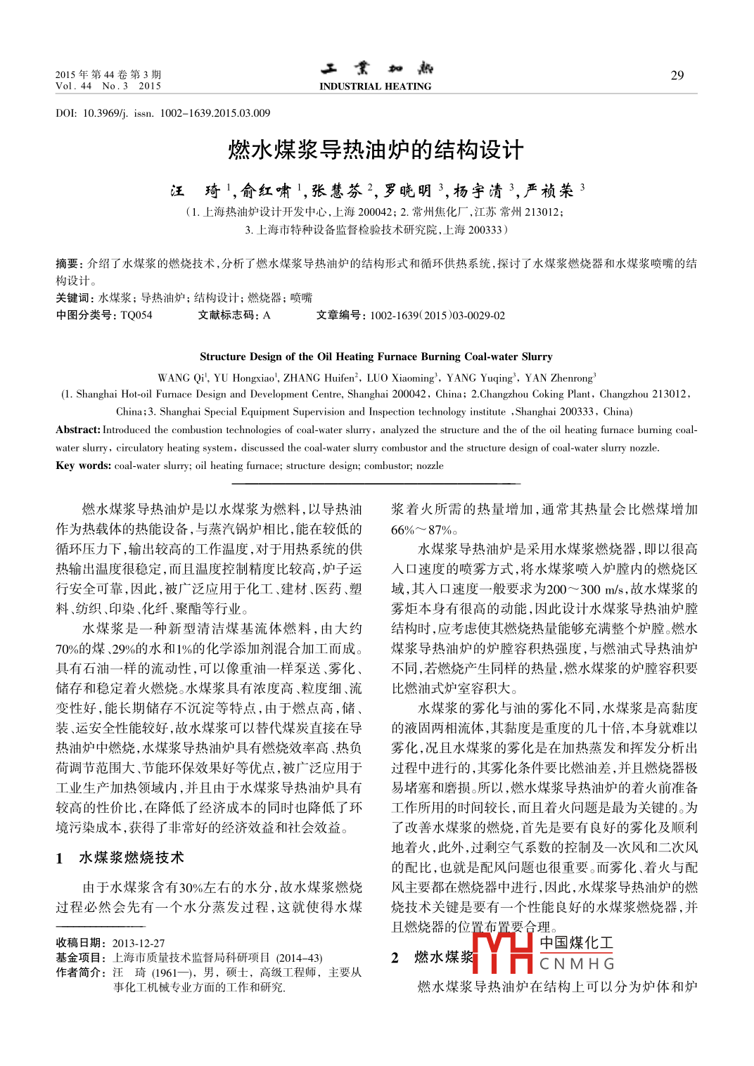 2015年第44卷第3期食Vol.44No.32015INNDUSTRIAL HEATINGDO:10.3969/.issn.1002-16392015.03.009燃水煤漿導(dǎo)熱油爐的結(jié)構(gòu)設(shè)計(jì)汪琦',俞紅嘯,張慧芬’,羅曉明3,楊宇清3,嚴(yán)禎榮(1.上海熱油爐設(shè)計(jì)開發(fā)中心,上海200042;2.常州焦化廠,江蘇常州2130123.上海市特種設(shè)備監(jiān)督檢驗(yàn)技術(shù)研究院,上海20033摘要:介紹了水煤漿的燃燒技術(shù),分析了燃水煤漿導(dǎo)熱油爐的結(jié)枃形式和循環(huán)供熱系統(tǒng),探討了水煤漿燃燒器和水煤漿噴嘴的結(jié)構(gòu)設(shè)計(jì)。關(guān)鍵詞:水煤漿;導(dǎo)熱油爐;結(jié)構(gòu)設(shè)計(jì);燃燒器;噴嘴中圖分類號(hào):TQ054文獻(xiàn)標(biāo)志碼:A文章編號(hào):1002-1639(2015)03-002902Structure Design of the Oil Heating Furnace Burning Coal-water SlurryWANG Qi, YU Hongxiao, ZHANG Huifen, LUO Xiaoming, YANG Yuqing, YAN Zhe(1. Shanghai Hot-oil Furnace Design and Development Centre, Shanghai 200042, China; 2. Changzhou Coking Plant, Changzhou 213012China; 3. Shanghai Special Equipment Supervision and Inspection technology institute, Shanghai 200333, China)Abstract: Introduced the combustion technologies of coal-water slurry, analyzed the structure and the of the oil heating furnace burning cwater slurry, circulatory heating system, discussed the coal-water slurry combustor and the structure design of coal-water slurry nozzleKey words: coal-water slurry; oil heating furnace; structure design; combustor; nozzl燃水煤漿導(dǎo)熱油爐是以水煤漿為燃料,以導(dǎo)熱油漿著火所需的熱量増加,通常其熱量會(huì)比燃煤増加作為熱載體的熱能設(shè)備,與蒸汽鍋爐相比,能在較低的66%~87%。循環(huán)壓力下,輸出較高的工作溫度,對(duì)于用熱系統(tǒng)的供水煤漿導(dǎo)熱油爐是采用水煤漿燃燒器,即以很高熱輸岀溫度很穩(wěn)定,而且溫度控制精度比較髙,爐子運(yùn)亼口速度的噴霧方式,將水煤漿噴λ爐膛內(nèi)的燃燒區(qū)行安全可靠,因此,被廣泛應(yīng)用于化工、建材、醫(yī)藥、塑域,其入口速度一般要求為200~300m/s,故水煤漿的料、紡織、印染、化纖、聚酯等行業(yè)霧炬本身有很高的動(dòng)能,因此設(shè)計(jì)水煤漿導(dǎo)熱油爐膛水煤漿是一種新型清潔煤基流體燃料,由大約結(jié)枃時(shí),應(yīng)考慮使其燃燒熱量能夠充滿整個(gè)爐膛。燃水70%的煤、29%的水和1%的化學(xué)添加劑混合加工而成。煤漿導(dǎo)熱油爐的爐膛容積熱強(qiáng)度,與燃油式導(dǎo)熱油爐具有石油一樣的流動(dòng)性,可以像重油一樣泵送、霧化、不同,若燃燒產(chǎn)生同樣的熱量,燃水煤漿的爐膛容積要儲(chǔ)存和穩(wěn)定著火燃燒。水煤漿具有濃度高、粒度細(xì)、流比燃油式爐室容積大。變性好,能長(zhǎng)期儲(chǔ)存不沉淀等特點(diǎn),由于燃點(diǎn)高,儲(chǔ)水煤漿的霧化與油的霧化不同,水煤漿是高黏度裝、運(yùn)安全性能較好,故水煤漿可以替代煤炭直接在導(dǎo)的液固兩相流體,其黏度是重度的幾十倍,本身就難以熱油爐中燃燒,水煤漿導(dǎo)熱油爐具有燃燒效率高、熱負(fù)霧化,況且水煤漿的霧化是在加熱蒸發(fā)和揮發(fā)分析岀荷調(diào)節(jié)范圍大、節(jié)能環(huán)保效果好等優(yōu)點(diǎn),被廣泛應(yīng)用于過程中進(jìn)行的,其雰化條件要比燃油差,并且燃燒器極工業(yè)生產(chǎn)加熱領(lǐng)域內(nèi),并且由于水煤漿導(dǎo)熱油爐具有易堵塞和磨損。所以,燃水煤漿導(dǎo)熱油爐的著火前準(zhǔn)備較高的性價(jià)比,在降低了經(jīng)濟(jì)成本的同時(shí)也降低了環(huán)工作所用的時(shí)間較長(zhǎng),而且著火問題是最為關(guān)鍵的。為境污染成本,獲得了非常好的經(jīng)濟(jì)效鲞和社會(huì)效益。了改善水煤漿的燃燒,首先是要有良好的霧化及順利1水煤漿燃燒技術(shù)地著火,此外,過??諝庀禂?shù)的控制及一次風(fēng)和二次風(fēng)的配比,也就是配風(fēng)問題也很重要。而霧化、著火與配由于水煤漿含有30%左右的水分,故水煤漿燃燒風(fēng)主要都在燃燒器中進(jìn)行,因此,水煤漿導(dǎo)熱油爐的燃過程必然會(huì)先有一個(gè)水分蒸發(fā)過程,這就使得水煤燒技術(shù)關(guān)鍵是要有一個(gè)性能良好的水煤漿燃燒器,并且燃燒器的位置布置要合理收稿日期:2013-12-27中國(guó)煤化工基金項(xiàng)目:上海市質(zhì)量技術(shù)監(jiān)督局科研項(xiàng)目(2014-432燃水煤作者簡(jiǎn)介:汪琦(1961-),男,碩士,高級(jí)工程師,主要從CNMHG事化工機(jī)械專業(yè)方面的工作和研究燃水煤漿導(dǎo)熱油爐在結(jié)構(gòu)上可以分為爐體和爐2015年第44卷第3期INDUSTRIAL HEATINGVol.44No.32015膛兩大部件爐體主要是由輻射螺旋盤管、爐頂回流空氣霧化,但都是利用霧化介質(zhì)來(lái)撞擊水煤漿。按照霧管、對(duì)流蛇形管、集箱管、空氣預(yù)熱器組成,爐膛主要化介質(zhì)和水煤漿交叉流動(dòng)方式來(lái)分,常見的是T型結(jié)是由燃燒器、穩(wěn)燃室、燃燒室、岀灰系統(tǒng)組成;并配有構(gòu)和Y型結(jié)構(gòu),但無(wú)論何種形式的噴嘴,一般都是水煤循環(huán)油泵、注油泵、高位膨脹油槽、低位儲(chǔ)油槽、鼓風(fēng)漿從內(nèi)測(cè)流動(dòng),而霧化介質(zhì)從外測(cè)流動(dòng)。目前導(dǎo)熱油爐機(jī)、引風(fēng)機(jī)、除塵器、油氣分離器、油過濾器、水煤漿供的水煤漿燃燒器采用Y型霧化T型霧化及機(jī)械撞擊霧應(yīng)系統(tǒng