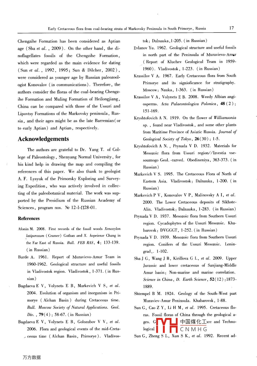 Global Geology, 15(1): 13-18(2012)doi:10.3969/is.1673-9736.2012.01.02Article ID:16739736(2012)01-0013-06early Cretaceous flora from coal-bearing strata of MarkovskyPeninsula in South Primorye, russiaTatiana Kovaleva, Elena volynets and SUN Gel.2.4I. Research Center of Paleontology Stratigraphy, Jilin University, Changchun 130026, China;2. Key-Lab for Euolution of Past Life Environment, MOE, China(Jilin University), Changchun 130026, China3. Institute of Biology and Soil Science, FEB, Russian Academy of Sciences, Vladivostok 690022, Russia4. College of Paleontology, Shenyang Normal University, Shenyang 110034, ChinaAbstract: The Early Cretaceous flora from the coal-bearing strata( Ussuri and Lipovtsy formations in theTarkovsky peninsula of South Primorye, Far East Russia, is reported in some detail in this paper. The floracontaining over 80 species of about 50 genera can be divided into two assemblages. The paleofloristic character-istics and the comparisons of this flora with its coeval floras from the adjacent region of the eastern Heilongjiangof Northeast China, indicate the flora and its coal-bearing strata of the Markovsky peninsula can be comparedthose of the Chengzihe and Muling formations of the Jixi area of Heilongiiang, representing probably the lateBarremian and AptianKey words: Early Cretaceous; flora; Ussuri Formation; Lipovtsy Formation: Barremian-Aptian: Markovskypeninsula; South Primorye; RussiaEarly Cretaceous flora anIntroductionmorye( Krassilov, 1967), including those of thisThe history of the research on the fossil plants peninsula( Fig. 1). Krassilov( 1967) divided thefrom, the Markovsky peninsula of South PrimoryeCretaceous strata into the Ussuri Formation( BarremiRussia, has been over a century. Ivanov(1889)first an), Lipovtsy Formation(Aptian), Galenka Formacollected the fossil plants which study was involved bytion( Albian) and Korkino Group( CenomanianSwedish paleobotanist Halle(1921)who consideredThe first two formations are coal-bearing in naturethese plants similar to the Wealden flora of Europewhich yield abundant fossil plants. For the recentSince 1910 Kryshtofovich(1916) had studied this flo- years, Volynets(2003, 2005, 2006, 2009, 2010)ra, and identified two different aged floras, including has done more research on this Early Cretaceous florasthe Mongugai flora Triassic and Nikan florand stratigraphy in this area, and obtained more plant(Jurassic-Cretaceous)( Kryshtofovich, 1919). Prfossils and related geological information from the Firnada(1937, 1939 Kryshtofovich& Prynada, 1932) sov cape and Markovsky peninsula. Some other ad-and Shtempel (1924 )also Involveed the phytostratvances in the concerned research have been gained algraphic research of this area. Since 1960s, Krassilovso( Markevich, 1995; Markevich et al., 2000: Bug-has made an enormous achievement to the study of daeva et a.V凵中國(guó)煤化工& Volynets,CNMHGReceived 20 November 2011, accepted 22 December 201114Volynets E.2008 ). In this paper the authors concentrate on the Both the coal-bearing Ussuri and Lipovtsy Formationsintroduction of the recent advances in study of the flo- yield abundant fossil plantsra from the coal-bearing strata (i. e. the Ussuri ForUssuri Formation(K,us)ation and Lipovtsy Formation) in this peninsulThis Ussuri Formation (76 m in total thickness)2 Material and methodconsists mainly of cross-bedded fine and mediumgrained sandstone and siltstone with elements of coalThe Early Cretaceous plants of the Markovskybearing layers. The basal part of the Formationpeninsula were mainly collected in the coastal out(1. 5 m thick)begins with the fine-grained sandstonecrops on the brazhnikov Bay area, but the most nu(Volynets, 2009), yielding Onychiopsis psilotoidesmerous finds are on the Klikov cape and near the So-(Stok. et Webb)Ward, Coniopteris burejensis(ZaIkol Bay. Up to know, there have been over 1000 Sew, Lycopodites prynadae Krass. and podozamitesspecimens of fossils collected, which is favorable for sp. In the lower part of the section have also beenthe present research. The research work was based on found: Cladophlebis sp, Podocarpus nicanicusthe collections of fossil plants from the coal-bearing Krass, Pseudolarix dorofeevii Samyl., Pityostrobusstrata at 21 localities( Fig. 1), including 8 sites from sp, Podozamites ex gr. lanceolatus( Lindl. etthe Ussuri Formation(101, 102, 109-113, BarremiHutt )Braun, etc. In the middle and upper parts ofan), and 13 from the Lipovtsy Formation(26, 26/1the Formation, the mudstone, fine-grained sandstone7, 27, 27/1, 28, Aptian). Referred this researchwith thin-bedded siltstones, we found fossil plantsthere are 3 localities from the Galenka Formation(38Equisetites sp, Coniopteris burejensis (Zal.)Sew40, lower-middle Albian). The specimens of the fosConiopteris sp, Onychiopsis psilotoides Stokes etsil plants are composed of leaves, leafy shoots, seedsWebb) Ward, Adiantopteris yuasensis Yokand fossil woods. Many of the specimens were subjecKrasPodocarpKrassPseudolarixted in chemical processing for cuticular study. Howevdorofeeuii Amyl., Pityostrobus sp., Podozamites exer, there are only some compression specimens which gr. Lanceolatus(L. et H)Brauncan be used for anatomical study due to their poorThe above plant fossils of the Ussuri Formationpreservations of cuticlesare characterized by the Ruffordia-elatides assemblageThe recent collections of the fossil plants at the which was considered Barremian age(KrassilovMarkovsky peninsula were mainly done by Volynets 1967), and probably the late Barremian or late Barrefor the last several years, and by Kovaleva in summer mian-early Aptian in age, considered by the present2011. All the specimens are stored in the laboratoryauthorsof Paleobotany of the Institute of Biology and Soil SciLipovtsy Formation(K, lp)ence, FEB RAS in VladivostokThe basal part(40 m thick) of the L3 Stratigraphy and floranation consists of cross-bedded thick layer of sandstoneand layers of gravel-stone, with fossil